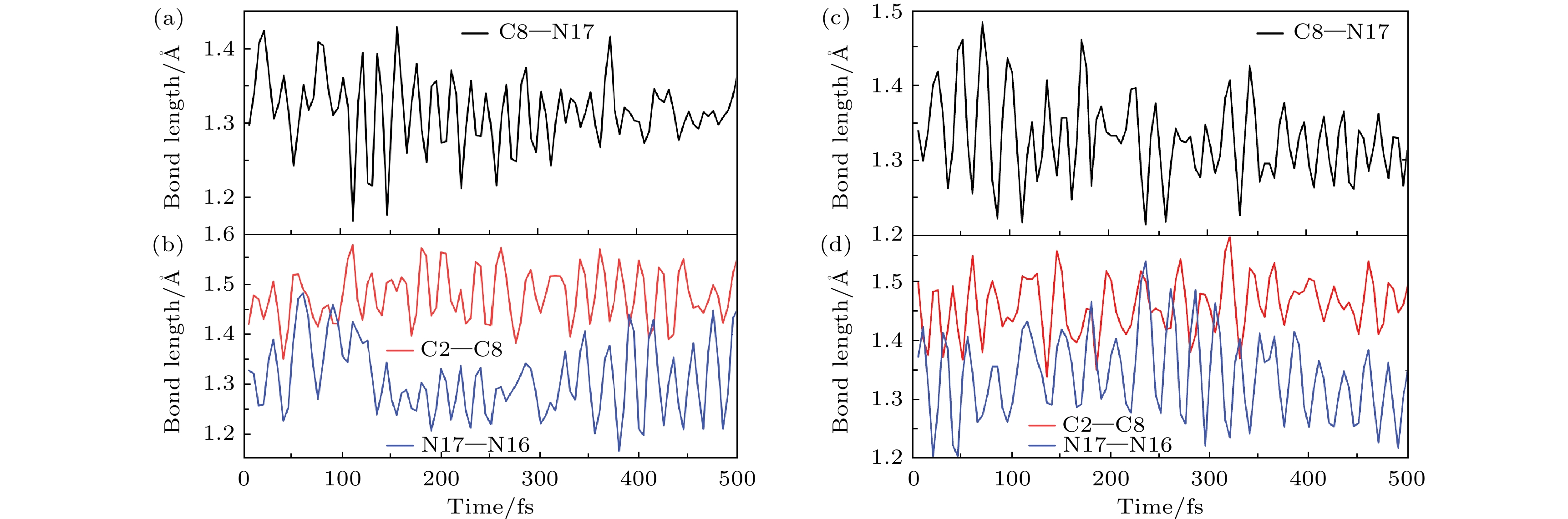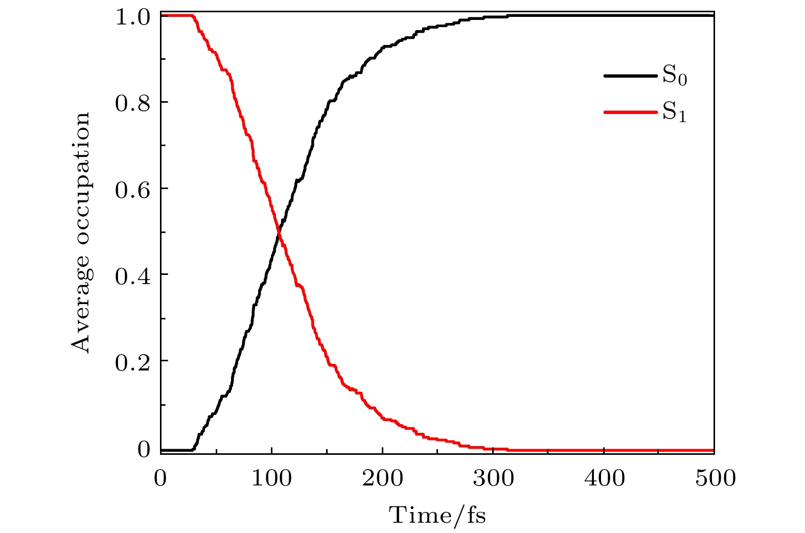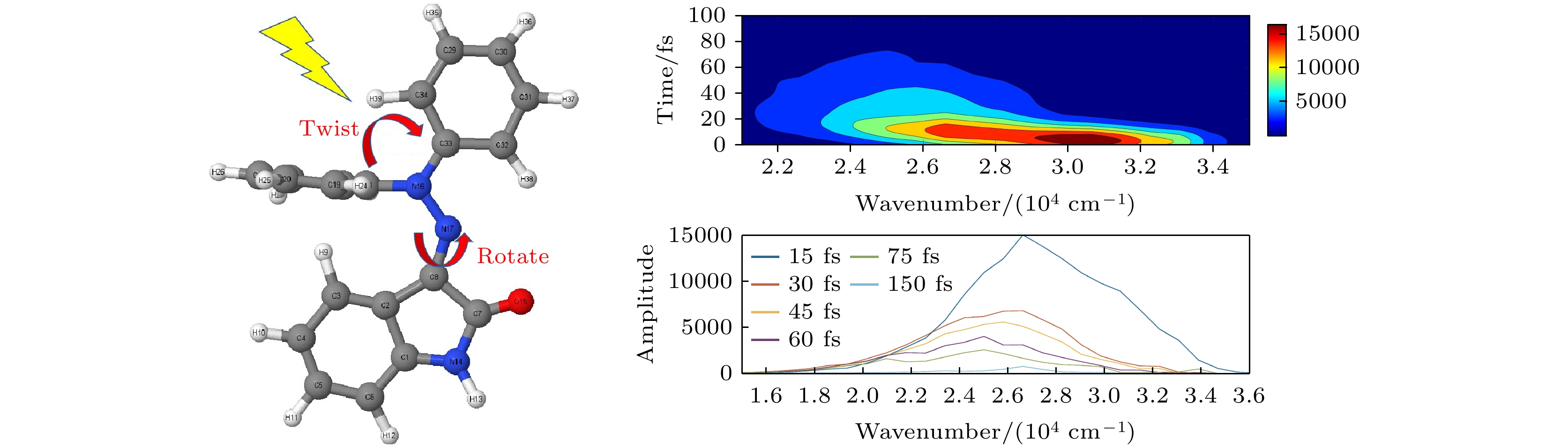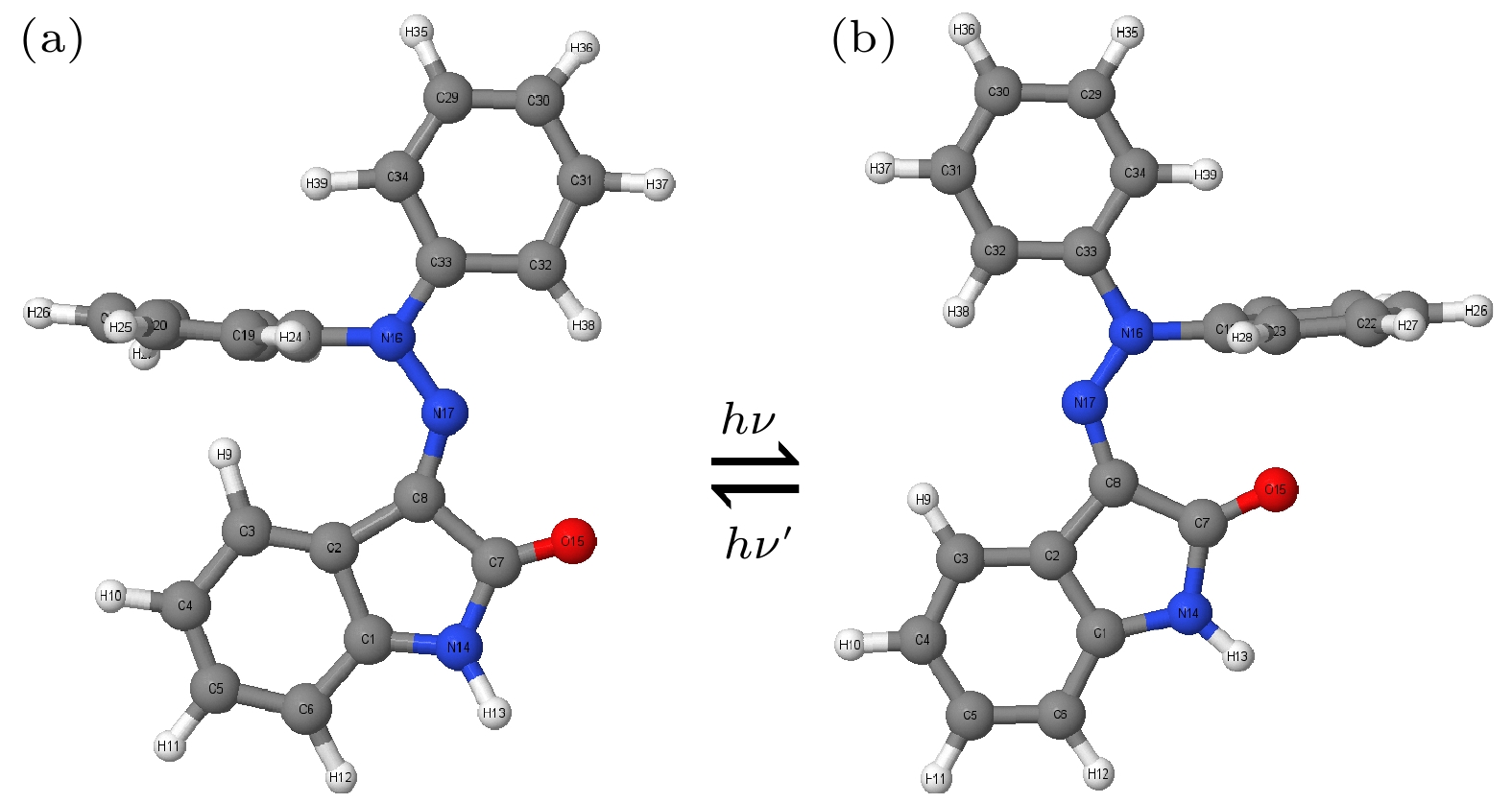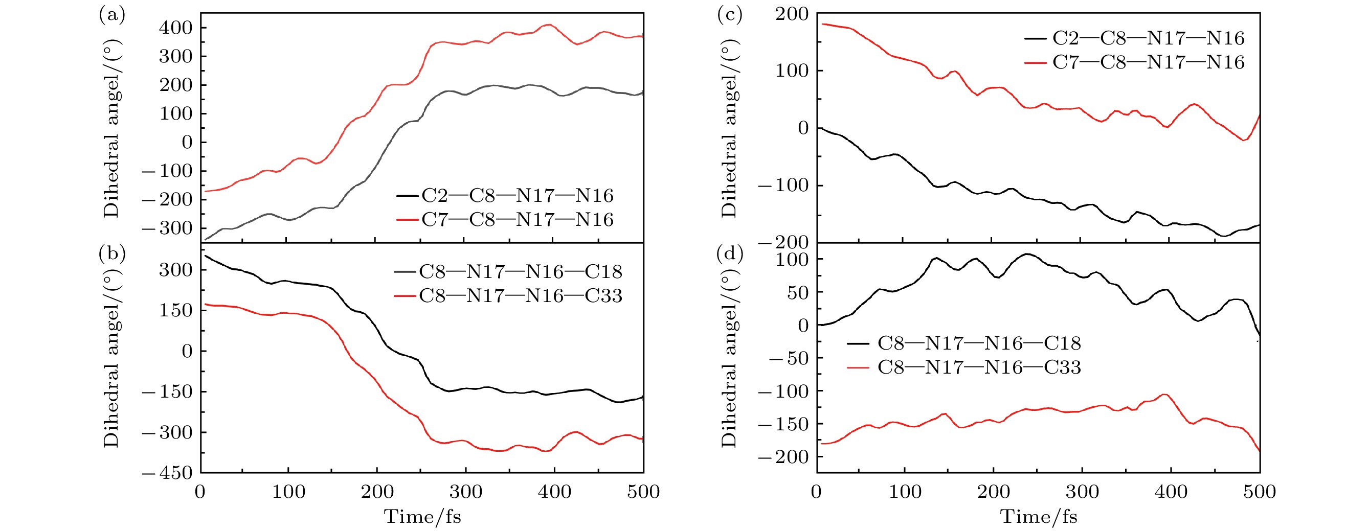 Hydrazone molecular switches have significant application value in supramolecular chemistry. A new type of hydrazone molecular switch, named isatin N2-diphenylhydrazone, has been synthesized. Owing to its cis-trans isomerization characteristics under visible light excitation, ease of synthesizing of derivatives, and sensitivity to external stimuli, it has important application value in the field of biochemistry. Because of its forward and backward visible light excitation characteristics, it is considered a class of compound that is very suitable for molecular switches, and it has a wide application value in fields such as biotechnology. In addition, the derivatives compound exhibits strong interactions with negative ions, which enhances its function as a molecular switch, making it a four-state molecular switch that can be achieved by a single molecule. However, the photo-induced isomerization mechanism of these new molecular switches is not yet clear, and whether there are novel phenomena in the isomerization process is also unknown. In this work, a semi empirical OM2/MRCI based trajectory surface hopping dynamics method is adopted to systematically study a photo induced isomerization mechanism based on the E-Z isomerization process of the isatin N2-diphenylhydrazones molecular switch. Optimization configuration and the average lifetime of the first excited S1state are obtained by using the semi-empirical OM2/MRCI method of molecular switch. It is found that the average lifetime of the S1excited state of the E-configuration molecular switch is about 107 fs, and the quantum yield of E-Z isomerization of the molecular switch is 16.01%. By calculating the photo induced isomerization process of the molecular switch, two different isomerization mechanisms of the molecular switch are identified. In addition to the traditional molecular switch isomerization mechanism revolving around the C=N bond, a new isomerization mechanism, i.e. the face-to-face twisting of the molecular switch rotor part is elucidated. By calculating the time-resolved fluorescence radiation spectrum, it is predicted that there may be a very fast fluorescence quenching phenomenon occurring in about 75 fs in the isomerization process, slightly faster than the S1average decay events (107 fs). The information about wavelength-resolved attenuation at different times is also calculated, which reflects the ultrafast fluorescence quenching process accompanied by fluorescence red shift, ranging from 2.1 × 104cm–1to 3.4 × 104cm–1. By comparing the calculated fluorescence spectra with the average lifetime of excited states, the existence of “dark states” is proposed, and possible explanations for the existence of “dark states” are provided, and those “dark states” may be related to lower quantum yields. The research results can provide theoretical guidance for the design and application of new molecular switches. The ease of synthesis and sensitivity to external stimuli of its derivatives make those compounds extremely valuable in molecular switching and light measurement applications.