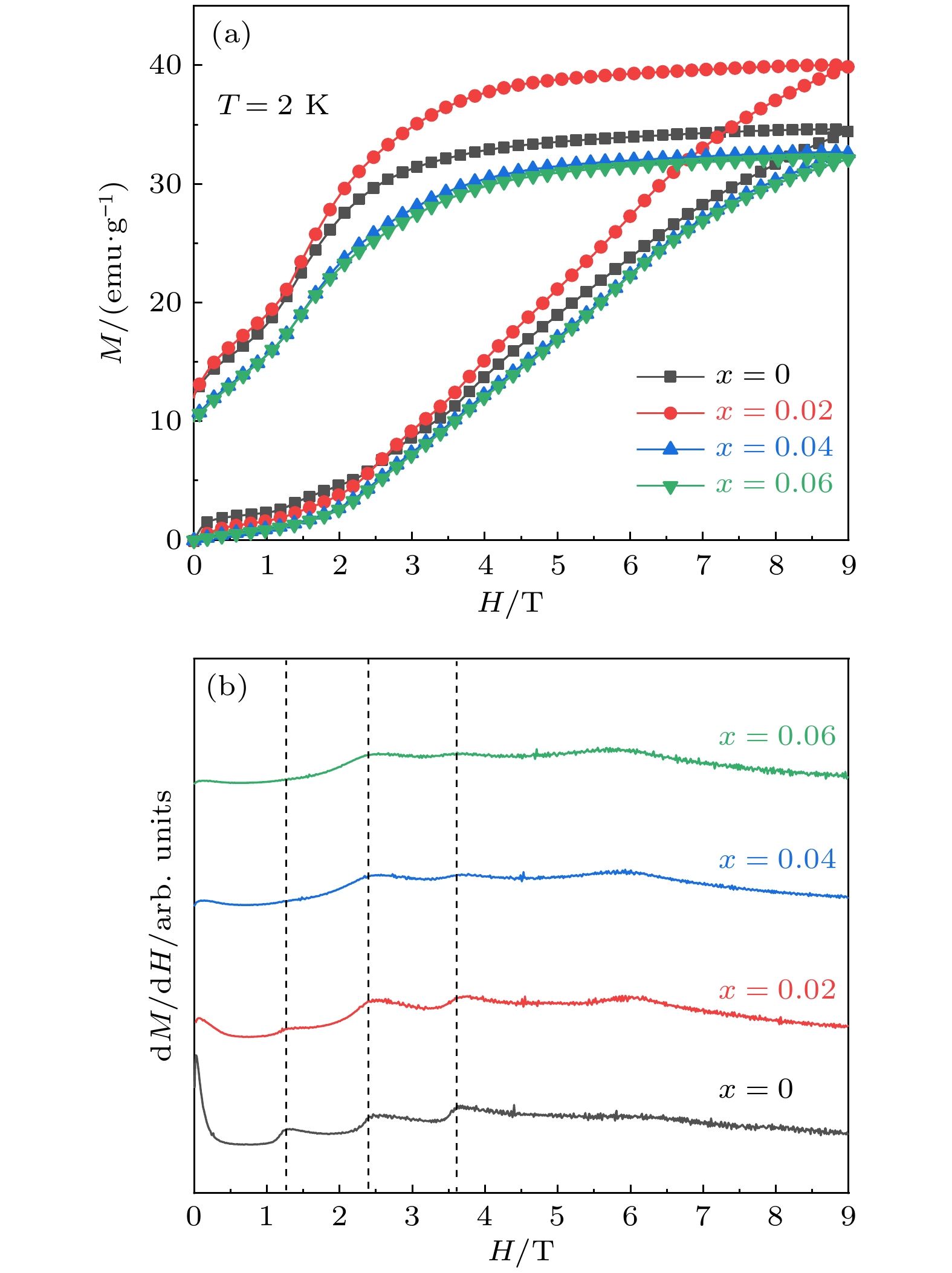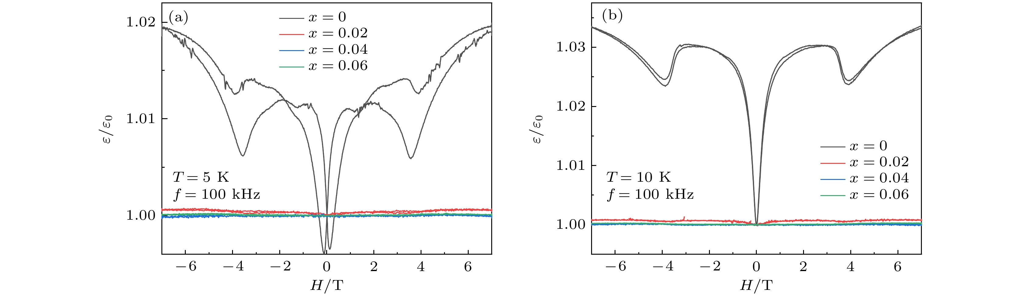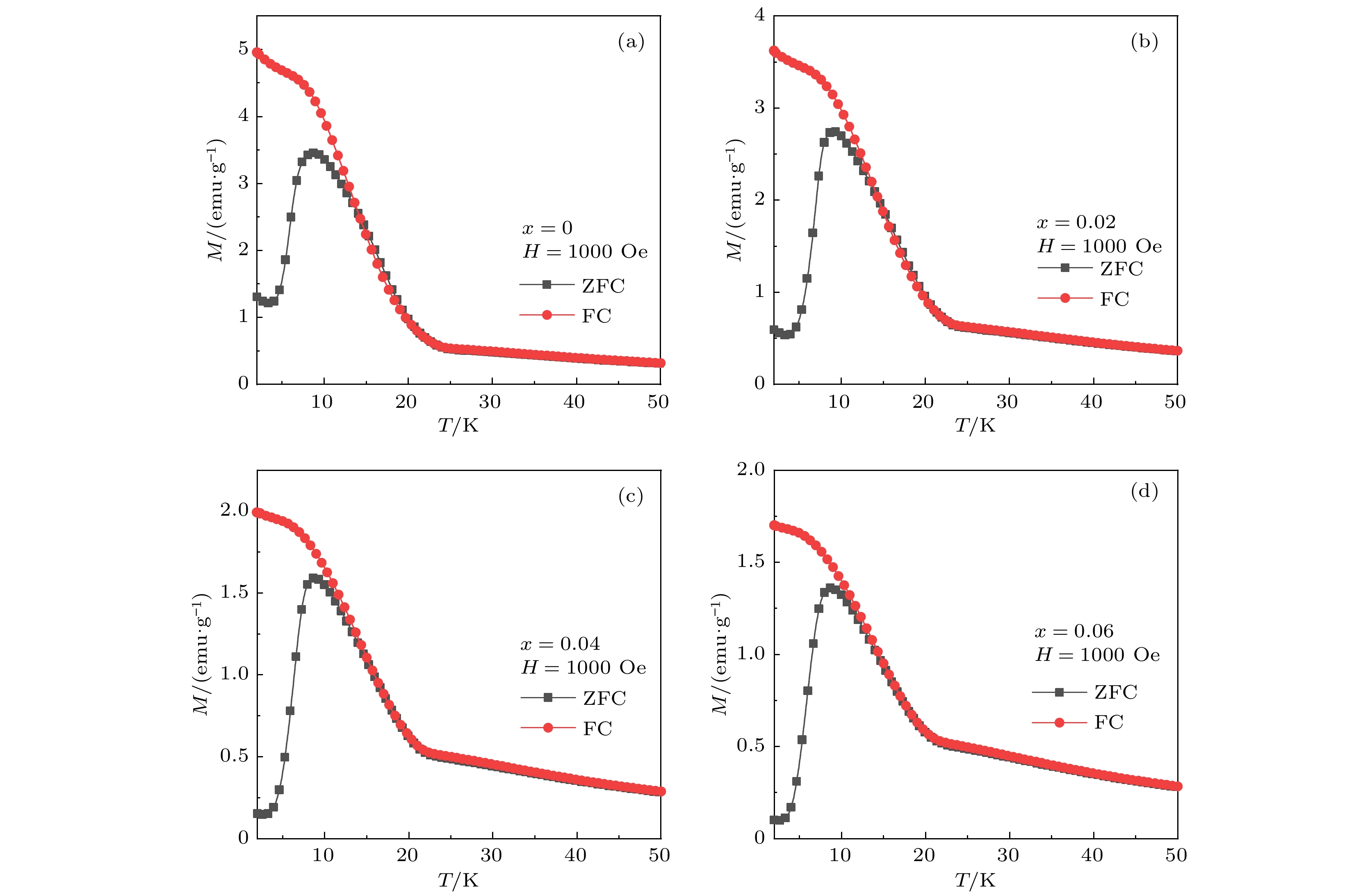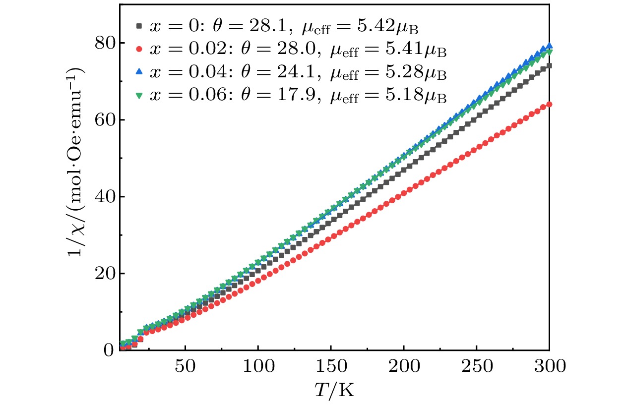As a quasi-one-dimensional spin frustrated material, Ca3Co2O6has a series of interesting physical properties such as low-temperature spin freezing and multiple magnetized steps due to its unique structure. The magnetic properties of Ca3Co2O6mainly come from Co ions, and the doping of different elements at the Co site has a great effect on the magnetic structure of Ca3Co2O6. At present, the magnetic research of Ca3Co2O6and its related compounds mainly focuses on exploring the influence of other elements replacing Co sites. For example, non-magnetic Sc3+can dilute the intrachain ferromagnetic exchange, while the doping of magnetic ions Mn4+, Fe3+or Cr3+can inhibit the intrachain ferromagnetic interaction and enhance the antiferromagnetic interchain interaction. Doping Ti4+ions, which are high-valence non-magnetic ions, not only dilutes the magnetic interaction of Ca3Co2O6, but also changes the valence state of cobalt ions. i.e. it can convert part of Co3+ions into Co2+ions. Therefore, comparing with other doped ions, their introduction may have a more significant effect on the magnetoelectric properties of Ca3Co2O6. In this study, a series of Ca3Co2–xTixO6(x= 0, 0.02, 0.04, 0.06) polycrystalline samples is prepared by sol-gel method. Their magnetic, dielectric and magnetodielectric properties are measured. The XRD patterns show that a small number of Ti4+ions do not change the crystal structure of Ca3Co2O6. Due to the destruction of the long-range ferromagnetic correlation of Ca3Co2O6by non-magnetic Ti4+ions, the ferromagnetic interaction is inhibited to some extent. Because Ti4+ions are non-magnetic ions, they cannot form antiferromagnetic coupling with Co ions, resulting in the decrease of the Curie-Weiss temperature(θ). The positiveθvalue and exchange constant still indicate that the ferromagnetic interaction is dominant in Ti4+doped Ca3Co2–xTixO6(x= 0, 0.02, 0.04, 0.06) samples. The substitution of non-magnetic ions Ti4+for Co3+ions also makes the effective magnetic moment of Ca3Co2–xTixO6(x= 0, 0.02, 0.04, 0.06) monotonically decrease fromμeff= 5.42μBforx= 0 toμeff= 5.18μBforx= 0.06. Accompanying the introduction of Ti4+ions, the spin frustration of Ca3Co2O6is released partly, thus gradually fading the magnetization steps of Ca3Co2O6. As the Ca3Co2O6is a typical magnetodielectric material, the released spin frustration in Ti4+doped samples and the variation of the subtle magnetic structure exert a large influence on the magnetodielectric coupling effect of Ca3Co2–xTixO6(x= 0, 0.02, 0.04, 0.06) compounds.
