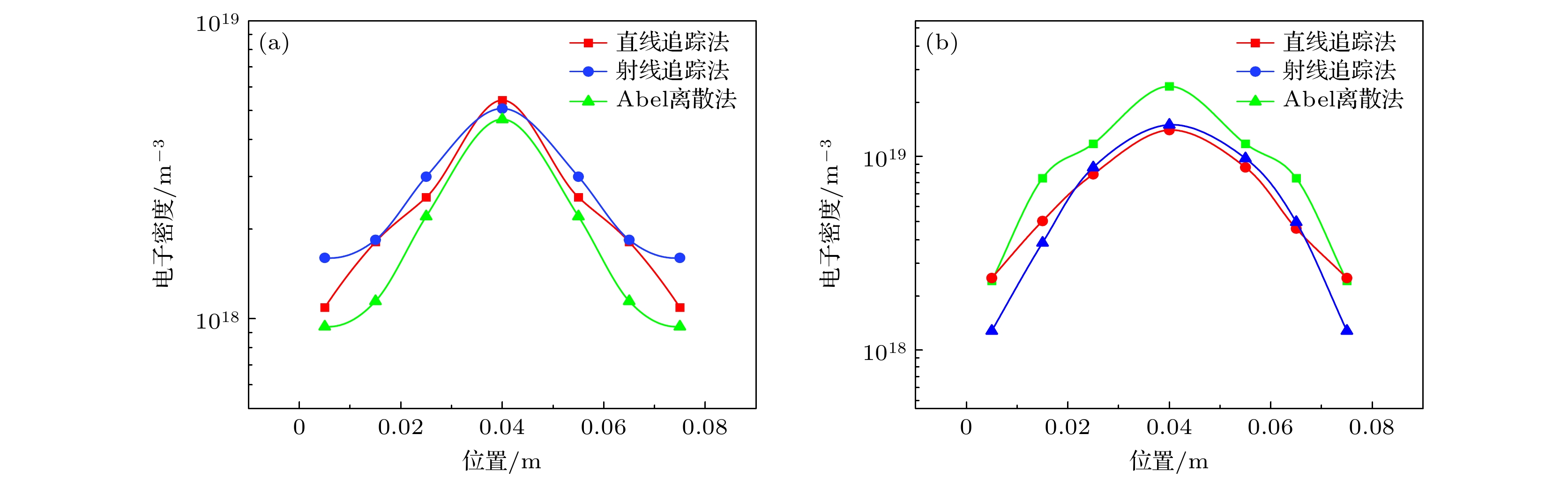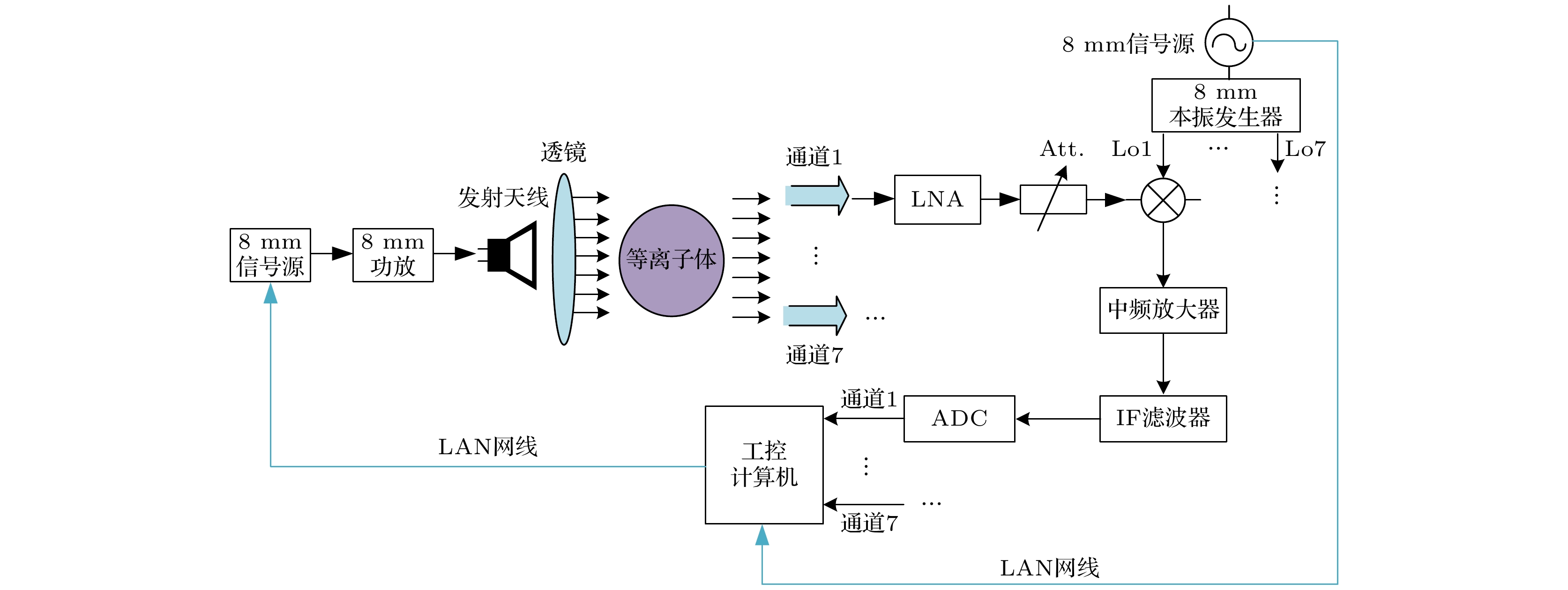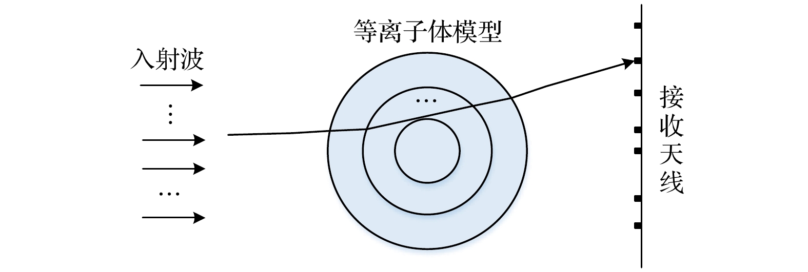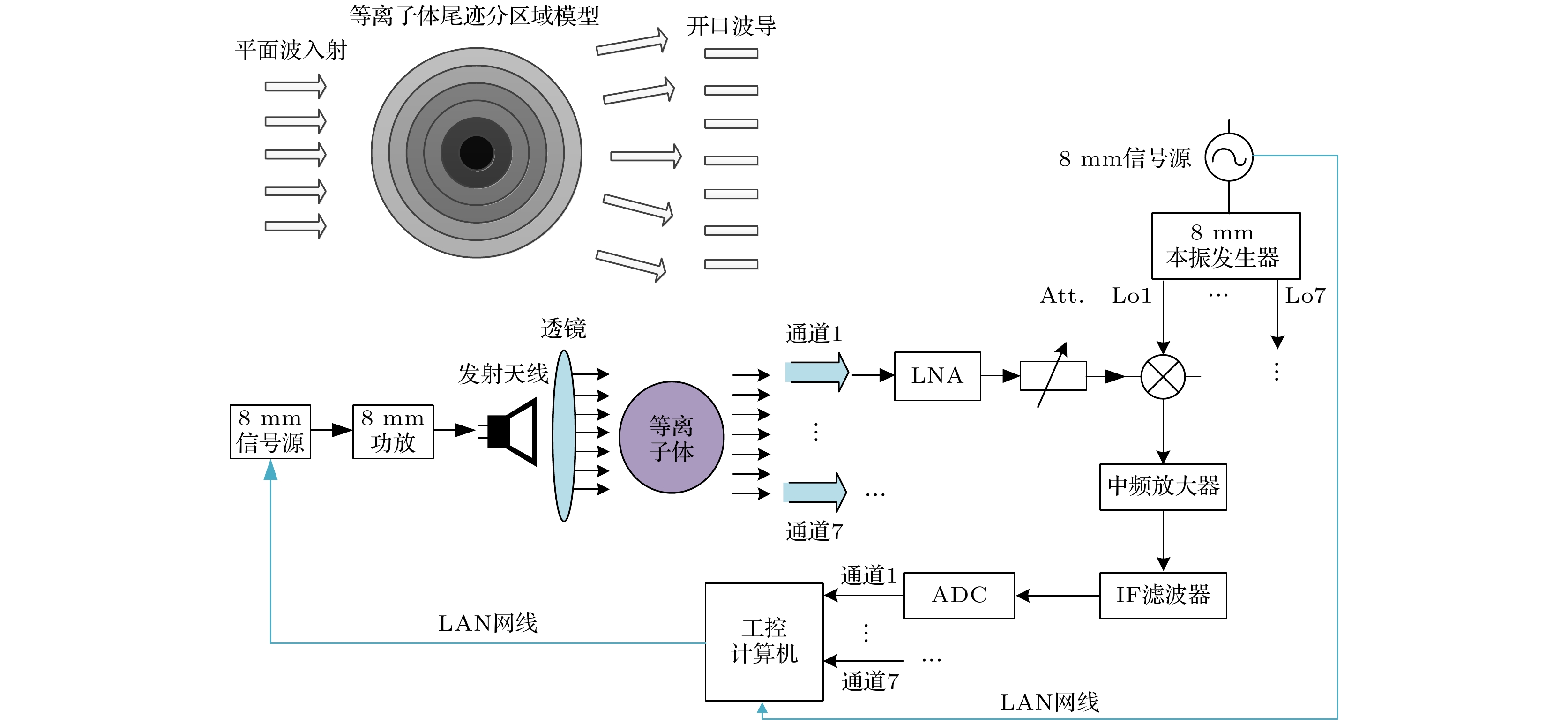 When a hypersonic vehicle is flying in the near space region, the strong friction between the vehicle and the air can cause the air to ionize. As a result, the plasma sheath around the vehicle and the wake flow field behind it are formed, significantly affecting the electromagnetic (EM) scattering characteristics of the vehicle and resulting in the communication blackout. Therefore, the investigation of electron density distribution of the plasma sheath and wake flow field is of the great significance in the detection, communication, etc. of the hypersonic target. In order to meet the requirements for on-ground electron density distribution measurement of the transient plasma flow fields, the feasibility of measuring electron density profile with seven-channel microwave interferometer measurement system is demonstrated in this work. The wake plasma is modeled as a non-uniform multilayer medium, and the full-wave simulation software FEKO is used to calculate the phase-shift information of EM wave transmitting through non-uniform single-layered dielectric plate, uniform and non-uniform multi-layered dielectric plates. According to the simulation results, the dielectric constant of the substrate is retrieved and compared with the preset result. The retrieved results show that it is feasible that the dielectric constant distribution of non-uniform multi-layered dielectric plate is measured by utilizing the proposed microwave interferometer system with one transmission port and seven receptions. The amplitude-phase dynamic range analysis of the proposed Ka-band microwave measurement system is also carried out. The key technologies including large instantaneous amplitude-phase dynamic range and ray tracking inversion algorithm for two-dimensional (2-D) electron density distribution are also developed. Finally, the complete scheme of Ka-band seven-channel microwave interferometer measurement system is introduced. The system includes one lens antenna to generate the required plane wave and seven open-ended waveguide receiving antennas which are asymmetrically arranged to improve the lateral spatial resolution of the system. The system exhibits the amplitude dynamic range and the phase dynamic range of over 65 dB and 180° under 1 MHz IF bandwidth respectively. The plasma electron density distributions are measured by utilizing the proposed seven-channel microwave interferometer system in the ballistic range and multi-functional shock tube. The response time of the system is smaller than 1μs, satisfying the requirement for the two-dimensional distribution measurement of the transient plasma flow field generated by the ballistic range and multi-functional shock tube. The differences between experimental and numerical results are less than 0.5 order of magnitude, and the variations in transient plasma generated in both ballistic target and shock tube equipments are well detected. The measurement range of plasma electron density is 1010-1013cm–3and the spatial resolution is better than 15mm. In addition, the proposed ray tracing method is also used to invert the two-dimensional (2D) electron density distributions of both square layered model and cylindrical layered model under identical experimental state. The results are in consistent with each other, indicating that the proposed ray tracing method can be used in the inversion of 2D electron density distribution of plasma with different shapes.