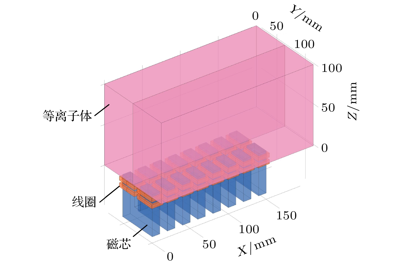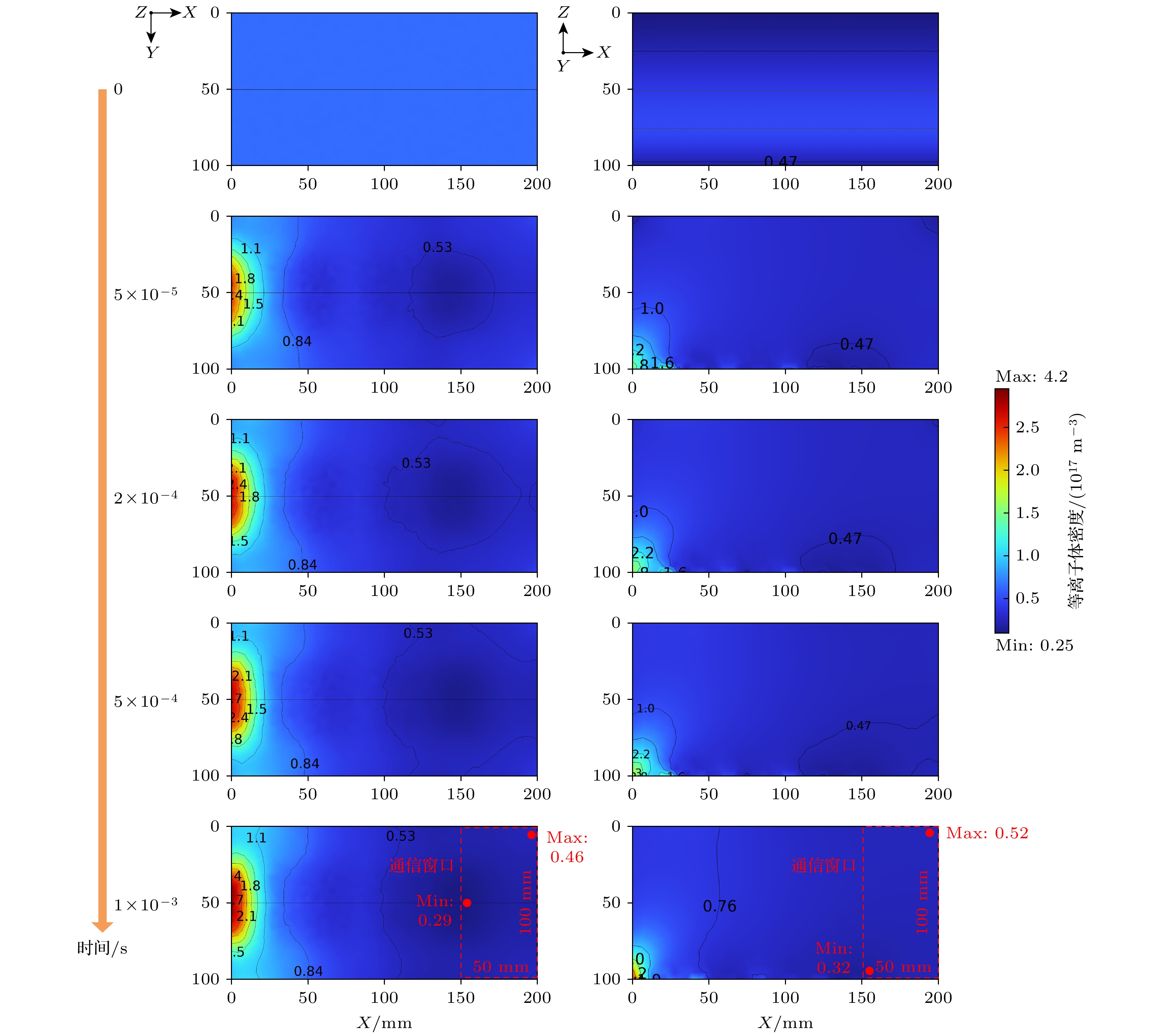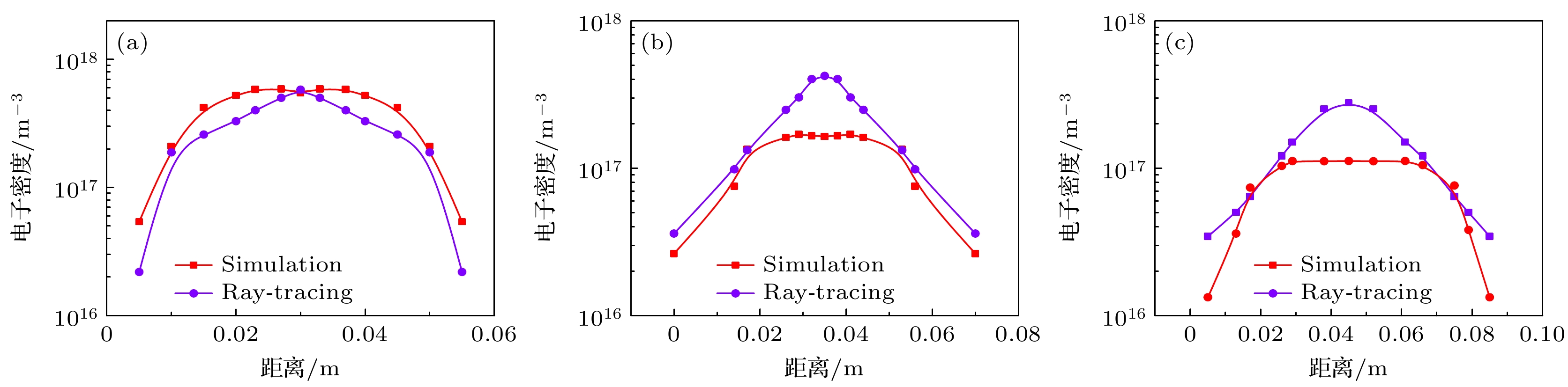 When a hypersonic vehicle is flying in the near space region, the strong friction between the vehicle and the air can cause the air to ionize. As a result, the plasma sheath around the vehicle and the wake flow field behind it are formed, significantly affecting the electromagnetic (EM) scattering characteristics of the vehicle and resulting in the communication blackout. Therefore, the investigation of electron density distribution of the plasma sheath and wake flow field is of the great significance in the detection, communication, etc. of the hypersonic target. In order to meet the requirements for on-ground electron density distribution measurement of the transient plasma flow fields, the feasibility of measuring electron density profile with seven-channel microwave interferometer measurement system is demonstrated in this work. The wake plasma is modeled as a non-uniform multilayer medium, and the full-wave simulation software FEKO is used to calculate the phase-shift information of EM wave transmitting through non-uniform single-layered dielectric plate, uniform and non-uniform multi-layered dielectric plates. According to the simulation results, the dielectric constant of the substrate is retrieved and compared with the preset result. The retrieved results show that it is feasible that the dielectric constant distribution of non-uniform multi-layered dielectric plate is measured by utilizing the proposed microwave interferometer system with one transmission port and seven receptions. The amplitude-phase dynamic range analysis of the proposed Ka-band microwave measurement system is also carried out. The key technologies including large instantaneous amplitude-phase dynamic range and ray tracking inversion algorithm for two-dimensional (2-D) electron density distribution are also developed. Finally, the complete scheme of Ka-band seven-channel microwave interferometer measurement system is introduced. The system includes one lens antenna to generate the required plane wave and seven open-ended waveguide receiving antennas which are asymmetrically arranged to improve the lateral spatial resolution of the system. The system exhibits the amplitude dynamic range and the phase dynamic range of over 65 dB and 180° under 1 MHz IF bandwidth respectively. The plasma electron density distributions are measured by utilizing the proposed seven-channel microwave interferometer system in the ballistic range and multi-functional shock tube. The response time of the system is smaller than 1μs, satisfying the requirement for the two-dimensional distribution measurement of the transient plasma flow field generated by the ballistic range and multi-functional shock tube. The differences between experimental and numerical results are less than 0.5 order of magnitude, and the variations in transient plasma generated in both ballistic target and shock tube equipments are well detected. The measurement range of plasma electron density is 1010-1013cm–3and the spatial resolution is better than 15mm. In addition, the proposed ray tracing method is also used to invert the two-dimensional (2D) electron density distributions of both square layered model and cylindrical layered model under identical experimental state. The results are in consistent with each other, indicating that the proposed ray tracing method can be used in the inversion of 2D electron density distribution of plasma with different shapes.