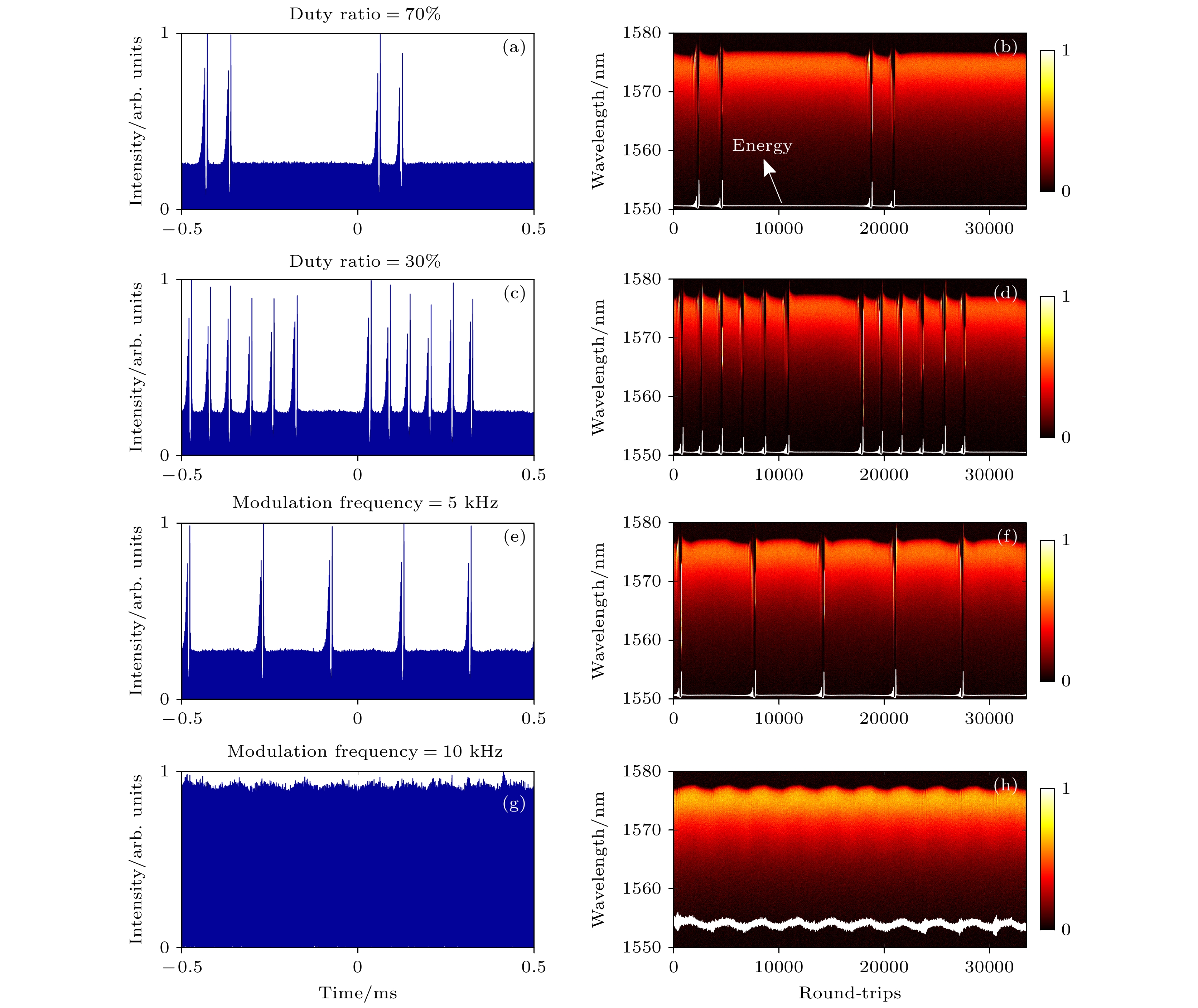 In this paper, the mode-locked pulse generation and annihilation dynamics in ultrafast fiber lasers based on pump intensity modulation are investigated by using real-time Fourier transform spectral probing. The results show that the laser outputs stable mode-locked pulses when the pump modulation voltage is at a high level. As the modulation voltage jumps to a low level, the intensity of the mode-locked pulse decreases, and then undergoes a period of decaying oscillation before annihilation occurs, and after ~5 μs the soliton is reconstructed from the noise, accompanied by the generation of theQ-modulation instability. In the low-level phase, the annihilation process in the laser cavity occurs continuously with a period of ~55 μs. By changing the duty cycle of the modulation pump, it is possible to control the the number of times solitons continuously annihilate under low-level modulation. Further, the continuous switching process of mode-locking and soliton annihilation is related to the modulation frequency of the pump, and the increase of the modulation frequency can effectively shorten the duration of the two states, thus reducing the number of soliton annihilations. In addition, by reducing the value of the low level, the gain in the laser cavity can be reduced, resulting in a shorter period of successive soliton annihilation. The results of the study are conducive to an in-depth understanding of the formation and annihilation dynamics of solitons, and provide new perspectives for developing various operation mechanisms of ultrafast lasers.