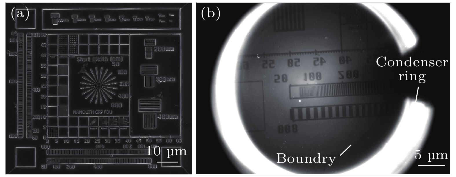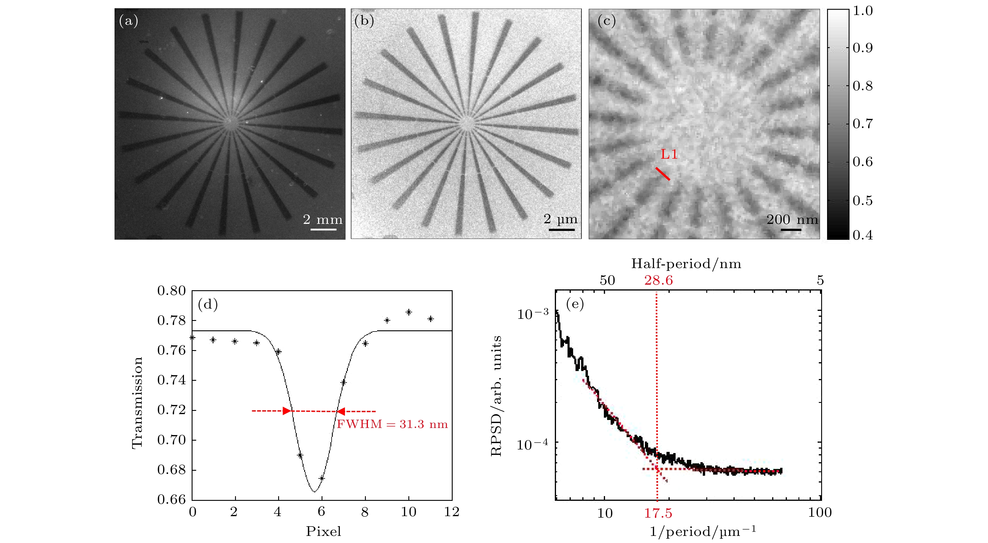 . Under these conditions, the limit resolution of this TXM instrument is 22 nm. The zone plate has a diameter of 70μm, a focal length of 8.7mm, and 616 zones. The TXM instrument uses a high-resolution optical coupling detector equipped with a scientific-grade CMOS camera with an effective pixel size of 7.52μm. The optical coupling detector is equipped with 2× and 10× high numerical aperture objectives. When the TXM instrument magnification is 50×, the effective pixel size of the TXM instrument is 15 nm. In addition,a gold resolution test card is used as the sample to determine the imaging field of view of the TXM instrument by observing the size of the imaging area of the test card on the detector, and to determine the imaging resolution of the TXM instrument by observing the line width of the star-shaped target in the center of the test card. Experimental results show that the TXM instrument has an imaging field of view of 26μm and can achieve the clear imaging of characteristic structure with a line width of 30 nm. The radial power spectrum curve of the Siemens Star shows this TXM instrument has the potential to resolve 28.6-nm half pitch line pair features. Finally, we draw some conclusions and present outlook. At present, imaging of 30-nm-wide line features has been realized, but the imaging of 30-nm half pitch line pair feature has not yet been achieved, and the limit resolution has not reached the design value, either. We will continue to explore the potential for upgrading the imaging resolution of the laboratory TXM in future work.