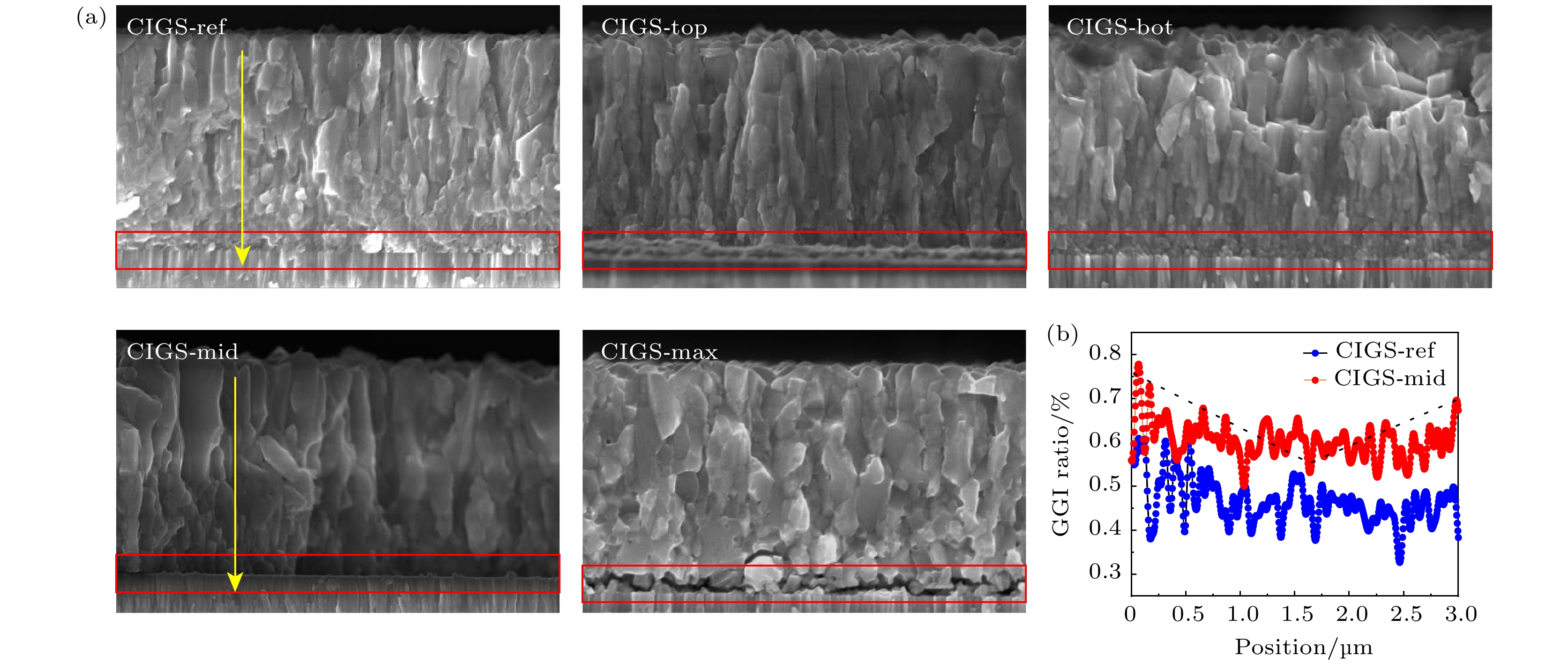 Thin-film solar cells provide an opportunity to reduce the cost of converting solar energy into electricity by replacing expensive and thick silicon wafers, which account for more than 50% of the total cost of photovoltaic (PV) modules. However, many thin-film solar cell materials result in low PV performance due to enhanced recombination through defect states. Cu(In,Ga)Se2(CIGS) is a promising thin-film solar cell material due to its direct tunable bandgap, high absorption coefficient, low effective electron and hole mass, and abundant constituent elements. Among them, magnetron sputtering or selenization technology is widely used to catch up with the development of preparing large-area CIGS thin-film solar cells because of its uniform film composition and simple process. However, the use of toxic gases such as H2Se and H2S and the difficulty in forming gradient bandgaps limit their development. In this work, the “V” Ga gradient classification of the absorbing layer of CIGS solar cells is realized by sputtering CuGaSe2(CGS) thin layers of different thickness values in the room temperature layer by sputtering and selenium-free methods of quaternary target sputtering. Firstly, the microstructure of the film is characterized by scanning electron microscope, X-ray diffraction, Raman and X-ray photoelectron spectroscopy, and when the CGS layer is located in the middle of the low-temperature layer, the grain size of the film is the largest, the crystallinity is the best, forming a “V-shaped” structure of CGI on the back of the absorbing layer. Subsequently, IV and external quantum efficiency (EQE) tests show that the optimized cell efficiency is as high as 15.04%, and the light response intensity is enhanced in the 300 -1200 nm band. Finally, the admittance spectrum(AS) test shows that the defect energy level of the solar cell changes from InGadefect toVCudefect of lower energy level, and the defect density decreases from 7.04×1015cm–3to 5.51×1015cm–3. This is comparable to the recording efficiency of the current single-target magnetron sputtering CIGS solar cells, demonstrating good application prospects.