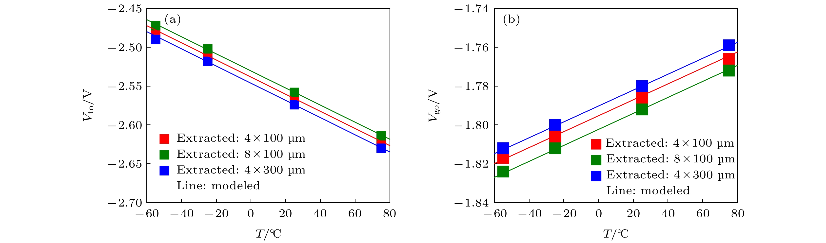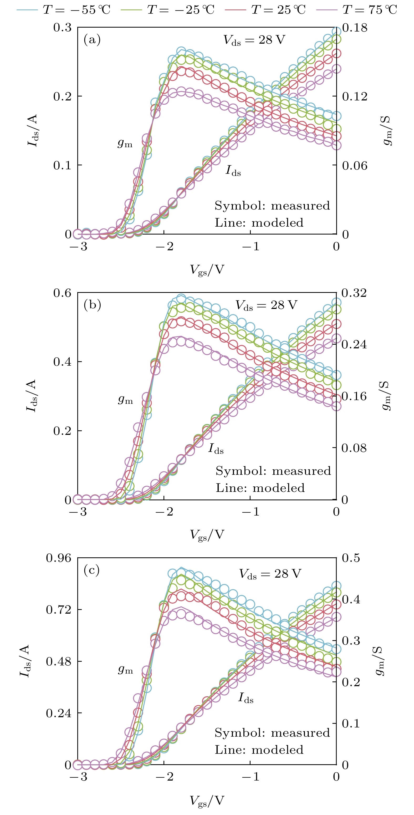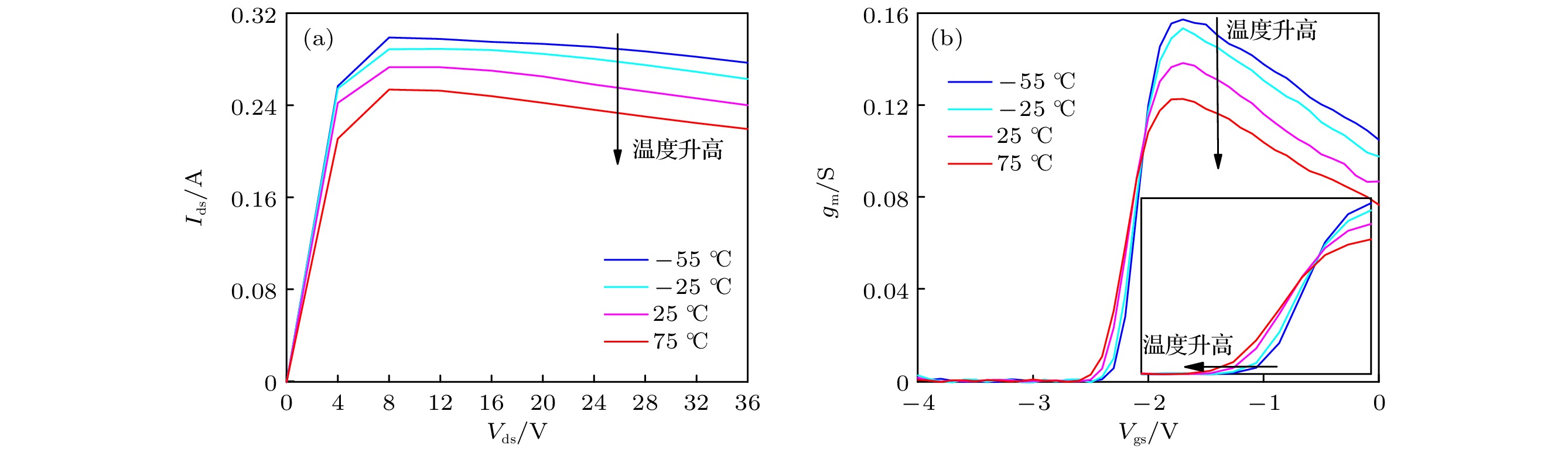 Due to the advantages of high power density, high efficiency, and great potential in extreme temperature environments, the GaN high electron mobility transistor (HEMT) device is widely used in circuit systems at high or low temperatures. However, its electrical performance is sensitive to the ambient temperature. Therefore, it is essential to build a model that can accurately characterize the electrical performance of GaN HEMTs at different ambient temperatures, which is also essential for precise circuit design. With the analysis of experiment and theory on the GaN HEMT at different ambient temperatures, an improved model for temperature effect on the DC characteristics of the GaN HEMT is proposed based on EEHEMT model. Considering the influence of the ambient temperature on electrical properties of the GaN HEMT, such as the threshold voltage, the knee voltage, and the saturated current, the model establishes a temperature-dependent function for key parameters in the formula of the drain-source current. Through Verilog-A implementation and simulation on the ICCAP software, the improved model accurately reflects the trend of the electrical performance changes of the GaN HEMT at different ambient temperatures. To further verify the model in this work, the on-wafer measurements at different temperatures including –55, –25, 25 and 75 ℃ are carried out for GaN HEMTs with different sizes, which are developed by Nanjing Electronic Devices Institute. Compared with the measured data, the output characteristics and the transfer characteristics simulated by the proposed model are accurate in an ambient temperature range of –55–75 ℃, with a relative fitting error less than 5%. The result shows that the improved model is of guiding significance in analyzing the direct current performance and high reliability design of circuits at different temperatures.