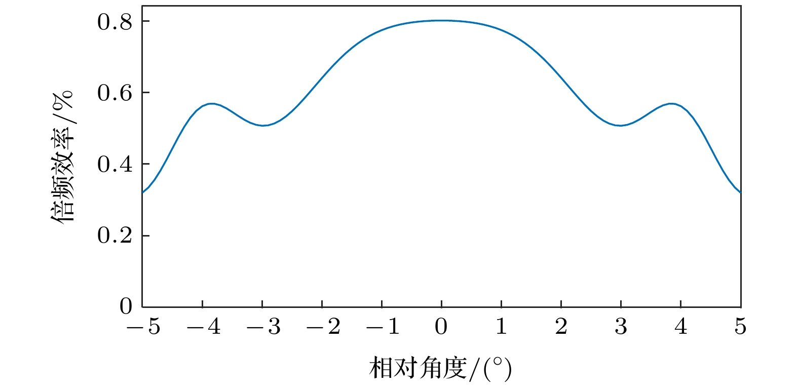 , the designed CPPLN crystal exhibits a maximum SHG efficiency of 0.80% and a minimum one of 0.51%, which indicates that the SHG efficiency of this crystal in this range can be maintained at 60% of the maximum efficiency. The experimental results show that the SHG efficiency can be more than 11 times that of LBO crystal. Moreover, the study indicates that the half width of the actual SHG efficiency near the incident angle of the designed CPPLN crystal can exceed