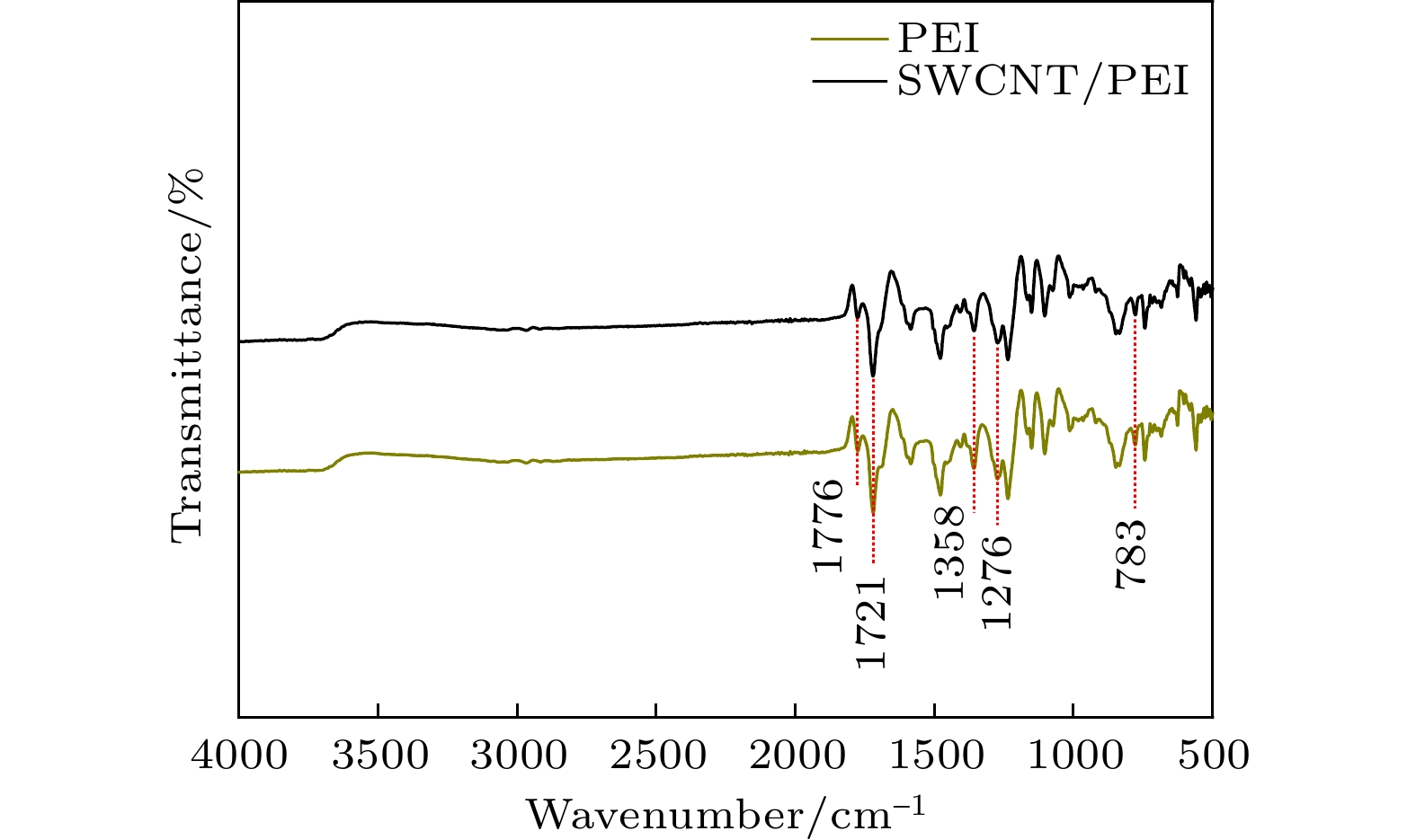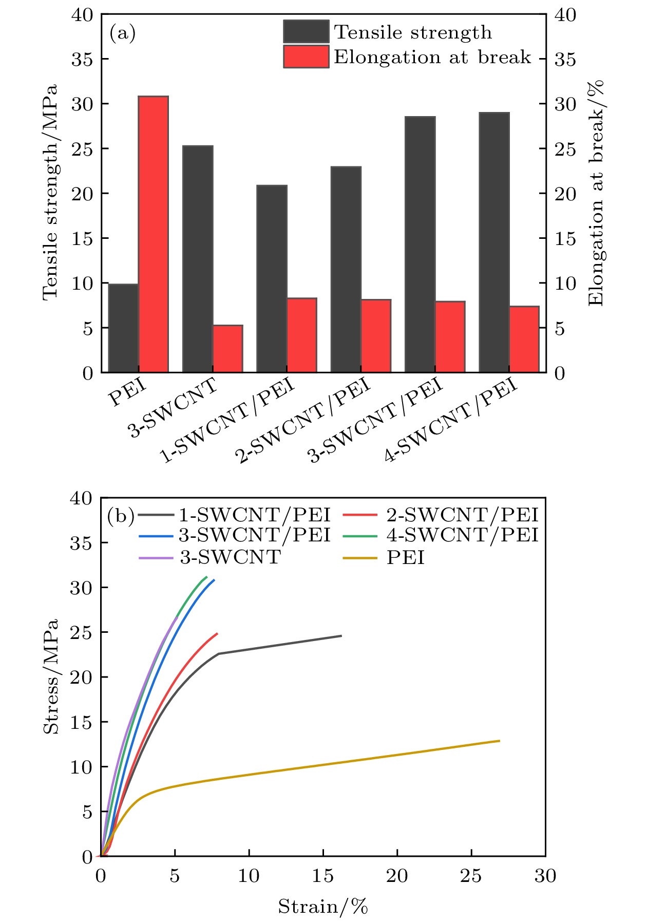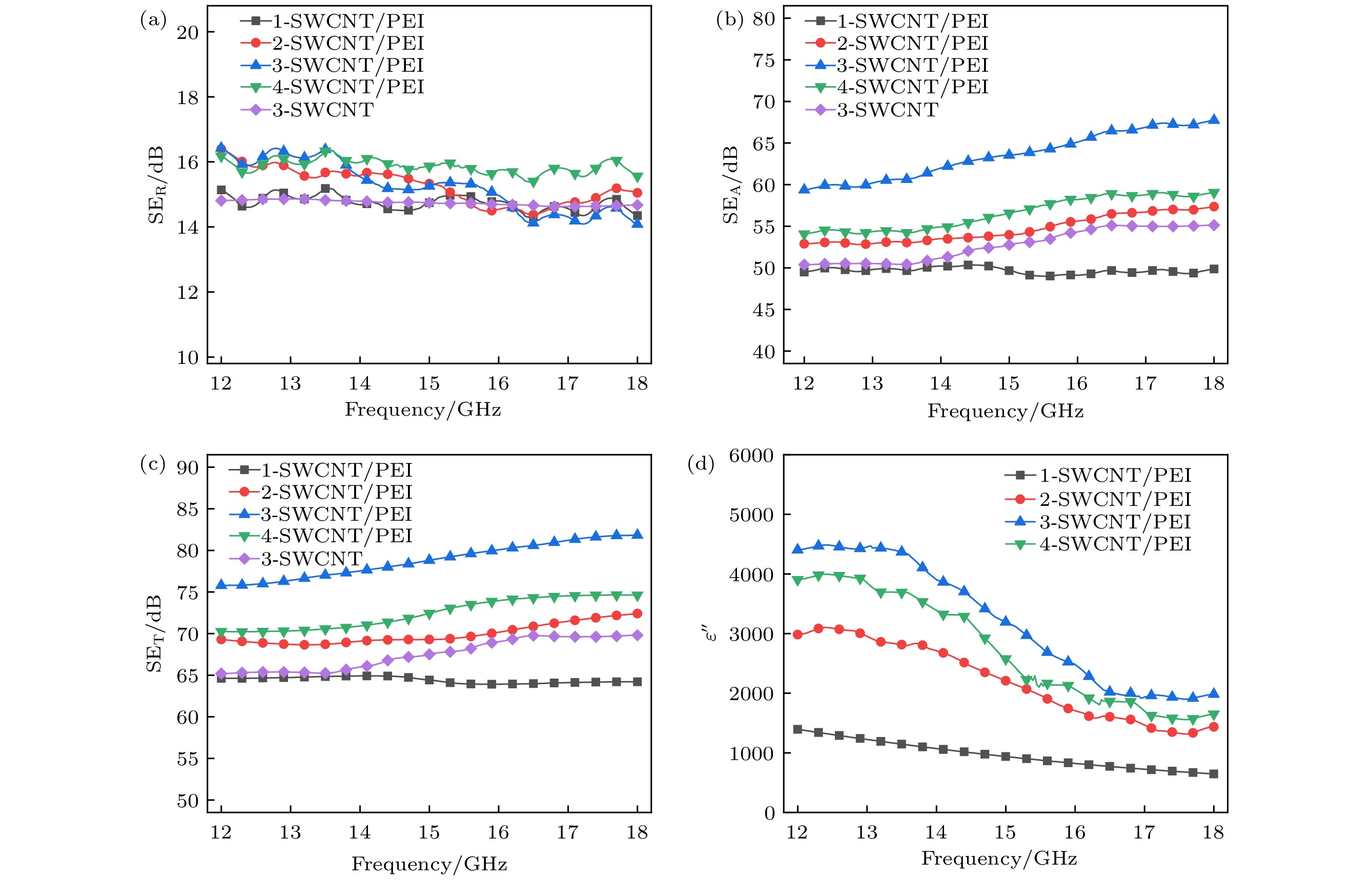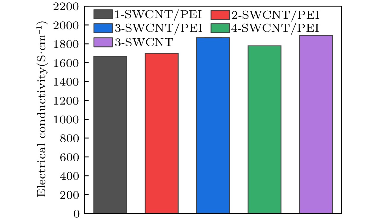 In practical applications, flexibility, lightweight, and high performance are the characteristics that polymer-based electromagnetic shielding materials should have. At present, it is still a great challenge to prepare polymer-based electromagnetic shielding materials with excellent conductivity, electromagnetic shielding properties, and mechanical properties. Therefore, in this work, single-walled carbon nanotubes/polyetherimide composite films are prepared by electrostatic spinning and vacuum-assisted filtration through using single-walled carbon nanotubes and polyetherimide as raw materials. By regulating the surface density of single-walled carbon nanotubes, the conductivity of the composite film can be enhanced to 1866 S/cm. For the electromagnetic shielding performance, the total electromagnetic shielding effectiveness of single-walled carbon nanotubes/polyetherimide composite film in Ku band (12–18 GHz) is in a range of 75.78–81.83 dB, which is higher than that of pure single-walled carbon nanotube film (65.19–69.81 dB). This is attributed to the formation of interfaces between the polyetherimide fibers and the single-walled carbon nanotubes, with more interfaces consuming more electromagnetic wave energy for a given range of single-walled carbon nanotube surface densities. For the mechanical properties, the maximum tensile strength and elongation at the break of the single-walled carbon nanotube/polyetherimide film are 1.13 and 1.5 times higher than those of the single-walled carbon nanotube film, with the values of 28.52 MPa and 7.91%, respectively. As the surface density of single-walled carbon nanotubes increases, the interaction between single-walled carbon nanotubes as well as the interaction between polyetherimide fibers and single-walled carbon nanotubes at the interface plays a role in enhancing the mechanical properties of the composite films. The single-walled carbon nanotube/polyetherimide composite films, as an excellent polymer-based electromagnetic shielding composite material, can be used in fields such as the protection of precision electronic instruments and wearable electronic devices.