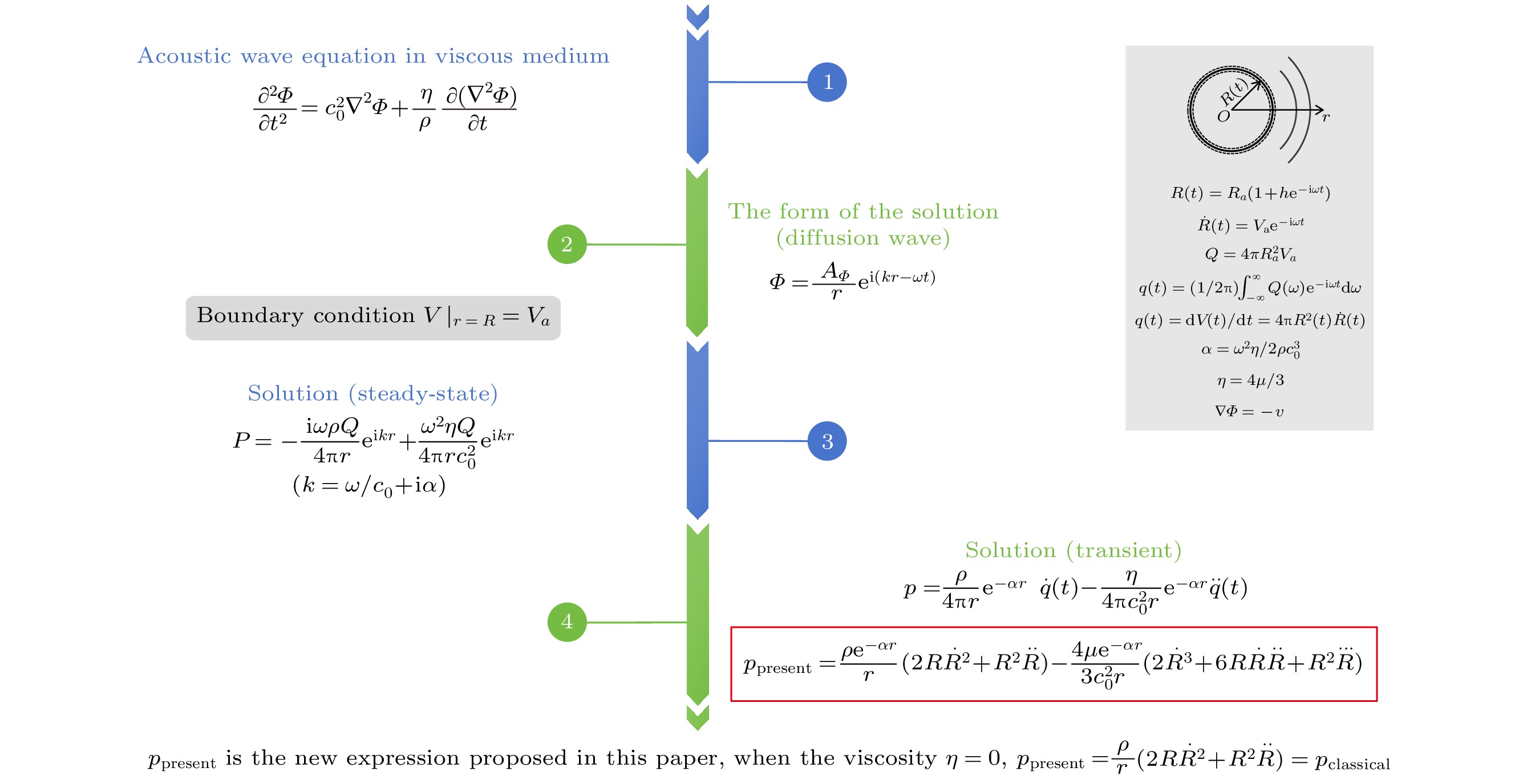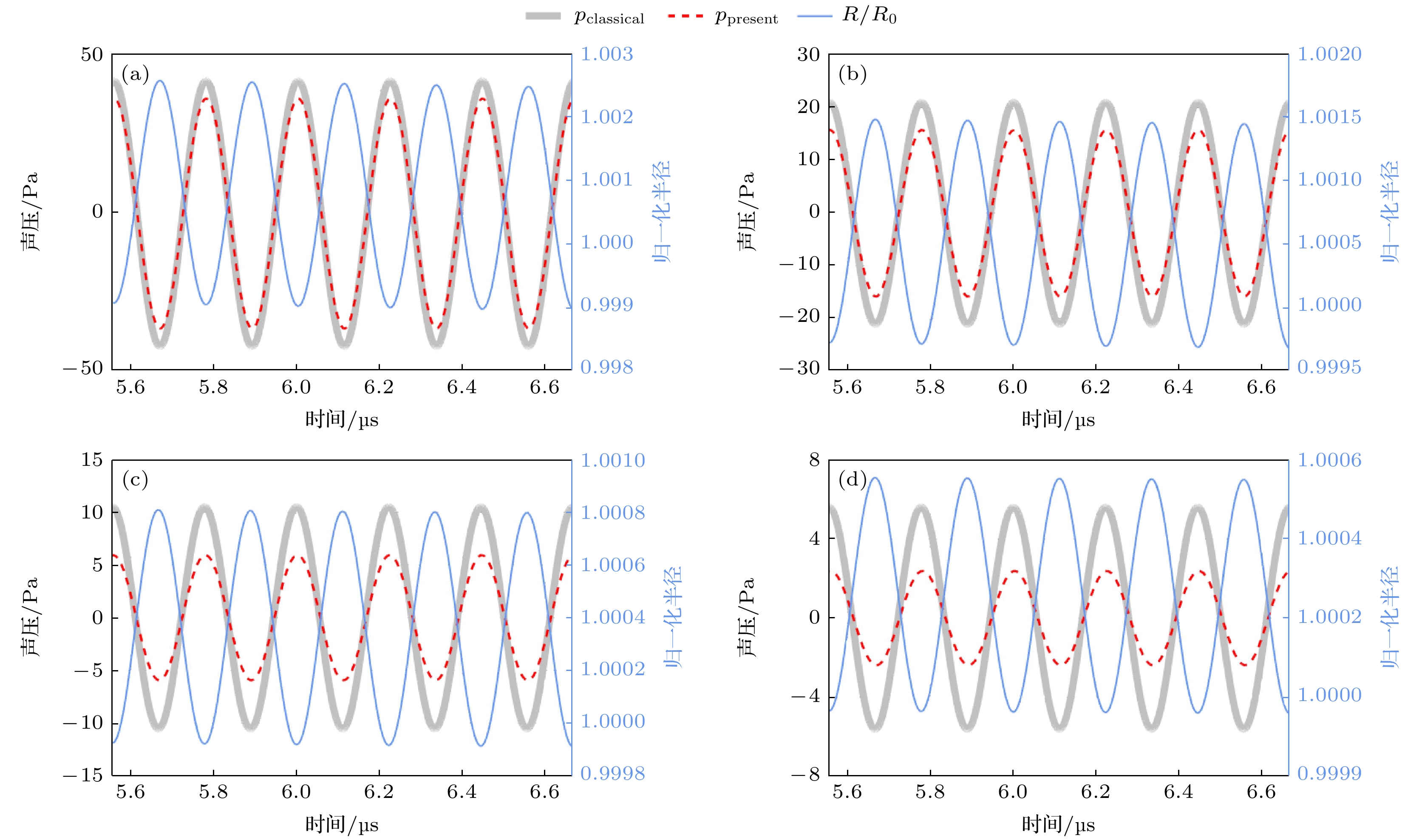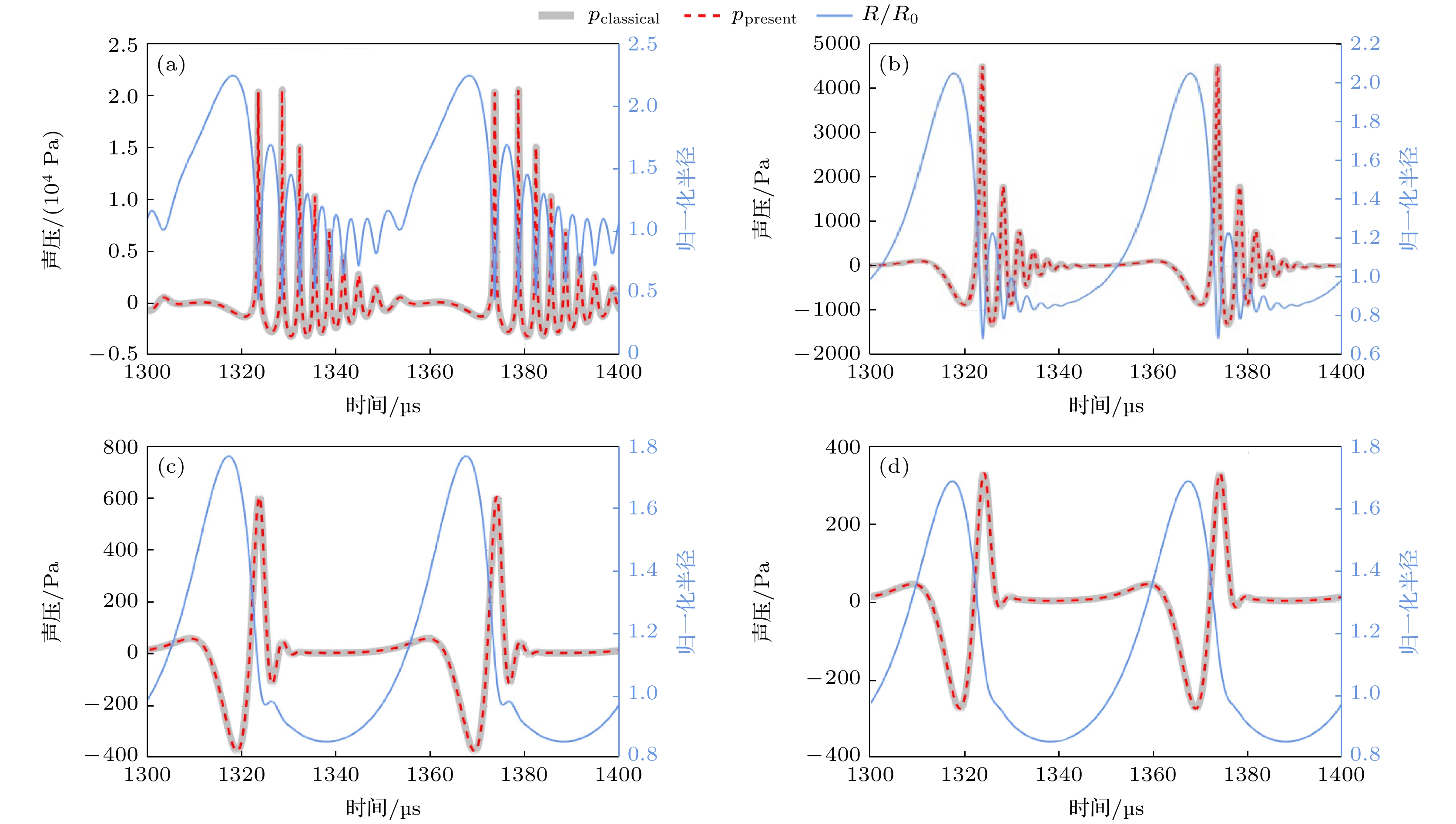 classicalin the cases of high-viscosity, high-frequency and long-distance. In these cases, continuing to measure the acoustic emission of bubbles by using the classical expression may have an influence on the characteristics of cavitation, such as the inaccurate descriptions of parameters such as cavitation intensity and cavitation threshold.