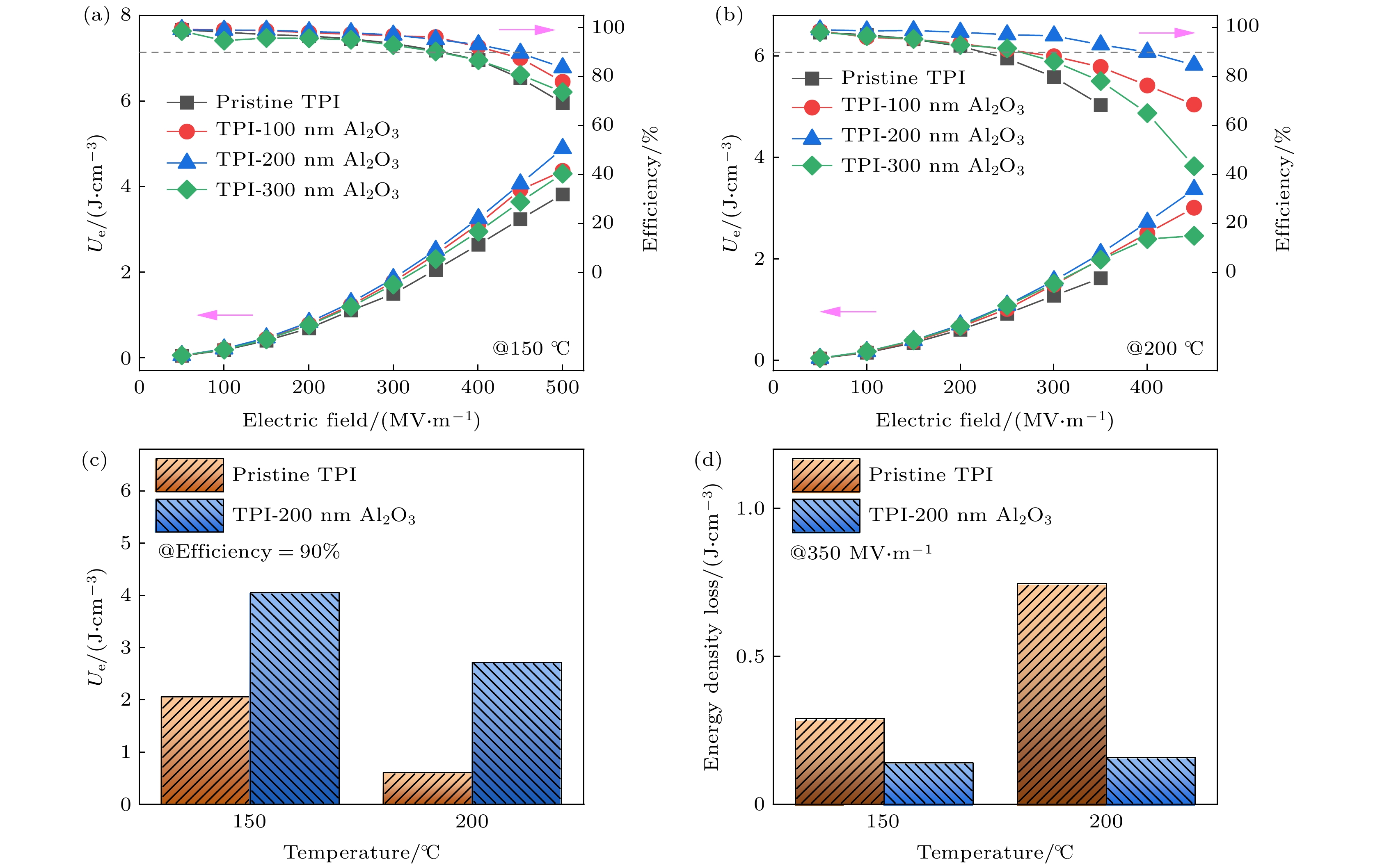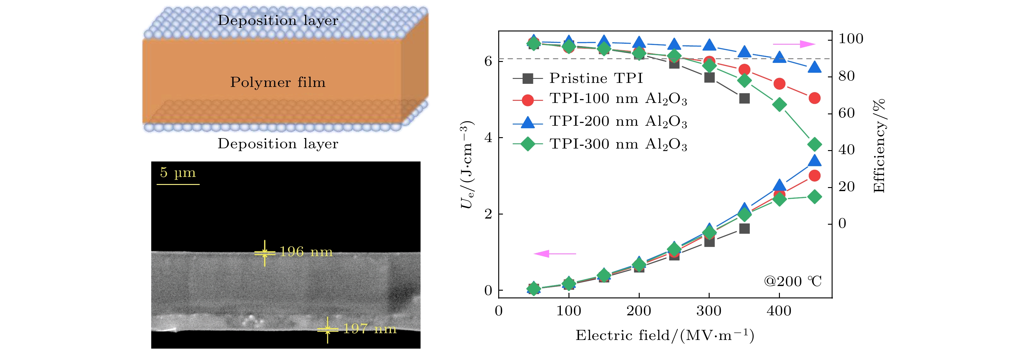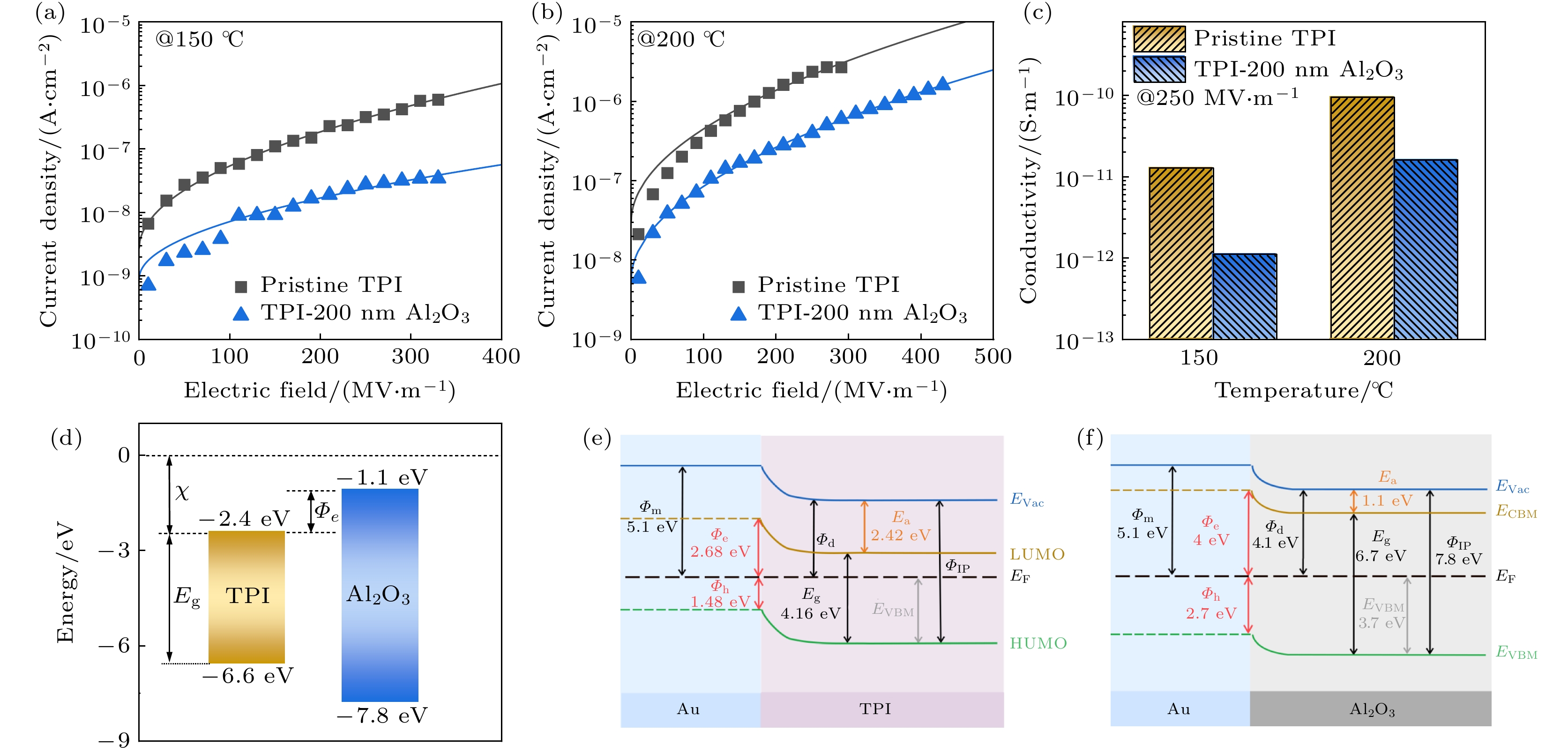 Dielectric capacitors are essential components in advanced electronic and power systems due to their high power densities, fast charge-discharge rates, low losses, and excellent cycling stabilities. Polymer dielectrics, such as biaxially oriented polypropylene (BOPP), are preferred dielectric materials for high-voltage capacitors because of their high breakdown strength, flexibility, and easy processing. However, their relatively low thermal stability limits their applications in high-temperature environments, such as in electric vehicles and photovoltaic power generation systems. In this study, sandwich-structured dielectric films are prepared by using physical vapor deposition (PVD) to deposit aluminum oxide (Al2O3) layers onto thermoplastic polyimide (TPI) films to achieve high capacitive energy storage at high temperatures. The TPI films are chosen for their high glass transition temperature (Tg), while Al2O3layers are deposited to enhance the Schottky barrier, thereby suppressing electrode charge injection, reducing leakage current, and improving breakdown strength at high temperatures. Various characterization techniques are employed to assess the microstructure, dielectric properties, and energy storage performance of the prepared Al2O3/TPI/Al2O3sandwich-structured films. The results demonstrate that the Al2O3coating exhibits excellent interfacial adhesion with TPI films, successfully inhibiting charge injection and thereby reducing leakage current. For instance, at 150 °C and 250 MV/m, the leakage current density of TPI film is 3.19×10–7A/cm², whereas for Al2O3/TPI/Al2O3sandwich-structured film, its leakage current density is 2.77×10–8A/cm², a decrease of one order of magnitude. The suppression of charge injection and reduction of leakage current contribute to outstanding discharge energy density (Ud) and charge-discharge efficiency (η) at high temperatures. Specifically, at high temperatures of 150 and 200 °C, theUdreaches 4.06 and 2.72 J/cm³, respectively, withη> 90%, i.e. increasing 98.0% and 349.4% compared with those of pure TPI films. Furthermore, the PVD process used for fabricating these sandwich-structured films is highly compatible with existing methods of producing metal electrodes in capacitors, offering significant advantages in production efficiency and cost control. This study suggests that the Al2O3/TPI/Al2O3sandwich-structured films, prepared by using the PVD process and exhibiting exceptional high-temperature capacitive energy storage performance, are highly promising for applications in environments with high temperatures and high electric fields.