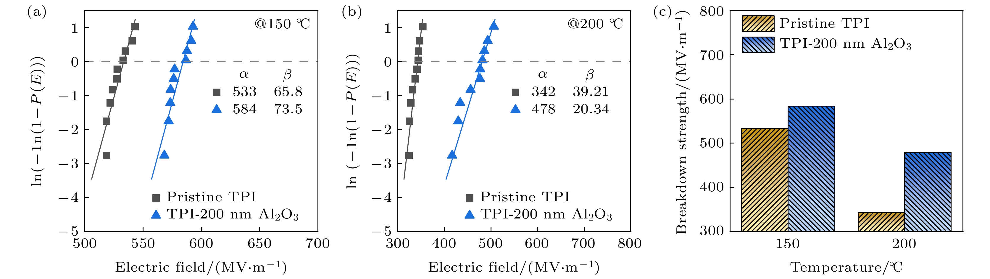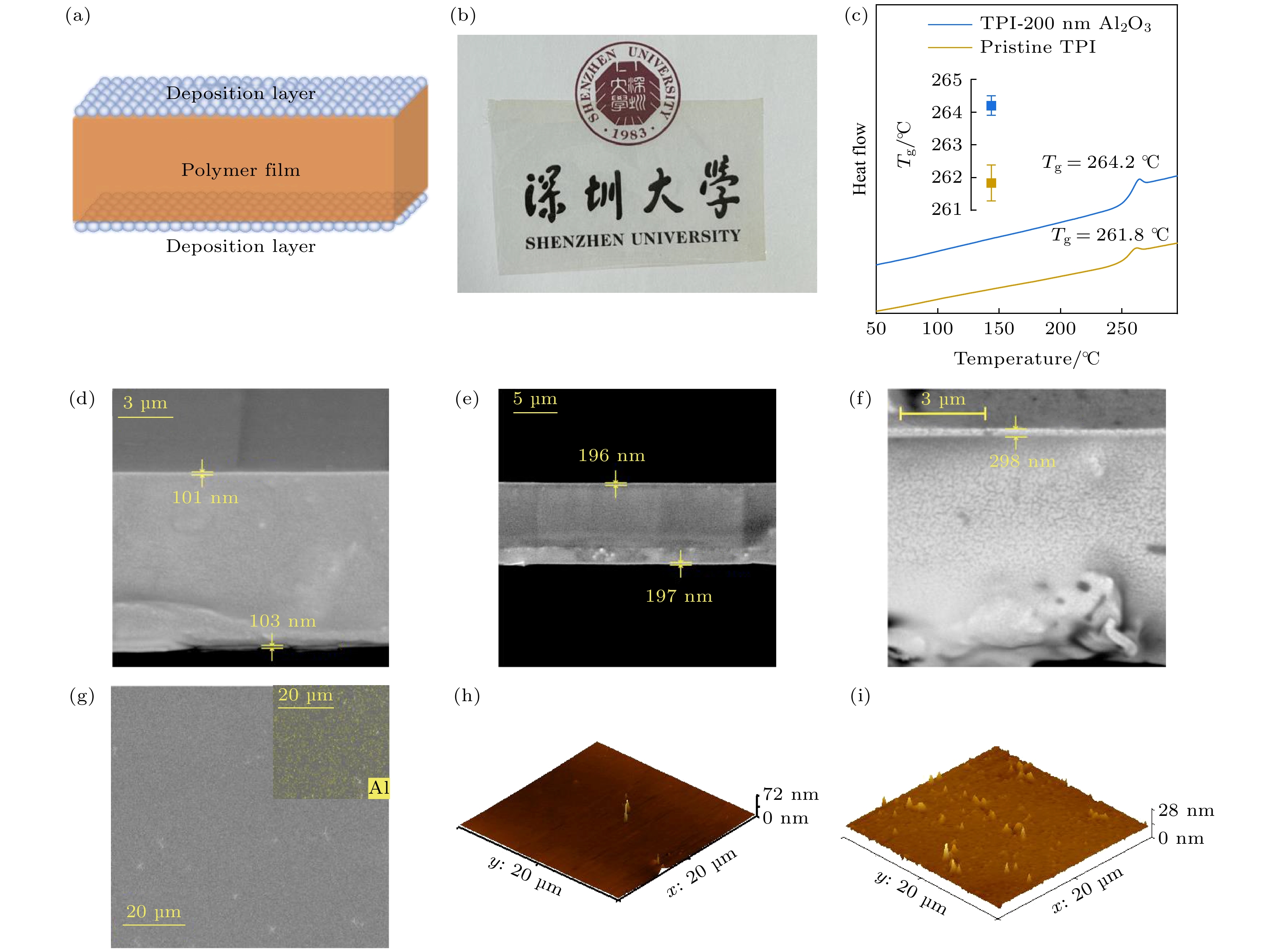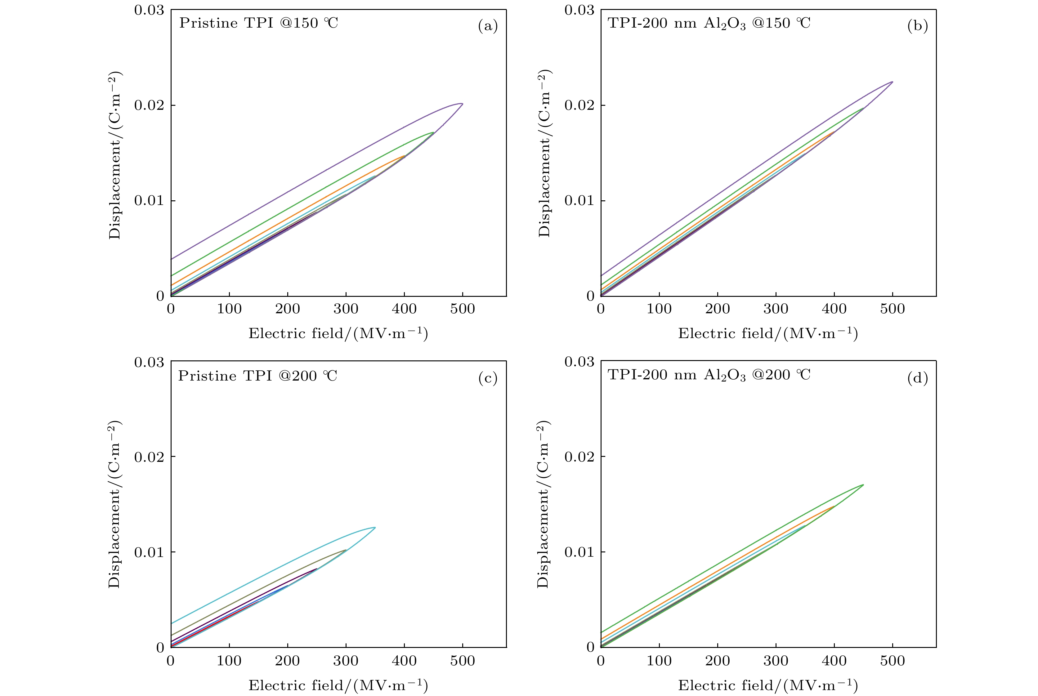 Dielectric capacitors are essential components in advanced electronic and power systems due to their high power densities, fast charge-discharge rates, low losses, and excellent cycling stabilities. Polymer dielectrics, such as biaxially oriented polypropylene (BOPP), are preferred dielectric materials for high-voltage capacitors because of their high breakdown strength, flexibility, and easy processing. However, their relatively low thermal stability limits their applications in high-temperature environments, such as in electric vehicles and photovoltaic power generation systems. In this study, sandwich-structured dielectric films are prepared by using physical vapor deposition (PVD) to deposit aluminum oxide (Al2O3) layers onto thermoplastic polyimide (TPI) films to achieve high capacitive energy storage at high temperatures. The TPI films are chosen for their high glass transition temperature (Tg), while Al2O3layers are deposited to enhance the Schottky barrier, thereby suppressing electrode charge injection, reducing leakage current, and improving breakdown strength at high temperatures. Various characterization techniques are employed to assess the microstructure, dielectric properties, and energy storage performance of the prepared Al2O3/TPI/Al2O3sandwich-structured films. The results demonstrate that the Al2O3coating exhibits excellent interfacial adhesion with TPI films, successfully inhibiting charge injection and thereby reducing leakage current. For instance, at 150 °C and 250 MV/m, the leakage current density of TPI film is 3.19×10–7A/cm², whereas for Al2O3/TPI/Al2O3sandwich-structured film, its leakage current density is 2.77×10–8A/cm², a decrease of one order of magnitude. The suppression of charge injection and reduction of leakage current contribute to outstanding discharge energy density (Ud) and charge-discharge efficiency (η) at high temperatures. Specifically, at high temperatures of 150 and 200 °C, theUdreaches 4.06 and 2.72 J/cm³, respectively, withη> 90%, i.e. increasing 98.0% and 349.4% compared with those of pure TPI films. Furthermore, the PVD process used for fabricating these sandwich-structured films is highly compatible with existing methods of producing metal electrodes in capacitors, offering significant advantages in production efficiency and cost control. This study suggests that the Al2O3/TPI/Al2O3sandwich-structured films, prepared by using the PVD process and exhibiting exceptional high-temperature capacitive energy storage performance, are highly promising for applications in environments with high temperatures and high electric fields.