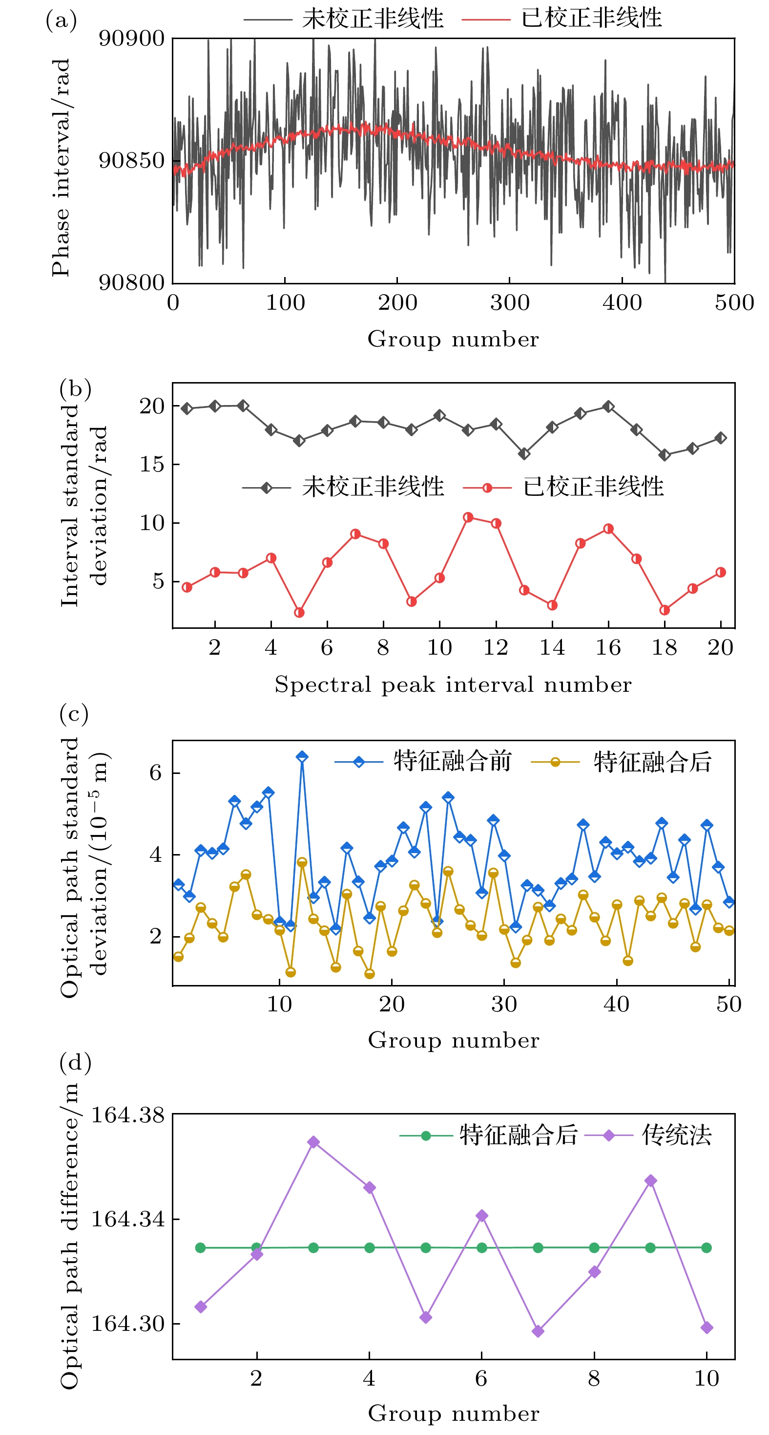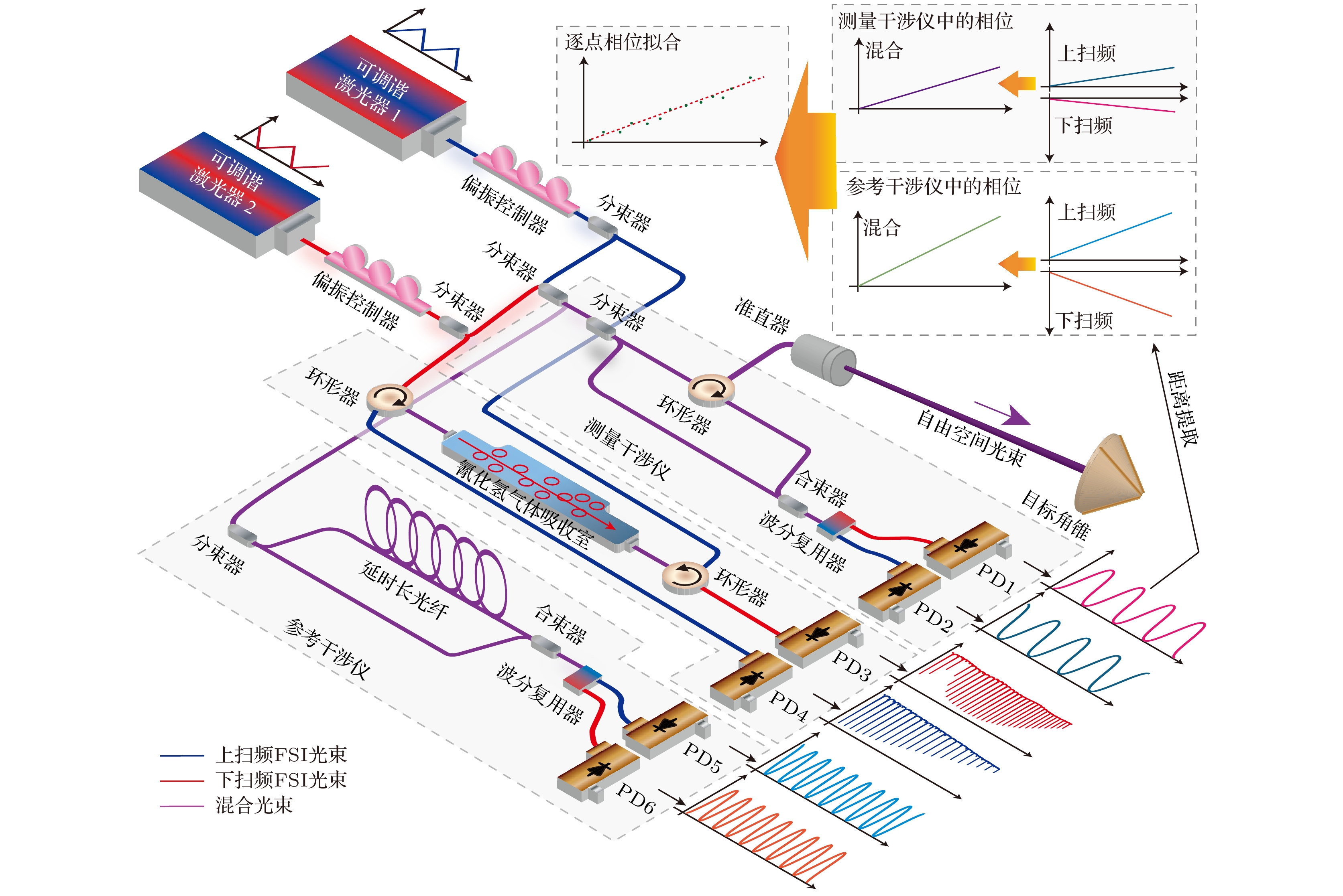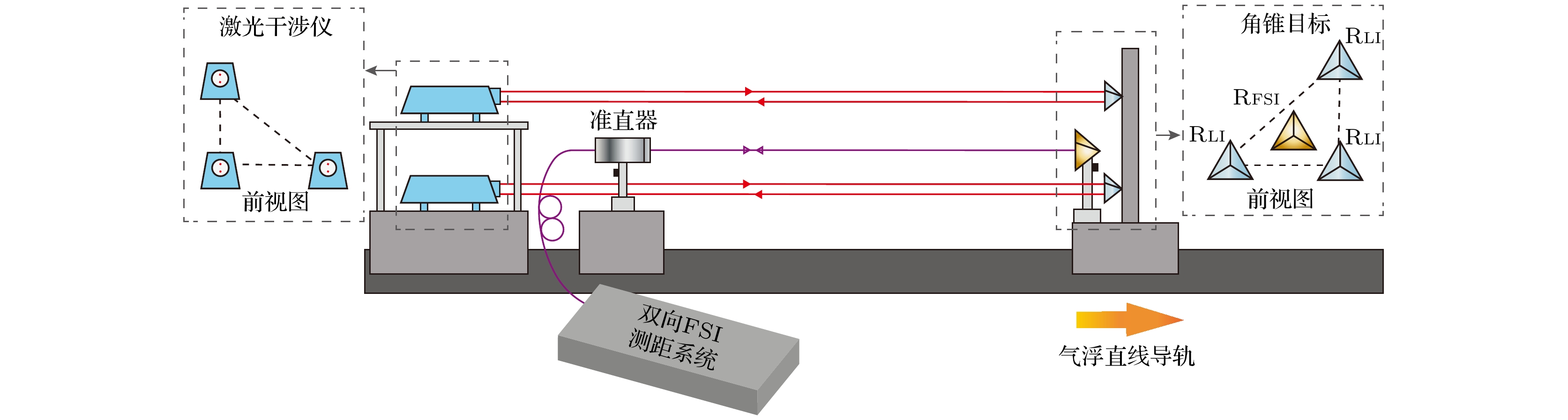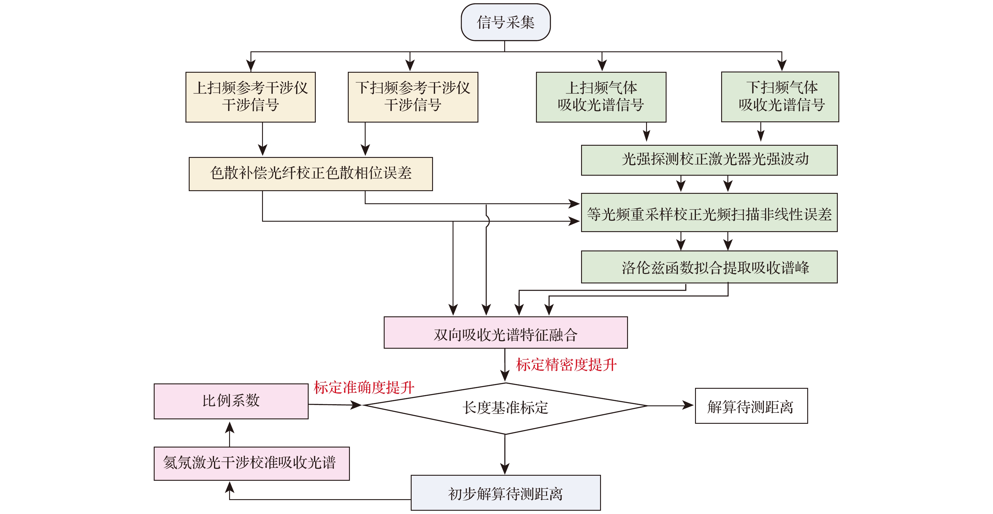 Accurate measurement of length is an important foundation for ensuring the quality of advanced manufacturing equipment. In recent years, absolute ranging technology represented by frequency scanning interferometry (FSI) has gradually become a widely used ranging method in the manufacturing industry due to its advantages of high precision, high flexibility, and no range ambiguity. To address the repeatability and accuracy of length reference calibration in FSI absolute ranging, this paper proposes a method of accurately calibrating length reference based on bidirectional absorption spectrum feature fusion and proportional coefficient calibration, by using gas absorption spectroscopy to calibrate the delayed long fiber path length as a length reference in the distance measurement system online, and by using weighted linear least squares method to solve the differences in uncertainty among different absorption spectrum peaks. To address the problem of low repeatability in optical fiber path length calibration by using absorption spectroscopy, a method of utilizing bidirectional absorption spectrum feature fusion is proposed, thereby improving the precision of optical fiber path length calibration. To address the issue of insufficient accuracy in absolute optical frequency of absorption spectrum peaks, a calibration method by using a single absorption spectrum proportional coefficient is proposed. Compared with the idea of calibrating the optical frequency of each peak one by one, this method is simple and direct, thus improving the accuracy of fiber path length calibration. To verify the effectiveness of the above methods, the experiments on repeated precision evaluation, proportional coefficient calibration, and accuracy comparison are conducted separately. The experimental results show that the standard deviation for calibrating the optical path length of 164 m fiber is 10–30 μm. Under the conditions of system temperature rise and temperature stability, the distance measurement standard deviations are not greater than 5 μm in the measurement ranges of 0–10 m and 0–15 m, and the distance comparison residuals are not greater than ±4 μm, demonstrating the good distance measurement performance of the system. In the future, we will carry out thermal insulation and temperature control of the gas absorption chamber and the entire ranging optical path, and study the stability of the spectral proportionality coefficient and absorption peaks while controlling external environmental factors.