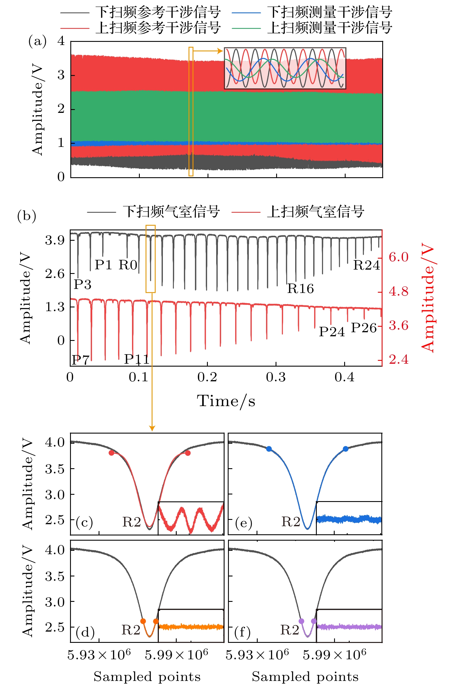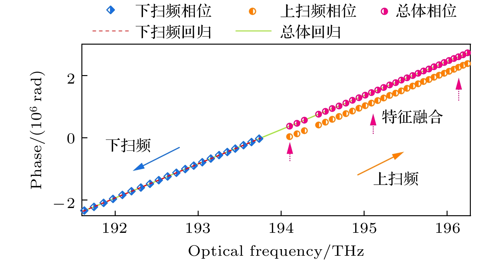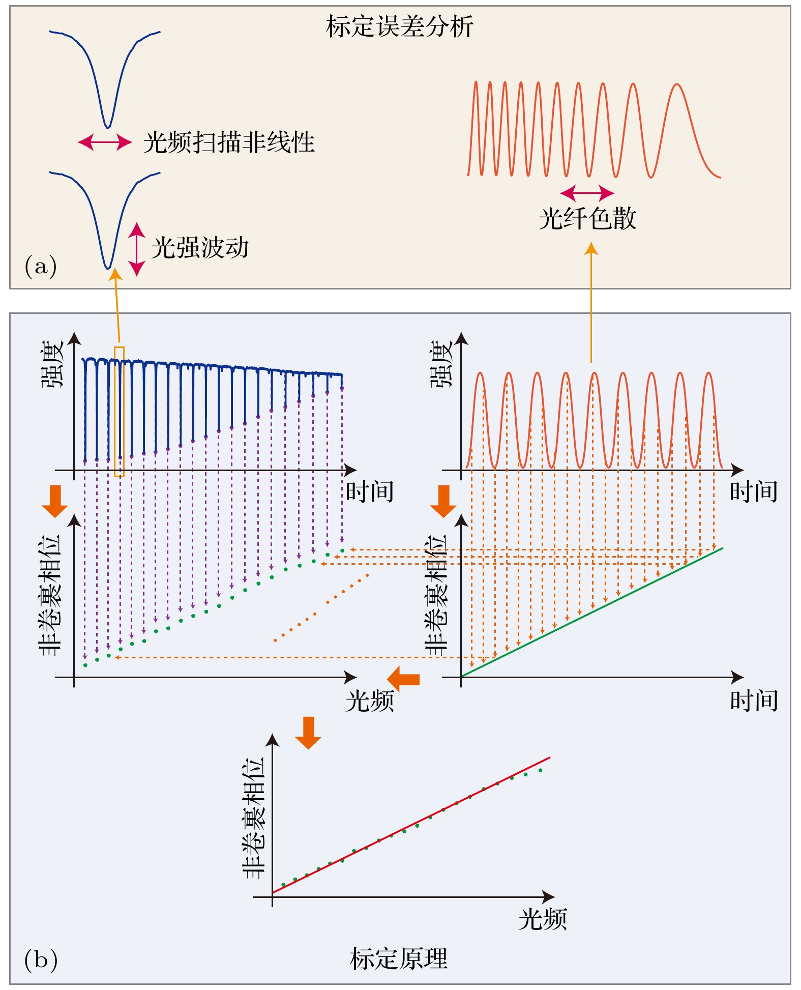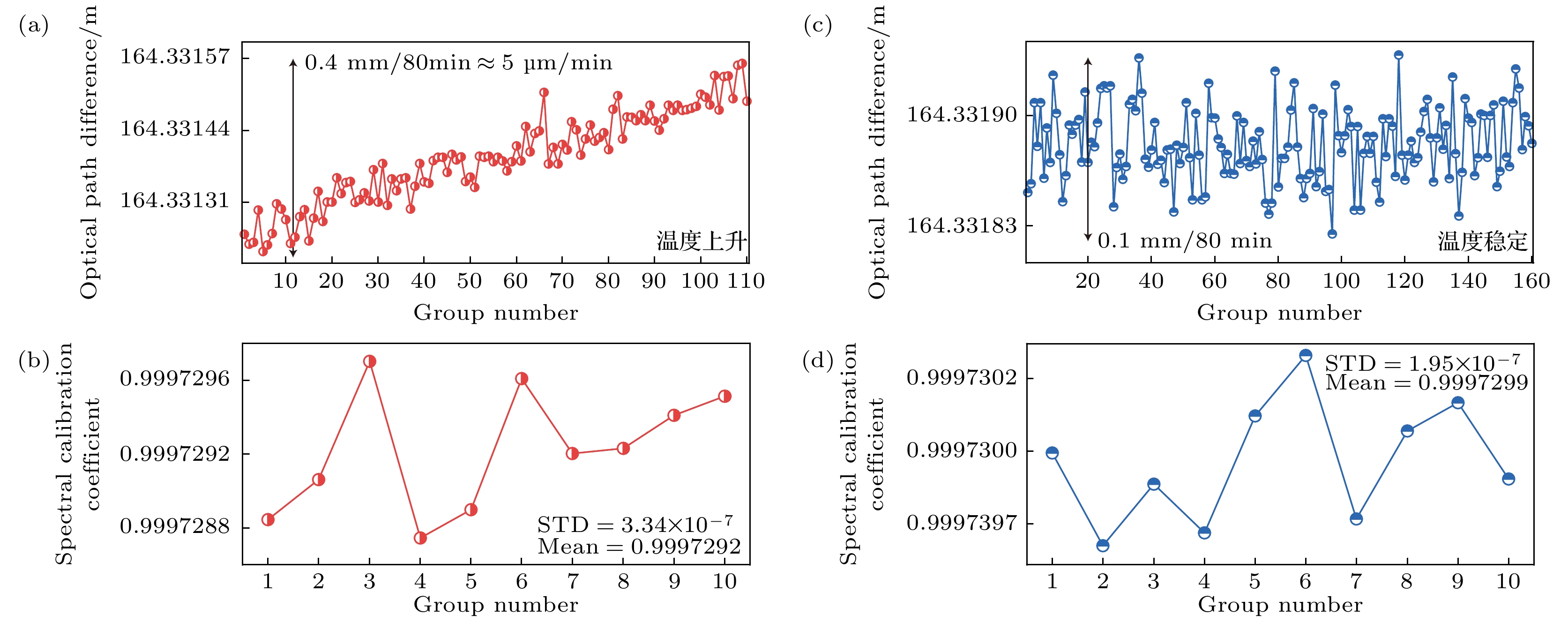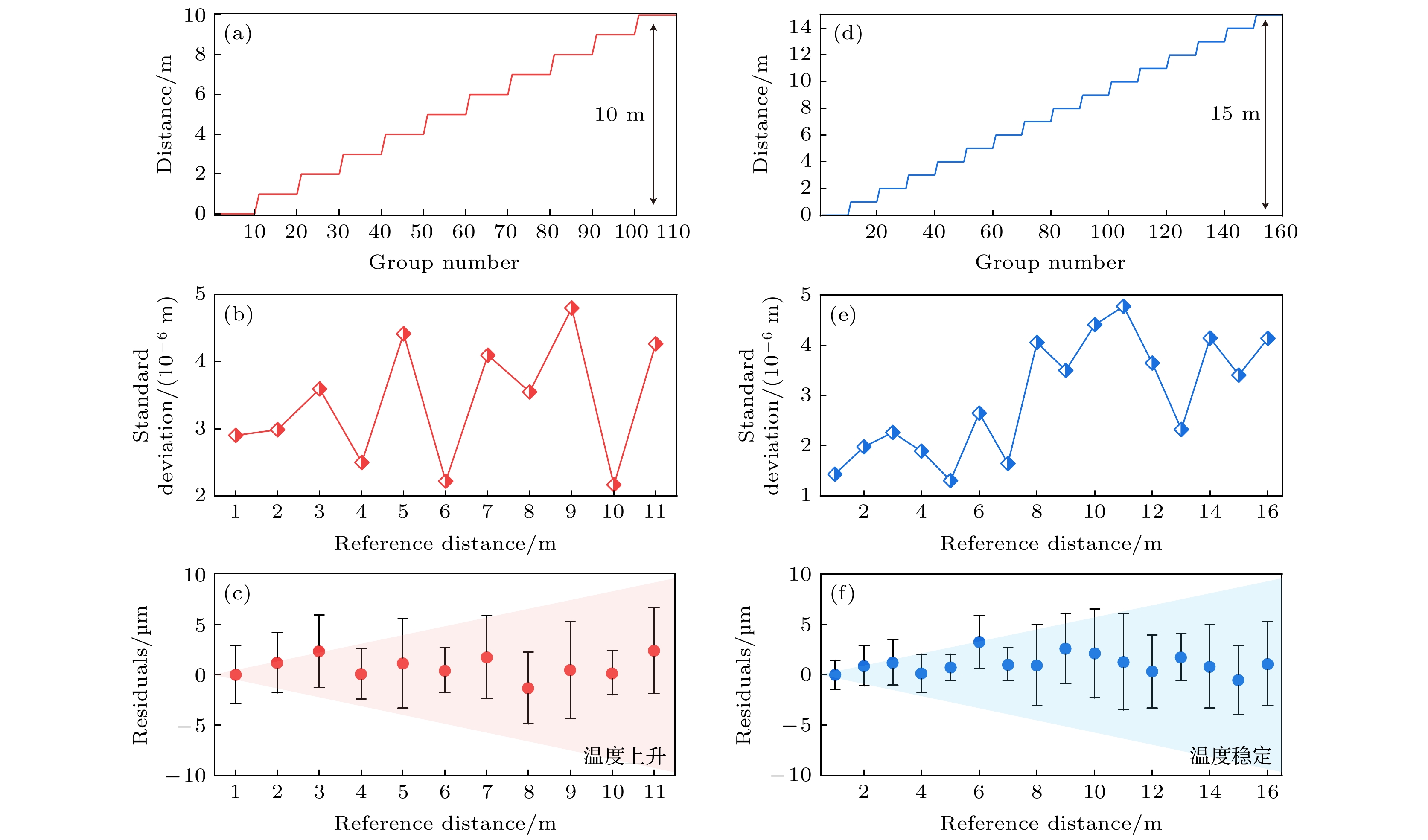 Accurate measurement of length is an important foundation for ensuring the quality of advanced manufacturing equipment. In recent years, absolute ranging technology represented by frequency scanning interferometry (FSI) has gradually become a widely used ranging method in the manufacturing industry due to its advantages of high precision, high flexibility, and no range ambiguity. To address the repeatability and accuracy of length reference calibration in FSI absolute ranging, this paper proposes a method of accurately calibrating length reference based on bidirectional absorption spectrum feature fusion and proportional coefficient calibration, by using gas absorption spectroscopy to calibrate the delayed long fiber path length as a length reference in the distance measurement system online, and by using weighted linear least squares method to solve the differences in uncertainty among different absorption spectrum peaks. To address the problem of low repeatability in optical fiber path length calibration by using absorption spectroscopy, a method of utilizing bidirectional absorption spectrum feature fusion is proposed, thereby improving the precision of optical fiber path length calibration. To address the issue of insufficient accuracy in absolute optical frequency of absorption spectrum peaks, a calibration method by using a single absorption spectrum proportional coefficient is proposed. Compared with the idea of calibrating the optical frequency of each peak one by one, this method is simple and direct, thus improving the accuracy of fiber path length calibration. To verify the effectiveness of the above methods, the experiments on repeated precision evaluation, proportional coefficient calibration, and accuracy comparison are conducted separately. The experimental results show that the standard deviation for calibrating the optical path length of 164 m fiber is 10–30 μm. Under the conditions of system temperature rise and temperature stability, the distance measurement standard deviations are not greater than 5 μm in the measurement ranges of 0–10 m and 0–15 m, and the distance comparison residuals are not greater than ±4 μm, demonstrating the good distance measurement performance of the system. In the future, we will carry out thermal insulation and temperature control of the gas absorption chamber and the entire ranging optical path, and study the stability of the spectral proportionality coefficient and absorption peaks while controlling external environmental factors.