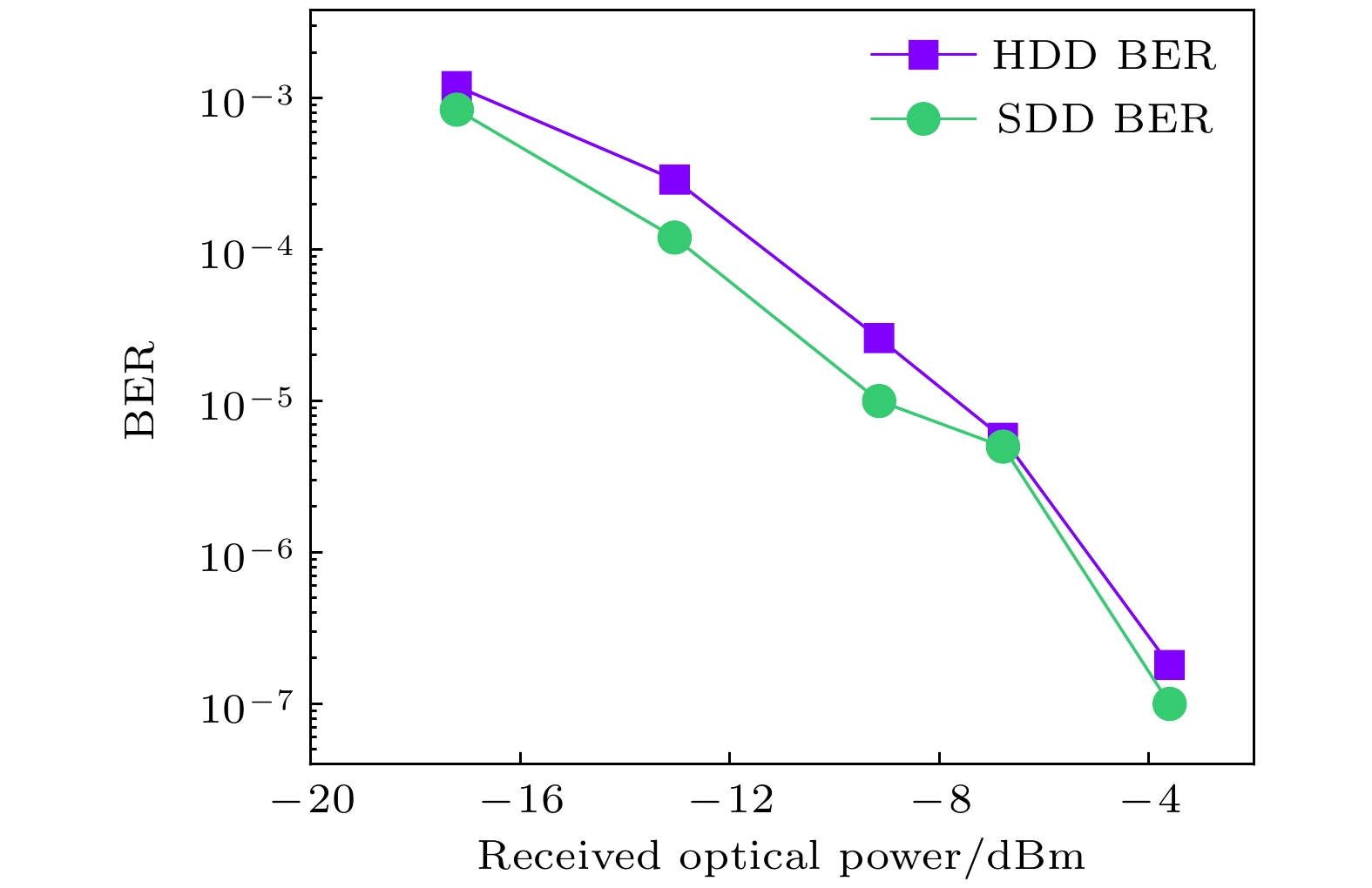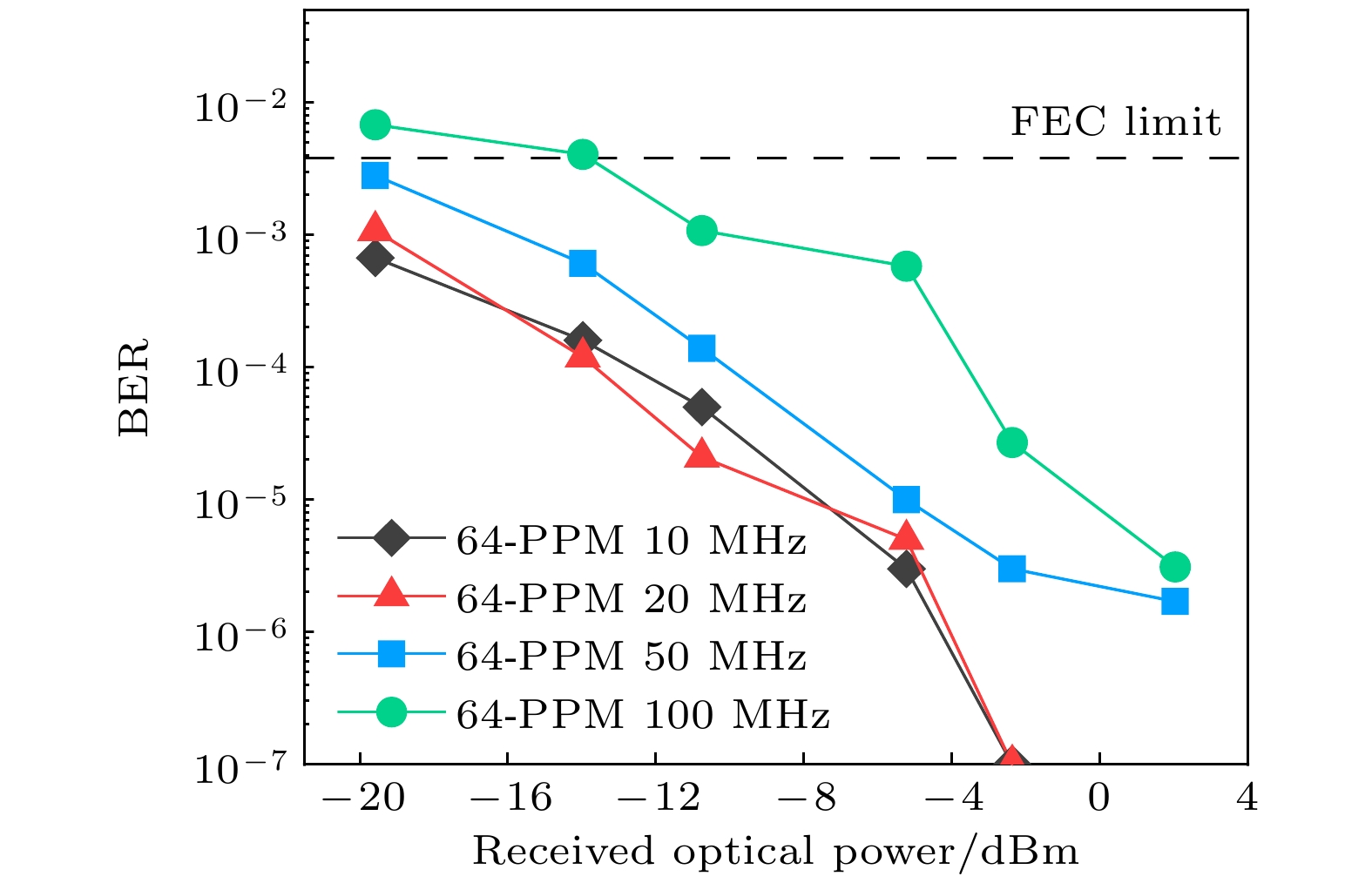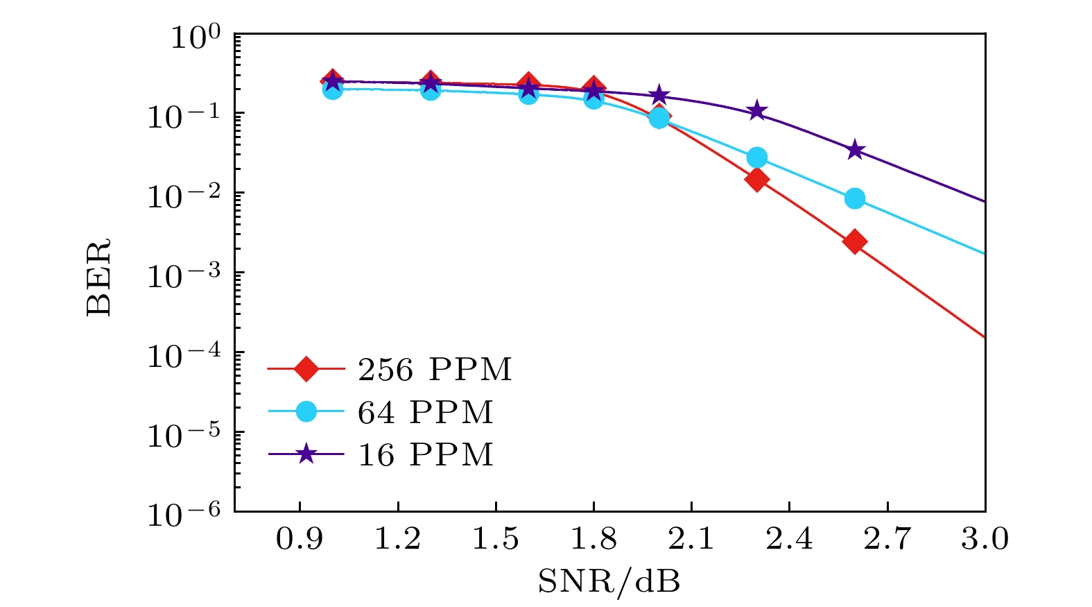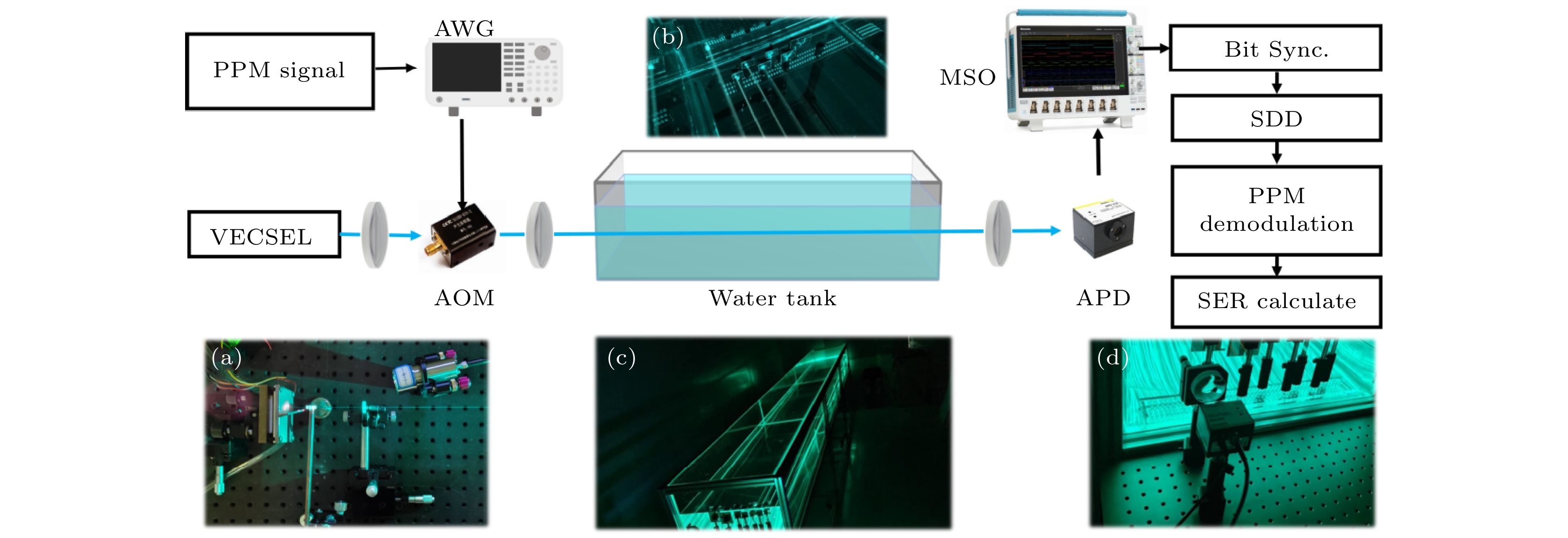 The exploration and utilization of marine resources has promoted the rapid development of marine science and technology, and has put forward higher requirements for underwater communication technology. Long distance underwater wireless optical communication (UWOC) requires the selection of light source on the transmitter side. Laser diodes (LDs) have excellent portability and maneuverability, and have been widely used in the UWOC systems. However, their beam quality is not so good and it is difficult to modulate under high power. In recent years, vertical-external-cavity surface-emitting laser (VECSEL) has received much attention due to its high output power and good beam quality. This work is to explore the advantages of using a 490-nm blue VECSEL as a light source in UWOC, and to improve the performance of the UWOC system by the soft-decision pulse-position modulation (PPM). First, the optical power attenuation coefficient of the channel is obtained, and the measuredcis about 0.0591 m–1in a 96-m-long tap channel. Subsequently, soft-decision and hard-decision are simulated and experimentally verified. Both simulations and measurements show that the bit error rate (BER) can be significantly reduced with soft-decision. Afterwards, we improve the system by using the soft-decision algorithm and investigate the communication performance of 64 PPMs at different bandwidths by adjusting the PPM signal rate. Finally, 50 MHz is chosen as a signal rate in the experiment. Then a UWOC system is demonstrated in this work. The transmitter side consists of a 490-nm VECSEL light source with an acousto-optic modulator (AOM). The pseudo-random binary sequence (PRBS) is loaded into the arbitrary waveform generator (AWG) for digital-to-analog conversion after PPM modulation, and the analog signal is sent to the driver of the AOM for acousto-optic modulation of the incident beam. The laser is focused before entering the AOM and then collimated after having exited to reduce its divergence. The modulated laser beam passes through a distance of 96 m in the tank by using multiple mirrors on both sides of the tank. Then, the beam is focused by a lens to the avalanche photodiode (APD) for photoelectric conversion in the end, and the signal is processed by a mixed signal oscilloscope (MSO) after data acquisition. A soft-decision algorithm is introduced to further optimize the performance of the PPM modulation. When the optical signal passes through a relatively long distance of 96 m, the measured BER is as low as 1.9 × 10–5. This indicates that the soft-decision PPM-based 490 nm blue VECSEL UWOC system performs very well.