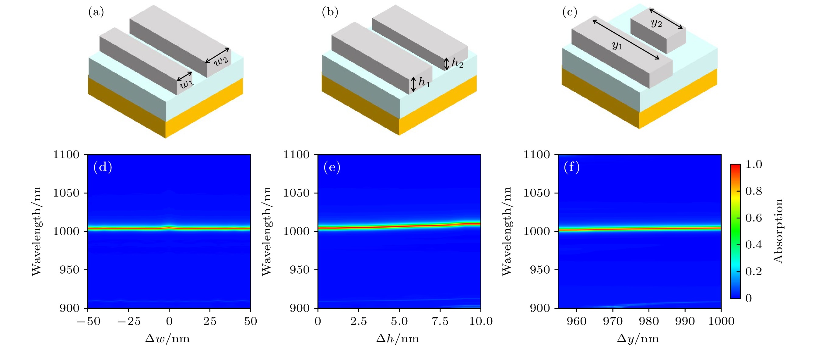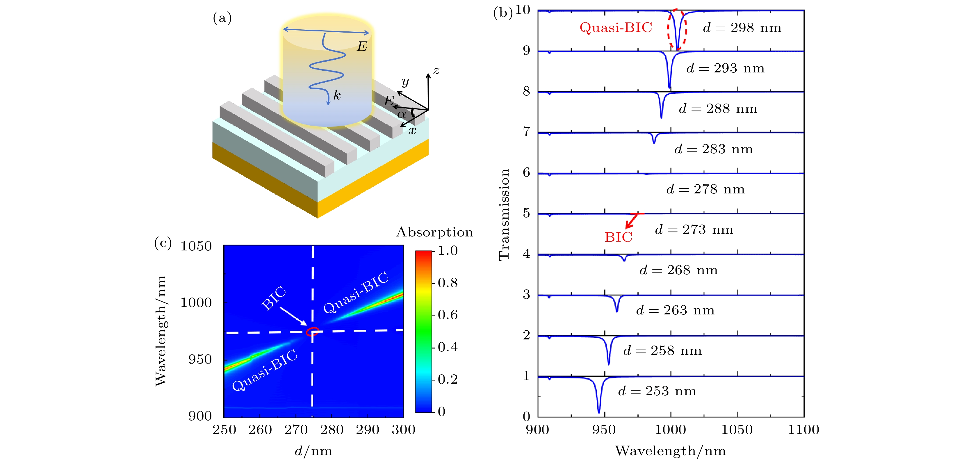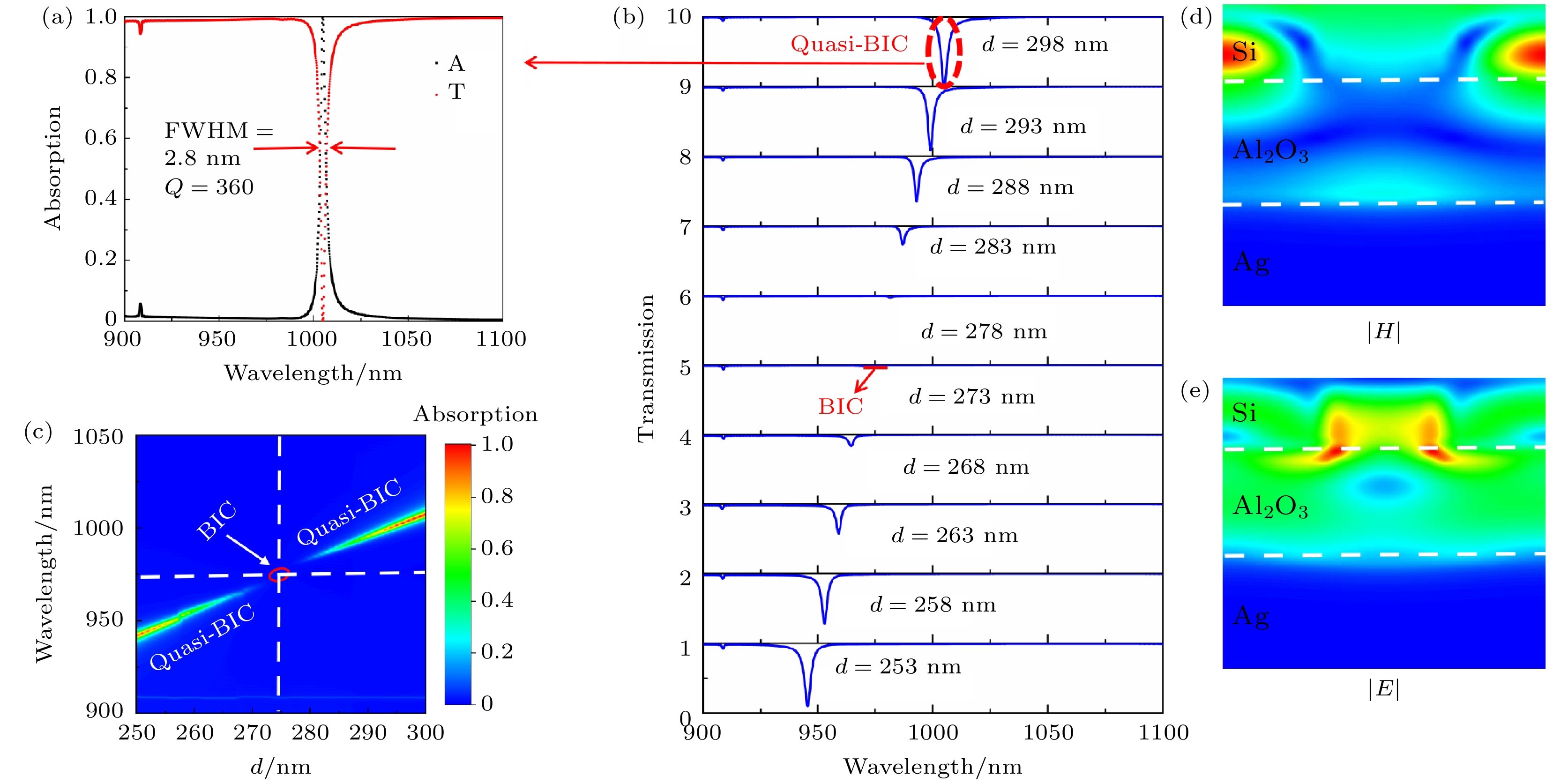 Excellent optical absorbers are always characterized by high quality factors and perfect absorption; however, these absorbers usually encounter the ohmic losses due to traditional surface plasmon resonance, which limits their absorption performance in practical applications. To address the problem, a tunable bound state in the continuum (BIC) based on Fabry-Perot cavity is proposed in this work. Figure (a) shows the structural model of the designed Fabry-Perot cavity absorber, which consists of Ag as a substrate, a layer of the dielectric material Al2O3above the Ag substrate, and a high-refractive-index grating as the top dielectric layer Si ridge. By adjusting the thickness parameterdof Al2O3, the transformation of BIC into q-BIC is achieved. Specifically, whendis increased from 273 nm to 298 nm, the BIC can be transformed into quasi-BIC, and the perfect absorption of the absorber in the continuum spectrum can be increased to 100%. In this work, the factors affecting the perfect absorption are explored by using the interference theory; theoretical calculations of the quasi-BIC are carried out by using the coupled mode theory and impedance matching theory; the physical mechanism of the BIC is explained by using the electric and magnetic field theory. The BIC is caused by the electric and magnetic dipole modes as well as the mirror image of the base Ag, which causes the interferential phase cancellation effect. Compared with the conventional absorber, the proposed absorber has excellent structural parameter robustness and a wide range of BIC modulation. More importantly, the absorber has excellent sensing performance with a maximum sensitivity of up to 34 nm/RIU and a maximum quality factor of 9.5. Last but not least, the absorber also achieves dual-frequency open-light performance, the maximum modulation depth and the minimum insertion loss of the dual-frequency switch reach 99.4% and 0.0004 dB, respectively. These findings have significant implications in the fields of photonics, optical communication, and sensor technology.