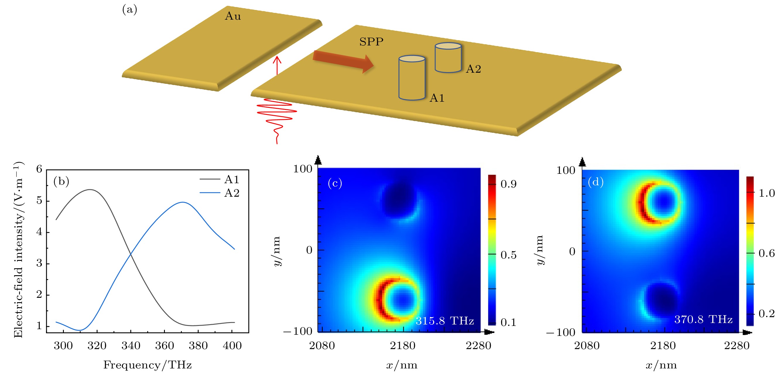 Understanding the propagation characteristics of surface plasmon polaritons (SPPs) is of great significance in designing and constructing on-chip integrated systems utilizing plasmonic effect. Accurately characterizing and flexibly controlling SPP on thin metal film are indispensable. Here, we theoretically derive the group velocity dispersion of SPP propagation on the surface of Au films with various thicknesses. The results obtained in this work indicate that when the thickness of the Au film is less than 40 nm, group velocity dispersion of SPP decreases significantly as the film thickness increases. The decrease of group velocity dispersion becomes mild with the thickness increasing from 40 nm to 60 nm, then the dispersion keeps a very low constant value for the film thicker than 60 nm. Using the finite-difference time-domain method, temporal evolution of localized electric field of SPP is numerically simulated for various propagation distances. By comparing the field amplitudes and the dispersions of SPP which are excited by incident light pulses with different dispersions, group velocity dispersions of SPP on the Au films are obtained, showing a good consistence with the theoretical results. Moreover, we demonstrate that by utilizing the tailored SPP to excite metal nanoantenna, selective excitations at different frequencies on a femtosecond temporal scale can be achieved through localized surface plasmonic resonant effect. Manipulating the sign and amount of the dispersion from the incident pulse, the active control of the switching sequence and switching time of electric field between the Au cylinders can be achieved. Manipulating the propagation distance of SPP, the active control of the switching time of electric field between the Au cylinders can be achieved. Therefore, those results provide a promising avenue for realizing functions such as signal propagation, reception, adjustment, and encoding in on-chip interconnect circuit systems based on SPP. This work shows that the dispersion can be used as degree of freedom for controlling the amplitude, phase and pulse width of SPP propagating on thin film, and it is of great importance in designing and controlling on-chip integrated systems through utilizing plasmonic effect, such as ultrafast frequency demodulators and nanoantennas in on-chip interconnect optical circuits.