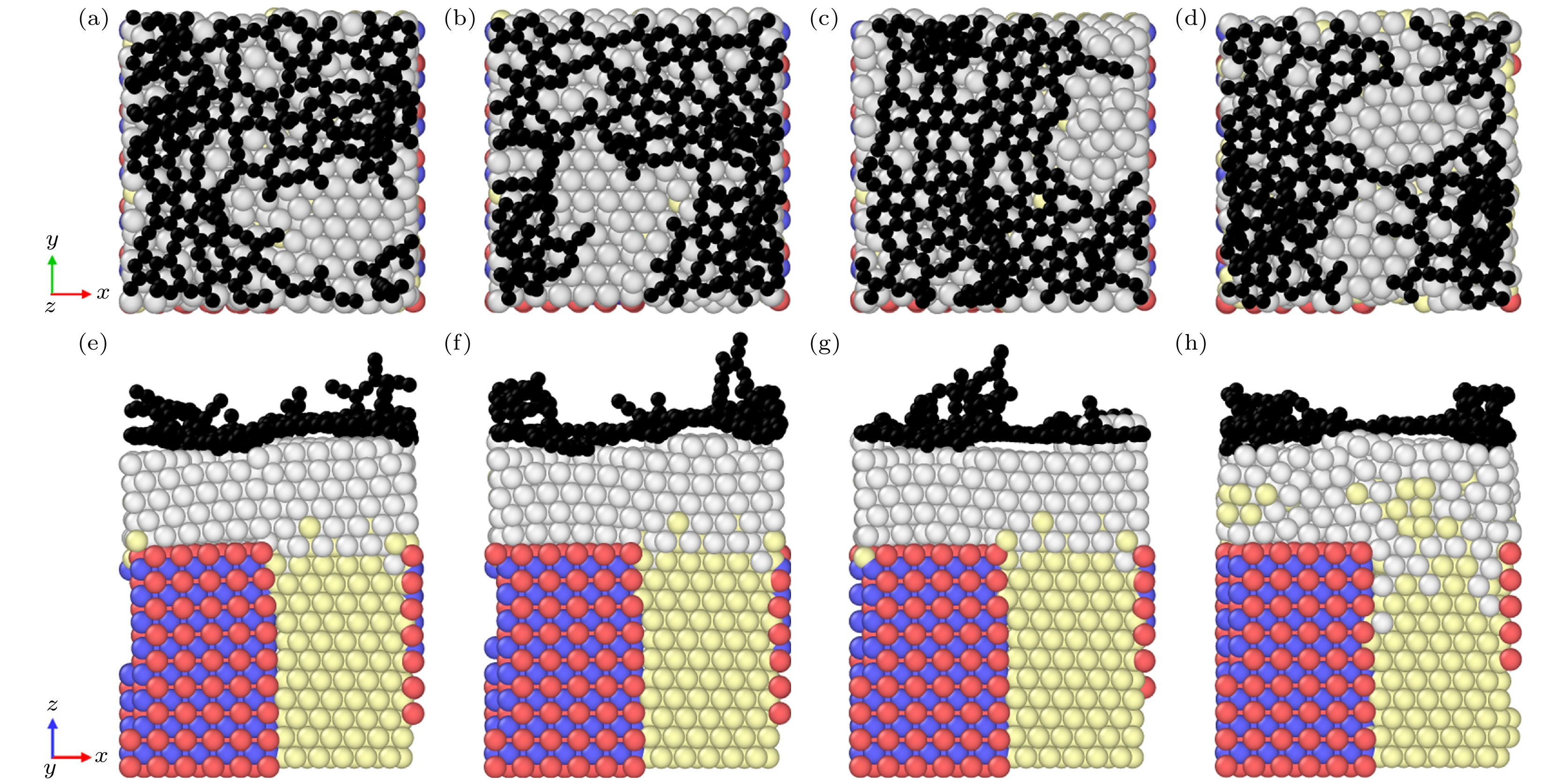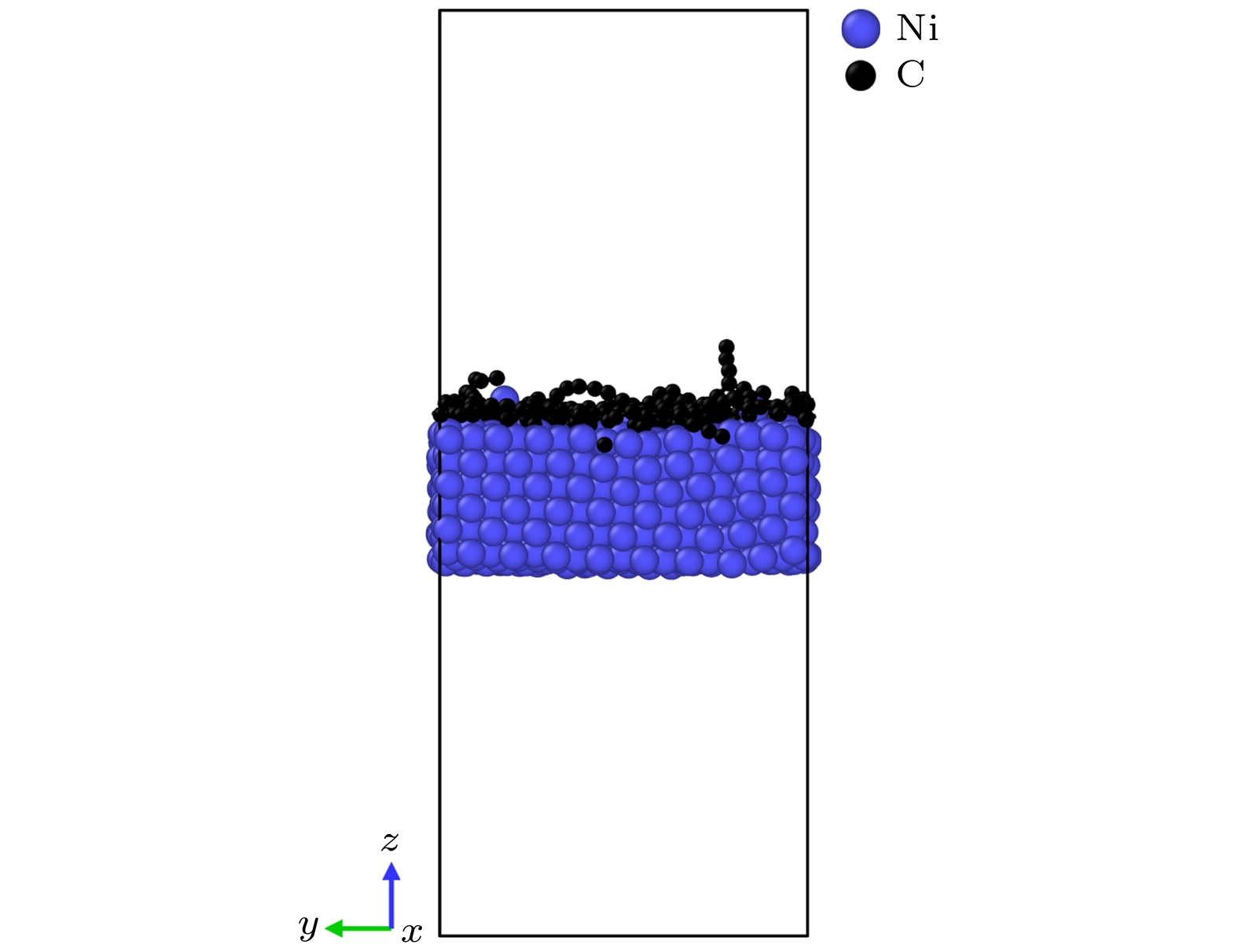 WC-Co cemented carbide has excellent cutting performance, which is a potential tool material. But when it is used as cutting ultra-high strength and high hardness materials, the machining accuracy and service life of the tool are significantly reduced. Graphene is a potential coating material for cemented carbide cutting tools due to its excellent mechanical properties. In this work, molecular dynamics (MD) is used to simulate the deposition of nickel transition layer and high-temperature catalytic growth of graphene in cemented carbide. The Ni and C atomic deposition process and the high temperature annealing process are simulated, and a combination of potential functions is adopted to continuously simulate these two deposition processes. The effect of deposition temperature and the effect of incident energy on the growth of graphene are analyzed. The healing mechanism of nickel-based catalytic defective graphene under high-temperature annealing is explored in detail. The simulation results show that at the deposition temperature of 1100 K, the coverage of graphene is higher and the microstructure is flat. The higher temperature helps to provide enough kinetic energy for carbon atoms to overcome the potential energy barrier of nucleation, thereby promoting the migration and rearrangement of carbon atoms and reducing graphene growth defects. Too high a temperature will lead to continuous accumulation of carbon atoms on the deposited carbon rings, forming a multilayered reticulation and disordered structure, which will cause a low coverage rate of graphene. The increase of incident energy helps to reduce the vacancy defects in the film, but excessive energy leads to poor continuity of the film, agglomeration, the more obvious stacking effect of carbon atoms and the tendency of epitaxial growth. When the incident energy is 1 eV, the surface roughness of the film is lower, and more monolayer graphene can be grown. During annealing at 1100 K, the carbon film dissolves and nucleates simultaneously in the Ni transition layer, and the nickel transition layer catalyzes the repair of defective graphene. The graphene film becomes more uniform, and the number of hexagonal carbon rings increases. Appropriate high-temperature annealing can help to repair and reconstruct defective carbon rings and rearrange carbon chains into rings. Therefore, when the deposition temperature is 1100 K and the incident energy is 1 eV, graphene can be deposited and annealed to grow a high-quality graphene coatings. The simulation results provide the reference for preparing the cemented carbide graphene coated tools.