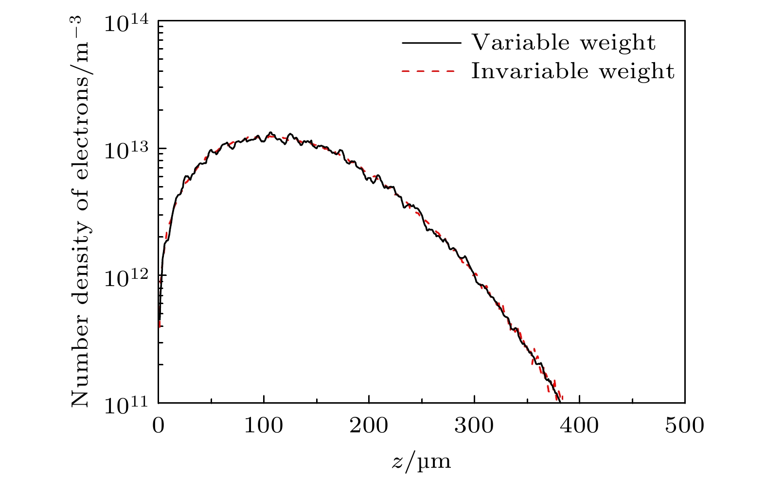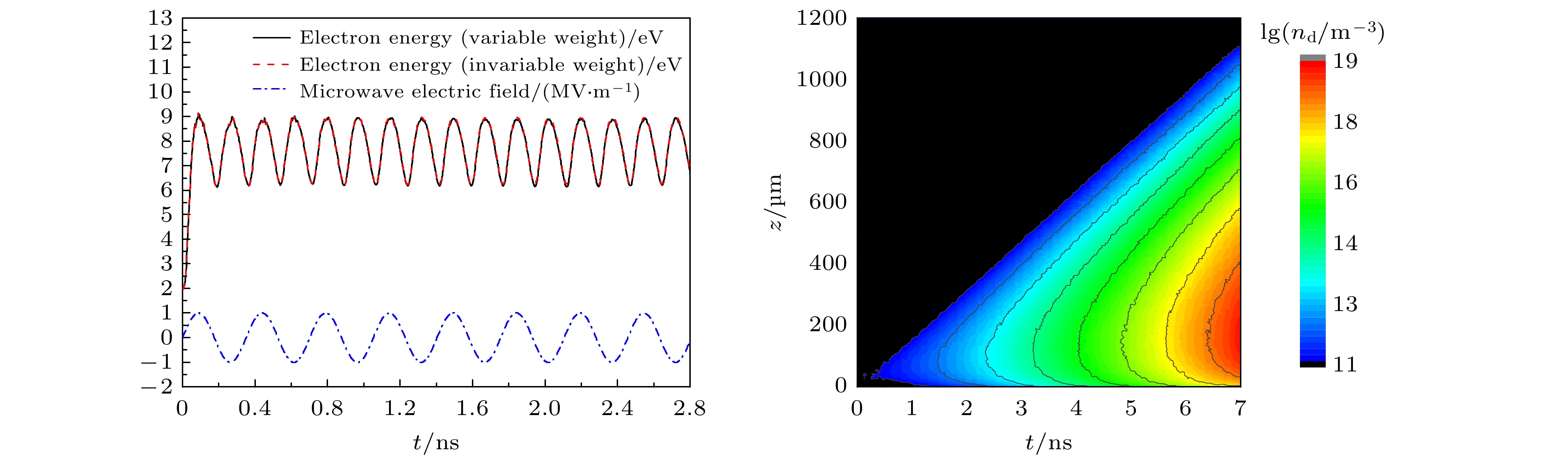 Gas breakdown is one of the key factors limiting the increase of power capacity of the outer surface of high-power microwave dielectric window. It is of great significance to conduct corresponding simulation studies. Compared with the fluid model, the particle-in-cell-Monte Carlo collision model has two advantages. One is that the influence of numerical dispersion and instability problems is insignificant, and the other is that it can accurately describe microphysical processes. Therefore, the breakdown characteristics on the gas side of dielectric window are simulated by using the particle-in-cell-Monte Carlo collision model. The two-in-one macro-particle merging method is introduced into the model, thereby greatly reducing the number of macro-particles tracked. Therefore, the whole breakdown process can be simulated and analyzed. The results show that the spatial and temporal evolution of breakdown under the variable macro-particle weight is in good agreement with that under the constant macro-particle weight. This suggests that the two-in-one macro-particle merging method is applicable under the simulation conditions of interest in this paper, i.e., when the ratio of the effective electric field of microwaves to the pressure is between\begin{document}$1.76\times10^3$\end{document} and \begin{document}$1.41\times10^4$\end{document} V/(m\begin{document}$\cdot$\end{document} Torr). Since the yield of the secondary electron emission is much less than 1, gas ionization is the dominant mechanism of breakdown on the gas side of dielectric window. Electron ionization and electron diffusion lead the density and thickness of the plasma to significantly increase over time. The peak of electron density does not appear at the dielectric surface, but at a position of 100–150 μm away from the dielectric surface. This is because a large number of electrons are deposited on the dielectric surface, and the accompanying self-organized normal electric field drives the electrons away from the dielectric surface. Because the pressure of background gas of interest in this work is higher than the critical pressure corresponding to the maximum ionization rate (about 10 Torr), the ionization rate decreases monotonically with pressure increasing, resulting in a slower development of breakdown. The accuracy of the particle-in-cell-Monte Carlo collision model is confirmed by comparing the simulated values of breakdown time with experimental data. This work provides an important theoretical basis for understanding and controlling the breakdown on the gas side of dielectric window. The following figure (a) shows that the mean electron energy under the variable macro-particle weight agrees well with that under the constant macro-particle weight at about 100 Torr. The following figure (b) shows that when the plasma density is increased by a factor of 108, the breakdown process can be considered by using the particle-in-cell-Monte Carlo collision model and a two-in-one macro-particle merging method.