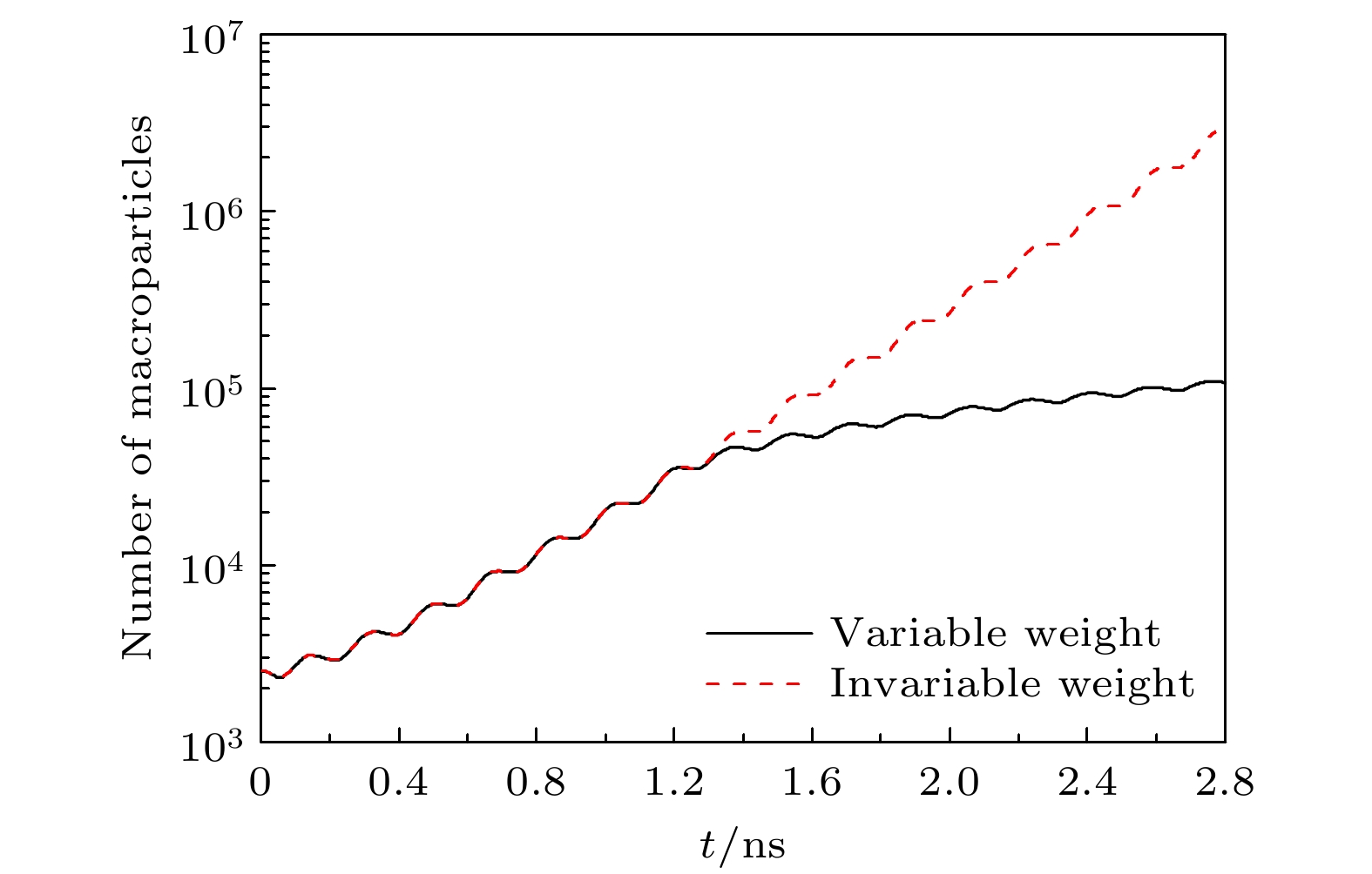 Gas breakdown is one of the key factors limiting the increase of power capacity of the outer surface of high-power microwave dielectric window. It is of great significance to conduct corresponding simulation studies. Compared with the fluid model, the particle-in-cell-Monte Carlo collision model has two advantages. One is that the influence of numerical dispersion and instability problems is insignificant, and the other is that it can accurately describe microphysical processes. Therefore, the breakdown characteristics on the gas side of dielectric window are simulated by using the particle-in-cell-Monte Carlo collision model. The two-in-one macro-particle merging method is introduced into the model, thereby greatly reducing the number of macro-particles tracked. Therefore, the whole breakdown process can be simulated and analyzed. The results show that the spatial and temporal evolution of breakdown under the variable macro-particle weight is in good agreement with that under the constant macro-particle weight. This suggests that the two-in-one macro-particle merging method is applicable under the simulation conditions of interest in this paper, i.e., when the ratio of the effective electric field of microwaves to the pressure is between