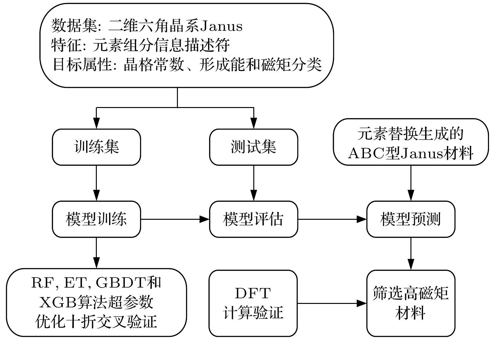Discovering compact, stable, and easily controllable nanoscale non-trivial topological magnetic structures, such as magnetic skyrmions, is the key to developing next-generation high-density, high-speed, and low-energy non-volatile information storage devices. Based on the topological generation mechanism, magnetic skyrmions can be generated through the Dzyaloshinskii–Moriya interaction (DMI) caused by breaking space-reversal symmetry. Two-dimensional (2D) non-centrosymmetric Janus structurecan generate vertical built-in electric fields to break spatial inversion symmetry. Therefore, seeking for 2D Janus material with intrinsic magnetism is fundamental to develop the novel chiral magnetic storage technologies. In this work, we combine detailed machine learning techniques and first-principle calculations to investigate the magnetism of the unexplored 2D Janus material. We first collect 1179 2D hexagonal ABC-type Janus materials based on the Materials Project database, and use elemental composition as feature descriptors to construct four machine learning models: random forest (RF), gradient boosting decision trees (GBDT), extreme gradient boosting (XGB), and extra trees (ET). These algorithms and models are constructed to predict lattice constants, formation energy, and magnetic moment, via hyperparameter optimization and ten-fold cross-validation. The GBDT exhibits the highest accuracy and best prediction performance for magnetic moment classification. Subsequently, the collected data of 82018 yet-undiscovered 2D Janus materials, are input into the trained models to generate 4024 high magnetic moment 2D Janus materials with thermal stability. First-principles calculations are employed to validate random sample of 13 Janus materials with high magnetic moment. This study provides an effective machine learning framework for classifying the magnetic moments and screening highthroughput 2D Janus structures, thereby accelerating the exploration of their magnetic properties. The datasets provided in this work are available fromhttps://doi.org/10.57760/sciencedb.j00213.00072 .