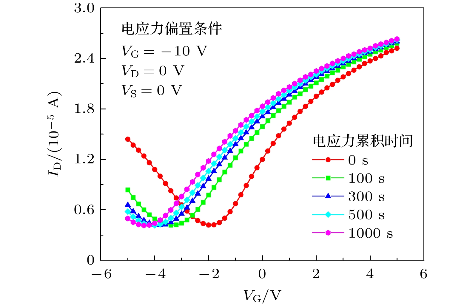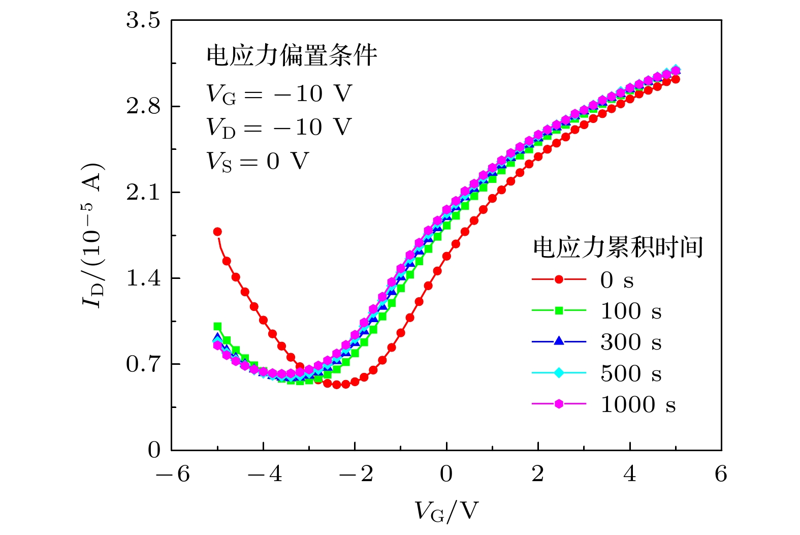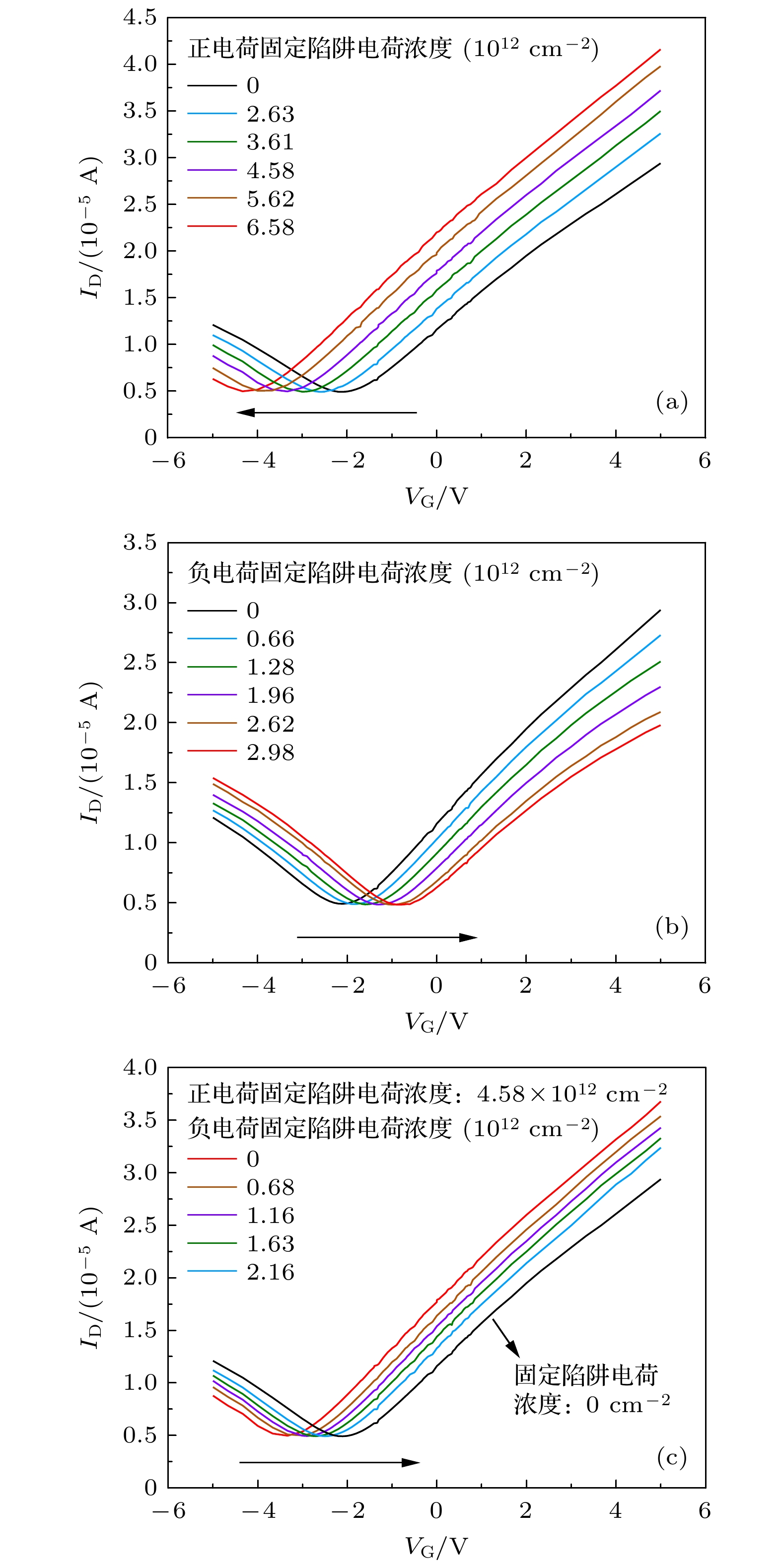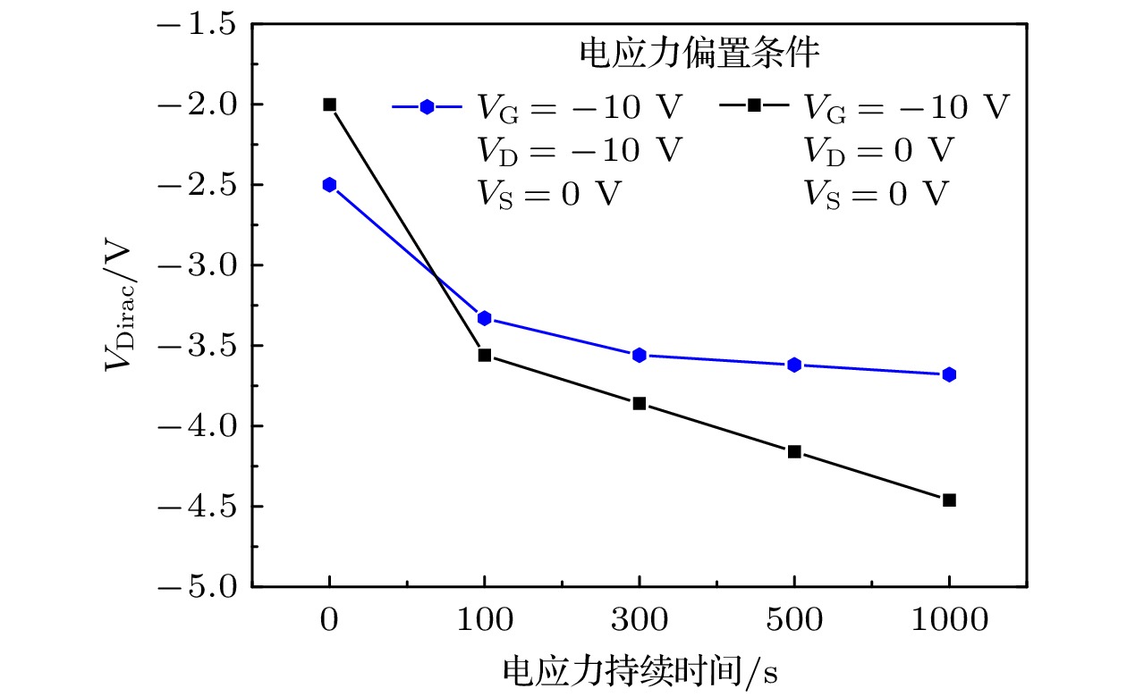 In this paper, graphene field effect transistors (GFETs) with the top-gate structure are taken as the research object. The electrical stress reliabilities are studied under different bias voltage conditions. The electrical pressure conditions are gate electrical stress (VG = –10 V, VD = 0 V, and VS = 0 V), drain electric stress (VD = –10 V, VG = 0 V, and VS = 0 V), and electrical stresses applied simultaneously by gate voltage and drain voltage (VG = –10 V, VD = –10 V, VS = 0 V). Using a semiconductor parameter analyzer, the transfer characteristic curves of GFETs before and after electrical stress are obtained. At the same time, the carrier migration and the Dirac voltage VDirac degradation are extracted from the transfer characteristic curves. The test results show that under different electrical pressures, the carrier mobility of GFETs degrades continuously with the increase of electric stress time. Different electrical pressure conditions have varying effects on the drift direction and degradation of VDirac: gate electrical stress and drain electrical stress cause VDirac drift of the device in opposite directions, and the gate electrical stress is greater than the electrical stress applied by both gate voltage and drain voltage, leading to VDirac degradation of GFETs. An analysis of the causes indicates that different electrical stresses produce different electric field directions in the device, which can affect the carrier concentration and movement direction. Electrons and holes in the channel are induced and tunnel into the oxide layer, and they are captured by trap charges in the oxide layer and at the interface between graphene and oxide, forming oxide trap charges and interface trap charges. This is the main reason for reducing carrier mobility of GFET. Different electric field directions under different electric stresses produce positively charged trap charges and negatively charged trap charges. The difference in the type of trap charge banding is the main reason for the different directions of VDirac drift in GFETs. When both trap charges coexist, they have a canceling effect on the VDirac drift of the GFETs. Finally, by combining TCAD simulation the simulation model of the influence of electrical stress induced trap charge on the VDirac generation of GFET is further revealed. The result demonstrates that the differences in the type of trap charge banding have different degradation effects on the VDirac of GFETs. The related research provides data and theoretical support for putting graphene devices into practical application.