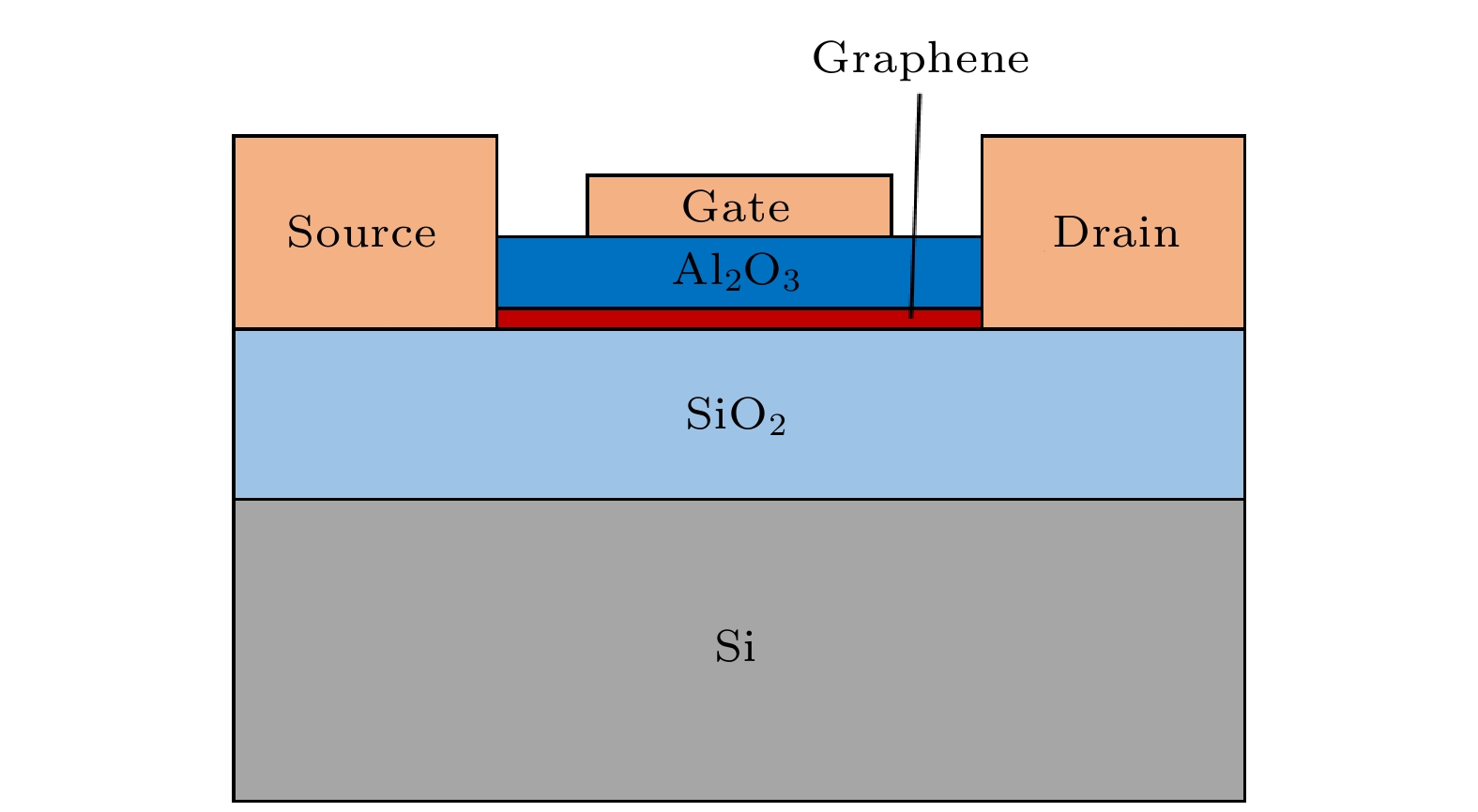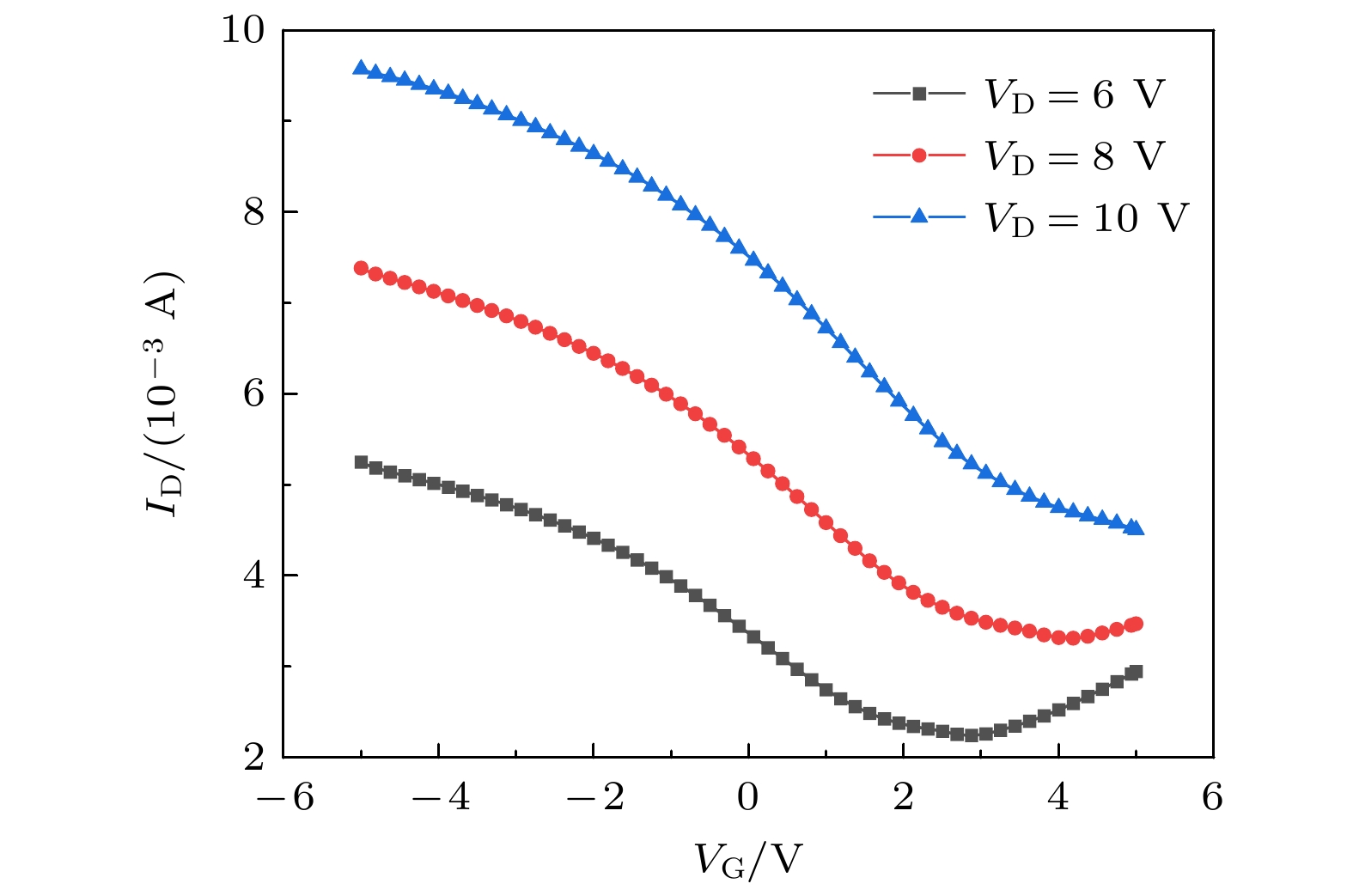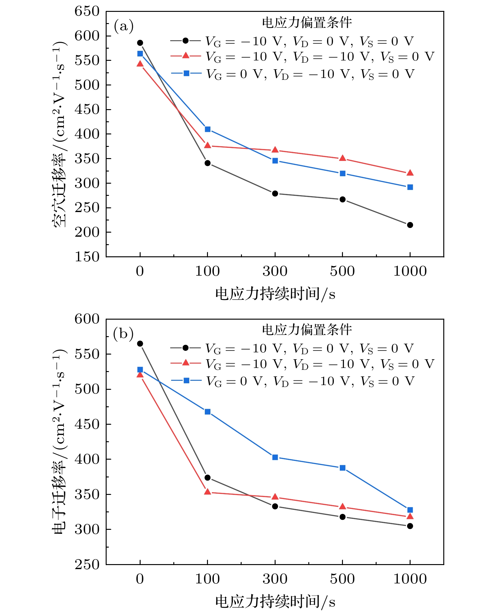 In this paper, graphene field effect transistors (GFETs) with the top-gate structure are taken as the research object. The electrical stress reliabilities are studied under different bias voltage conditions. The electrical pressure conditions are gate electrical stress (VG = –10 V, VD = 0 V, and VS = 0 V), drain electric stress (VD = –10 V, VG = 0 V, and VS = 0 V), and electrical stresses applied simultaneously by gate voltage and drain voltage (VG = –10 V, VD = –10 V, VS = 0 V). Using a semiconductor parameter analyzer, the transfer characteristic curves of GFETs before and after electrical stress are obtained. At the same time, the carrier migration and the Dirac voltage VDirac degradation are extracted from the transfer characteristic curves. The test results show that under different electrical pressures, the carrier mobility of GFETs degrades continuously with the increase of electric stress time. Different electrical pressure conditions have varying effects on the drift direction and degradation of VDirac: gate electrical stress and drain electrical stress cause VDirac drift of the device in opposite directions, and the gate electrical stress is greater than the electrical stress applied by both gate voltage and drain voltage, leading to VDirac degradation of GFETs. An analysis of the causes indicates that different electrical stresses produce different electric field directions in the device, which can affect the carrier concentration and movement direction. Electrons and holes in the channel are induced and tunnel into the oxide layer, and they are captured by trap charges in the oxide layer and at the interface between graphene and oxide, forming oxide trap charges and interface trap charges. This is the main reason for reducing carrier mobility of GFET. Different electric field directions under different electric stresses produce positively charged trap charges and negatively charged trap charges. The difference in the type of trap charge banding is the main reason for the different directions of VDirac drift in GFETs. When both trap charges coexist, they have a canceling effect on the VDirac drift of the GFETs. Finally, by combining TCAD simulation the simulation model of the influence of electrical stress induced trap charge on the VDirac generation of GFET is further revealed. The result demonstrates that the differences in the type of trap charge banding have different degradation effects on the VDirac of GFETs. The related research provides data and theoretical support for putting graphene devices into practical application.