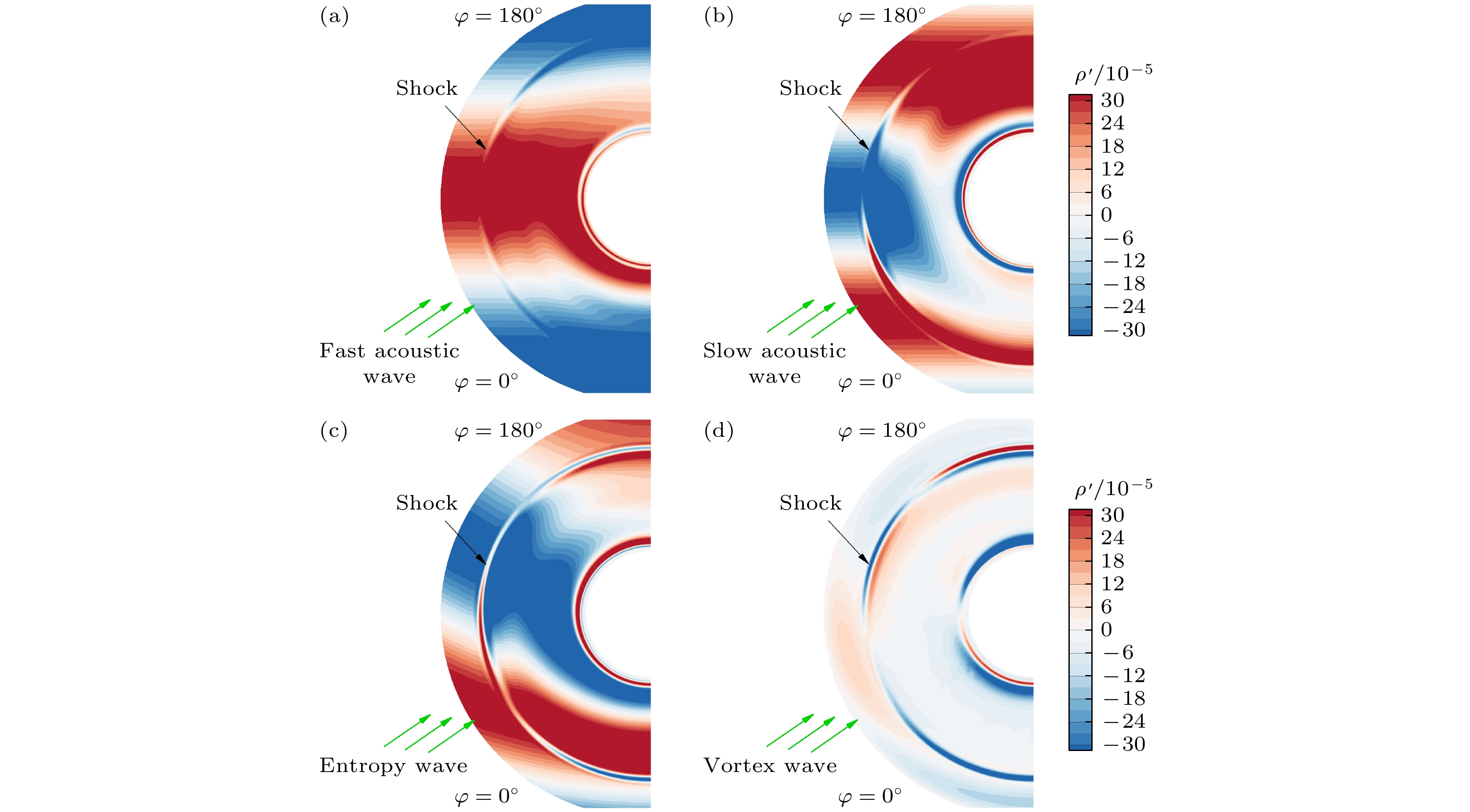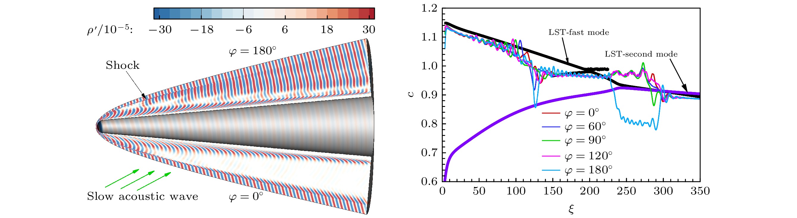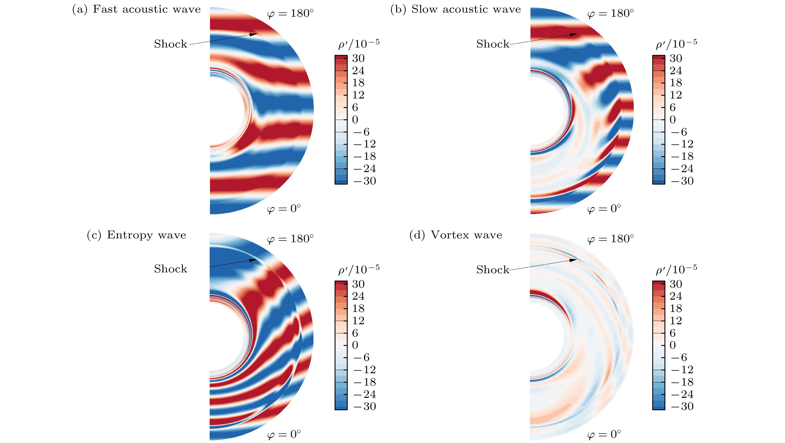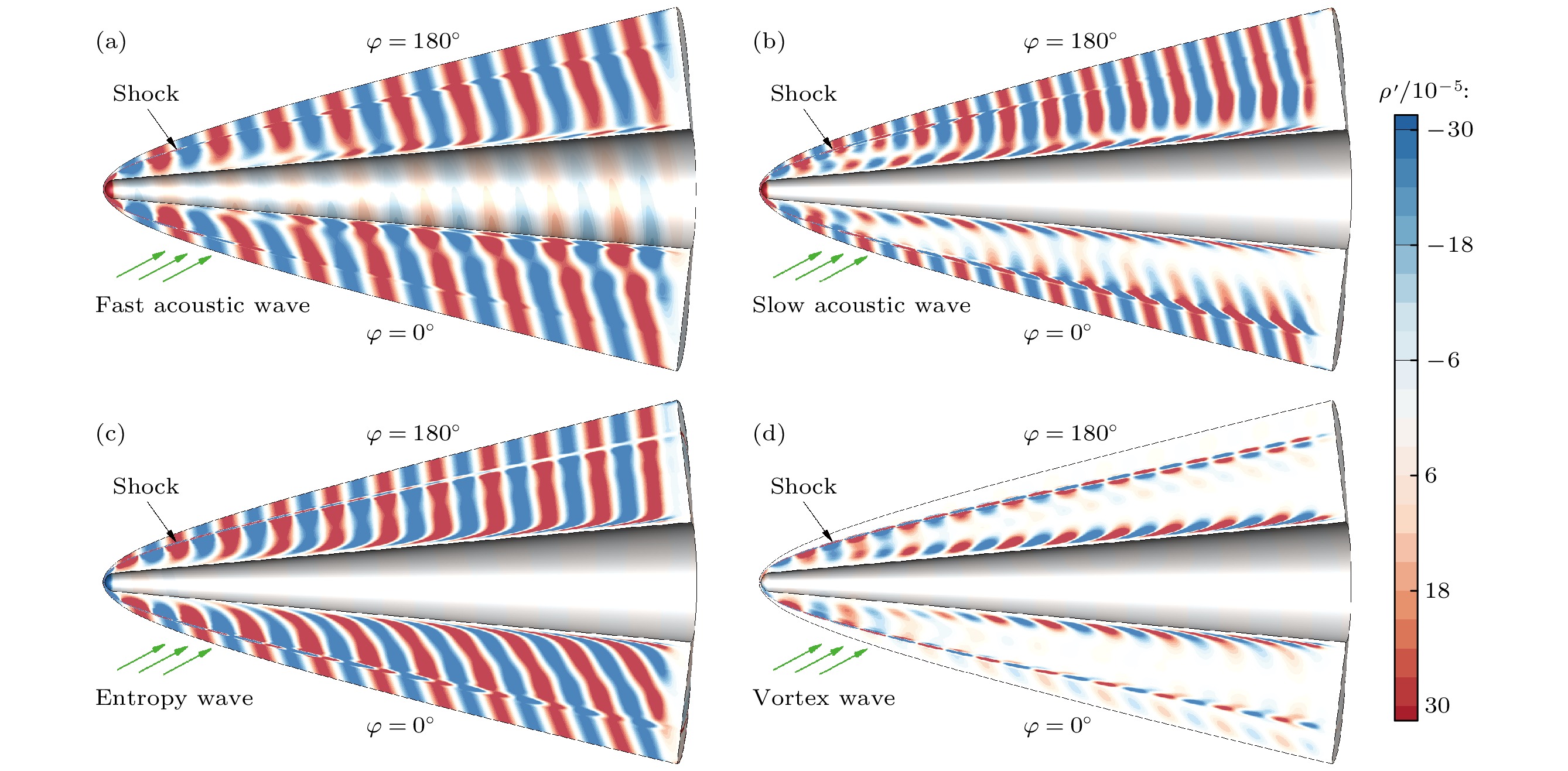 Receptivity to freestream disturbances is the initial stage of the boundary-layer transition process, which can determine the final path of boundary-layer disturbance triggering transition. At present, there is relatively sufficient research on the receptivity of two-dimensional boundary layers to zero incident angle disturbances. In fact, the freestream disturbances often propagate into the boundary layer in the form of non-zero incident angle, resulting in a component of spatial disturbance in the circumferential direction of rotating body (such as a cone). It is a receptivity problem with distinct three-dimensional features. However, there is relatively little research on this three-dimensional receptivity issue. The preliminary work only studied the three-dimensional receptivity to low-frequency incident slow acoustic waves. There has not been a systematic study on the three-dimensional receptivity to different types of freestream disturbances. The three-dimensional receptivity of a blunt cone to different freestream disturbances is studied in this work. Firstly, a high-resolution numerical simulation method is used to investigate the three-dimensional receptivity process by introducing freestream disturbances with an incident angle of 15°. The freestream disturbances include fast acoustic wave, slow acoustic wave, entropy wave, and vortex wave. Their frequencies are chosen as dimensionless 1.1 and 5, corresponding to the first mode frequency and the second mode frequency, respectively. Then, the phase velocity and shape function of the boundary-layer disturbances at each position of circumference for the numerical results are obtained by Fourier transform. To explain the receptivity mechanisms, the corresponding results by linear stability analysis are obtained for comparisons. The results are shown below. The first mode and the second mode of the boundary layer can be effectively excited by the incident slow acoustic waves; it is difficult for the incident fast acoustic waves to excite unstable modes in the boundary layer; the incident entropy wave and vortex wave are difficult to excite the first mode at low frequency, but can excite the second mode at high frequency. Furthermore, the incident angle of the freestream disturbances can lead to the differences in the receptivity at different circumferential positions of the cone, which can be reflected in two ways. One is the difference in the dominant disturbance form at different circumferential positions, and the other is the difference in the amplitude of boundary-layer disturbances. Under different disturbance types and frequencies, these differences between different circumferential positions exhibit different results. The strongest receptivity may occur on the incident front, the incident back, and the incident side. These phenomena may result from the combined action of the upstream head disturbance and the disturbance on the incident front.