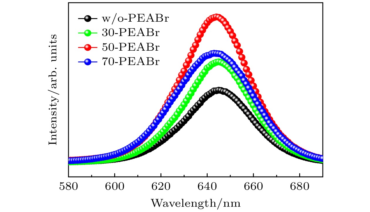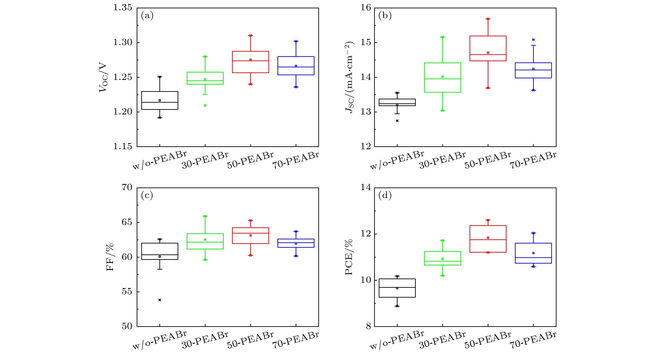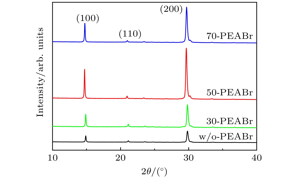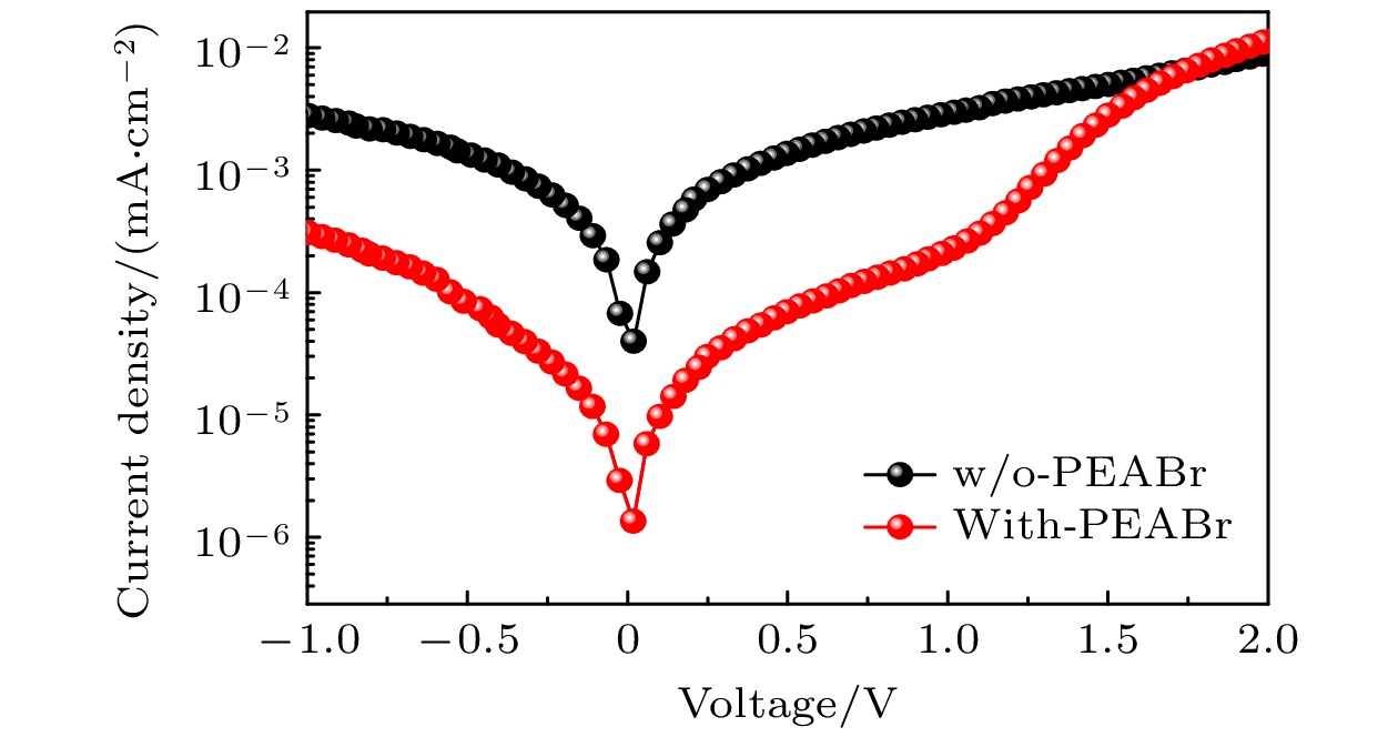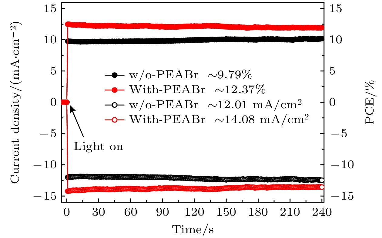 The new all-inorganic CsPbX3 perovskite material is expected to be used as an absorbing layer to prepare solar cells for efficient and stable commercial devices. However, the problems of high cost and poor stability, caused by precious metal electrodes and hole transport materials, urgently need solving. Therefore, carbon-based perovskite solar cells (C-PSCs) based on the HTL-free all-inorganic system have attracted widespread attention. This work adopts a strategy of finely regulating the ratio of I to Br in X-site of perovskite. Using the one-step anti-solvent method, CsPbIxBr3–x films and HTL-free C-PSCs are prepared under ambient air condition. By comparing their light absorption characteristics, carrier transport, and corresponding optoelectronic properties, a balance point between efficiency and stability is found. Finally, HTL-free C-PSCs achieve an optimal efficiency of 10.10% and can be stably prepared under ambient air conditions. In order to further improve the performance of the corresponding devices, phenylethylammonium bromide (PEABr) is introduced into the perovskite, and the crystallinity, carrier transport, defect situation, and corresponding optoelectronic properties of perovskite films and devices are compared under different conditions. Ultimately, the perovskite film treated with PEABr reaches better crystallinity and lower defect density, while generating a small amount of two-dimensional perovskite which can passivate the perovskite film and suppress non-radiative recombination of charge carriers. After appropriate PEABr treatment, the photoelectric conversion efficiency (PCE) of the device is significantly enhanced, increasing from 10.18% of the optimal device in the control group to 12.61%. Thus, this method provides an optimal approach for preparing efficient and low-cost HTL-free C-PSCs under ambient air environments.