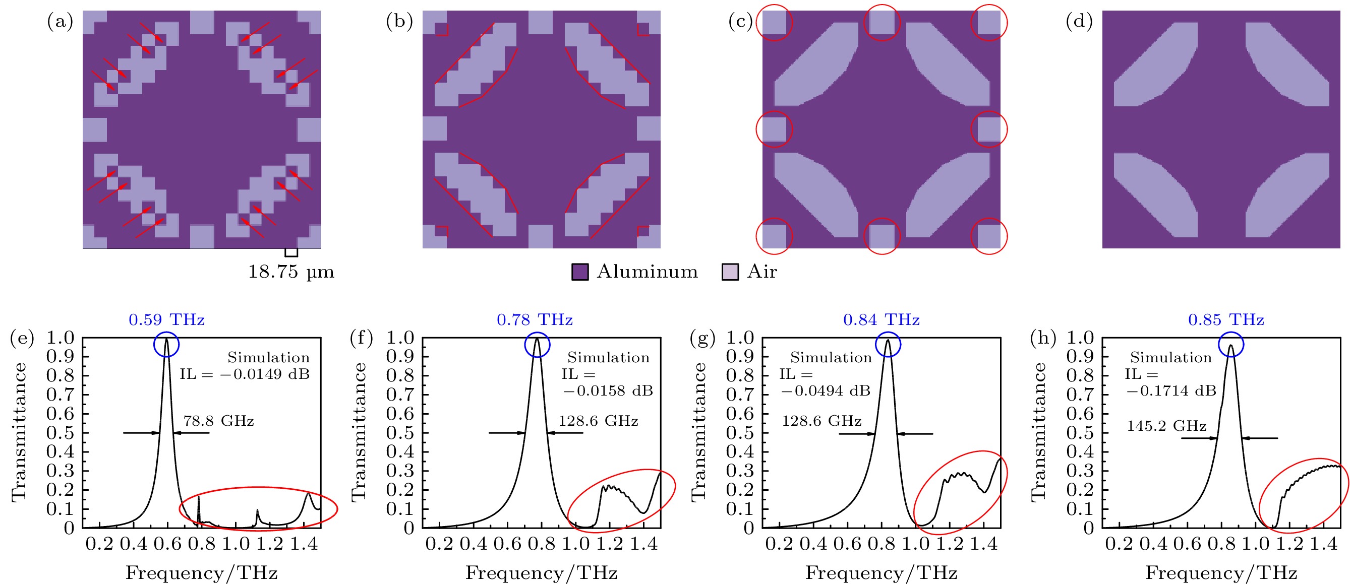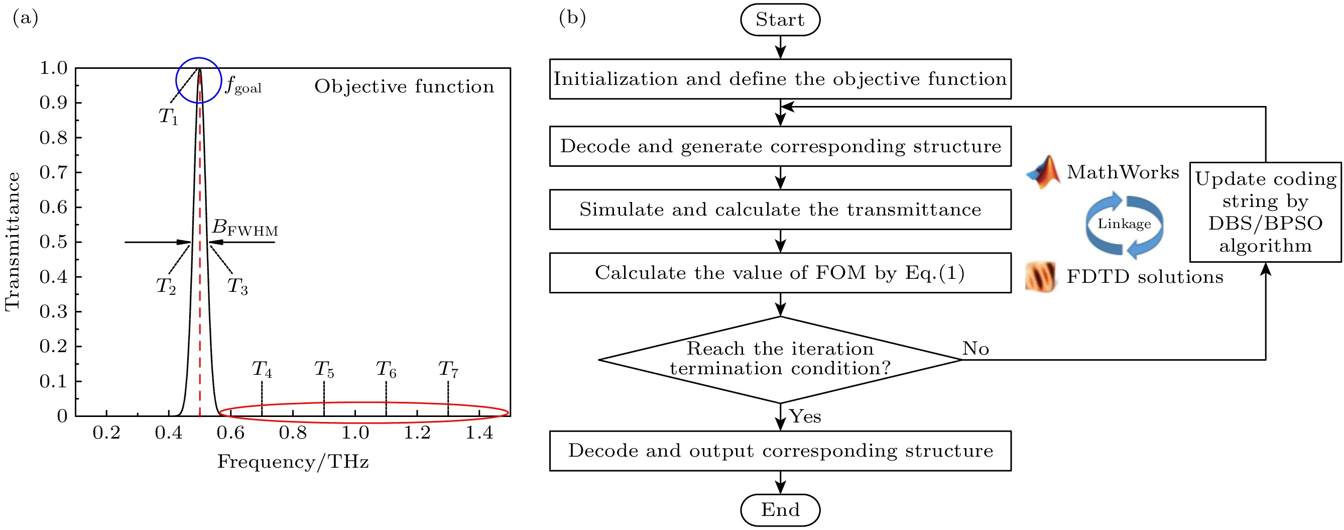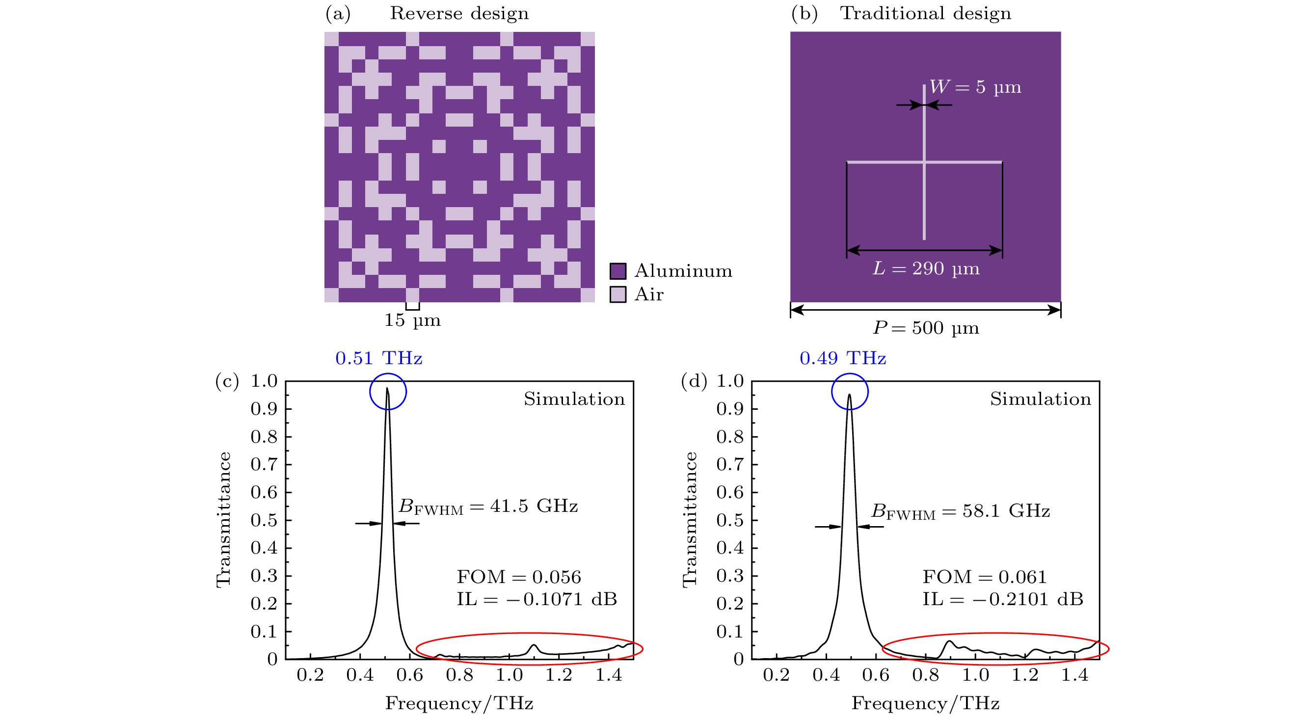 In this paper, an ingenious reverse design method is applied to the design and optimization of terahertz bandpass filters in order to achieve standardized design of high-performance terahertz functional devices. An equivalent model of subwavelength metasurface mapped to digital space is established. Based on ideal objective functions and constraints, intelligent algorithms begin a bold journey to explore the vast potential structure in the solution space. Through iterative refinement, the algorithm reveals optimal structural patterns, unlocking areas of unparalleled performance. The direct binary search (DBS) algorithm and the binary particle swarm optimization (BPSO) algorithm are compared in optimization process. When using the DBS algorithm to optimize the design area, it takes a long time to poll the logic states of all pixel units point by point, and it is easy to get stuck in the local optimal value. However, BPSO algorithm has stronger global search capabilities, faster convergence speed, and higher accuracy. Through a comprehensive comparison of the device performance optimized by the two algorithms, the solution optimized by BPSO algorithm has better out-of-band suppression performance and a narrower full width at half peak, but slightly lower transmittance at the center frequency. The bandpass filter has a center frequency of 0.51 THz, a bandwidth of 41.5 GHz, and an insertion loss of -0.1071 dB. When considering computational efficiency, DBS algorithm lags behind, the simulation time is 11550 s, while BPSO algorithm only needs 9750 s. Compared with the traditional forward design, the reverse design method can achieve the narrower band, lower insertion loss, better out-of-band suppression and polarization stability. The fine structural changes of the optimal results have a significant influence on spectral performance, demonstrating the superiority and uniqueness of reverse design. This technology contributes to the design and optimization of high-performance and novel functional devices.