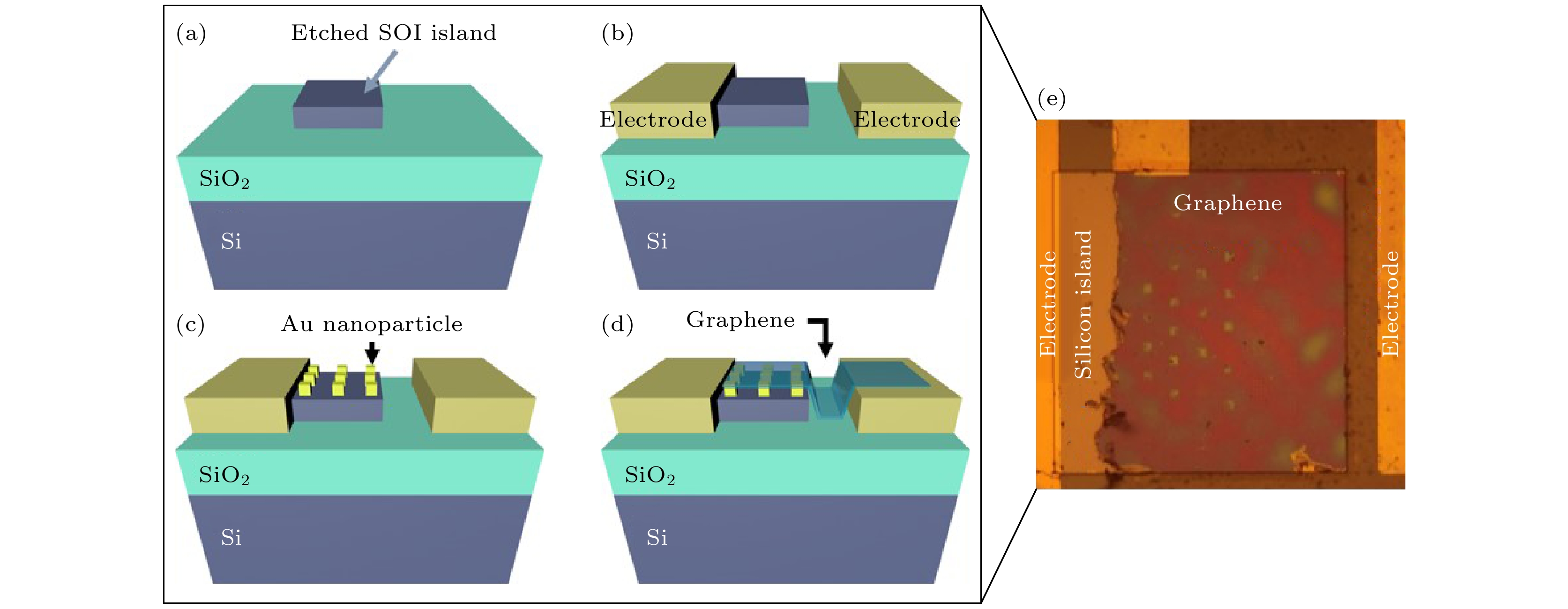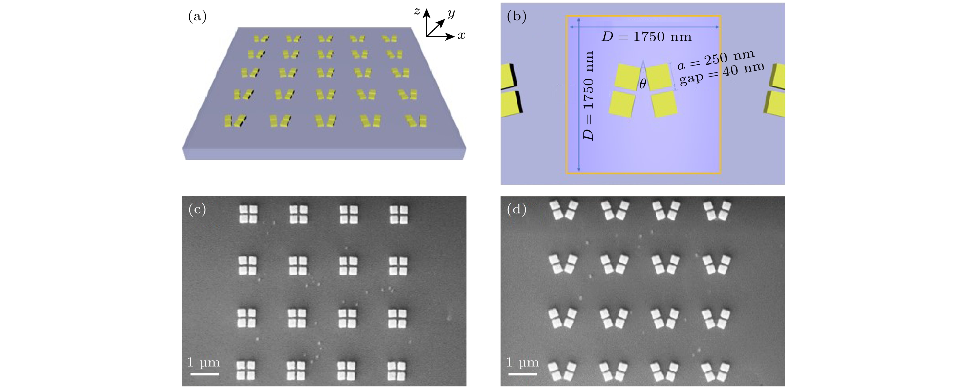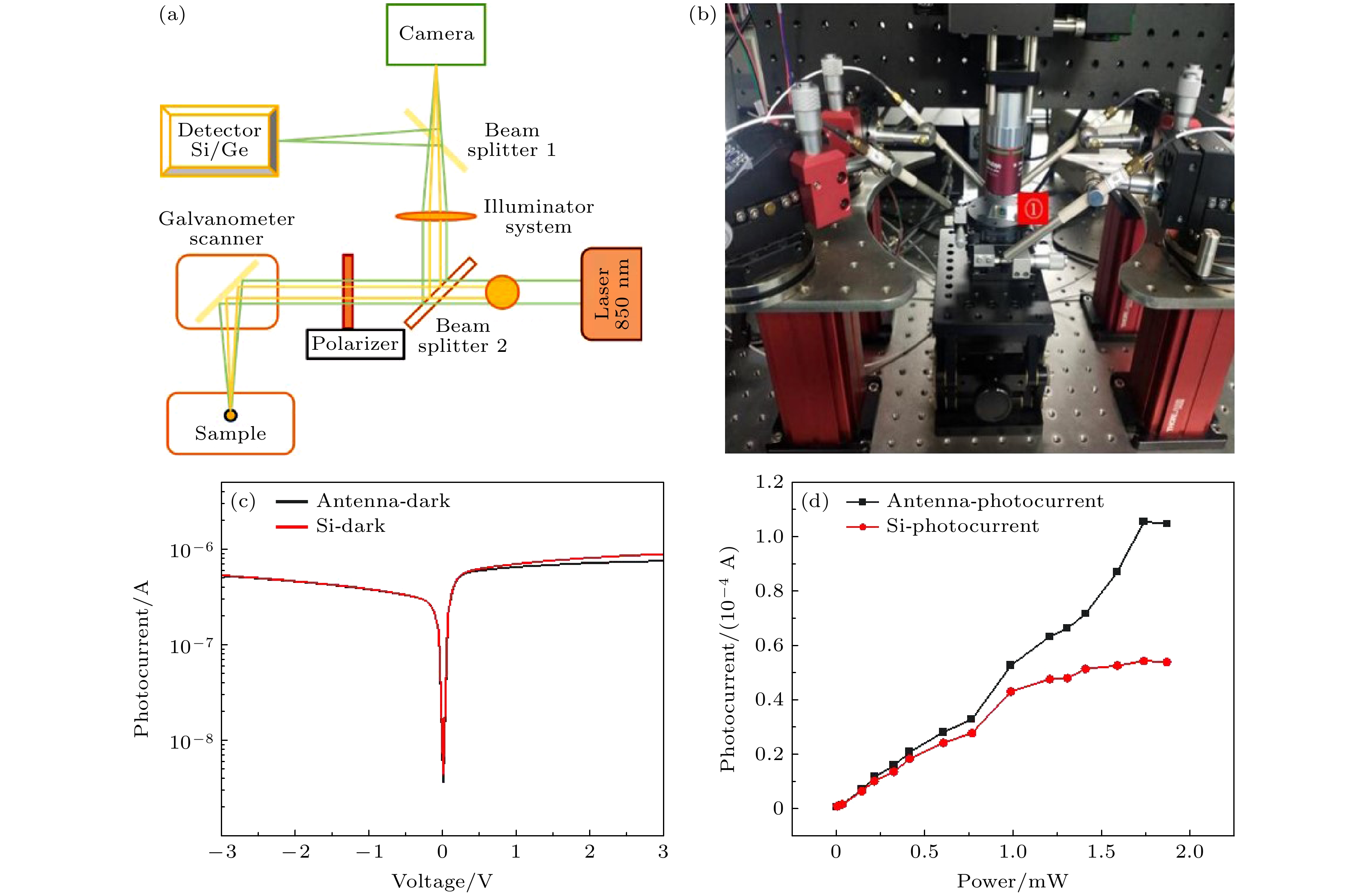 Infrared imaging chips are crucial for a broad range of military, medicine and biology applications. Although silicon detectors’ on-chip integration technology is matured, their low absorption in near-infrared light results in poor infrared photocurrent response. To increase the photodetector absorption efficiency, antenna-like metal nanoparticles have been widely adopted due to their plasmon resonance effects. Oligomer nanoparticles, including quaternary nanoparticles, exhibit plasmon resonance effects that localize and enhance the light field in a sub-wavelength range. Furthermore, they can interfere with each other to achieve Fano resonance and bound state in continuity, resulting in a stronger localization and enhancement of the electromagnetic field. In this study an array of gold quaternary nanoparticle oligomers is used as the antenna for a graphene/SOI (with 1 μm silicon) heterojunction near-infrared detector. Each oligomer consists of four gold squares, each with a size of 250 nm, forming two pairs of dipoles similar to the orbital hybridization of hydrogen atoms. This thus results in a multi-body coupling structure with bonding state and anti-bonding state. The antenna array parameters, such as the periodic constant, gap between nanoparticles, and angle (θ) between the oligomers, are meticulously adjusted. The optimized device is characterized by using photocurrent and photocurrent mapping, achieving a 2-fold enhancement in photoresponsivity with the maximum value atθ~ 40°. Notably, a consistent dip in photocurrents is observed for different periods or gap arrays when the angle theta is 20°. The simulation is conducted by using finite-difference time-domain (FDTD), revealing the emergence of Fano-like resonance in the transmittance spectra of the array at approximately 850 nm. The interference caused by the strongly coupling system to the plane coupled leakage field and the nanoparticle plasmon mode results in the formation of a new discrete leakage mode, i.e. the Fano-like resonance. The antenna helps to concentrate and emit the light field energy directionally to the detector, while there is a trade-off between the loss caused by nanoparticles absorption and the leakage energy. The photocurrent reaches a minimal point at a theta angle of 20° angle. At this point, the energy is localized in the oligomers, and the metal absorption loss weakens the plasmon enhancement effect. These findings are further supported by the simulation results of electric field and Poynting vector distribution. These findings indicate an important and promising way to enhance the photo detection efficiency via nanostructured plasmonic antenna.