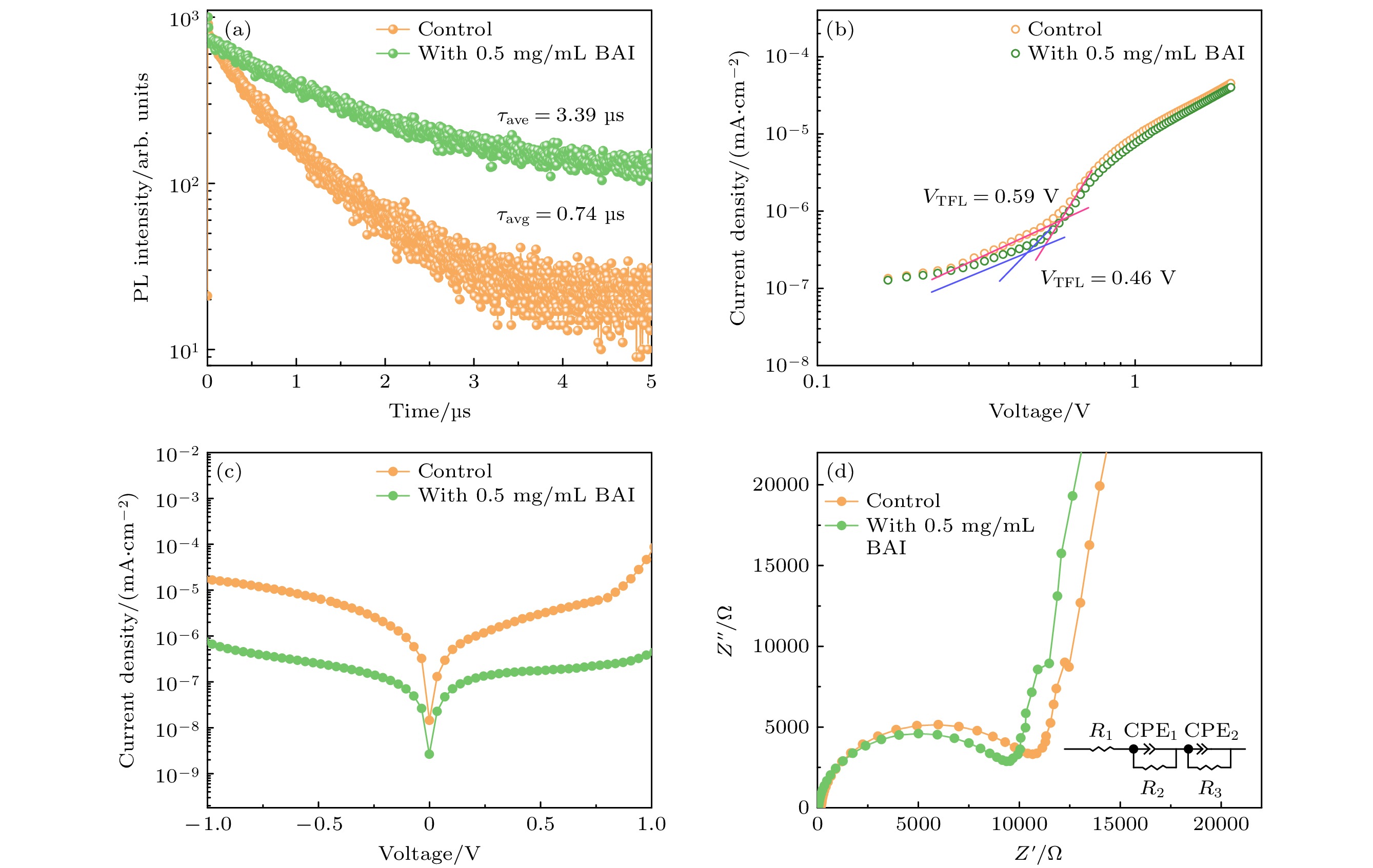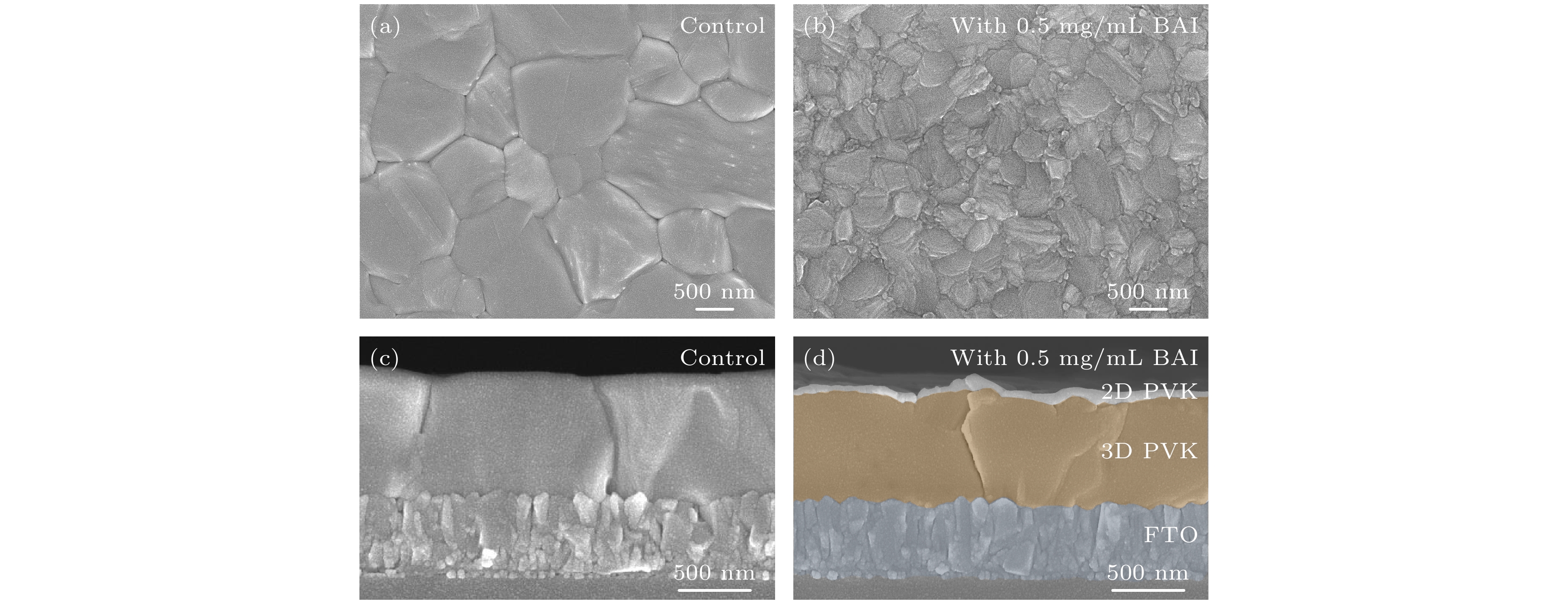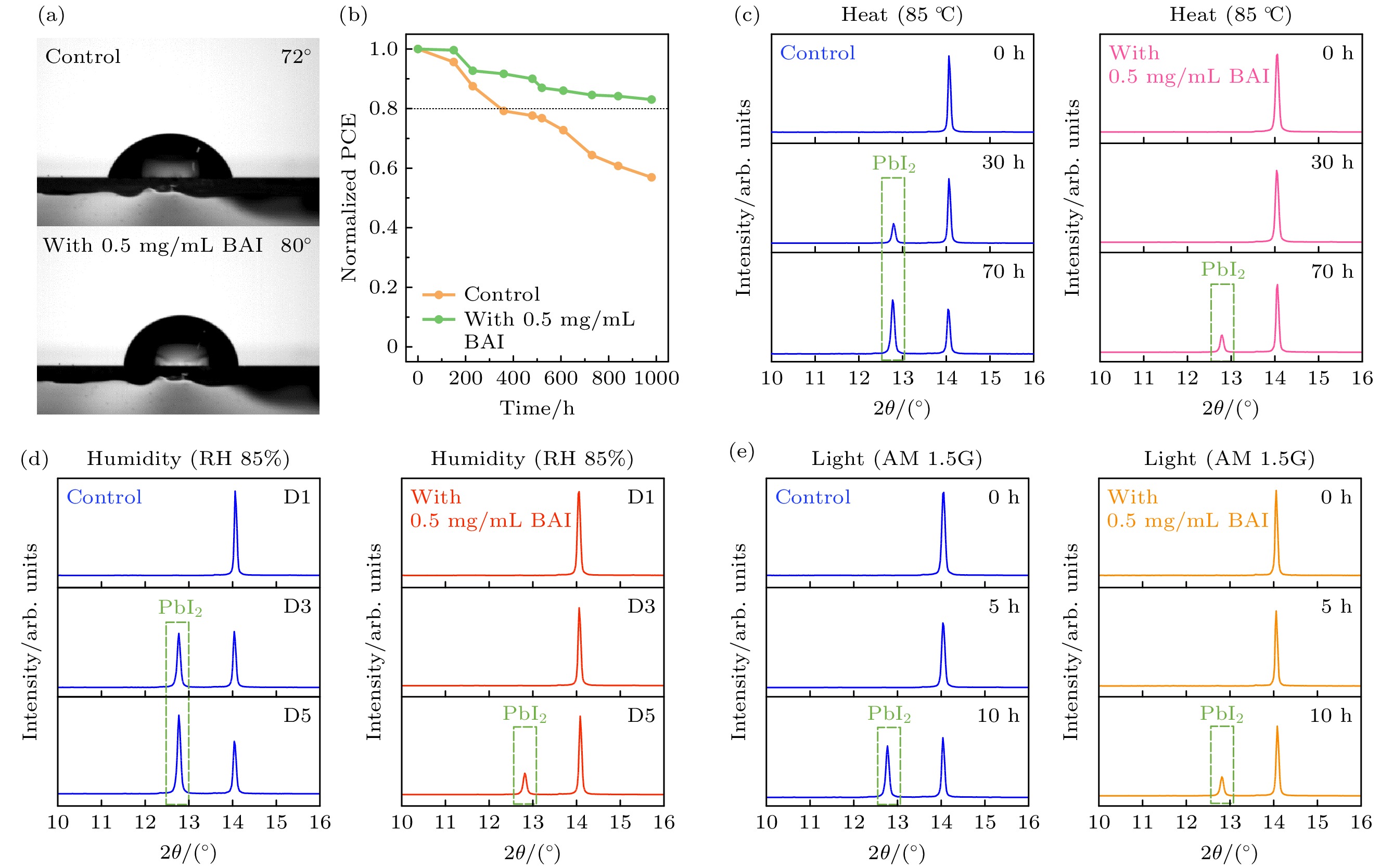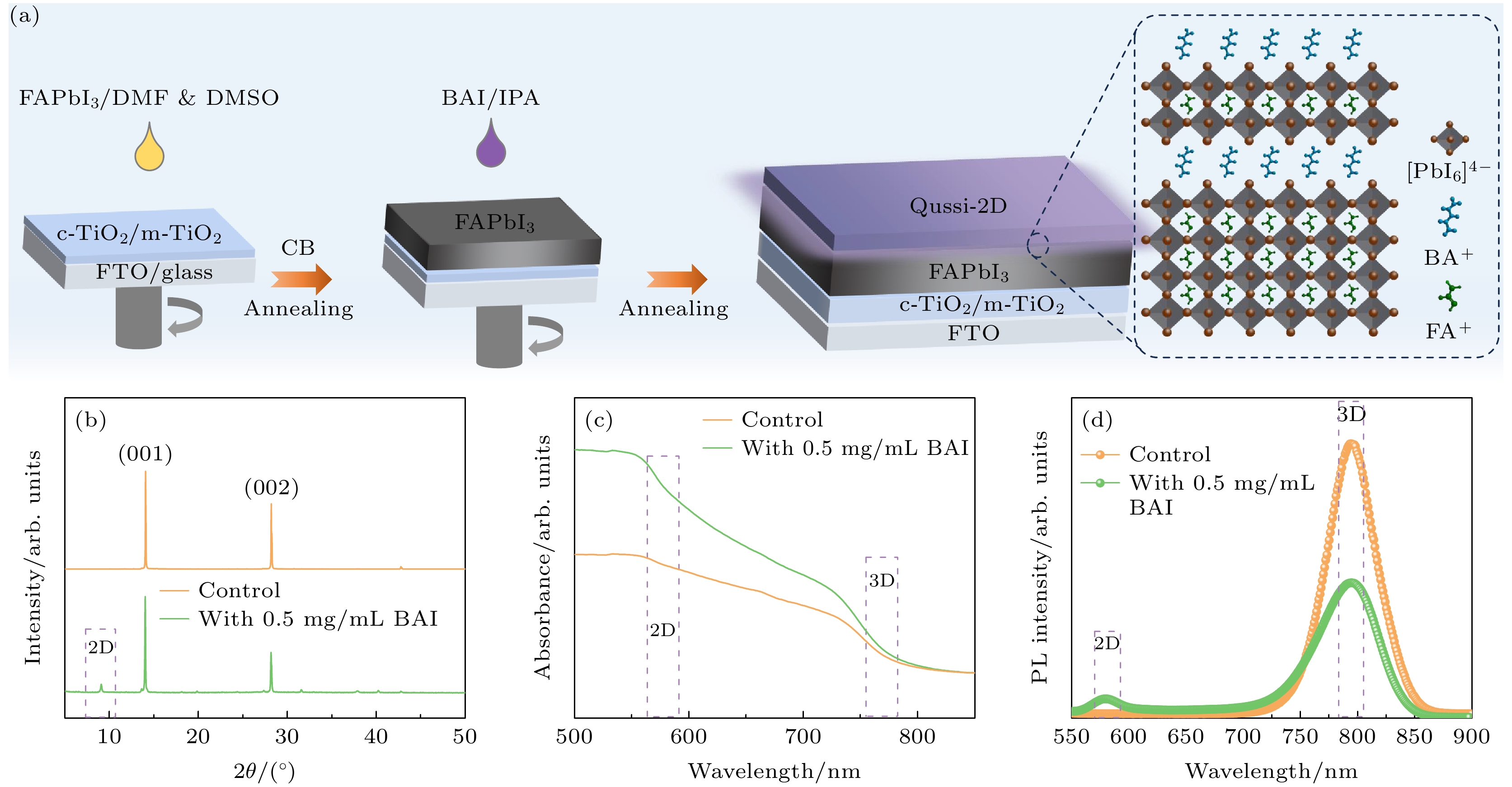 Organic-inorganic metal halide perovskite solar cells (PSCs) have been widely studied due to their excellent photoelectric conversion performance, but the inherent chemical instability of CH(NH2)2PbI3(FAPbI3) hinders its sustainable development. In particular, the surface interface of the membrane has prominent humidity sensitivity due to lower activation energy, the defect of the surface interface has a strong correlation with the film stability, and the treatment result of the defect is one of the key factors to improve the long-term stability. The FAPbI3suffers phase transition from black perovskite phase to yellow non-perovskite phase at room temperature, and the moisture will accelerate this phase transition. Interface engineering is one of the common methods to improve the stability of perovskite solar cells. In addition to interface engineering, there is a strategy of stacking a two-dimensional (2D) perovskite layer on the surface for interface passivation. However, most of the preparation methods of 2D perovskite layer have limitations. In this work, the full solution method and post-treatment mode of annealing are adopted, the hybrid perovskite solar cells of vitamin perovskite are successfully fabricated. The FAPbI3perovskite surface is uniformly spin-coated with butylamine iodide (BAI) solution, and the formation of 2D perovskite is driven on the surface of FAPbI3perovskite. Due to the passivation of surface interface defects by the 2D perovskite layer, the non-radiative recombination of charge carriers is reduced, greatly improving the carrier lifetime. Because of the hydrophobicity of long chain molecules in 2D perovskite, the long-term stability of the device is significantly improved. Consequently, the unencapsulated device containing 2D perovskite layer remains above 80% after operating at room temperature in ambient air with a relative humidity (RH) of 60% for nearly 1000 hours. The 2D perovskite layer can significantly improve the long-term stability of the film without affecting the charge carrier transport performance. This method of improving the stability of the device by constructing 2D perovskite layer is in line with the requirements and development trend of high-quality perovskite solar cells, and is a strategy with great development potential.