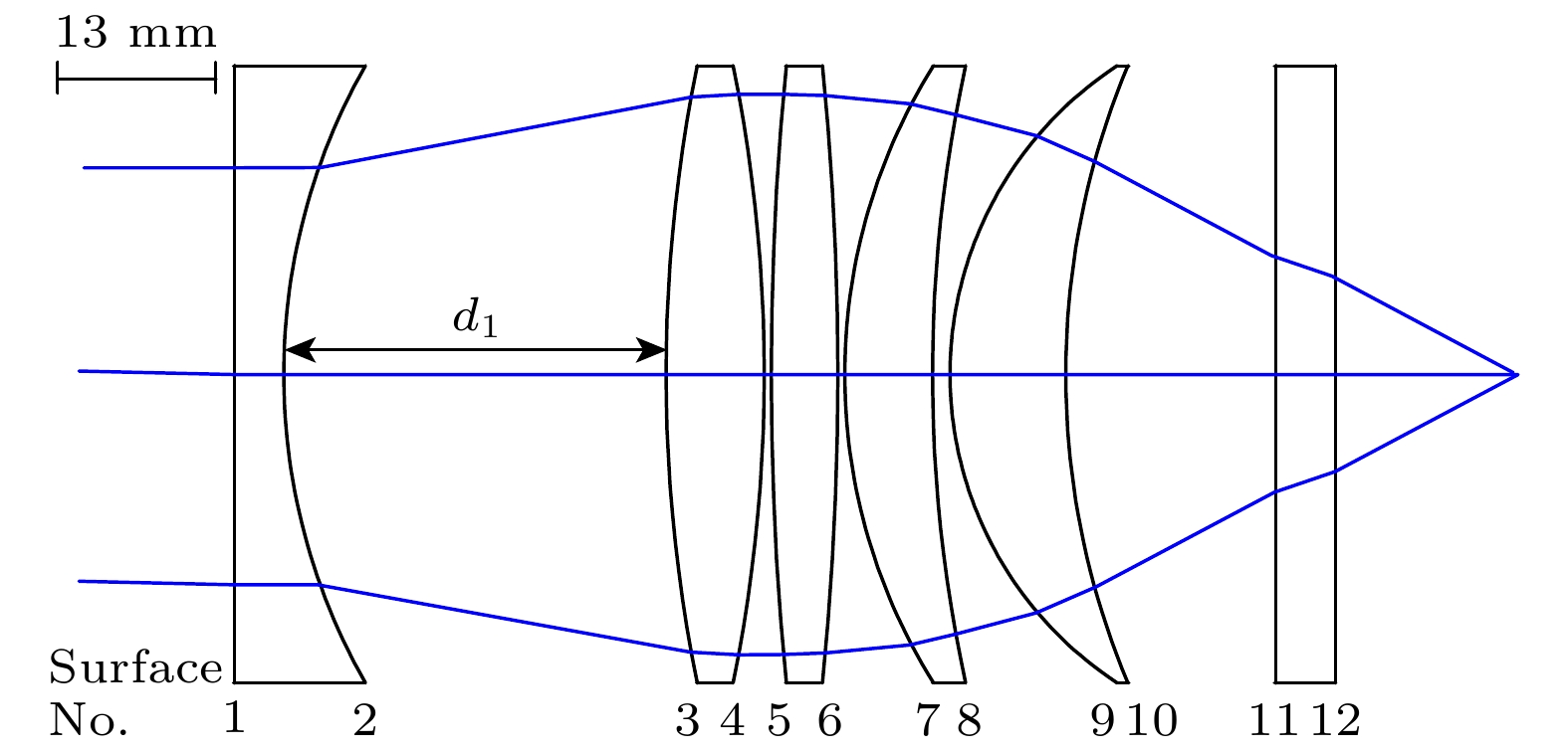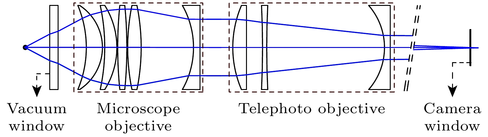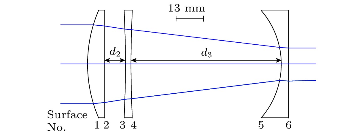 In cold atom experiments, high resolution imaging systems have been used to extractin-situdensity information when studying quantum gases, which is one of the hot topics in this field. Such a system is usually called “quantum-gas microscope”. In order to achieve a long working distance and large magnification, high resolution imaging of cold atoms through a vacuum window usually requires a long distance between the atoms and the camera. However, due to space limitation caused by a large number of nearby optical elements, it may be difficult to realize a long imaging system, which is a common case in cold atom experiments. Herein we present an imaging system that can achieve a short distance between the atoms and the image plane with diffraction-limited 1 μm resolution and 50 magnification. The telephoto lens design is adopted to reduce the back focal length and enhance the pointing stability of the imaging lens. The system is optimized at an operating wavelength of 767 nm and corrects aberrations induced by a 5-mm-thick silica vacuum window. At a working distance of 32 mm, a diffraction-limited field of view of 408 μm is obtained. The simulation result shows that by changing the air space between lenses, our design operates across a wide range of window thicknesses (0–15 mm), which makes it robust enough to be used in typical laboratories. This compact imaging system is made from commercial on-shelfΦ2 in (1 in = 2.54 cm) singlets and consists of two components: a microscope objective with a numerical aperture of 0.47 and a telephoto objective with a long effective focal length of 1826 mm. Both are infinitely corrected, allowing the distance between them to be adjusted to insert optical elements for irradiating atoms with laser beams of different wavelengths without affecting the imaging resolution. Taking the manufacturing and assembling tolerances into consideration, the Monte Carlo analyses show that more than 95% of the random samples are diffraction-limited within the field of view. This high success rate ensures that these two objectives can be achieved easily in the experiment. Combined with its performance with other wavelengths (470–1064 nm), this imaging system can be used for imaging different atom species, such as sodium, lithium, and cesium.