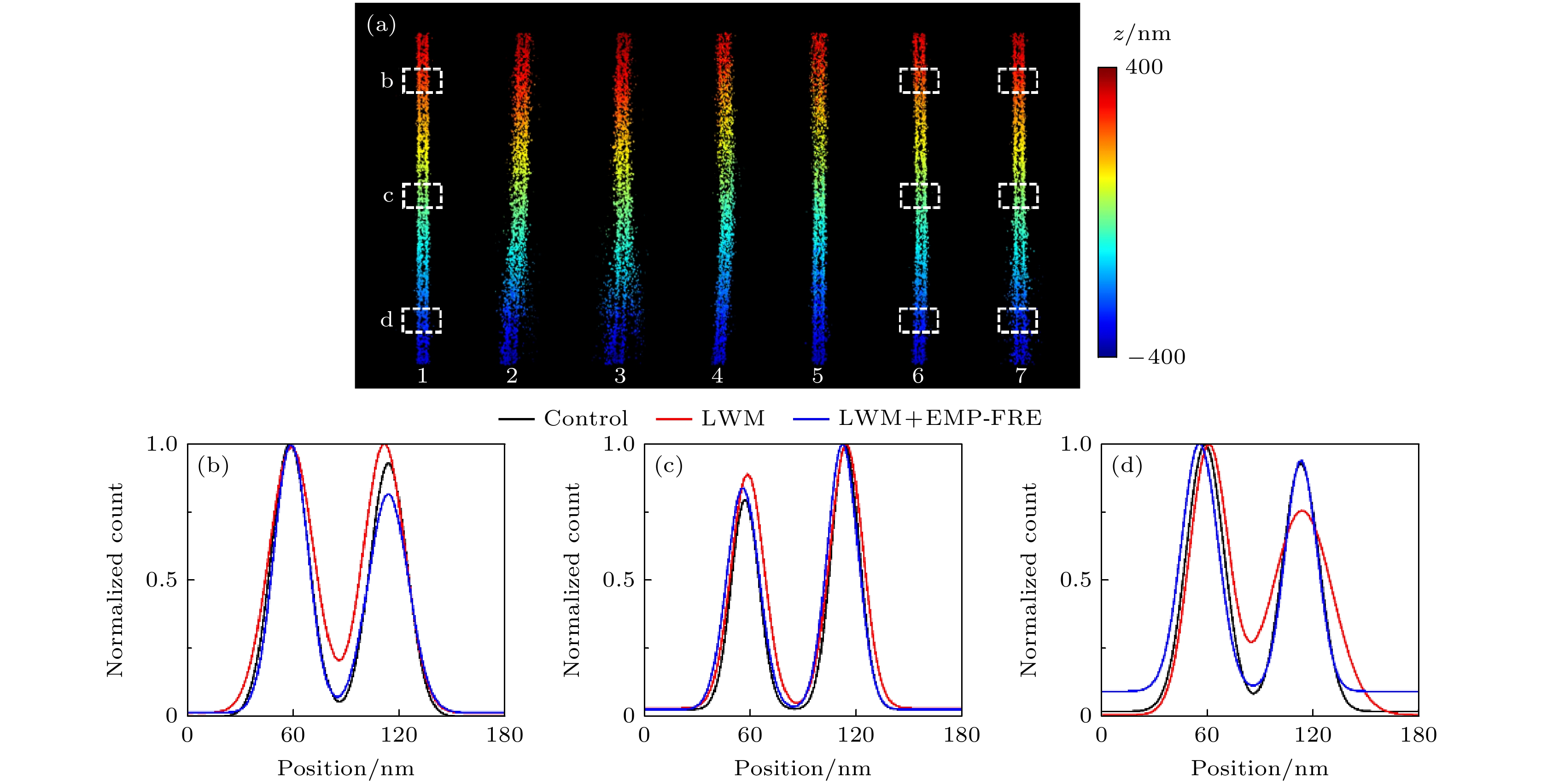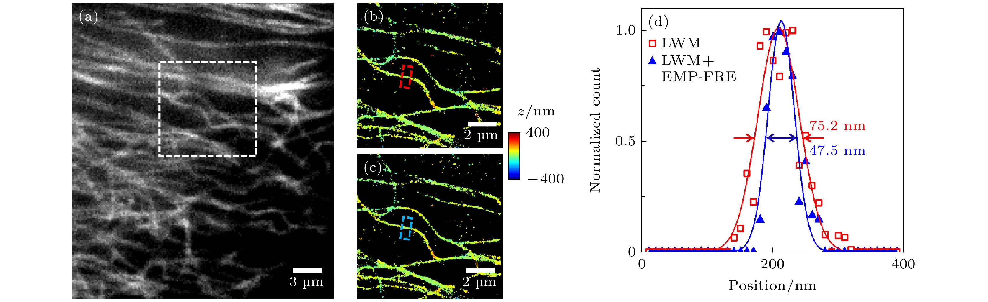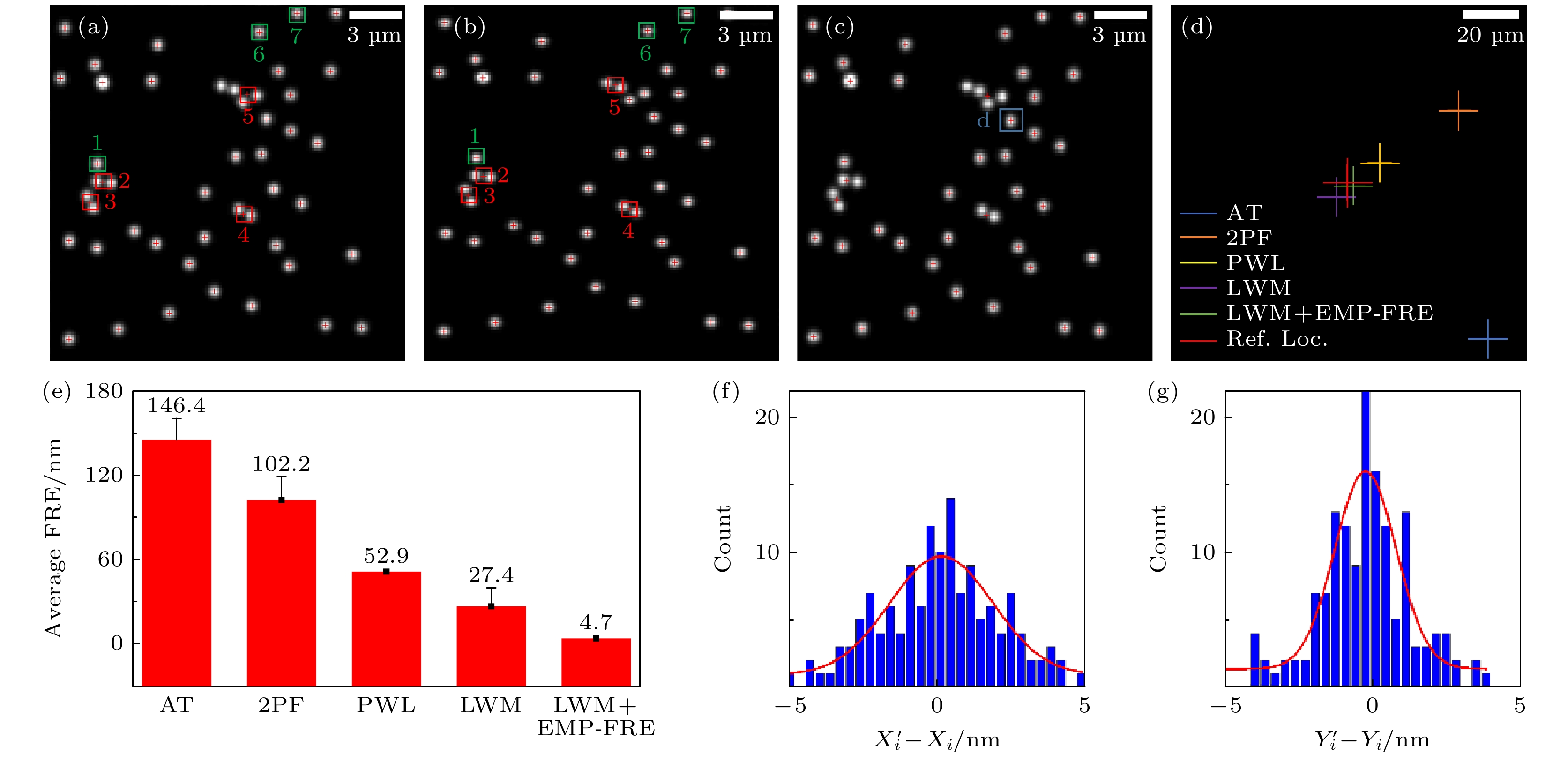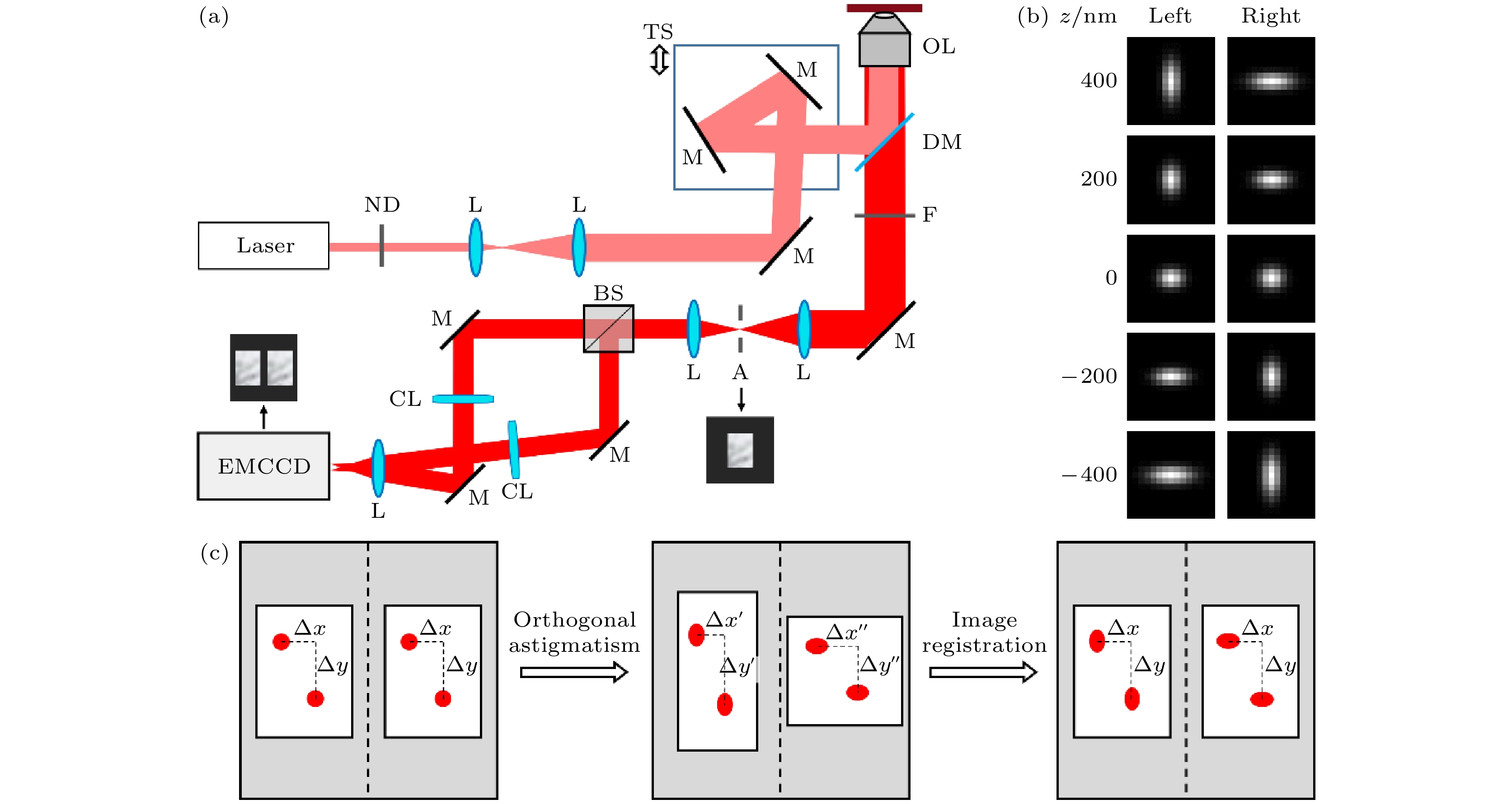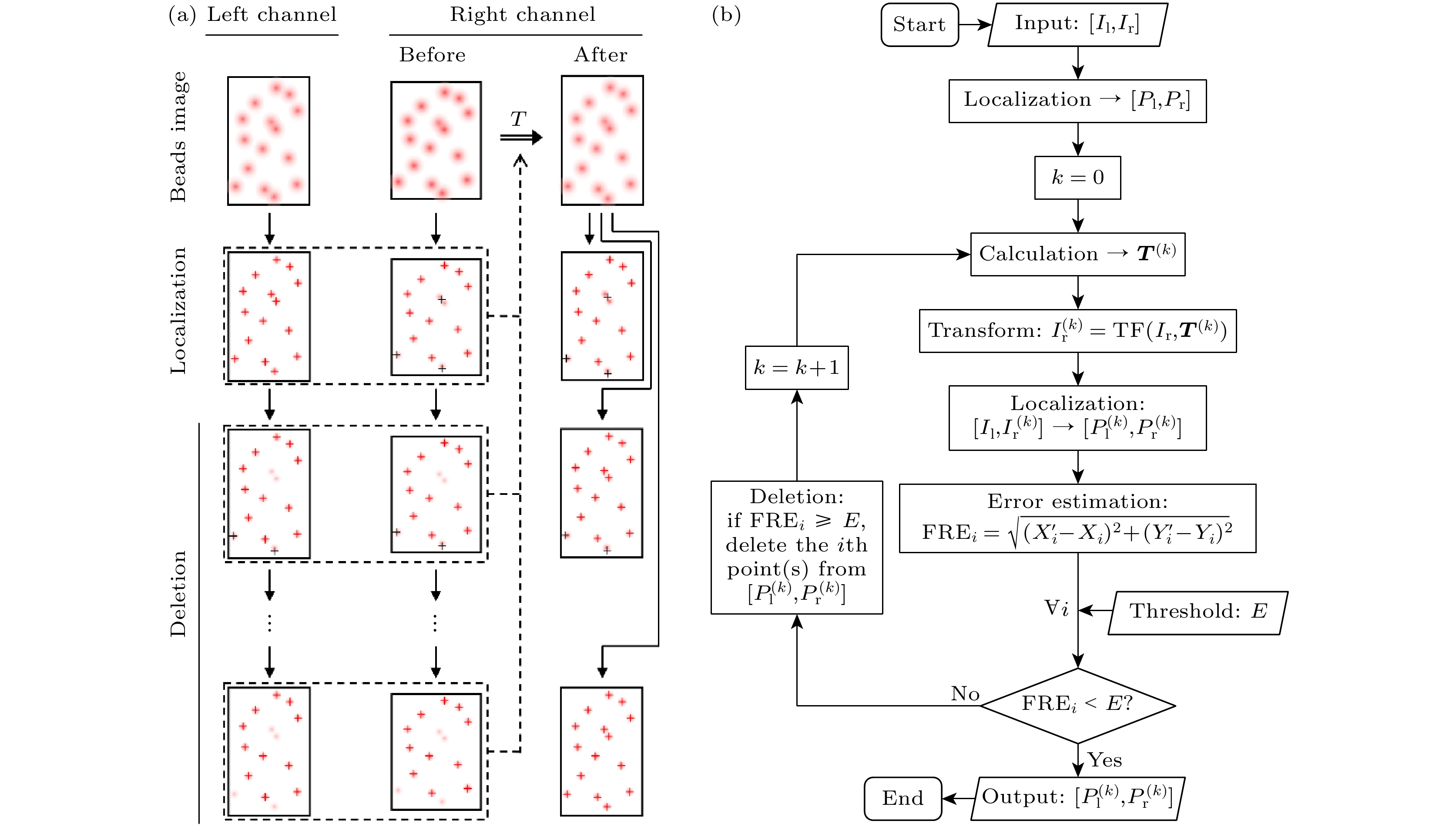 Single-molecule localization technology has been widely used in single-particle tracking and super-resolution imaging of biological samples, as it can bypass the diffraction limit of optical systems. Multi-channel single-molecule localization uses multiple imaging channels to simultaneously track different targets or perform multi-color super-resolution imaging, and can also improve the axial depth of single-particle tracking or achieve higher localization precision and density for super-resolution imaging. However, the difference between images in each channel can affect collaborative localization or quantitative analysis, so image registration is a key step in its image data preprocessing. Moreover, due to the high precision of single-molecule localization, its requirements for multi-channel image registration accuracy are also high. Existing technologies generally use control point-based registration methods and often use complicated and precise methods to obtain fiducial images for locating control point pairs to achieve high-precision image registration, which involves high sample or experimental equipment requirements and is difficult to directly extend to other systems. Therefore, developed in this work, is a high-precision image registration method that can directly use randomly distributed fluorescent beads as fiducial samples based on local nonlinear transformation and elimination of mismatched points. By monitoring and iteratively filtering control points in the process of feature matching and transformation model parameter estimation to eliminate control point pairs that are not accurately matched due to inaccurate or poor precision of single-molecule localization, the adverse effects on accurate acquisition and precise matching of control points when using randomly distributed fluorescent beads as fiducial samples are eliminated. At the same time, a second-order polynomial fitting based on local weighted mean is used for estimating the transformation model parameter to better adapt to the existence of local nonlinear deformation between different channels. The results show that using this method only requires three iterations to find and eliminate control point pairs that are not accurately located and matched, thereby achieving more accurate transformation model parameter and improving the registration accuracy by an order of magnitude, achieving a registration accuracy of about 6 nm in a complex dual-channel single-molecule localization imaging system based on orthogonal astigmatism.