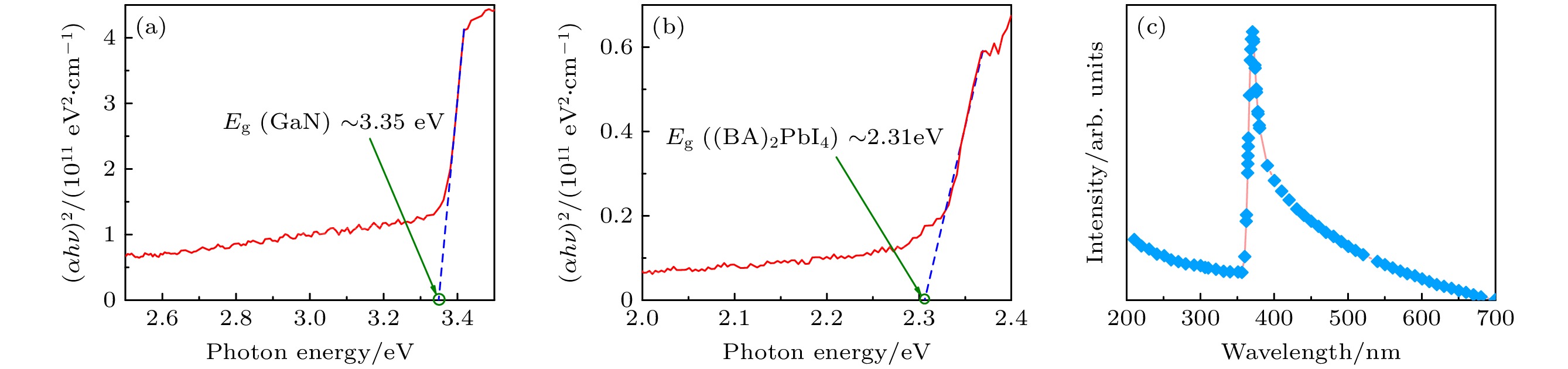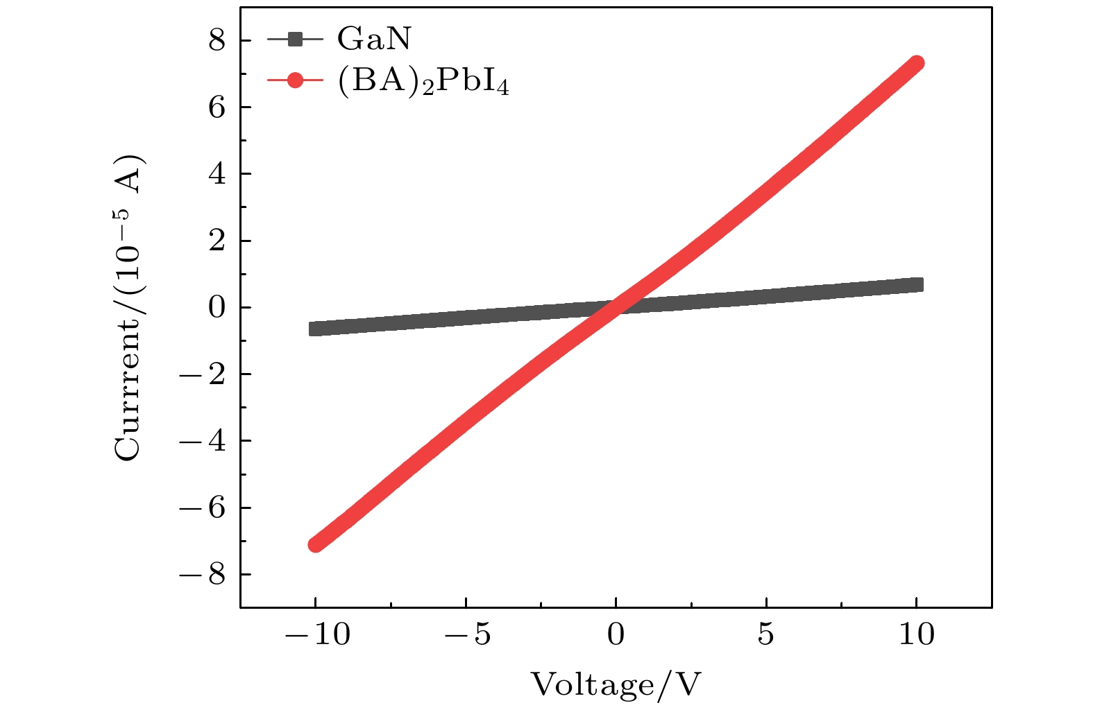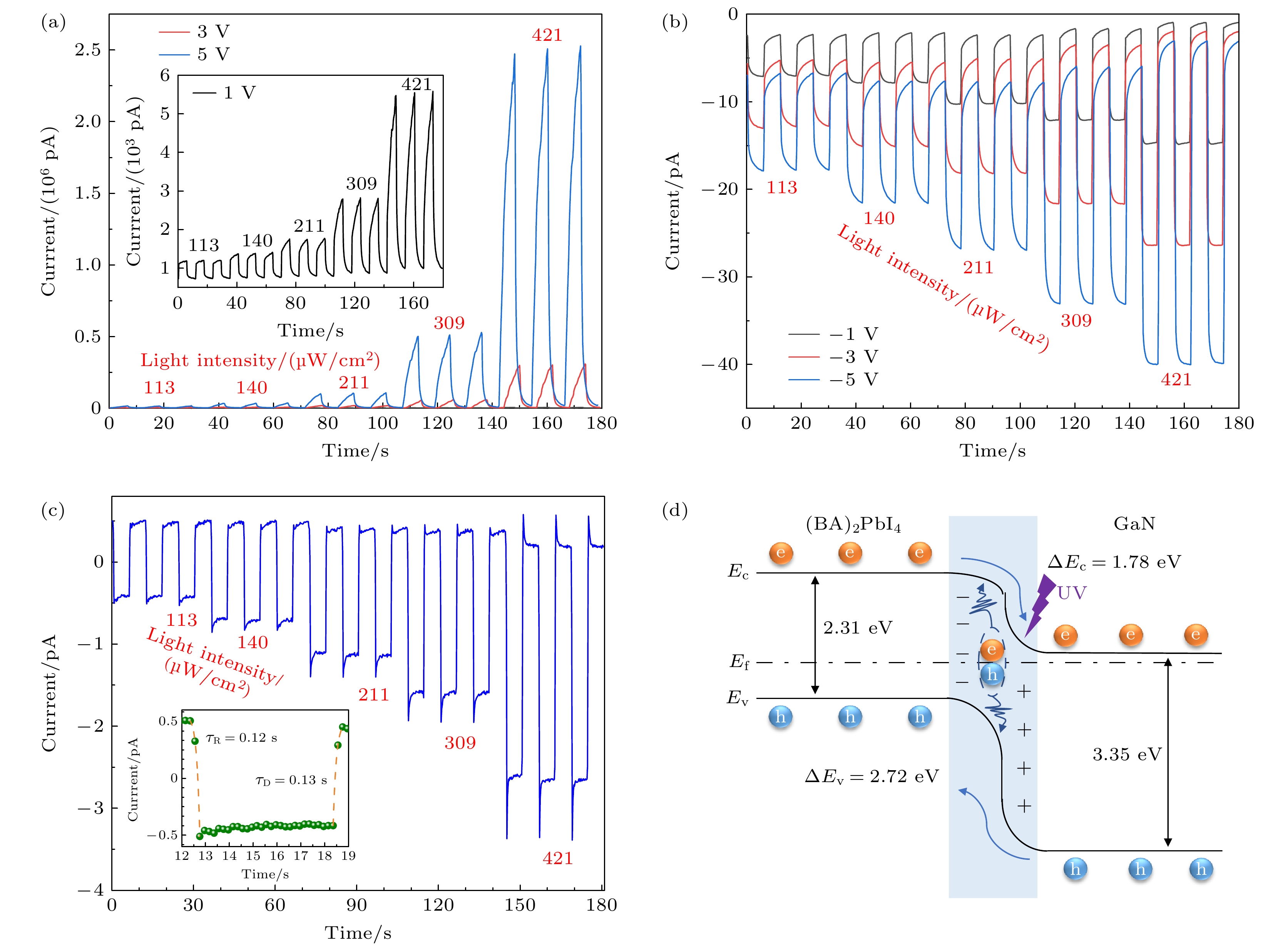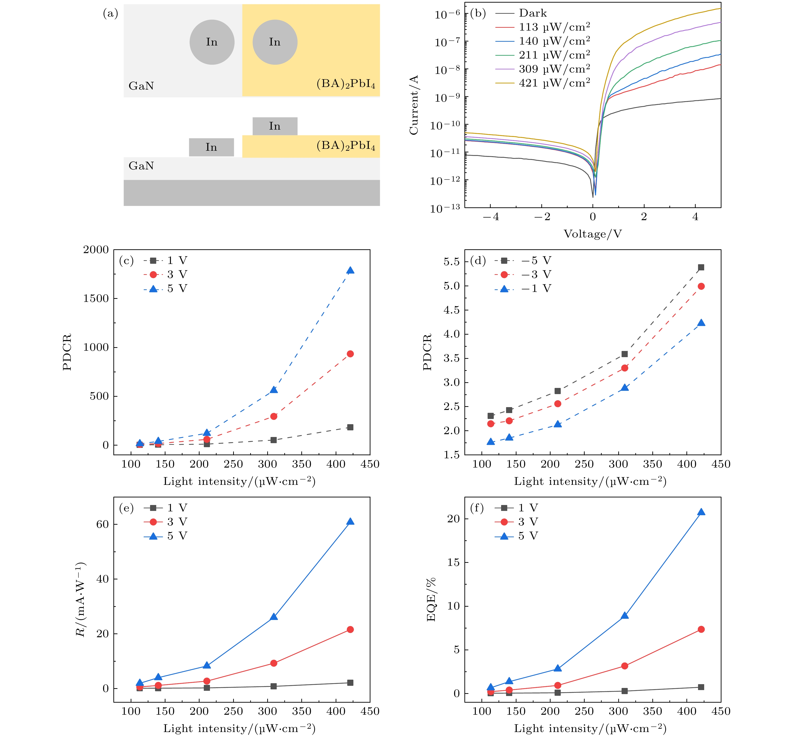 As an important part of an intelligent photoelectric system, ultraviolet detector has been widely used in many fields in recent years. The research on self-powered heterojunction photodiode is particularly important. In this work, a dual-mode self-powered GaN/(BA)2PbI4heterojunction ultraviolet photodiode is prepared and discussed. The GaN film is deposited on sapphire by metal-organic chemical vapor deposition, and then the (BA)2PbI4film is spin-coated onto the surface of the GaN film to construct a planar heterojunction detector. The X-ray diffraction, energy-dispersive X-ray spectroscopy mapping and scanning electron microscope measurements are used to determine the quality of GaN and (BA)2PbI4thin films. When the film is illuminated by 365 nm light with a power density of 421 μW/cm2at 5 V bias, the responsiveness (R) and external quantum efficiency (EQE) are 60 mA/W and 20%, respectively. In self-powered mode, the rise time (τr) and decay time (τd) are 0.12 s and 0.13 s, respectively, illustrating the fast photogeneration process and recombination process for photo-excited electron-hole pairs. And, theRis 1.96×10–4mA/W, owing to the development of space charge region across the interface of GaN thin film and (BA)2PbI4thin film. The outcomes of this study unequivocally demonstrate the extensive potential and wide-ranging applicability of self-powered UV photodiodes based on the GaN/(BA)2PbI4heterojunction configuration. Moreover, this research presents a new concept that provides a novel avenue to the ongoing development of intelligent optoelectronic systems.