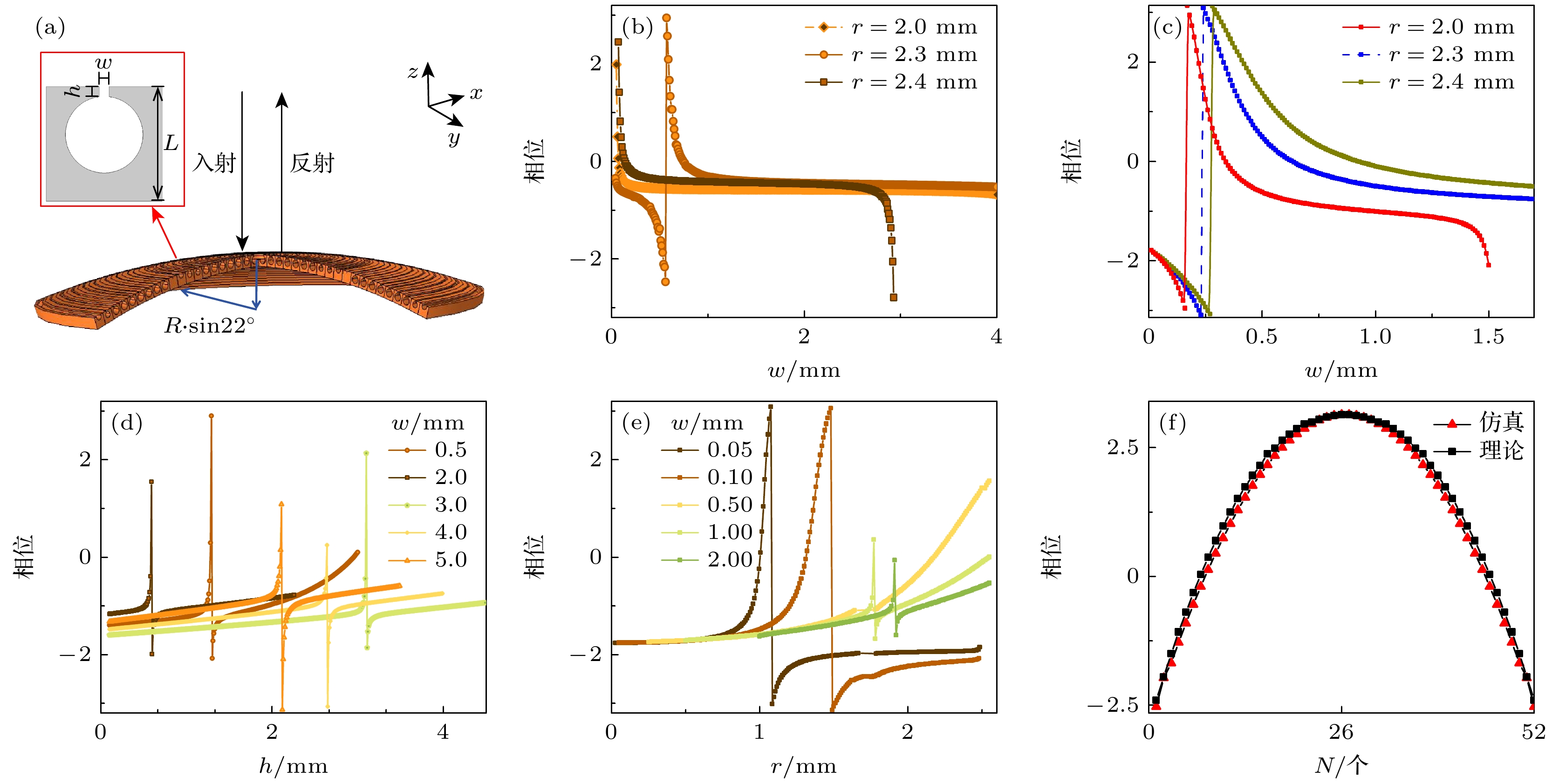 The phase change of HR unit is solved analytically by using the Generalized Snell’s law, and confirmed by the Multiphysics COMSOL software. The parameter effects of HR unit on the phase change are studied, demonstrating that the phase change of HR unit is sensitive to the change of height and radius of HR unit, while the change of width of HR cavity neck can make the phase of HR unit change smoothly. Therefore, when building 52 HR units, the width of the HR cavity neck is designed, and the height and radius of HR unit stay fixed.