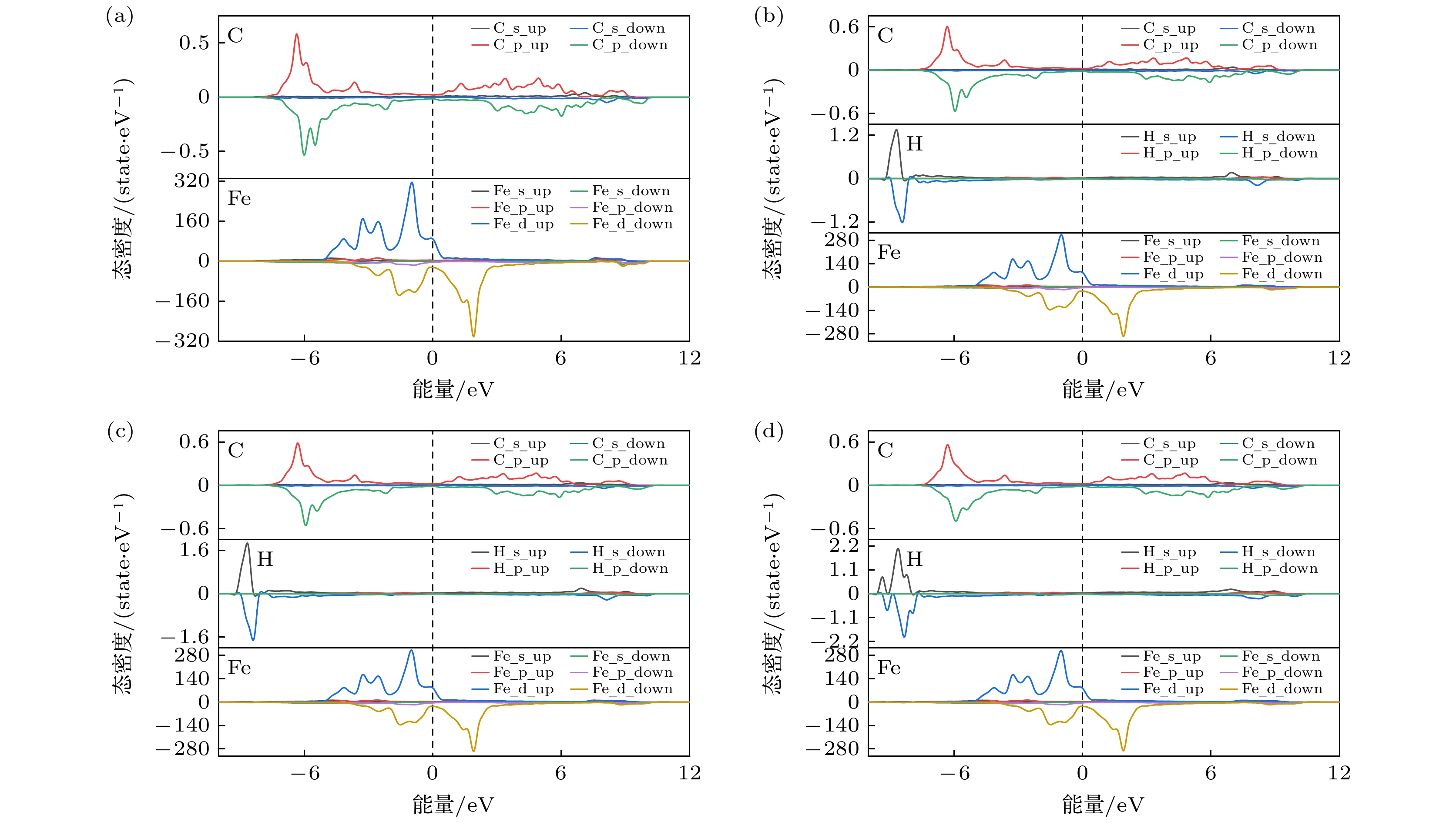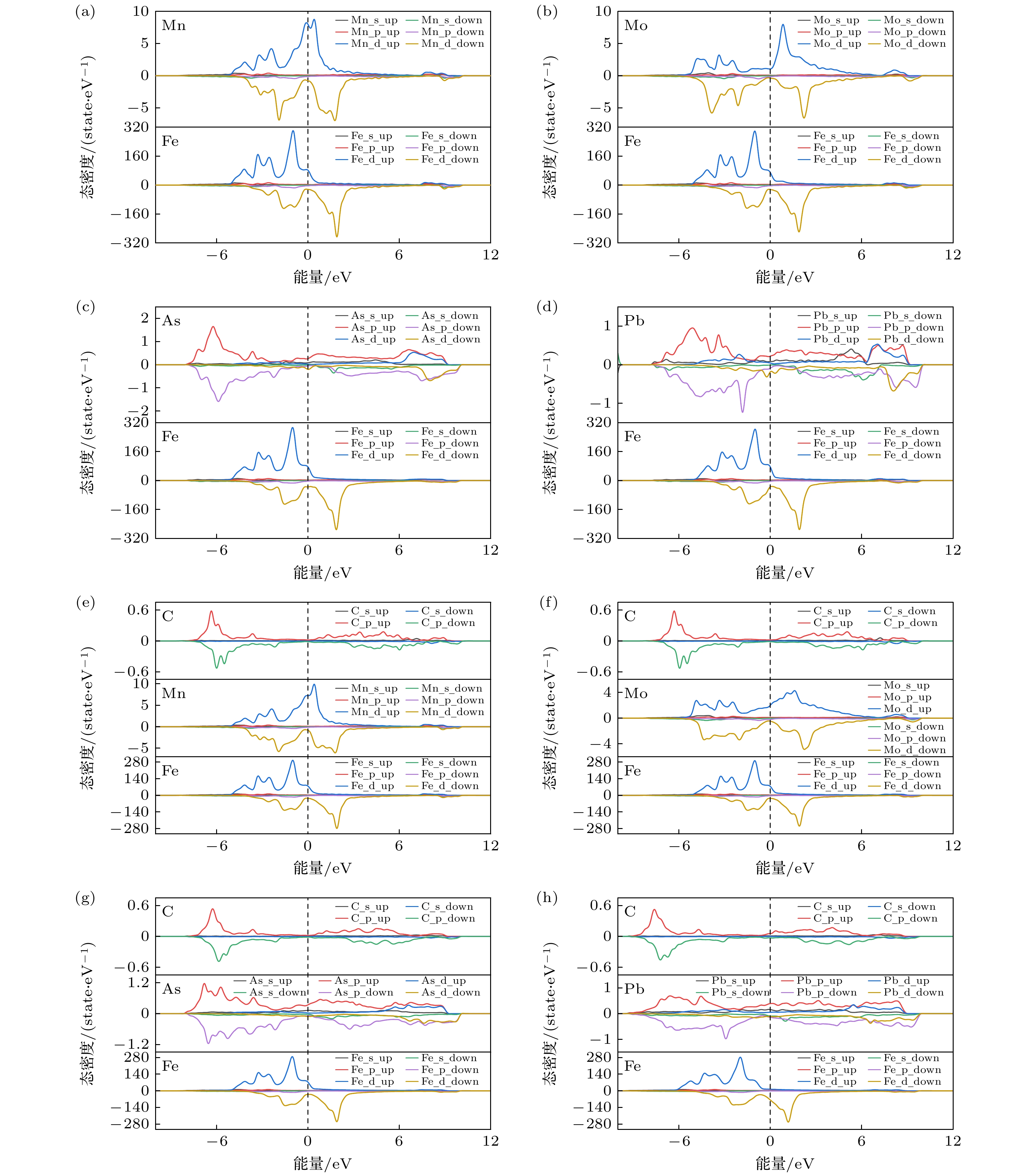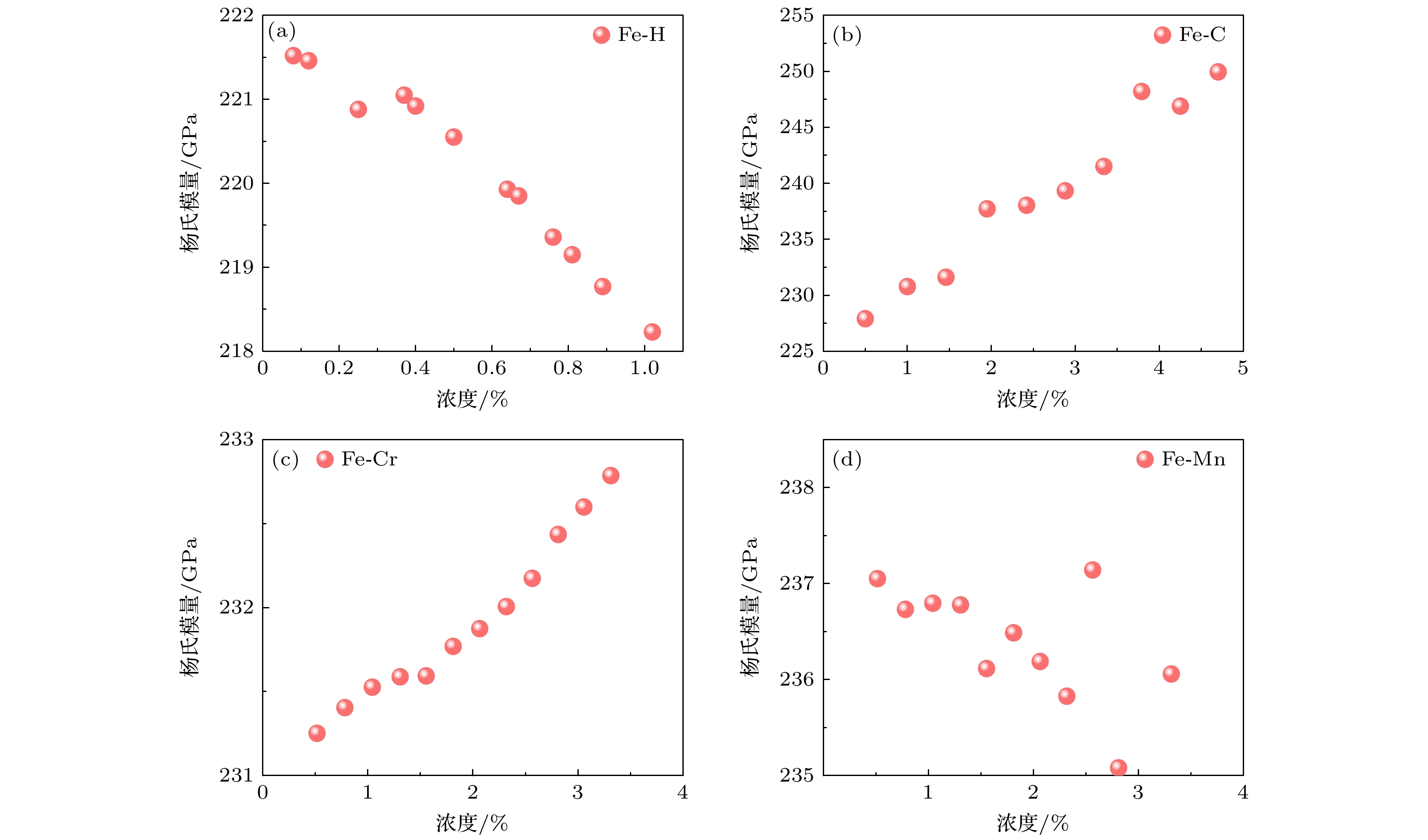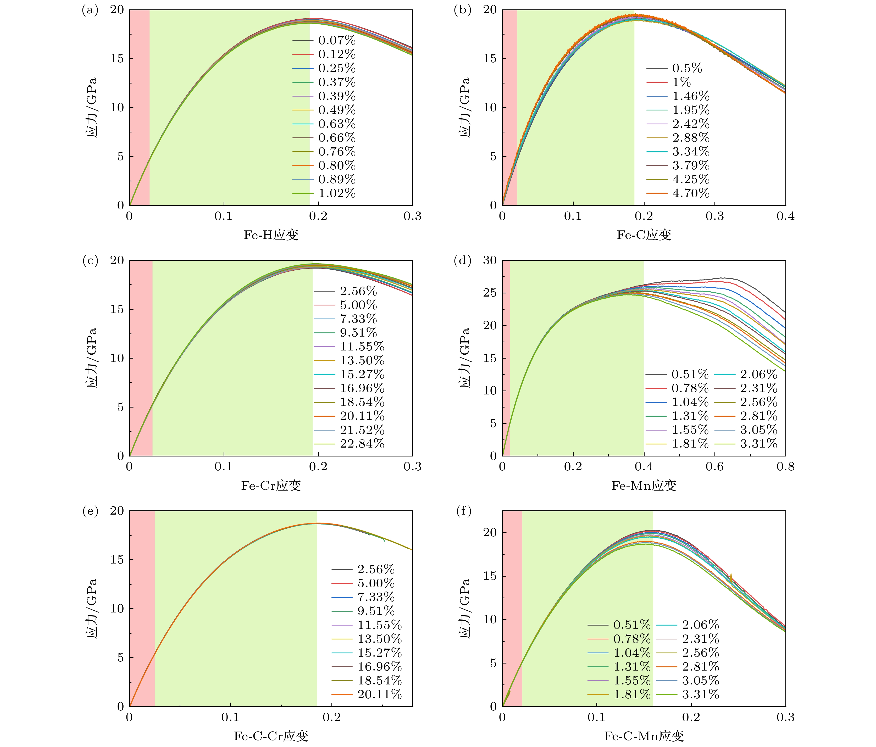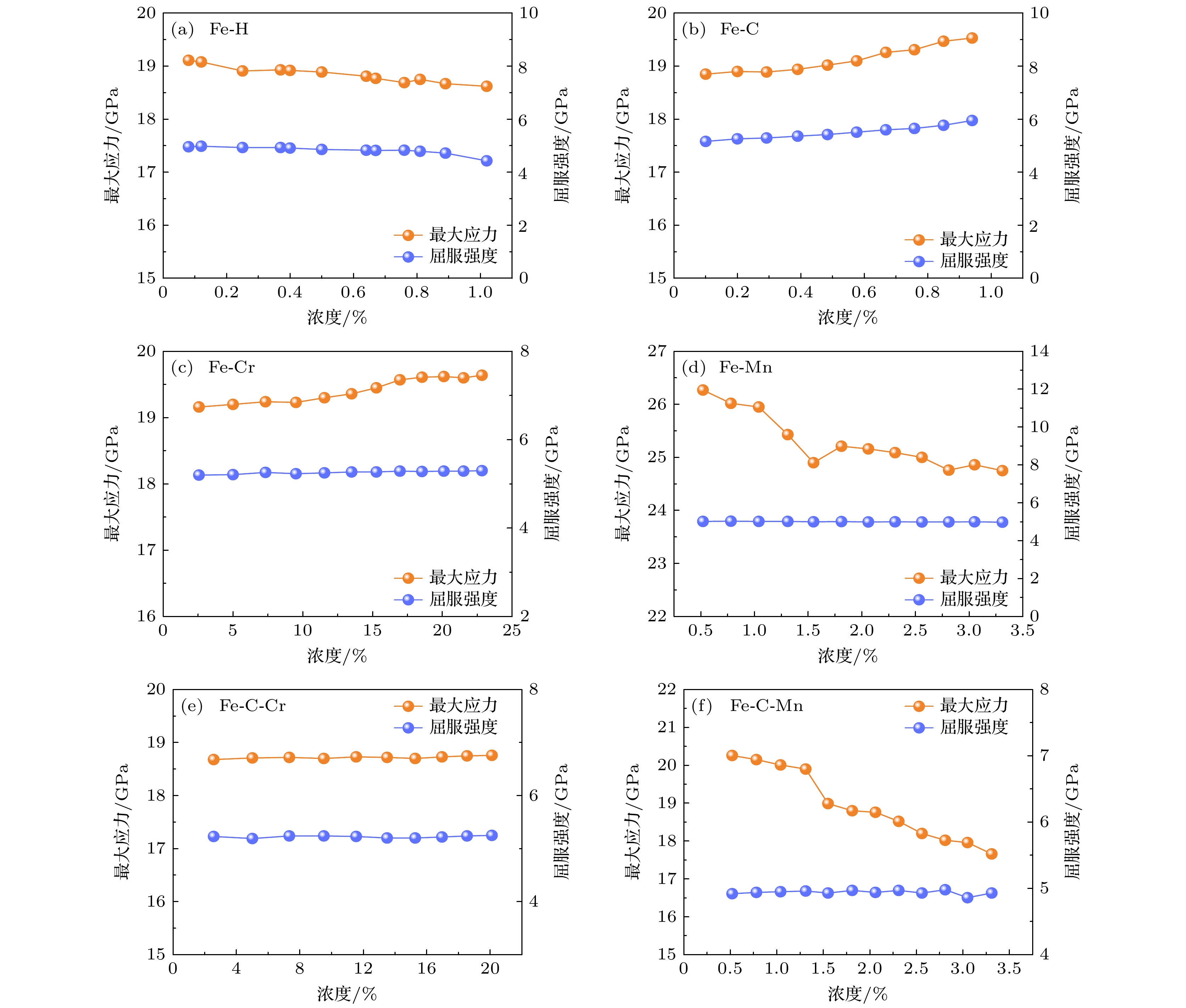 High-pressure gaseous hydrogen storage is an important way of hydrogen energy storage and transport at present, while high-strength steel material is one of the main materials used for hydrogen storage vessels. However, their internal doping elements and inherent defects often lead their mechanical properties to decrease, thus reducing the pressure-bearing capability and storage life of the vessel. At present, the mechanism of doping elements influencing the mechanical properties of high-strength steels is still unclear. In this work, a first-principles approach is used to study the influence of elemental doping (Cr, Mn, Mo, As, Sb, Bi, Sn, Pb) on the mechanical properties of Fe single crystals and Fe-C systems. The results show that among the above elements, Mn doping can increase the elastic modulus, bulk modulus, and shear modulus compared with those of pure Fe, while the doping by remaining elements will reduce the three moduli above, with the non-transition metal elements having a greater effect on the three moduli than the transition metal elements. Electronic structure analysis shows that the transition metal elements have better compatibility with the Fe lattice. Molecular dynamics results further show that the injection of H atoms significantly disrupts the lattice ordering of the Fe polycrystalline doped by C, Cr, and Mn elements, while the doping of Cr elements can significantly enhance the dislocation density of the system. The effects of doping elements on the mechanical properties of single-crystal and polycrystalline Fe, which are studied in this work, are of great significance in guiding the mechanistic study of the effects of doping and defects on the strength of Fe-based materials.