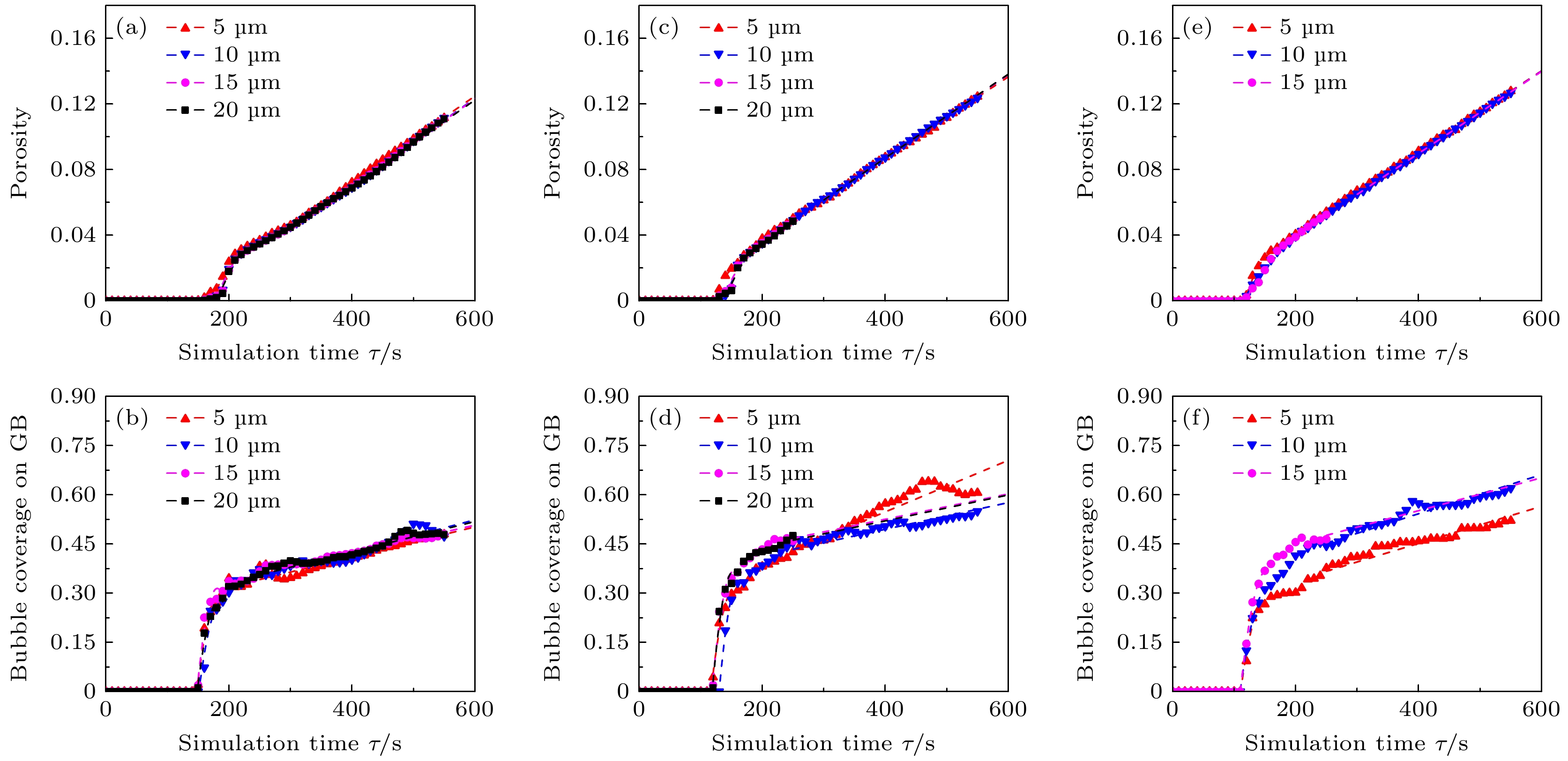In order to predict the release behavior of fission gas in large grain UO2fuel and provide support for the development of accident tolerant fuel, a phase-field model is used to simulate the release behavior of fission gas in the microstructure of UO2polycrystalline in this work. This model adopts a set of coupled Cahn-Hilliard equations and Allen-Cahn equations, using conserved field variables to represent the distribution of fission gas and vacancies, and distinguishing bubble phase from matrix phase by using order parameters. This model focuses on investigating the effects of different grain sizes, temperature conditions, and diffusion coefficients on the release behavior of fission gas, demonstrating the nucleation, growth, and fusion behavior of bubbles. Simulation results are obtained for fuel porosity, bubble coverage on grain boundaries, and average bubble radius at a certain degree of burnup. The results show that temperature and diffusion coefficient have a significant influence on porosity and bubble coverage on grain boundaries. When the diffusion coefficient is high, grain size also has a significant influence on fission gas release behavior. And when the diffusion coefficient is low, the influence of grain size is not significant. In addition, the distribution of fission gas bubbles under high burnup obtained through this model is also in good agreement with experimental result. The model can predict the behavior of fission gas release in large grain UO2fuel.