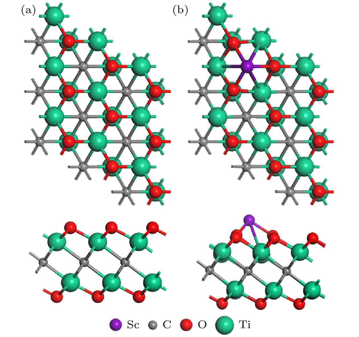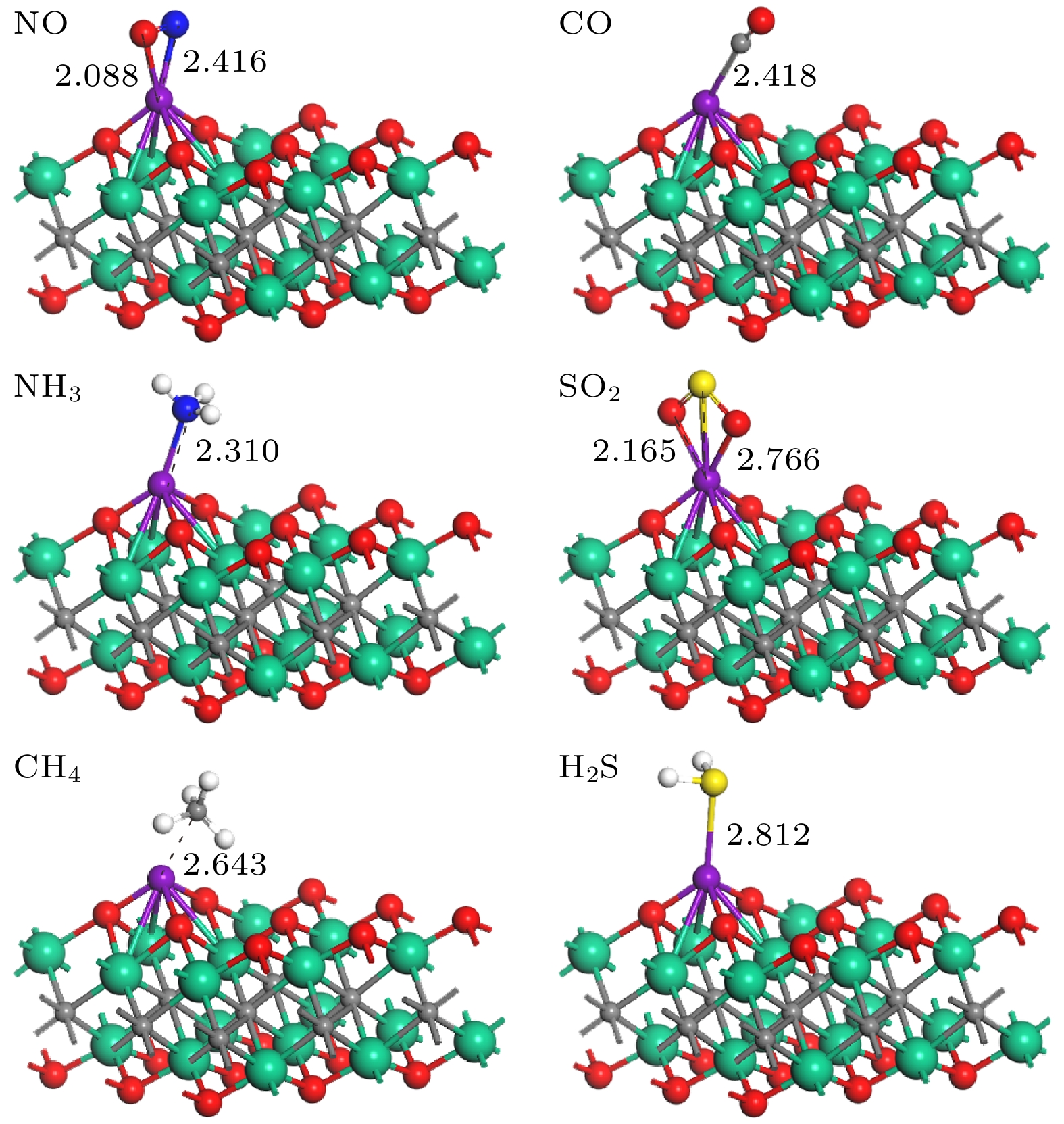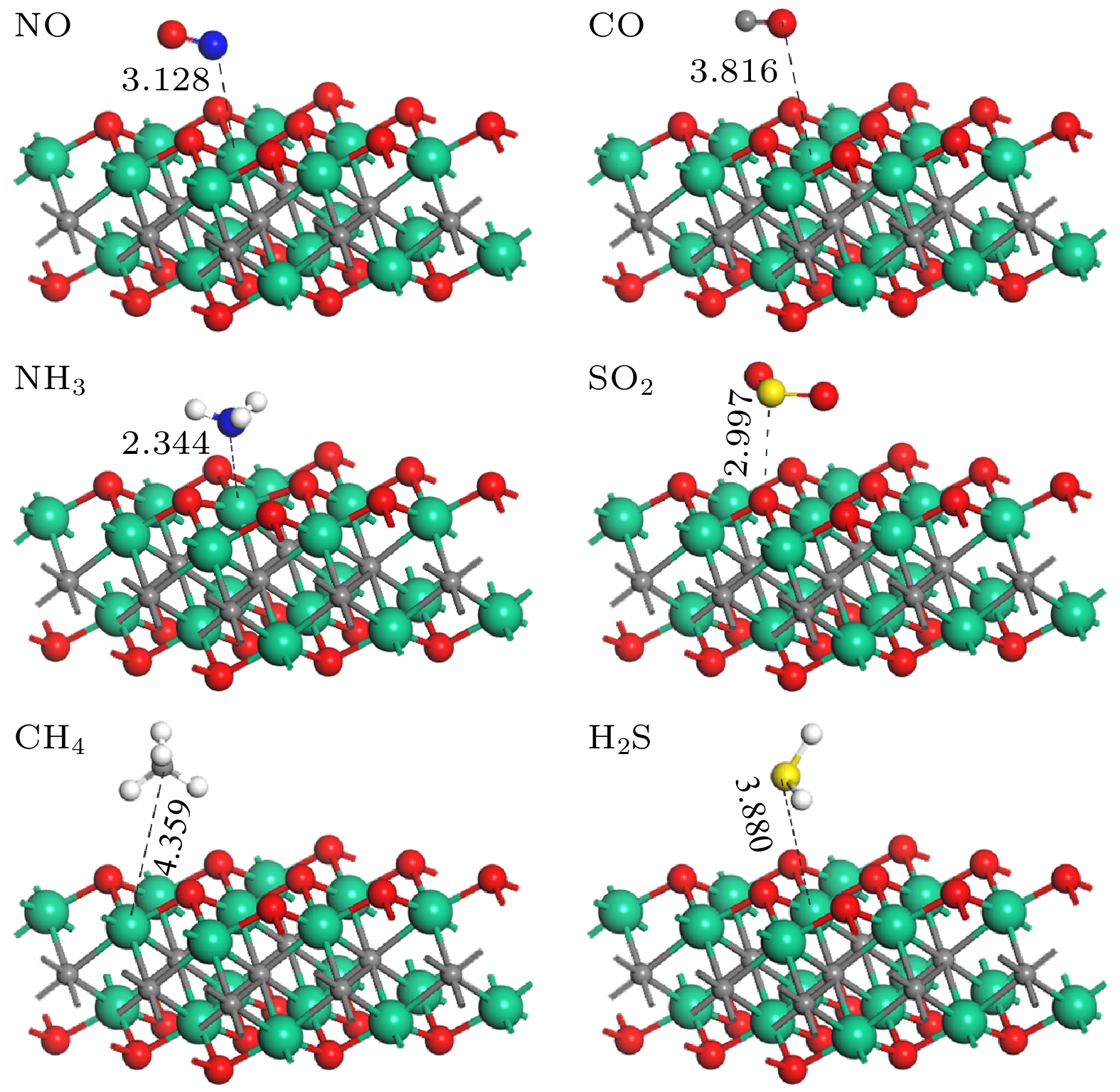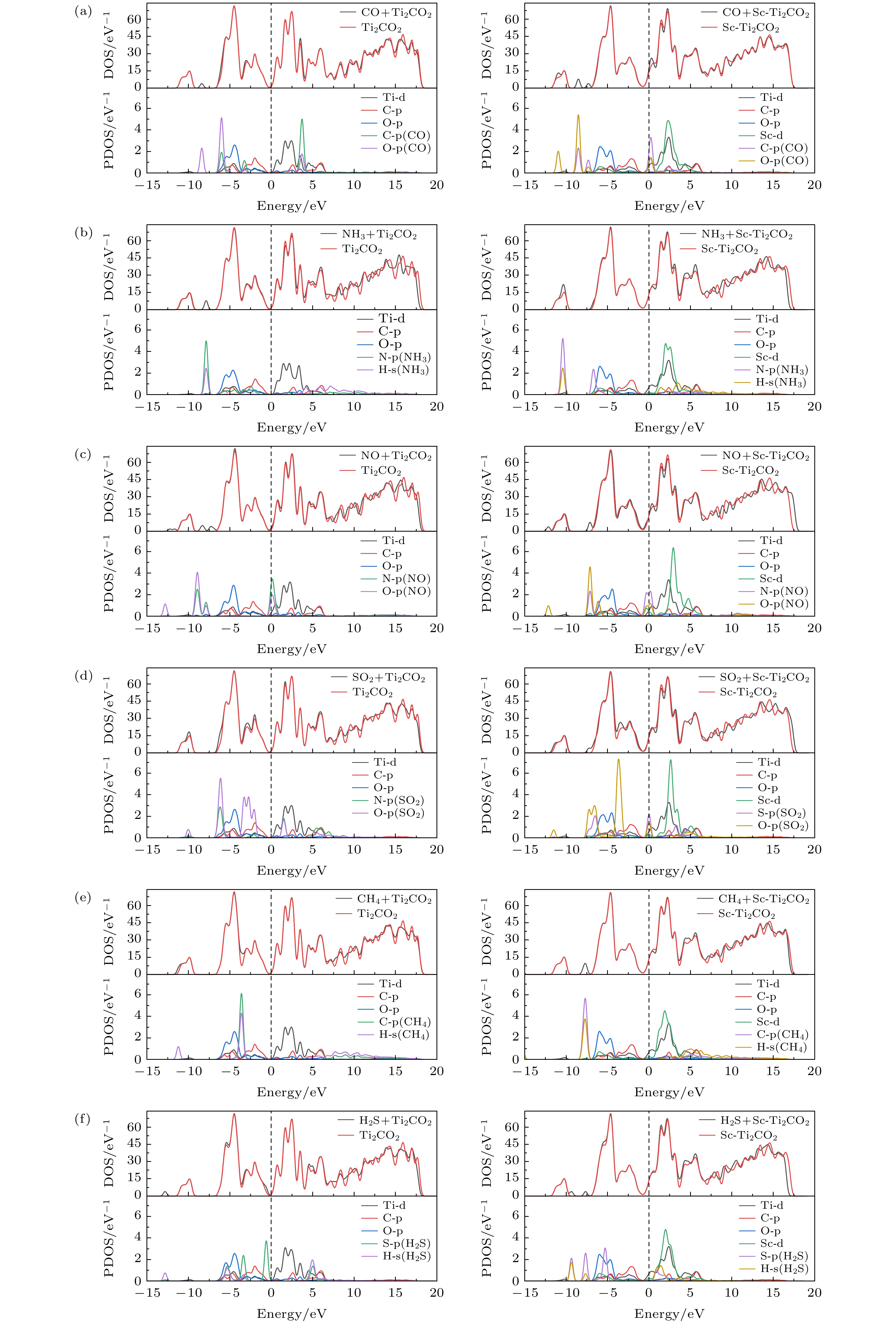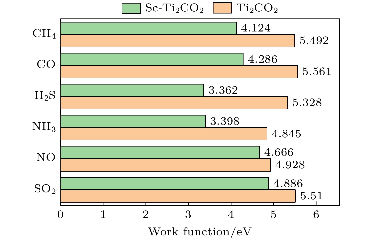 MXene materials have received increasing attention due to their unique properties and potential applications. Ti2CO2, as a typical MXene material that has been prepared, has been widely studied. The adsorption characteristics of two-dimensional materials for gas molecules can be significantly improved through transition metal modification. However, there are few studies on the use of transition metals to modify Ti2CO2. In this work, the adsorption processes of different harmful gases (CO, NH3, NO, SO2, CH4, H2S) on the surfaces of these two materials, i.e. Ti2CO2and metal Sc modified Ti2CO2,are studied and analyzed based on first-principles density functional theory and generalized gradient method. The geometric optimization calculation of the metal-modified adsorption harmful gas structure is carried out, and the kinetic energy cutoff energy of the plane wave basis set is taken as 450 eV. The calculation results show that the structure in which Sc atoms are located above the C atoms in the hollow position has a large binding energy, but it is smaller than the experimental value of the cohesive energy of solid Sc (3.90 eV). Sc atoms can effectively avoid clustering. Surface Sc metal provides active sites for gas adsorption. By analyzing the optimal adsorption points, adsorption energy and other parameters of different gases, the adsorption effects of metal Sc-modified Ti2CO2on these gases are analyzed. Among them, the adsorption effect of SO2is better, the adsorption energy is increased from –0.314 eV to –2.043 eV, and the adsorption effects of other gases are improved. Due to the introduction of new atoms on the surface of Ti2CO2, the carrier density and carrier mobility of the material are increased, thereby improving the charge transfer on the surface of the material, which is beneficial to its sensitivity to gas molecules. The results of density of states and work function further verify that the carrier density and carrier mobility of Sc-Ti2CO2are increased, which is beneficial to gas adsorption. It is expected that the metal Sc-modified Ti2CO2becomes an excellent gas-sensing material for the detection of CO, NH3, NO, SO2, CH4and H2S, and the present work can provide a reference for theoretically studying the gas-sensing performance of metal Sc-modified Ti2CO2materials.