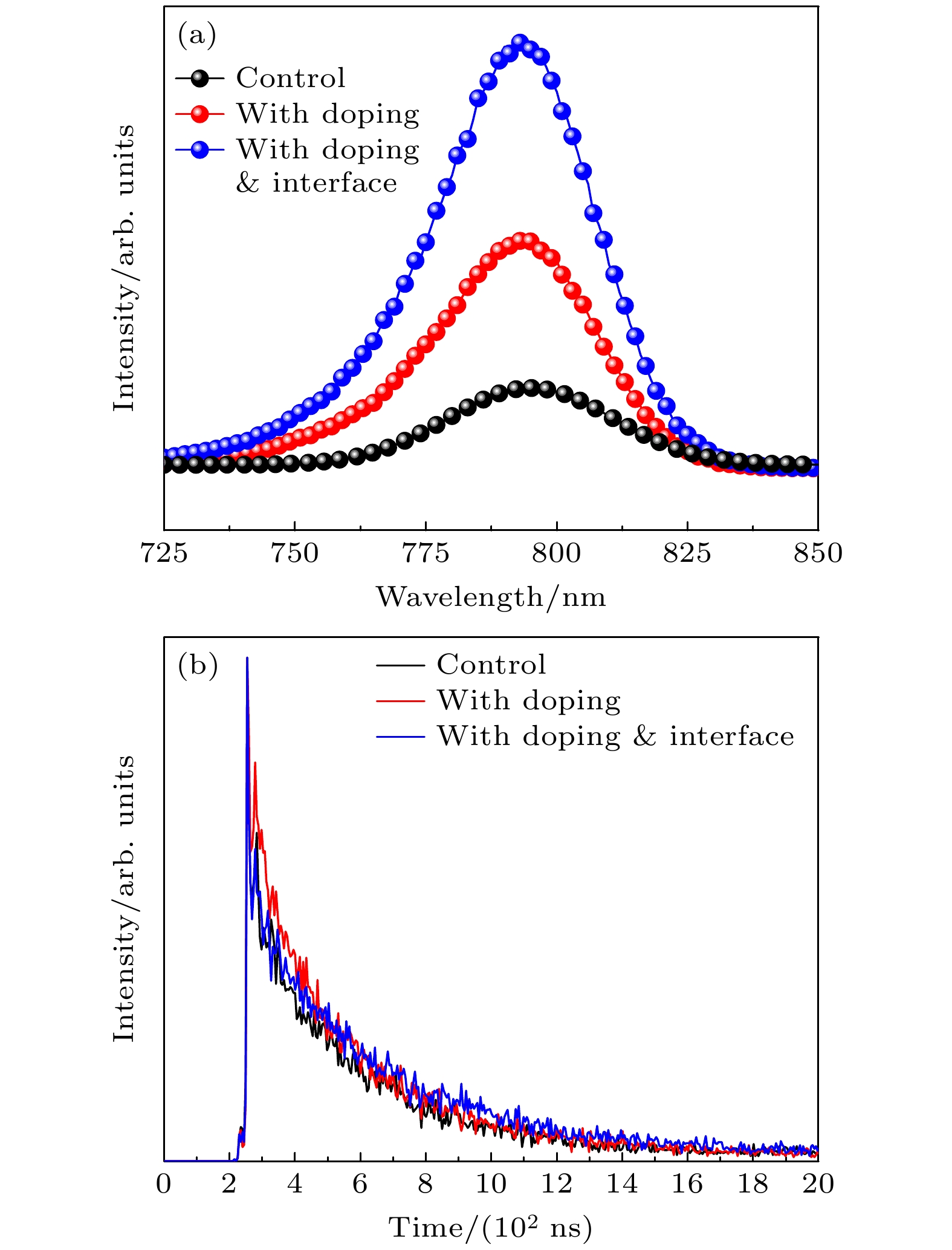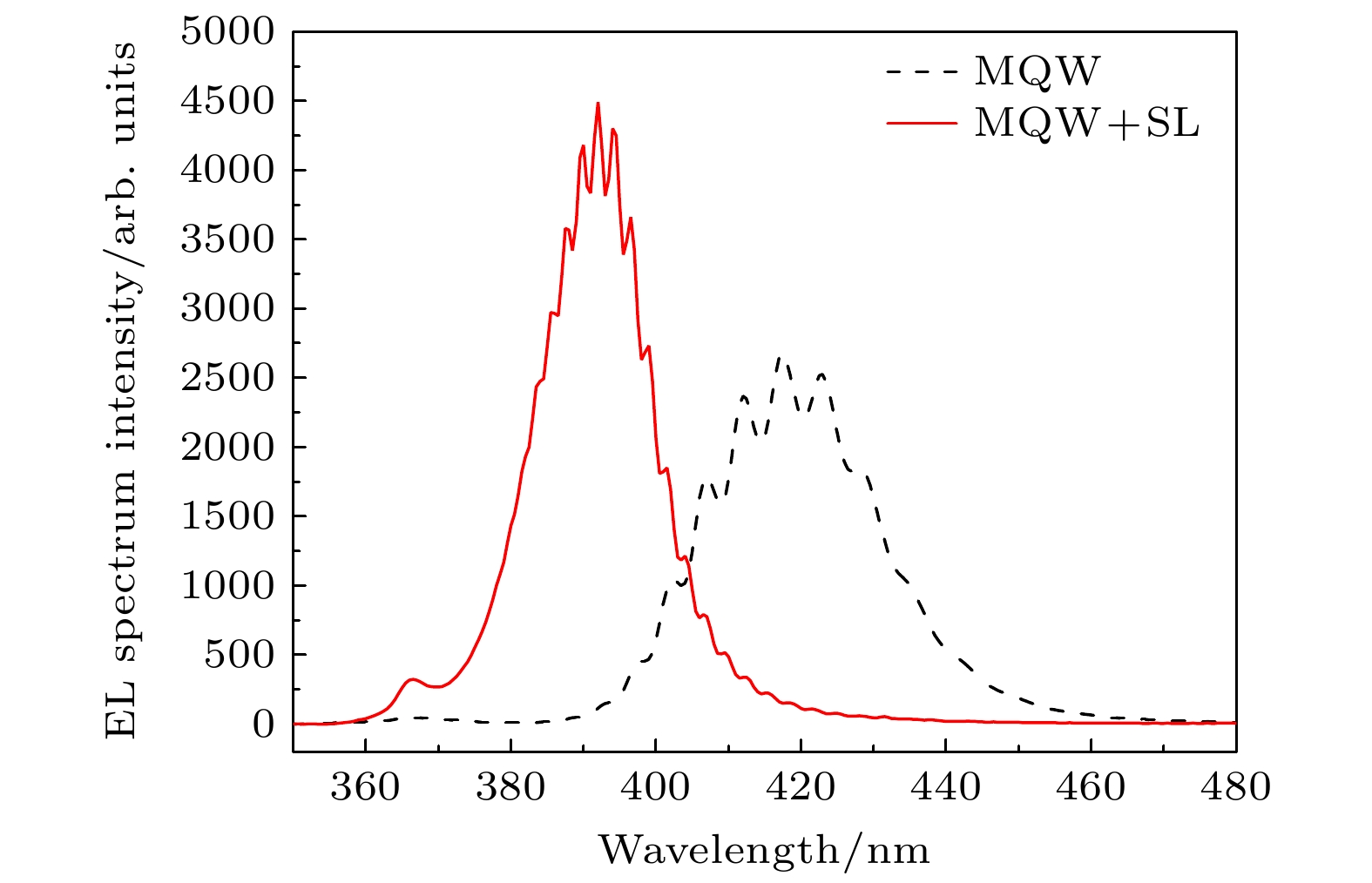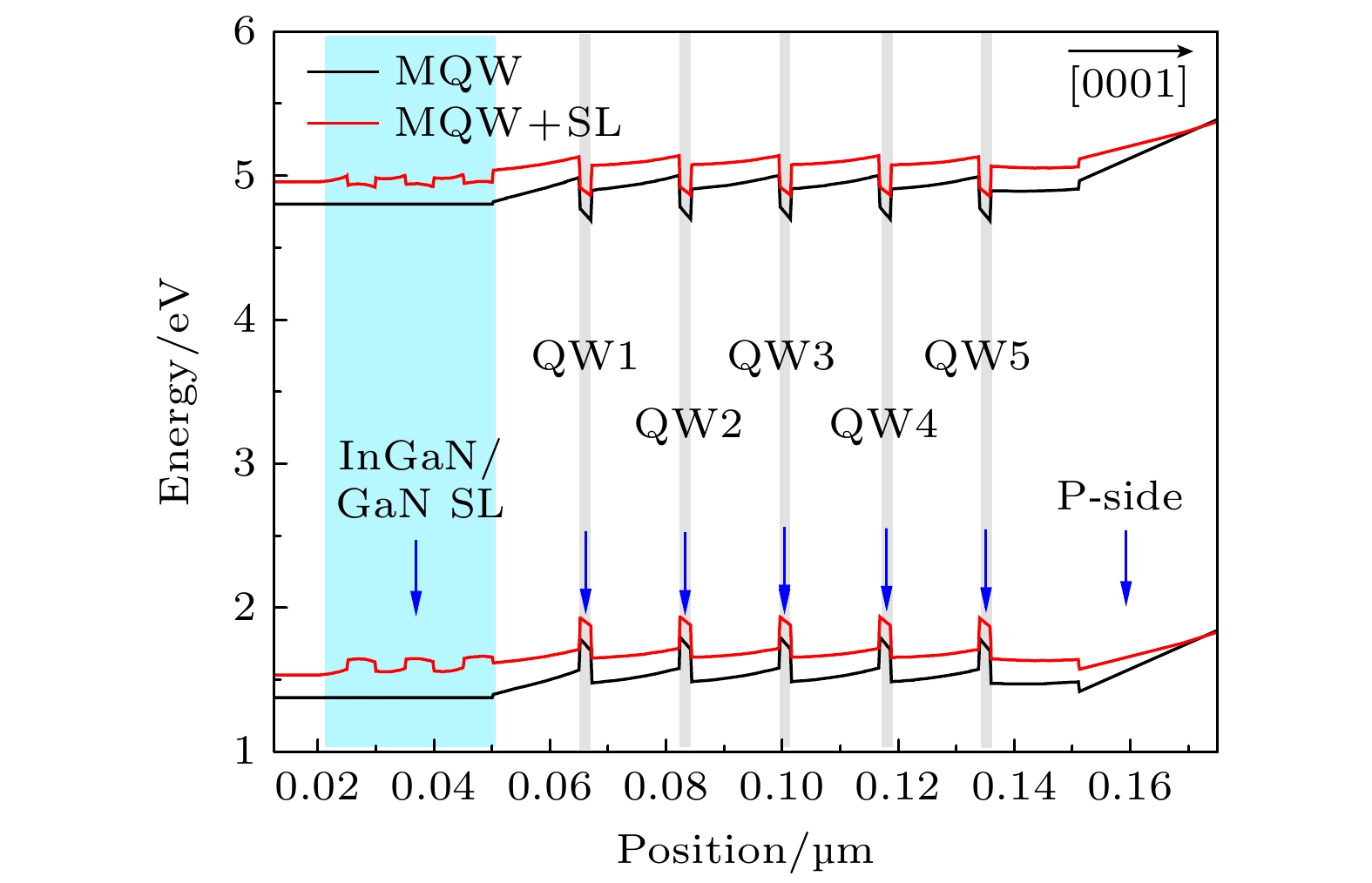 The strong piezoelectric field in InGaN/GaN heterostructure quantum wells severely reduces the light emission efficiency of multiple quantum well (MQW) structures. To address this issue, a strain modulation interlayer is commonly used to mitigate the piezoelectric polarization field and improve the luminescence performance of the devices. To investigate the influence and mechanism of strain modulation in the InGaN/GaN superlattice (SL), epitaxial wafers with an n-type InGaN/GaN SL interlayer sample, and their corresponding control samples are prepared. The measured temperature-dependent photoluminescence (PL) spectra of the epitaxial wafers, show that the introduction of an SL interlayer leads to a shorter-wavelength emission and enhancement of internal quantum efficiency. As the temperature increases, a blue shift of the PL peak is observed. However, for the sample with an SL interlayer, the blue shift of the PL peak with temperature increasing is relatively small. Electroluminescence (EL) experiments indicate that the introduction of an SL interlayer significantly increases the integrated intensity of the EL peak and reduces its full width at half maximum. These phenomena collectively indicate that the incorporation of a superlattice interlayer can partly suppress the quantum-confined Stark effect (QCSE) that affects the light emission efficiency. Theoretical calculations show that the introduction of a superlattice strain layer before growing an active multiple quantum well can weaken the polarization-induced built-in electric field in the active quantum well, reduce the tilt of the energy band in the multiple quantum well active region, increase the overlap of electron and hole wave functions, enhance the emission probability, shorten the radiative recombination lifetime, and promote competition between radiative recombination and non-radiative recombination, thereby achieving higher recombination efficiency and improving light emission intensity. This study provides experimental and theoretical evidence that the strain modulation SL interlayer can effectively improve the device performance and offer guidance for optimizing the structural design of devices.