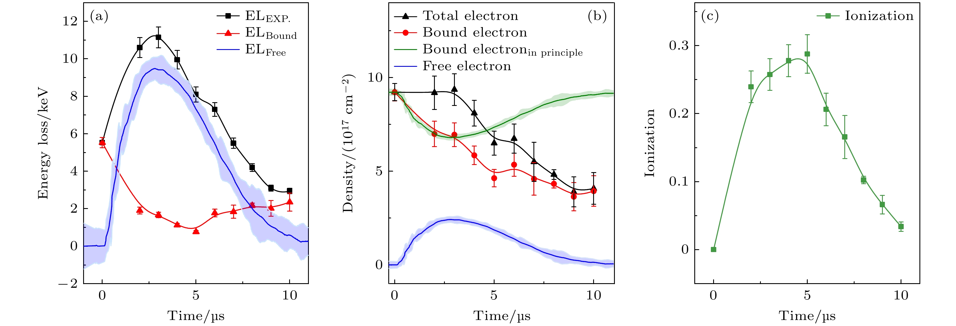Partially ionized plasma contains the bound electrons, which have an effect on the instability of the plasma. The evolution process of bound electron density cannot be obtained by using the existing optical method used for diagnosing the free electron density. In this work, we carry out a high-precision experiment: the energy loss of a 100 keV proton beam penetrating through the partially ionized hydrogen plasma target is measured on the platform of ion beam-plasma interaction at the Institute of Modern Physics, Chinese Academy of Sciences. The bound electron density is obtained according to the energy loss model of Bethe theory. The free electron density is measured by laser interferometry and the electron tempercture is obtained from the measured spectrum (Te= 0.68 eV;nfe= 2.41×1017cm–2). It is found that the bound electron density decreases during plasma lifetime. The diagnosis of bound electron density by measuring energy loss of ion beam has the advantages of on-line, in-situ and high resolution, thus providing a new way to solve the problem about measuring the bound electron density in partially ionized plasma. A COMSOL simulation reveals that the high-temperature free electrons will be ejected quickly out of the plasma area through a mechanical diaphragm, thus reducing the total number of free electrons. In order to maintain a relatively high degree of ionization in this plasma, in principle, more and more bound electrons are ionized into free electrons, the density of bound electrons decreases correspondingly. The simulation result accords well with our experimental data. Based on this finding, more detailed plasma target parameter is obtained, which is helpful in deepening the understanding of the interaction process between ion beam and plasma. In future, more researches of low low-energy highly-charged ions-plasma interaction will be conducted.