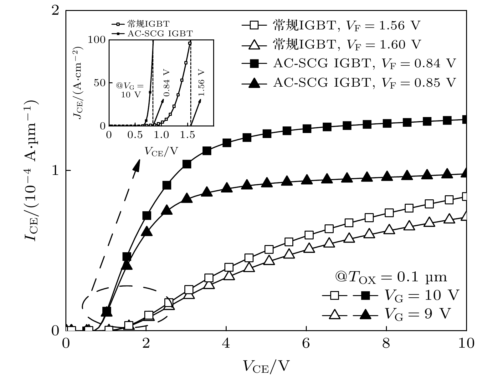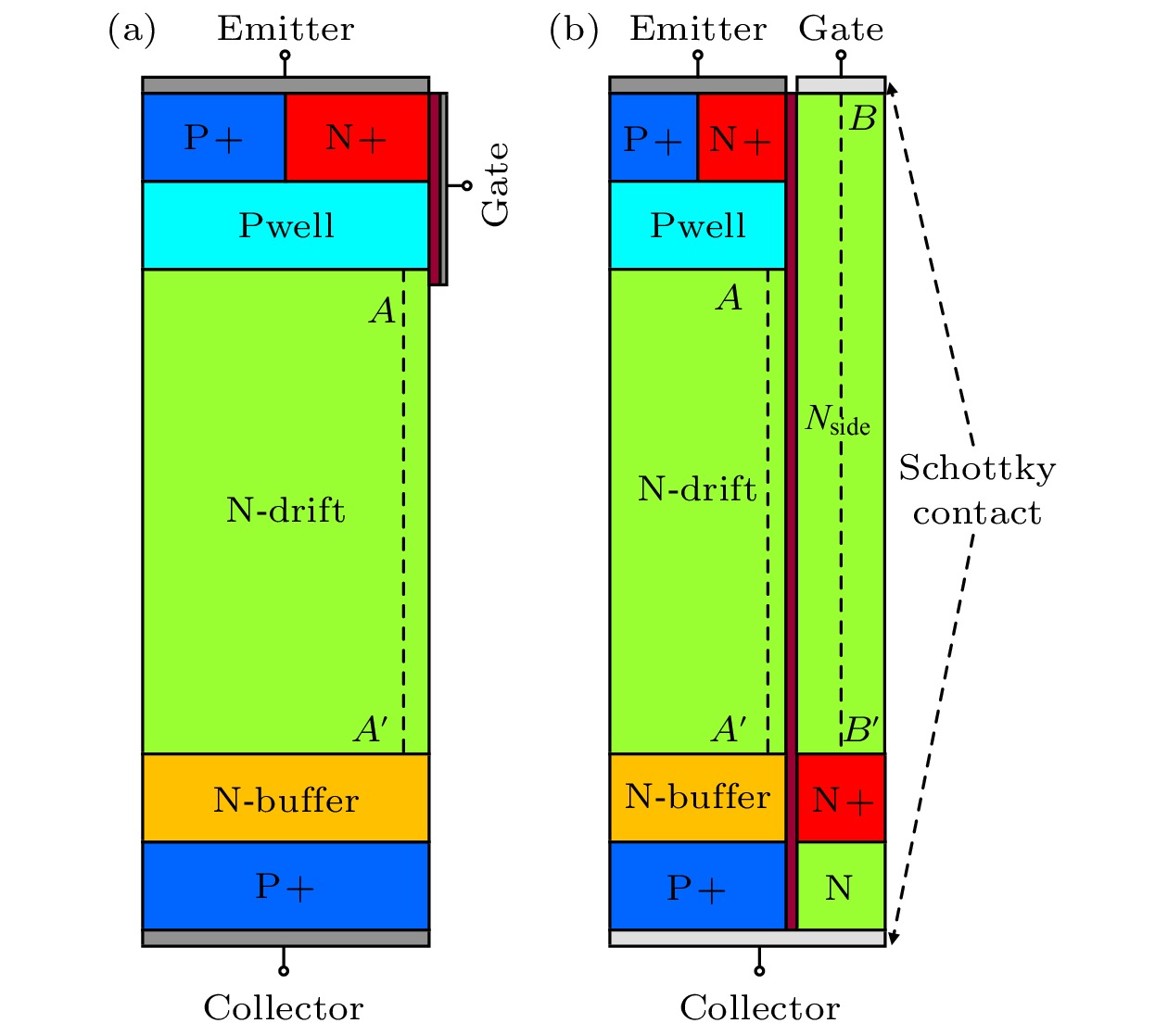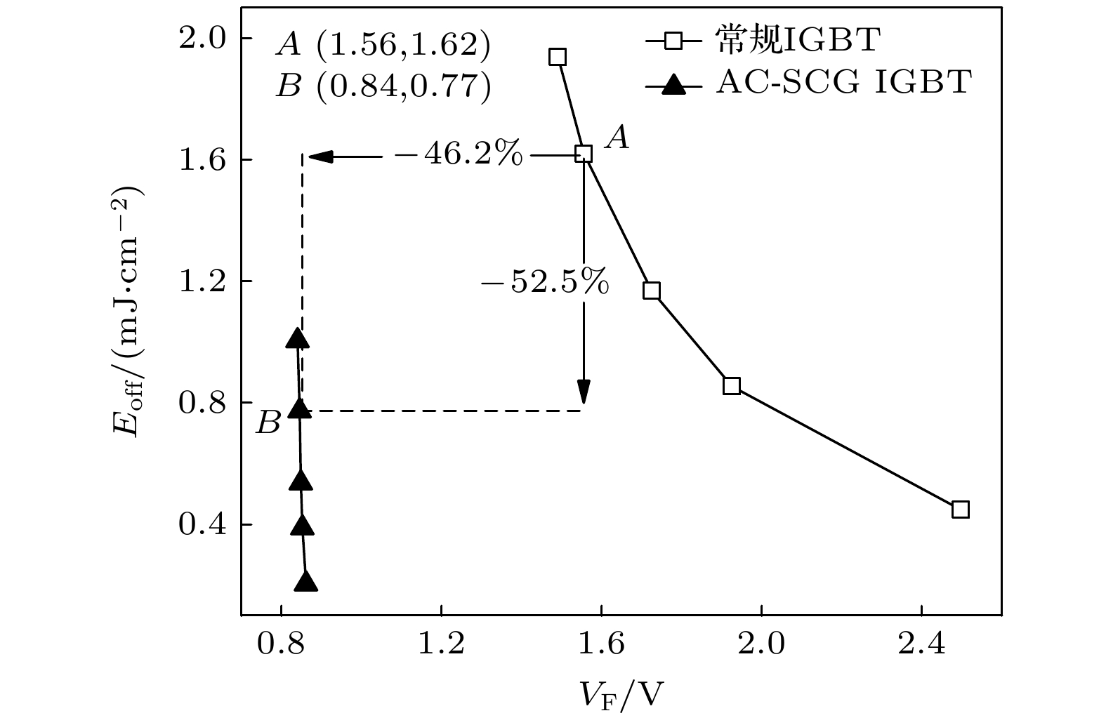 Insulated gate bipolar transistor (IGBT) is the core of modern power semiconductor device, and has been widely used due to its excellent electrical characteristics. A novel majority carrier accumulation mode IGBT with Schottky junction contact gate semiconductor layer (AC-SCG IGBT) is proposed and investigated by TCAD simulation in this article. When the AC-SCG IGBT is in the on-state, a forward bias is applied to the gate. Due to the very low forward voltage drop (VF) of the Schottky barrier diode, the potential of the gate semiconductor layer is almost equal to the gate potential, which can accumulate a large number of majority carrier electrons in the drift region. In addition to the electrons existing, these accumulated electrons increase the conductivity of the drift region, thus significantly reducingVF. Therefore, the doping concentration of the drift region is not limited byVF. The lightly doped drift region can make AC-SCG IGBT have a higher breakdown voltage (BV). Moreover, it also reduces the barrier capacitance in the turn-off process, thus the overall Miller capacitance is small, which can quickly turn off and reduce the turn-off time (Toff) and turn-off loss (Eoff). The simulation results indicate that at the BV of 600 V, theVFof 0.84 V for the proposed AC-SCG IGBT is reduced by 46.2% compared with that for the conventional IGBT (VFof 1.56 V). TheEoffof the AC-SCG IGBT (0.77 mJ/cm2) is reduced by 52.5% compared with that for the conventional IGBT (1.62 mJ/cm2), and theToff(155.8–222.7 ns) is reduced by 30%. The contradiction betweenVFandEoffis eliminated. In addition, the proposed AC-SCG IGBT has a better anti-latch-up capability and is coupled with its higher BV, so it has a larger forward biased safe operating area (FBSOA). The proposed novel structure meets the development requirements for future IGBT device performance, and has great significance for guiding the development of the power semiconductor device field.