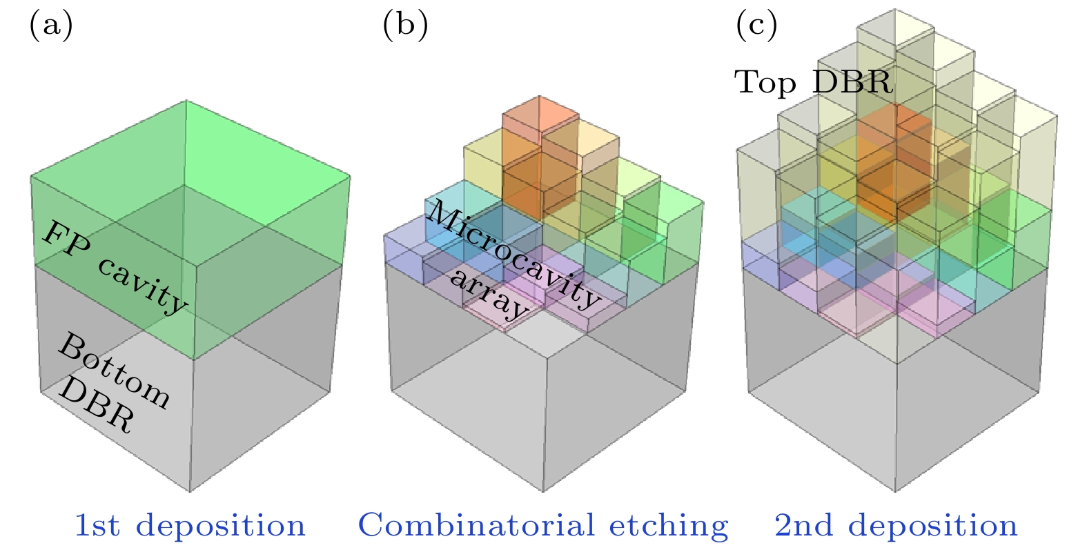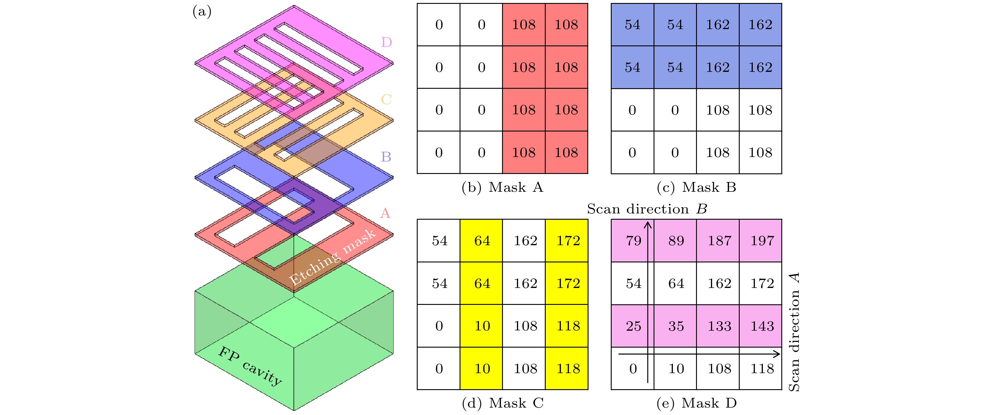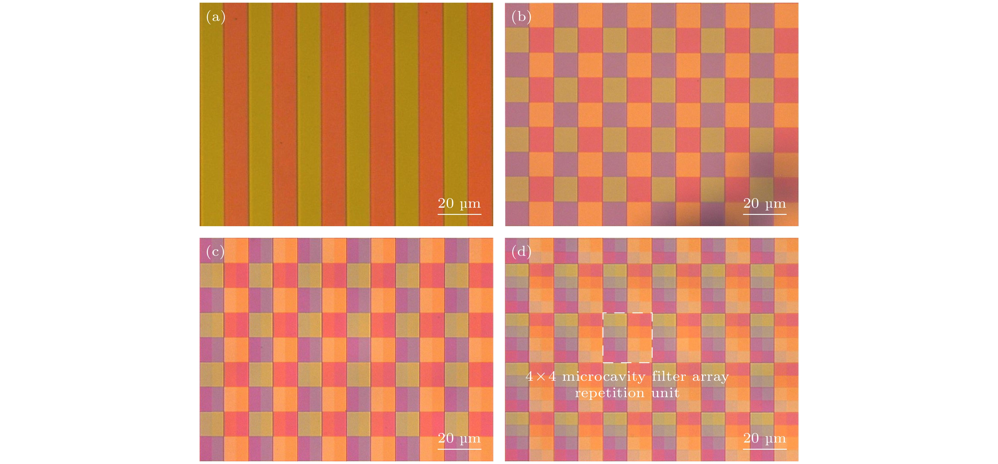 By designing and fabricating a narrow-band Fabry-Perot multi-beam interference spectroscopic microcavity array, and integrating it with a visible light detector focal plane array, we demonstrate a small compact multispectral imaging detector. The micro-cavity filter array with 4×4 basic repeating units and a total of 2048×2048 pixels is obtained on a quartz substrate by the four-fractal combination lithograph-etching process. Then the micro miniatured multispectral imaging detector is formed by fitting with the detector chip. The depth and precision of the etching will determine the distribution and offset of the central wavelength of the narrowband spectral channel respectively. The results show that the etching rate of reactive ion is (3.6 ± 0.2) Å/s, and the process is stable and controllable. Due to the different etching depths, the basic repeating unit forms 16 different levels of steps, and the process achieves the design expectation well.