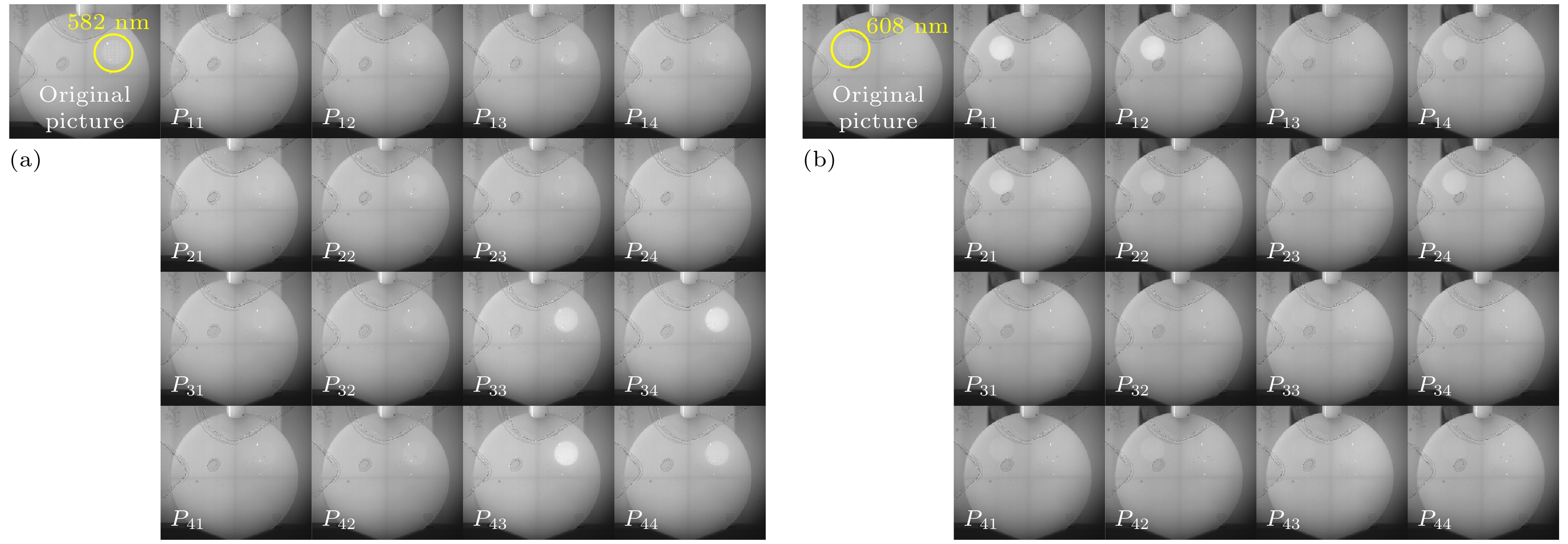 When imaging the target with known spectral characteristics, for a certain frame of multi-spectral image, selecting a suitable spectral channel can eliminate the background in the field of view through image subtraction and improve the contrast of the target. In the dark room condition, we take the LED light source with center wavelength varying in a range between 528 and 589 nm as the target (the wavelength coincides with the working wavelength of the spectral channel), and effectively suppress the background through the spectral differential intensity subtraction, which can improve the accuracy and sensitivity of the target capture. The 16-channel snapshot multi-spectral imaging detector based on integrated Fabry-Perot microcavity array has the advantages of small size, high integration and strong environmental adaptability, and is expected to play a role in realizing the real-time detection of weak moving targets, auxiliary diagnosis of skin surface observation, and high dynamic range imaging of target observation under backlight conditions.
