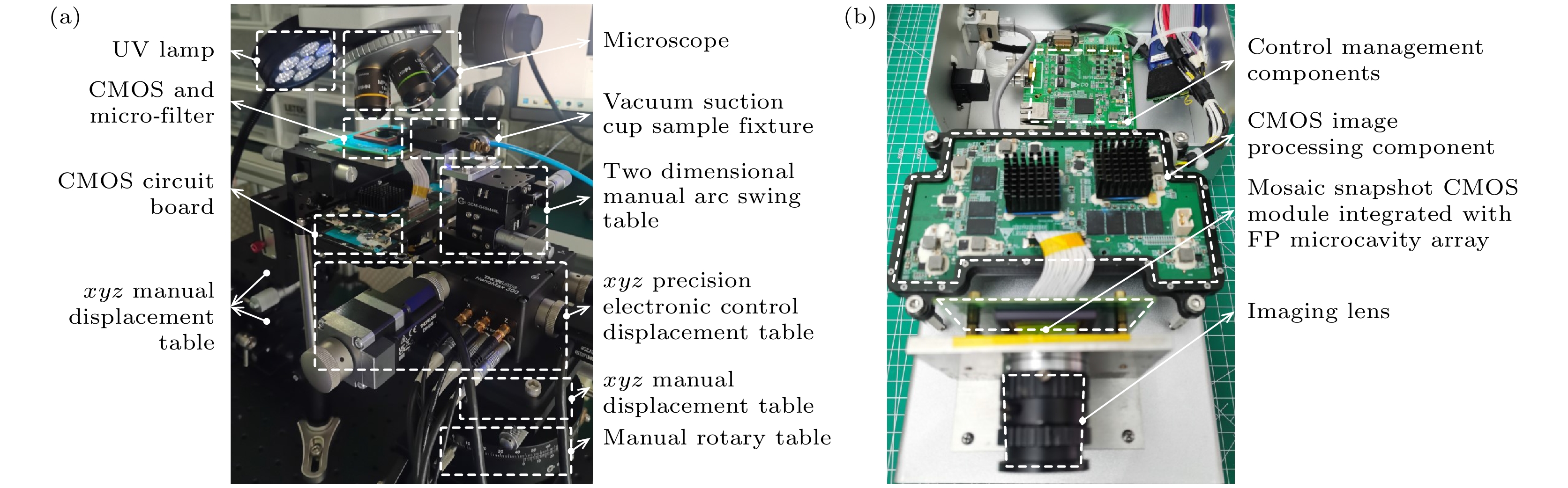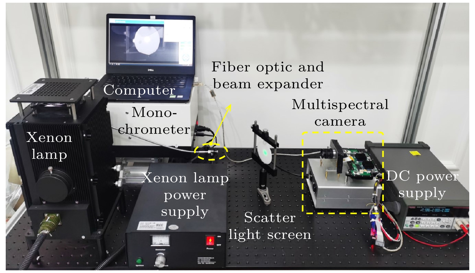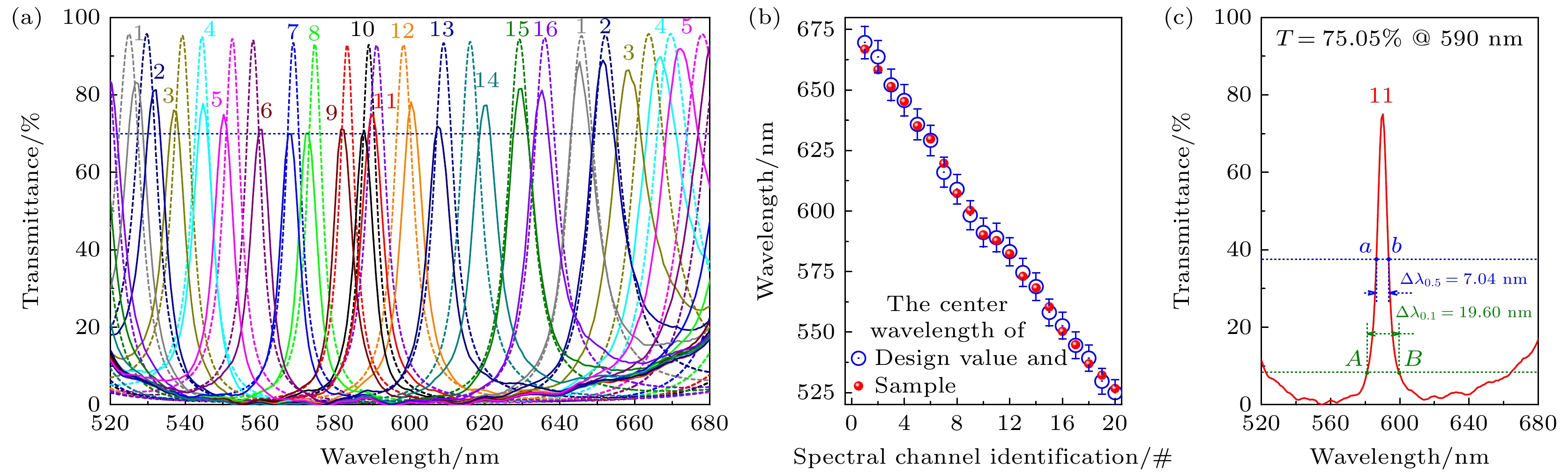 The results are obtained as follows: the response spectrum peak of the microcavity array sample varies from 520 to 680 nm, the free spectrum range is 160 nm, the full width at the half-peak is less than 10 nm, the transmittance is about 70%, the relative half-width of the transmittance peak at 590 nm is 1.19%, and the waveform coefficient is 2.78. A 16-channel multispectral camera is constructed by using the optical micro-precision assembly device to realize the precise alignment and the fitting of the micro-cavity filter array and the image sensor. Xenon lamp and monochromator are used as tunable wavelength monochromatic cooperative light source to detect the effect of 16-channel snapshot multispectral imaging on a pixel scale. The results show that the multispectral imaging detector has 16 different narrow-band response spectra. The characteristic spectrum of the target can be clearly distinguished by spectral channel.