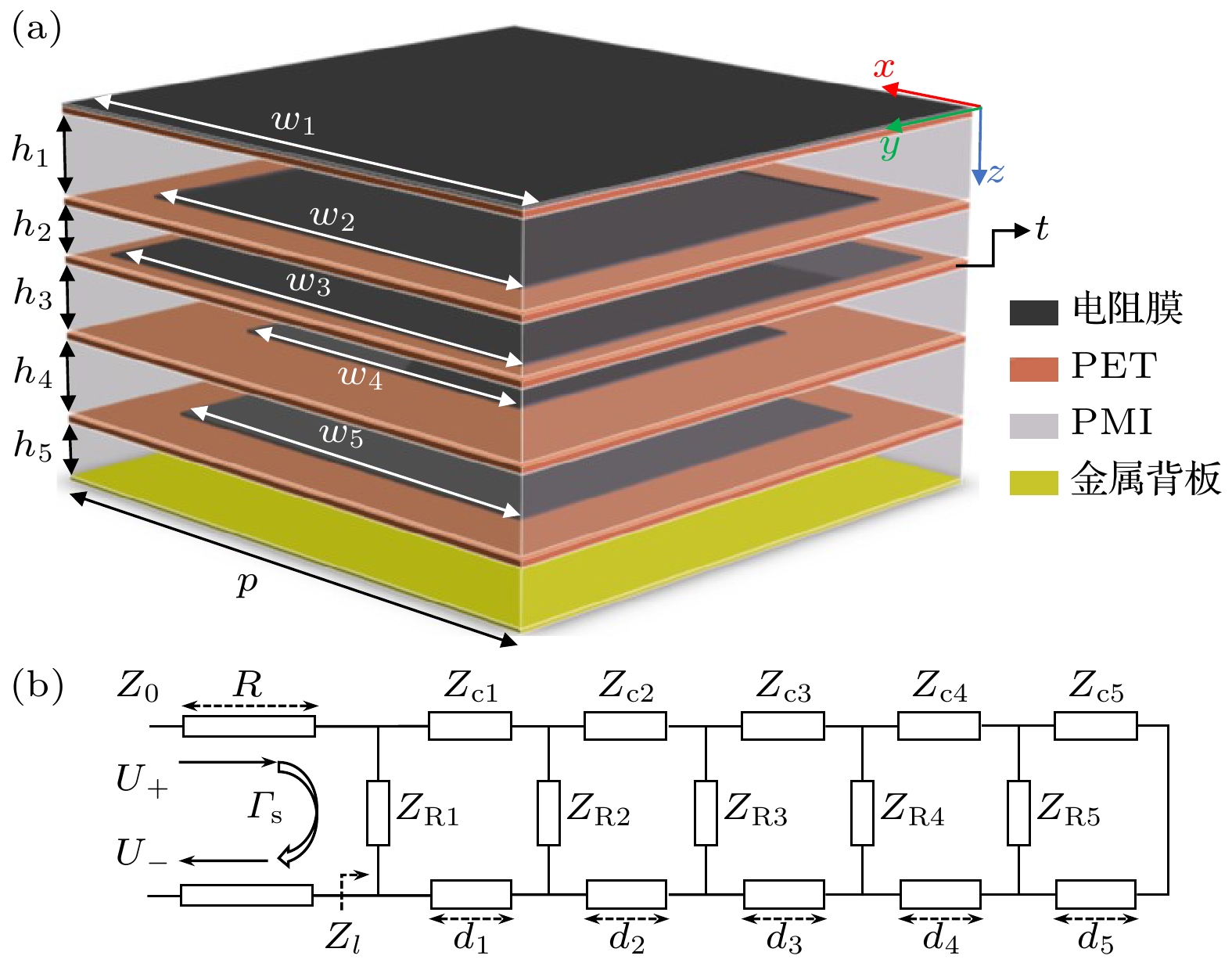 In recent years, electromagnetic (EM) wave absorbing devices based on metamaterials have attracted widespread attention, due to their advantages such as broadband, easy preparation, and flexibility to tailor EM waves. Nevertheless, a review of the existing research reveals that the inherent sub-wavelength characteristics of metamaterials and metasurfaces impose certain constraints on their applications in low-frequency ranges. In order to achieve low detectability that takes into account both low-frequency and broadband absorbing performance, this work, presents a metamaterial absorber based on 5-layer gradient resistance film and dielectric composite structure, as shown in
