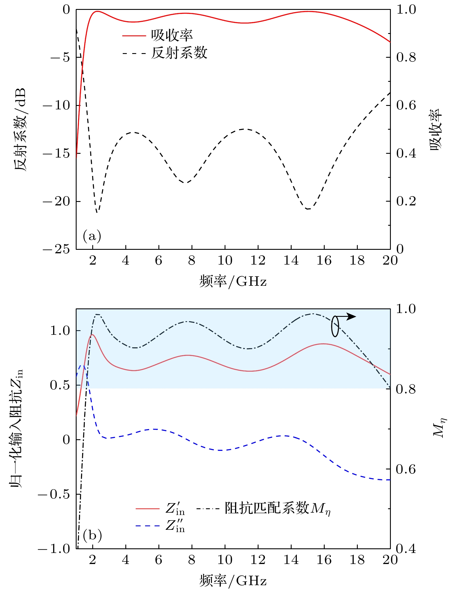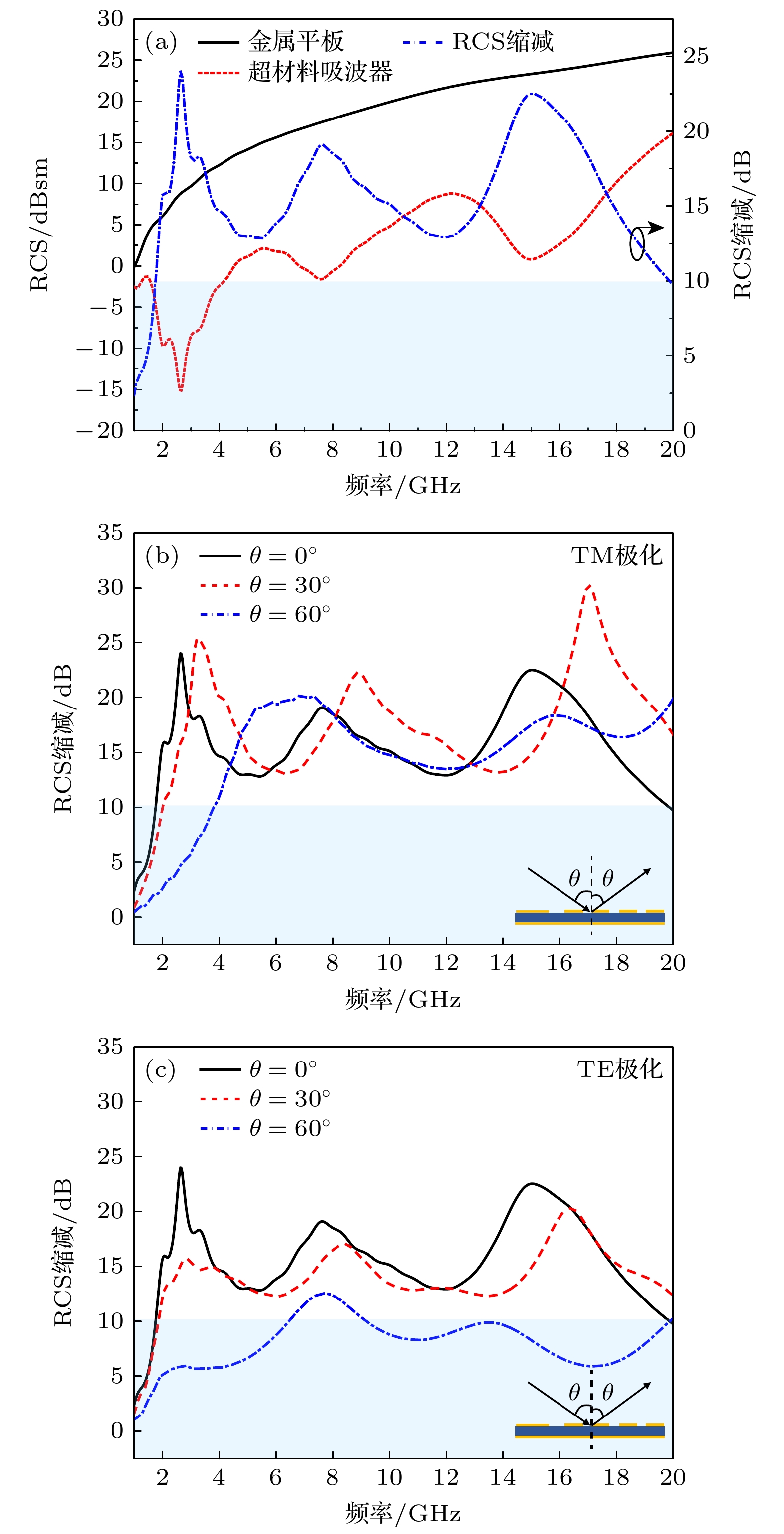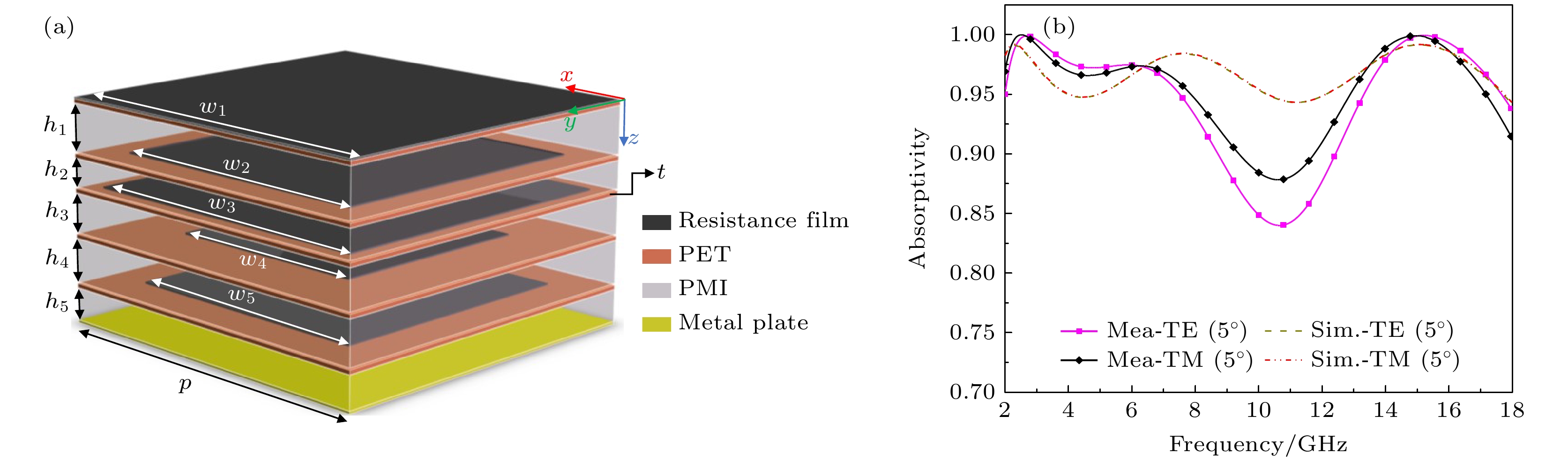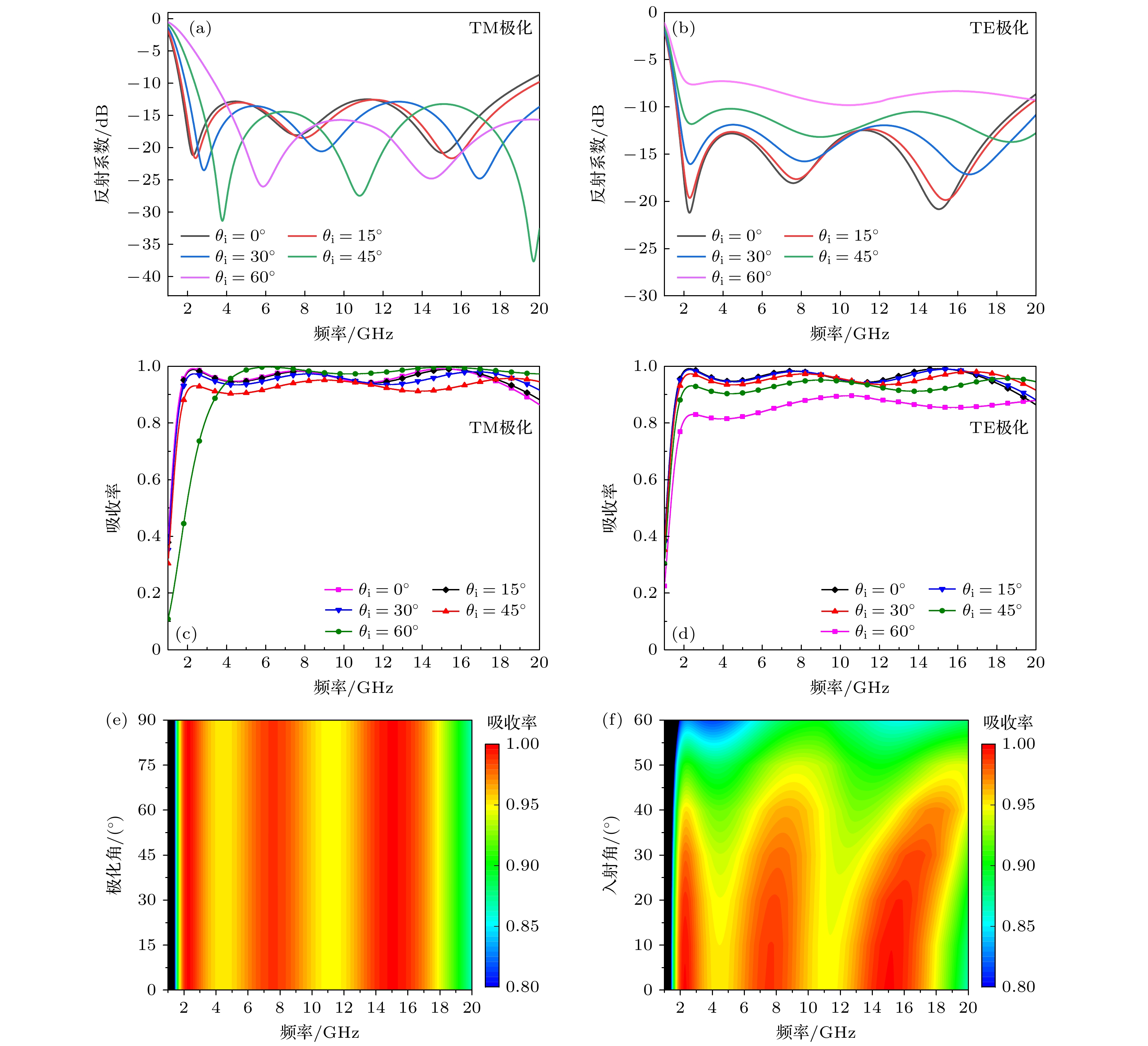 is fabricated and tested by using the bow method reflectivity test system. The absorptivity curves under 5° oblique incidence of different polarizations, show that the proposed metamaterial absorber can realize more than 80% EM absorption in an entire frequency range from 2 to 18 GHz, the test results of different polarizations are basically consistent. The test results at oblique incidence (θ≥ 30°) show that although the measured and simulated curves exhibit discrepancies in certain frequency bands due to human error or material dispersion characteristics, the overall experimental results are consistent with our expectations, which fully proves that the designed metamaterial absorber has potential application value in the field of low-frequency and broadband EM absorption.
