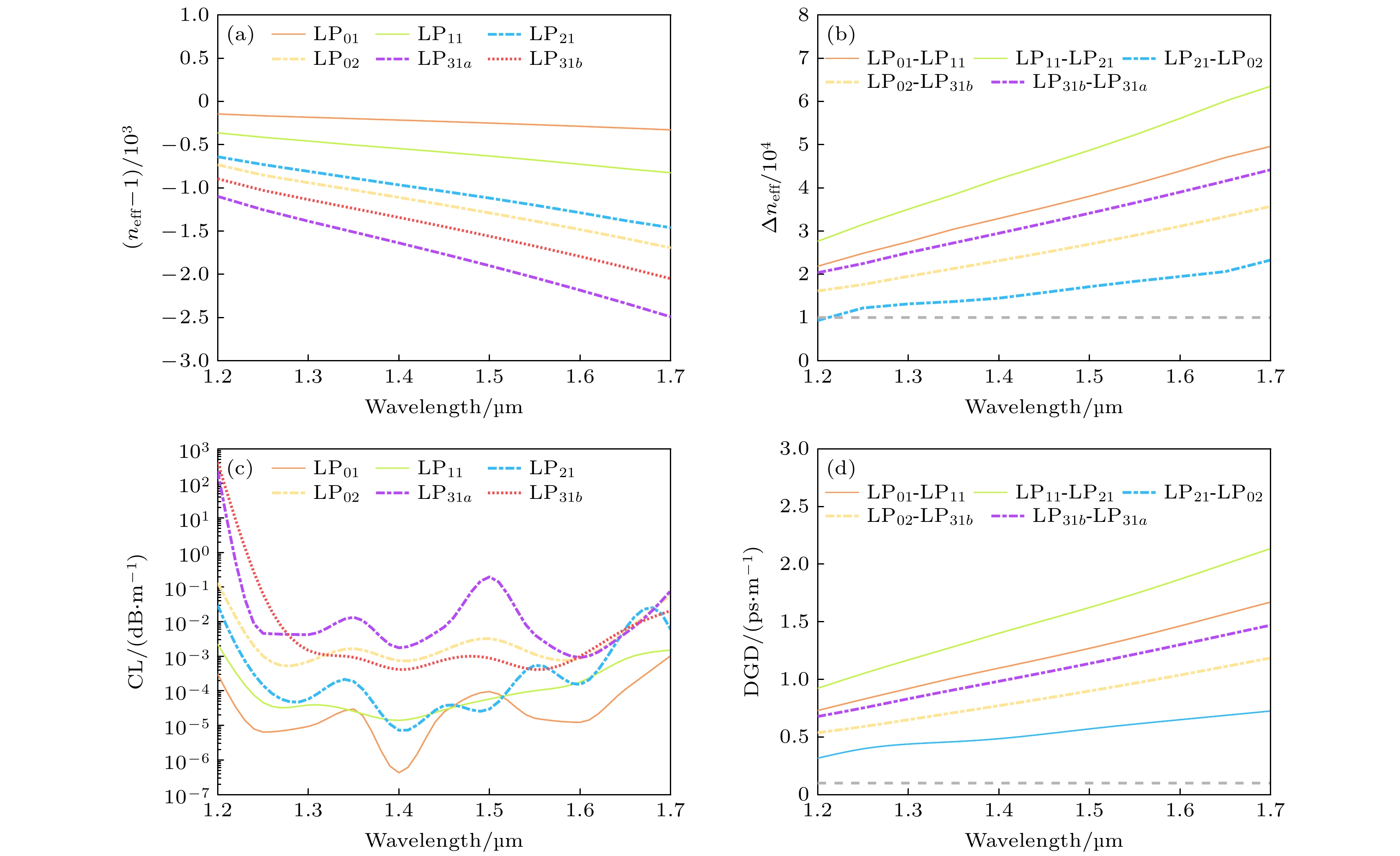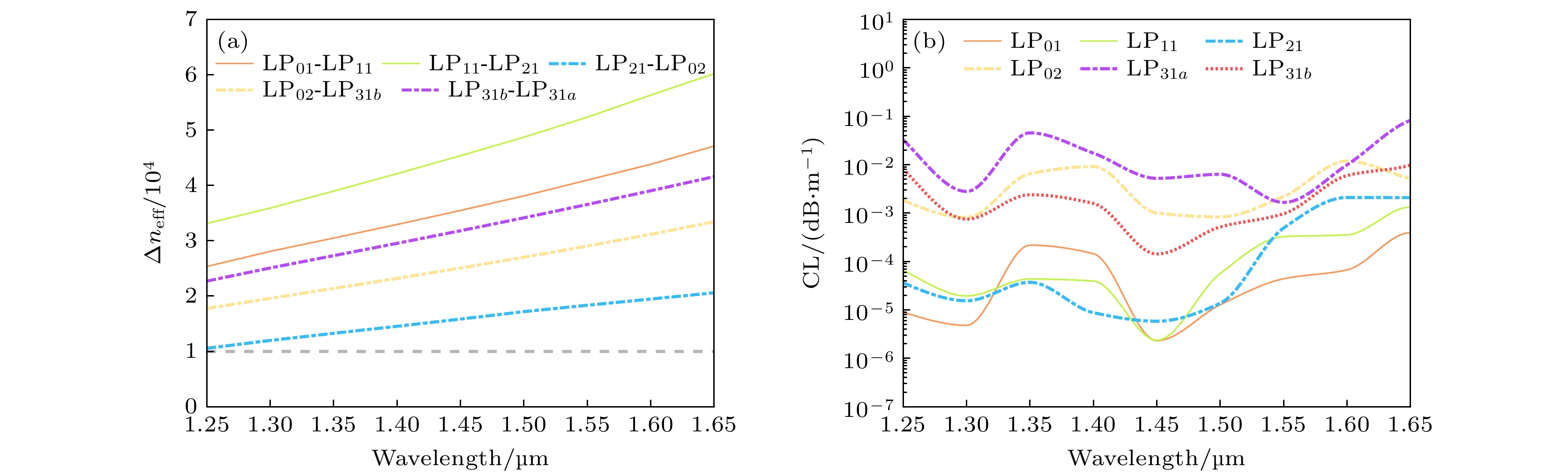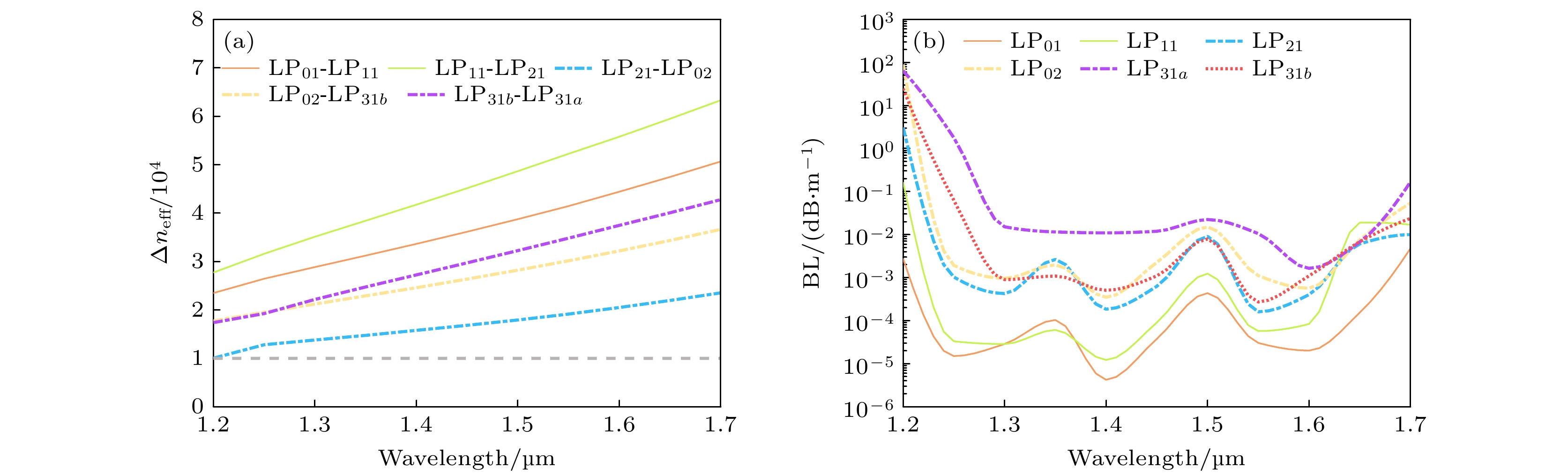 Few-mode optical fibers have played an increasingly important role in breaking through the transmission capacity limitations of single-mode optical fiber and alleviating the bandwidth crisis in optic fiber communication systems in recent years. Nevertheless, traditional solid core few-mode optical fibers usually suffer optical fiber nonlinearity and mode coupling, leading to mode crosstalk between channels. Hollow core negative curvature fibers (HC-NCF) have attracted widespread attention due to their advantages, such as low latency, low nonlinearity, low dispersion, low transmission loss, and large operating bandwidth. In this work, a novel low-loss few-mode HC-NCF with symmetrically double ring nested tube structure is designed, which supports six core modes including LP01, LP11, LP21, LP02, LP31a, and LP31b. The designed optical fiber is based on silica dioxide substrate and adopts a unique symmetrical double ring nested cladding structure, which can effectively suppress the coupling between the core mode and the cladding mode. The finite element method (FDE) is used to numerically analyze the properties of the proposed few-mode HC-NCF and optimize the structural parameters of the few-mode HC-NCF. Moreover, the confinement loss and bending loss of all core modes are investigated. The simulation results show that the proposed few-mode HC-NCF can support the independent transmission of six weakly coupled core modes (with the effective refractive index difference greater than 1×10–4between the adjacent core modes, which greatly avoids the coupling between the adjacent modes in the fiber core). In the 400 nm bandwidth (1.23–1.63 μm, covering the O, E, S, C, and L bands), all six modes in the fiber core maintain low loss transmission. Moreover, in the range of 1.3–1.63 μm, the confinement loss (CL) of LP01, LP11and LP21mode are all less than 1×10–3dB/m, and the CL of LP02and LP31bmode are both less than 3×10–3dB/m. The CL of each mode reaches the lowest value at 1.4 μm, and the LP01mode has the lowest CL of 4.3×10–7dB/m. In addition, for a bending radius of 7 cm, each mode maintains the low bending loss characteristic in a certain operating wavelength range. In the range of 1.23–1.61 μm, the BL of LP01is less than 4.5×10–4dB/m, and the BL of LP11is less than 1.3×10–3dB/m. The tolerance analysis shows that even with the deviation of structural parameters of ±1%, the few-mode HC-NCF can still maintain the characteristic of low-loss and weak coupling. The designed few-mode HC-NCF has ultra-low CL and bending-insensitive characteristics while supporting independent transmission of six modes, which will find huge potential applications in future high performance mode division multiplexing systems.