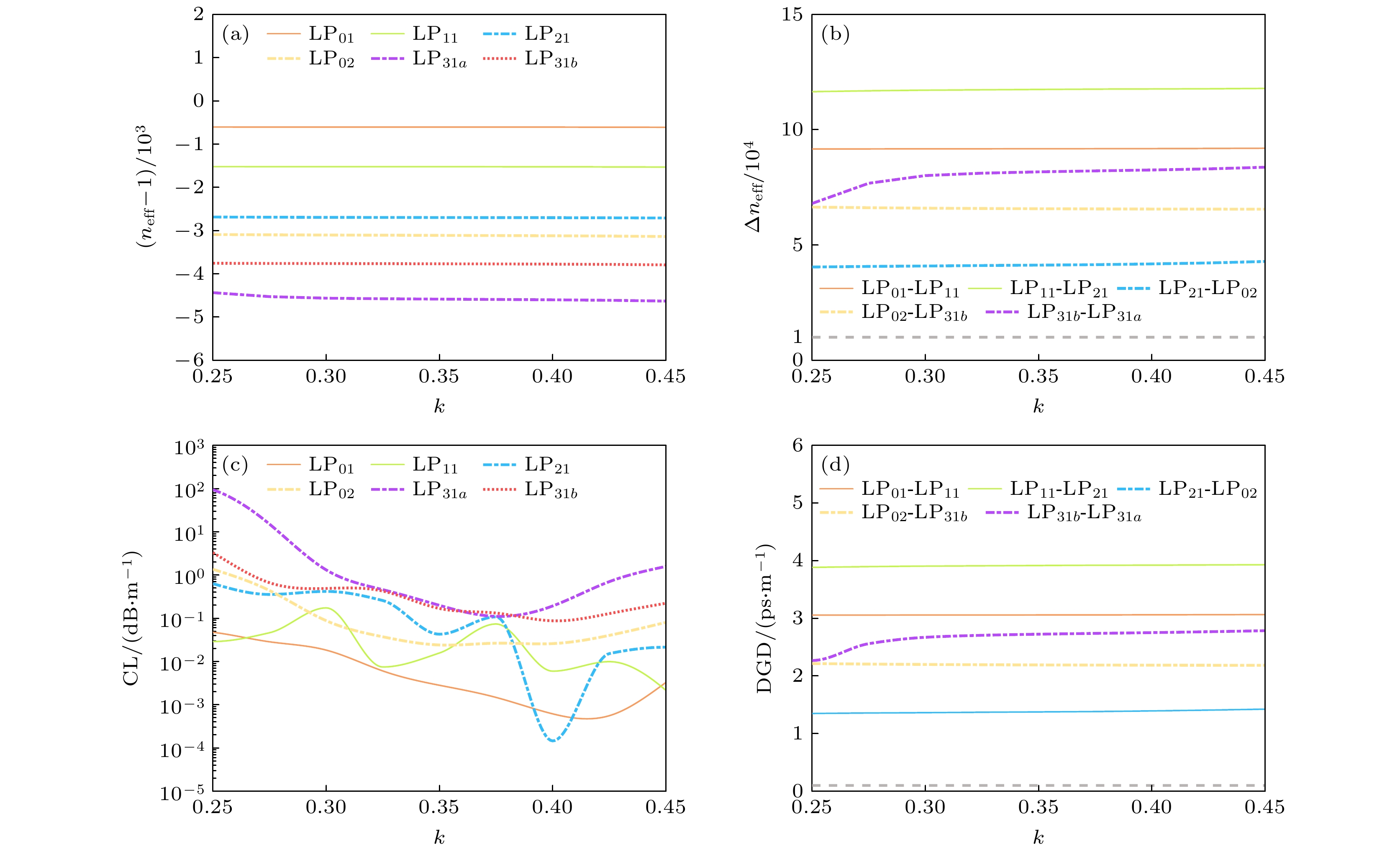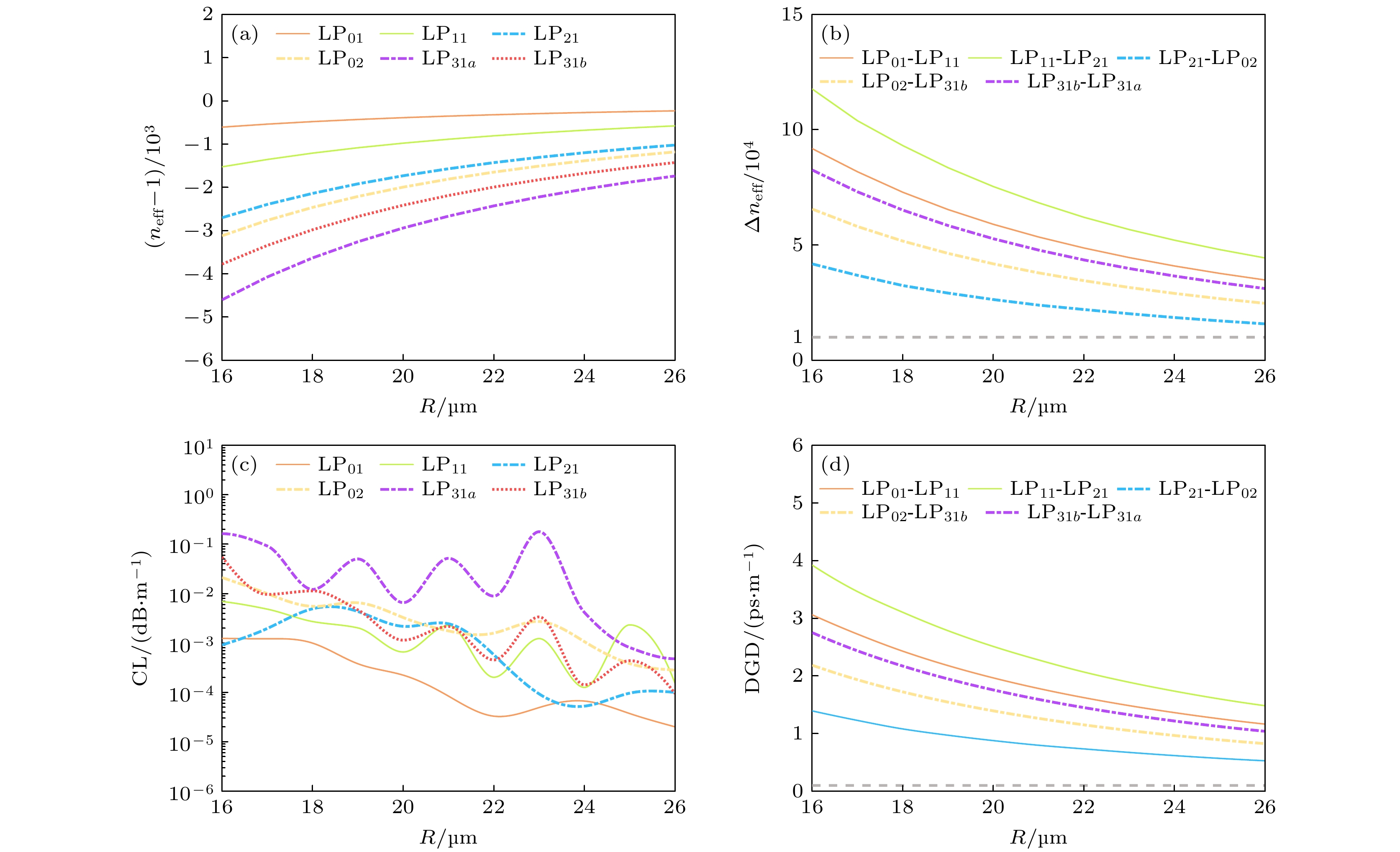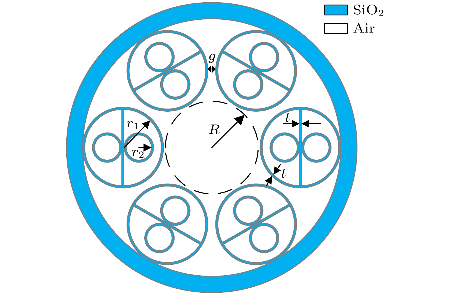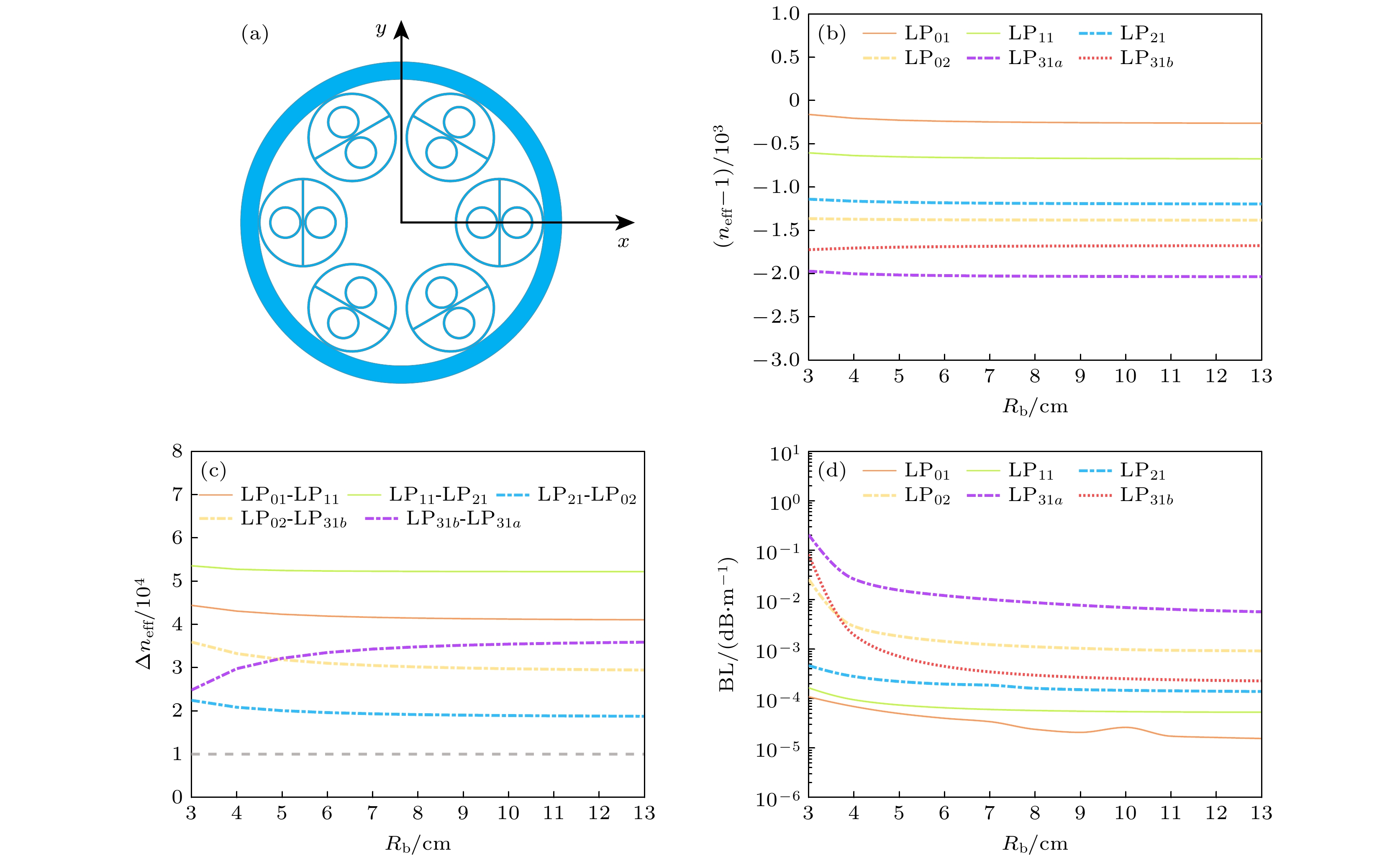 Few-mode optical fibers have played an increasingly important role in breaking through the transmission capacity limitations of single-mode optical fiber and alleviating the bandwidth crisis in optic fiber communication systems in recent years. Nevertheless, traditional solid core few-mode optical fibers usually suffer optical fiber nonlinearity and mode coupling, leading to mode crosstalk between channels. Hollow core negative curvature fibers (HC-NCF) have attracted widespread attention due to their advantages, such as low latency, low nonlinearity, low dispersion, low transmission loss, and large operating bandwidth. In this work, a novel low-loss few-mode HC-NCF with symmetrically double ring nested tube structure is designed, which supports six core modes including LP01, LP11, LP21, LP02, LP31a, and LP31b. The designed optical fiber is based on silica dioxide substrate and adopts a unique symmetrical double ring nested cladding structure, which can effectively suppress the coupling between the core mode and the cladding mode. The finite element method (FDE) is used to numerically analyze the properties of the proposed few-mode HC-NCF and optimize the structural parameters of the few-mode HC-NCF. Moreover, the confinement loss and bending loss of all core modes are investigated. The simulation results show that the proposed few-mode HC-NCF can support the independent transmission of six weakly coupled core modes (with the effective refractive index difference greater than 1×10–4between the adjacent core modes, which greatly avoids the coupling between the adjacent modes in the fiber core). In the 400 nm bandwidth (1.23–1.63 μm, covering the O, E, S, C, and L bands), all six modes in the fiber core maintain low loss transmission. Moreover, in the range of 1.3–1.63 μm, the confinement loss (CL) of LP01, LP11and LP21mode are all less than 1×10–3dB/m, and the CL of LP02and LP31bmode are both less than 3×10–3dB/m. The CL of each mode reaches the lowest value at 1.4 μm, and the LP01mode has the lowest CL of 4.3×10–7dB/m. In addition, for a bending radius of 7 cm, each mode maintains the low bending loss characteristic in a certain operating wavelength range. In the range of 1.23–1.61 μm, the BL of LP01is less than 4.5×10–4dB/m, and the BL of LP11is less than 1.3×10–3dB/m. The tolerance analysis shows that even with the deviation of structural parameters of ±1%, the few-mode HC-NCF can still maintain the characteristic of low-loss and weak coupling. The designed few-mode HC-NCF has ultra-low CL and bending-insensitive characteristics while supporting independent transmission of six modes, which will find huge potential applications in future high performance mode division multiplexing systems.