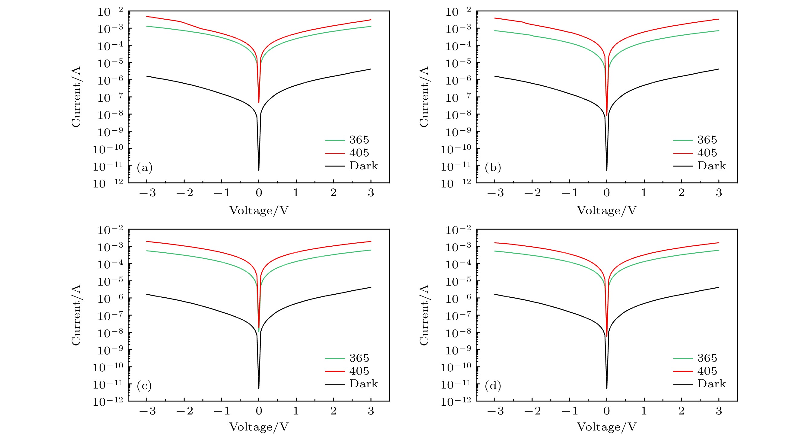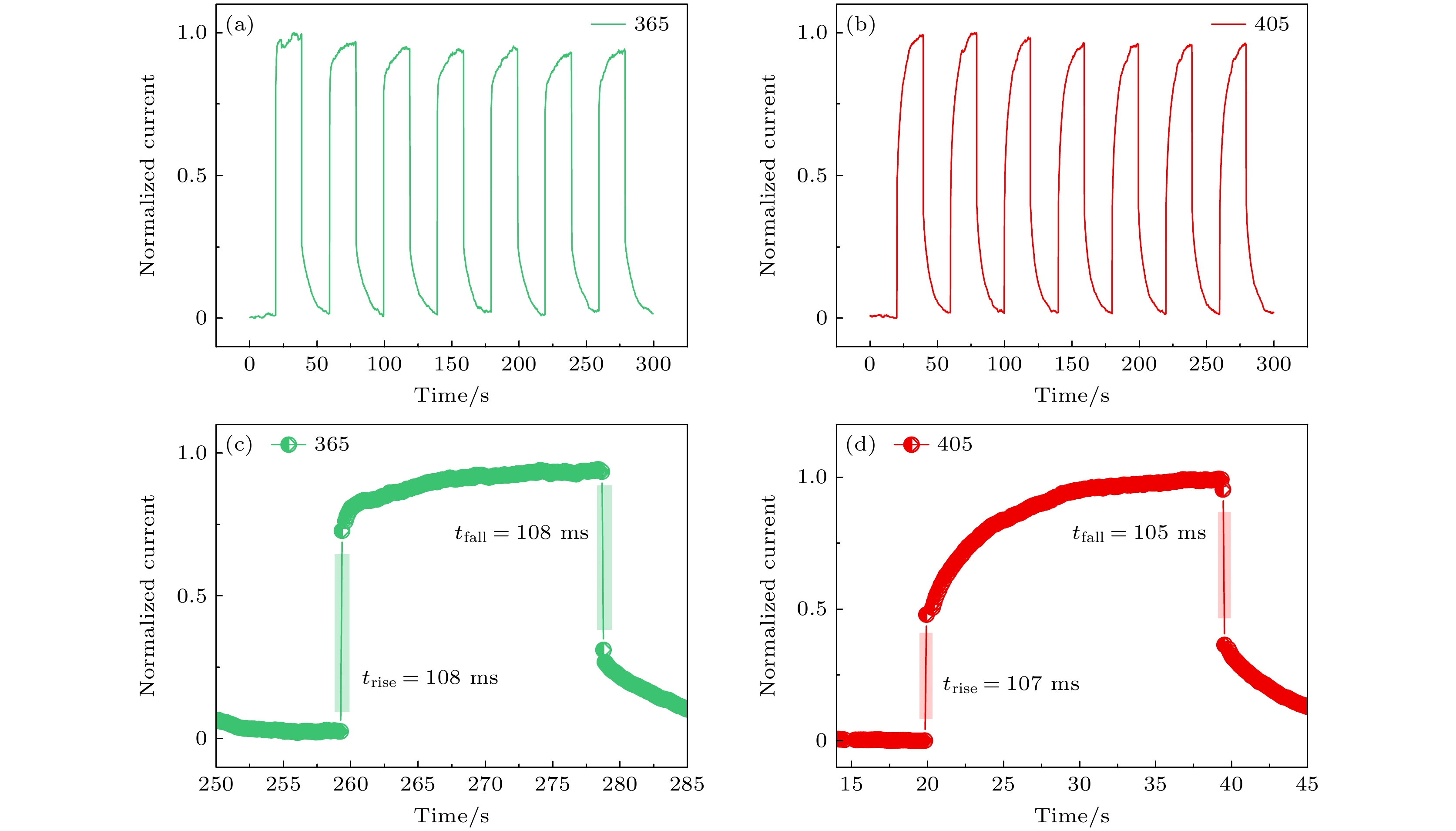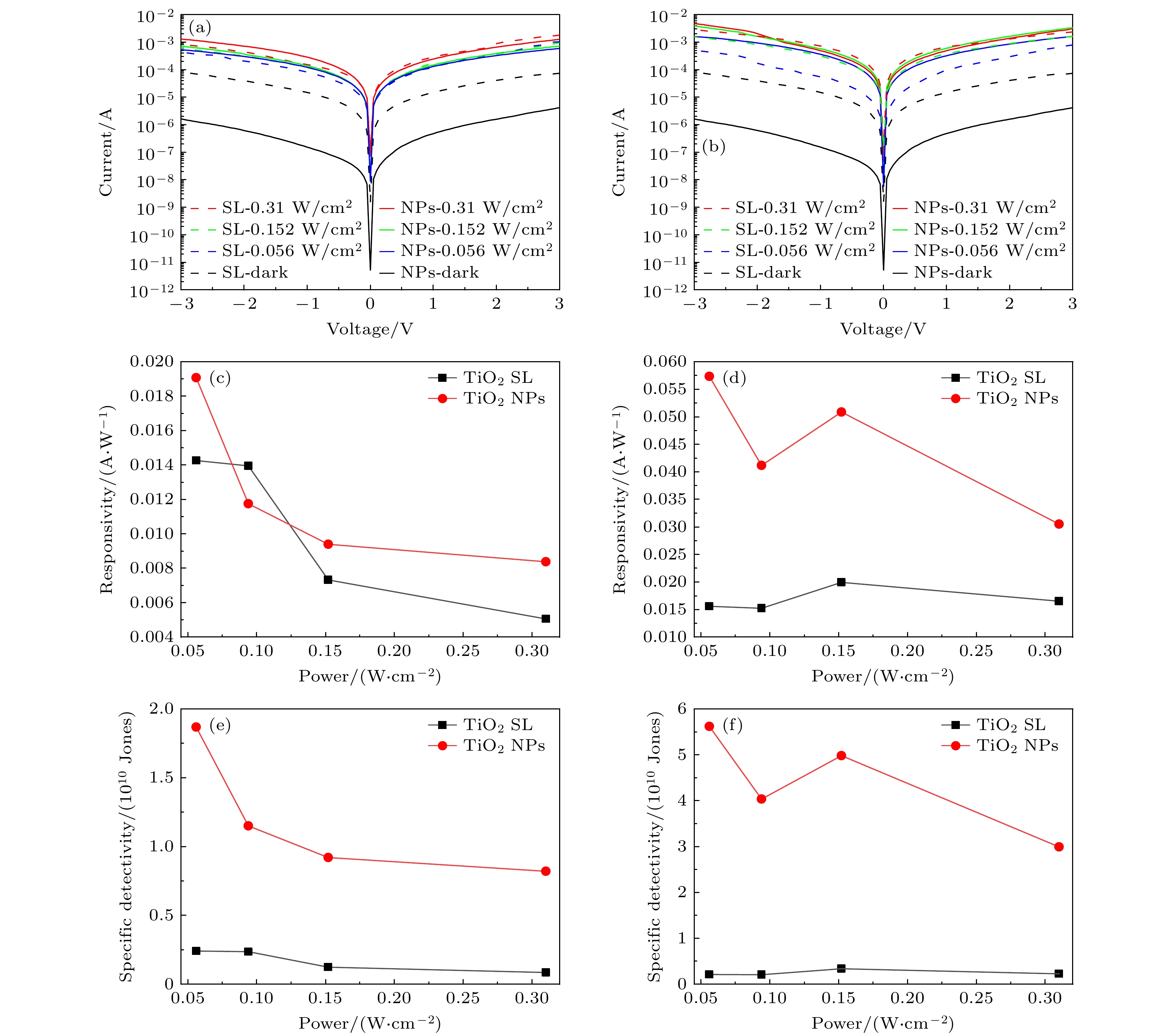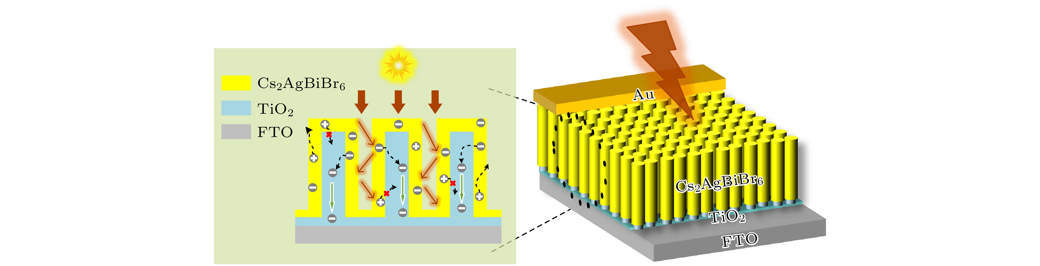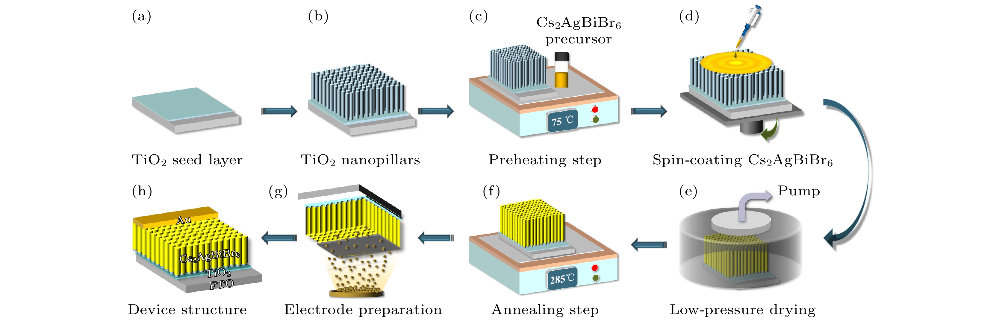 Photodetectors are widely used in the fields of environmental monitoring, medical analysis, security surveillance, optical communication and biosensing due to their high responsiveness, fast response time, low power consumption, good stability and low processing cost. Fully inorganic lead-free perovskite material (Cs2AgBiBr6) has received a lot of attention in recent years in the research of photodetector applications due to its advantages of long carrier lifetime, high stability, moderate forbidden bandwidth, and environmental friendliness. For perovskite photodetectors, the semiconductor nanopillar array structure can effectively reduce the reflection loss of light from the surface to improve the absorption of incident light in the device and inhibit the exciton complexes in the device, and the good energy level matching between TiO2and Cs2AgBiBr6can effectively promote the transport and extraction of carriers in the device. However, there are few reports on the use of TiO2nanopillar arrays as a transport layer to improve the performance of Cs2AgBiBr6photodetectors. In this work, high-quality Cs2AgBiBr6thin films with large grain size, no visible pinholes, and good uniform coverage are successfully prepared by a low-pressure-assisted spin-coating method under ambient conditions. Hydrothermally grown TiO2nanopillar arrays are embedded into the Cs2AgBiBr6layer to form a close core-shell structure, increasing the physical contact area between the two to ensure more effective electron injection and charge separation, and to improve the carrier transport efficiency in the device. Multi-band responsive Cs2AgBiBr6double perovskite photodetectors based on TiO2nanopillars are excited at multiple wavelengths of 365 nm and 405 nm with high light response and good stability and reproducibility, resulting in average switching ratios of 522 and 2090, respectively. When the light source is excited at 365 nm and 405 nm with a light intensity of 0.056 W/cm2, the responsivity is 0.019 A/W and 0.057 A/W, respectively, and the specific detectivity is 1.9 × 1010Jones and 5.6 × 1010Jones, respectively. Comparing with the Cs2AgBiBr6perovskite photodetector based on a planar TiO2electron transport layer, the average switching ratios are improved by a factor of 65 and 110, the responsivities are improved by 35% and 256%, and the specific detectivity are improved by a factor of 6.9 and 25, respectively. In this work, the photoelectric performance of Cs2AgBiBr6photodetector is improved by using TiO2nanopillars as an electron transport layer. It provides a reference solution for developing high-performance Cs2AgBiBr6perovskite photodetectors in future.