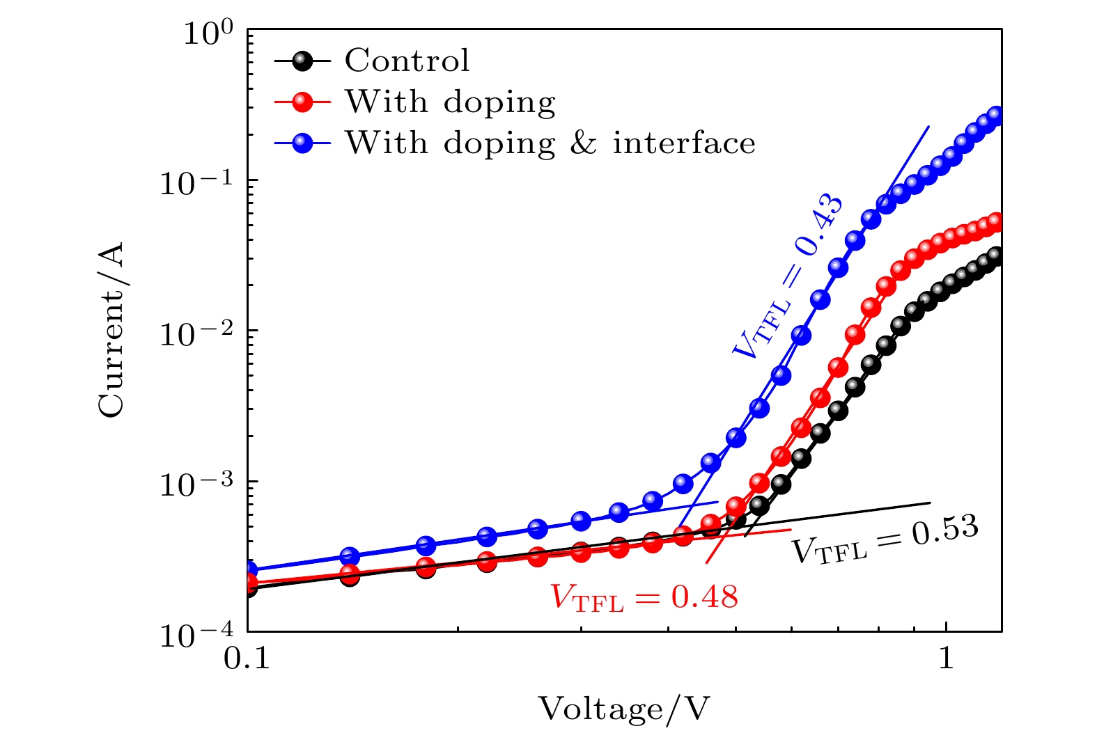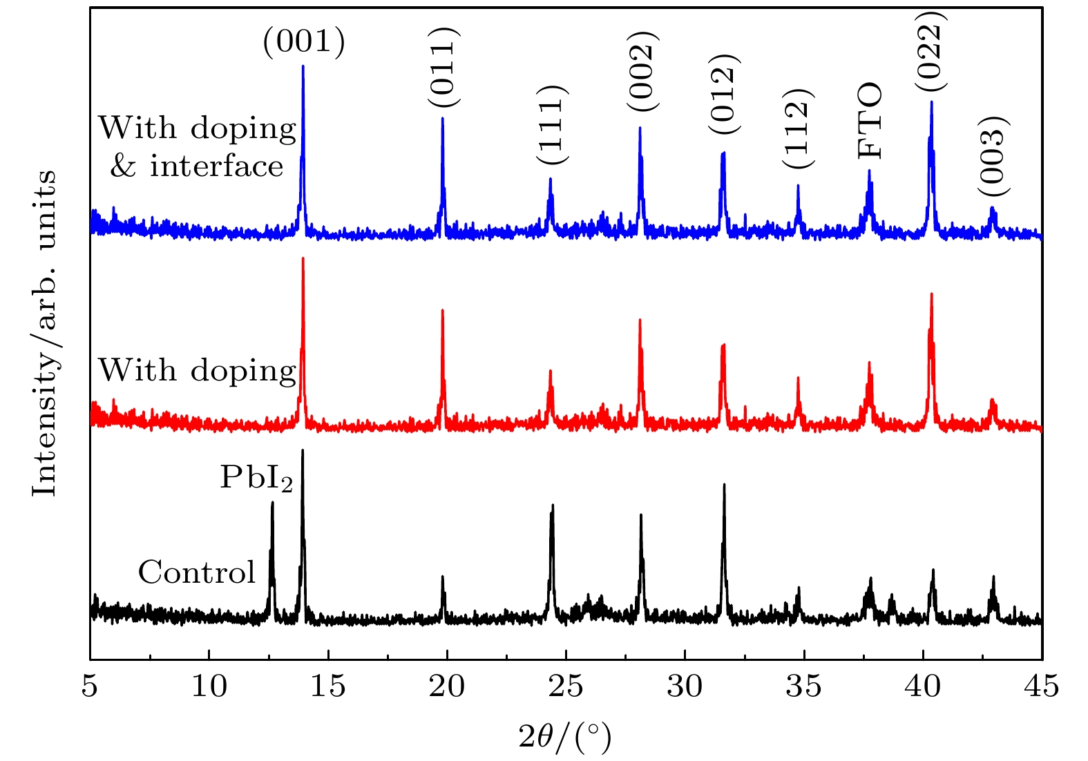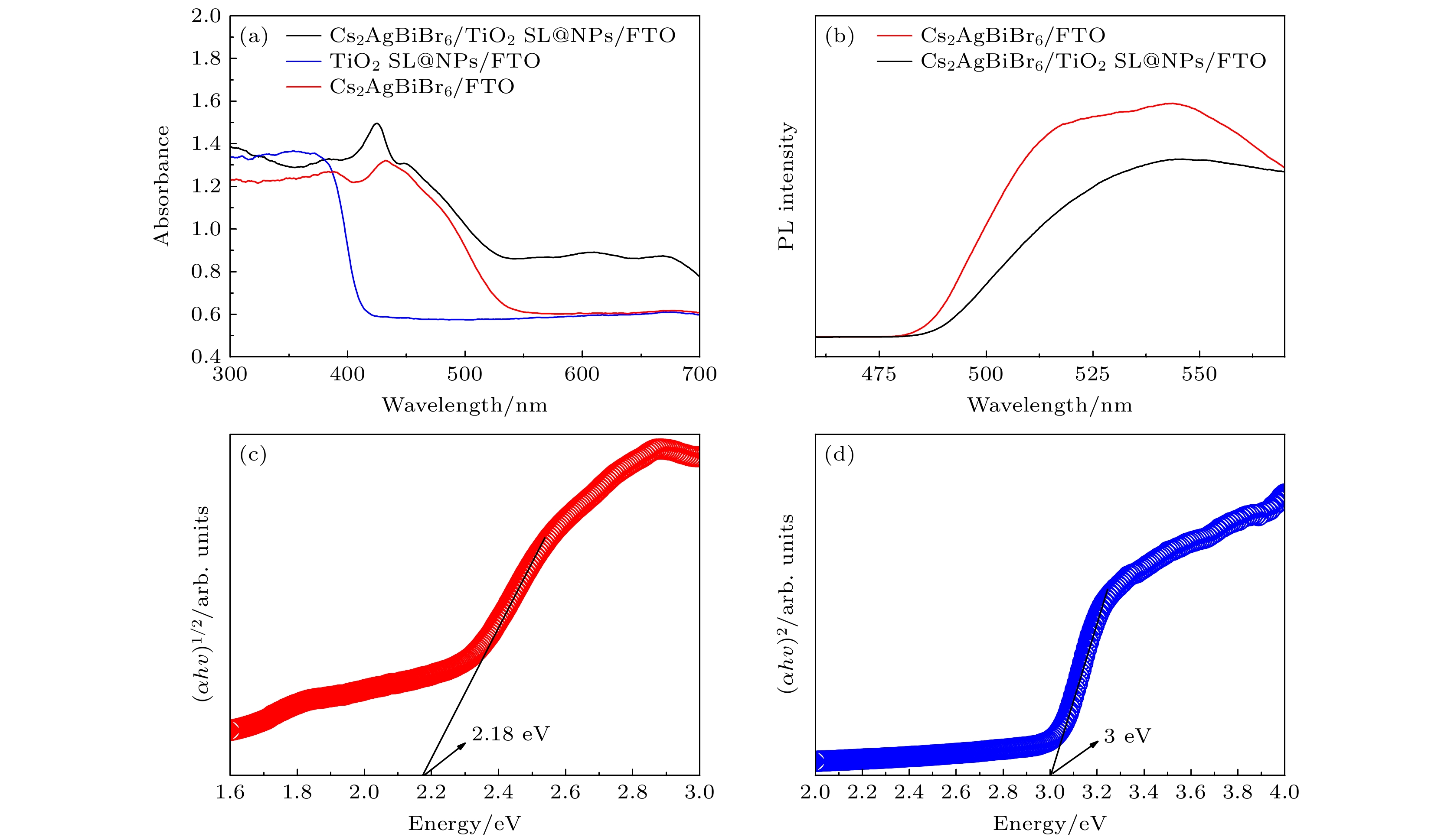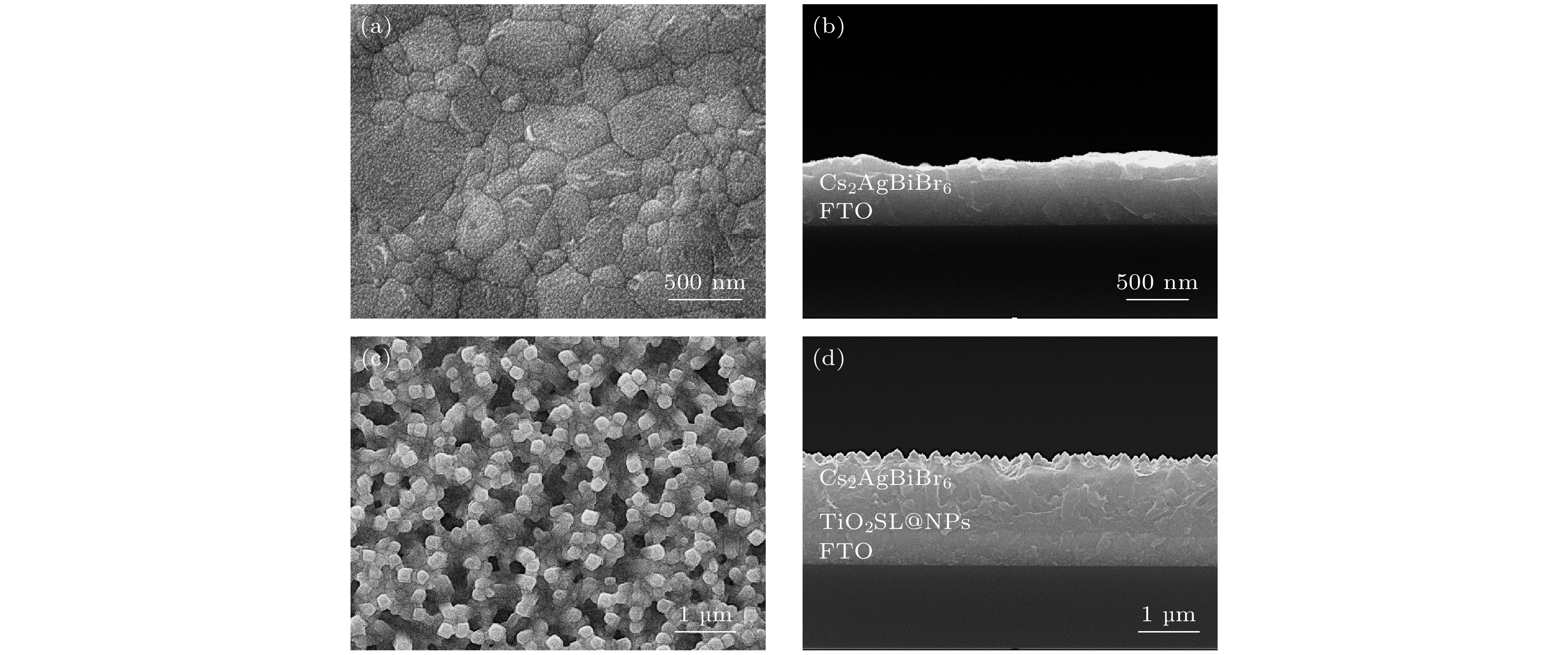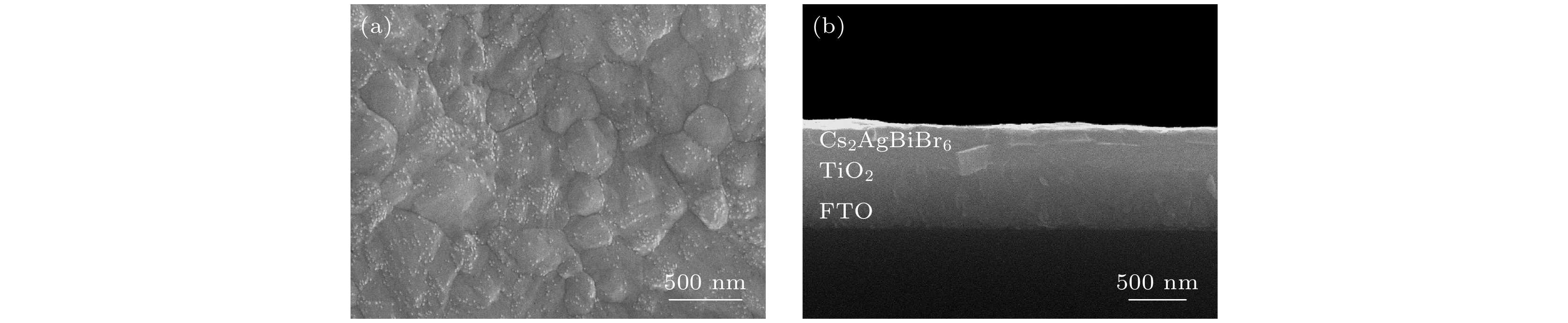 Photodetectors are widely used in the fields of environmental monitoring, medical analysis, security surveillance, optical communication and biosensing due to their high responsiveness, fast response time, low power consumption, good stability and low processing cost. Fully inorganic lead-free perovskite material (Cs2AgBiBr6) has received a lot of attention in recent years in the research of photodetector applications due to its advantages of long carrier lifetime, high stability, moderate forbidden bandwidth, and environmental friendliness. For perovskite photodetectors, the semiconductor nanopillar array structure can effectively reduce the reflection loss of light from the surface to improve the absorption of incident light in the device and inhibit the exciton complexes in the device, and the good energy level matching between TiO2and Cs2AgBiBr6can effectively promote the transport and extraction of carriers in the device. However, there are few reports on the use of TiO2nanopillar arrays as a transport layer to improve the performance of Cs2AgBiBr6photodetectors. In this work, high-quality Cs2AgBiBr6thin films with large grain size, no visible pinholes, and good uniform coverage are successfully prepared by a low-pressure-assisted spin-coating method under ambient conditions. Hydrothermally grown TiO2nanopillar arrays are embedded into the Cs2AgBiBr6layer to form a close core-shell structure, increasing the physical contact area between the two to ensure more effective electron injection and charge separation, and to improve the carrier transport efficiency in the device. Multi-band responsive Cs2AgBiBr6double perovskite photodetectors based on TiO2nanopillars are excited at multiple wavelengths of 365 nm and 405 nm with high light response and good stability and reproducibility, resulting in average switching ratios of 522 and 2090, respectively. When the light source is excited at 365 nm and 405 nm with a light intensity of 0.056 W/cm2, the responsivity is 0.019 A/W and 0.057 A/W, respectively, and the specific detectivity is 1.9 × 1010Jones and 5.6 × 1010Jones, respectively. Comparing with the Cs2AgBiBr6perovskite photodetector based on a planar TiO2electron transport layer, the average switching ratios are improved by a factor of 65 and 110, the responsivities are improved by 35% and 256%, and the specific detectivity are improved by a factor of 6.9 and 25, respectively. In this work, the photoelectric performance of Cs2AgBiBr6photodetector is improved by using TiO2nanopillars as an electron transport layer. It provides a reference solution for developing high-performance Cs2AgBiBr6perovskite photodetectors in future.