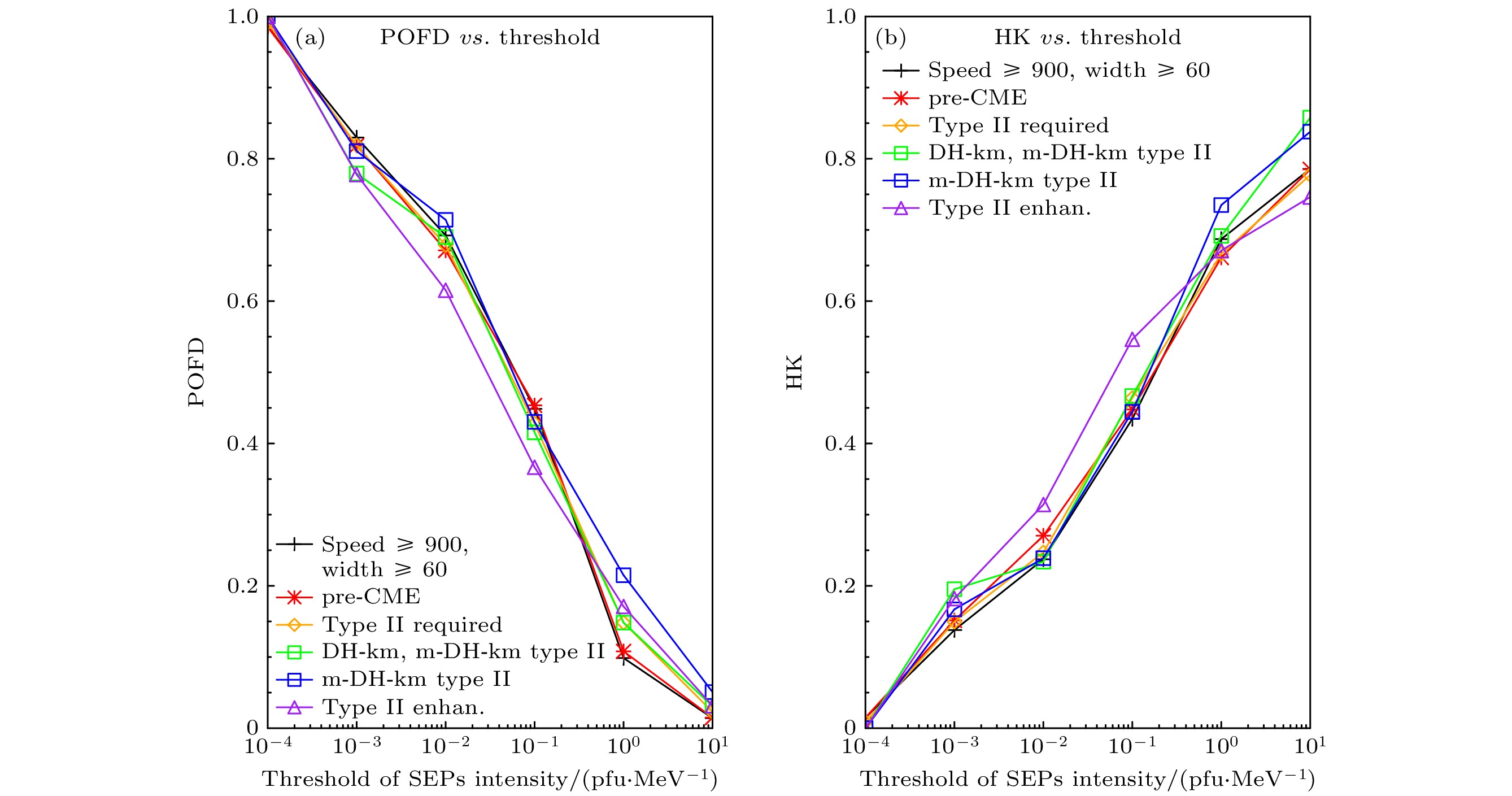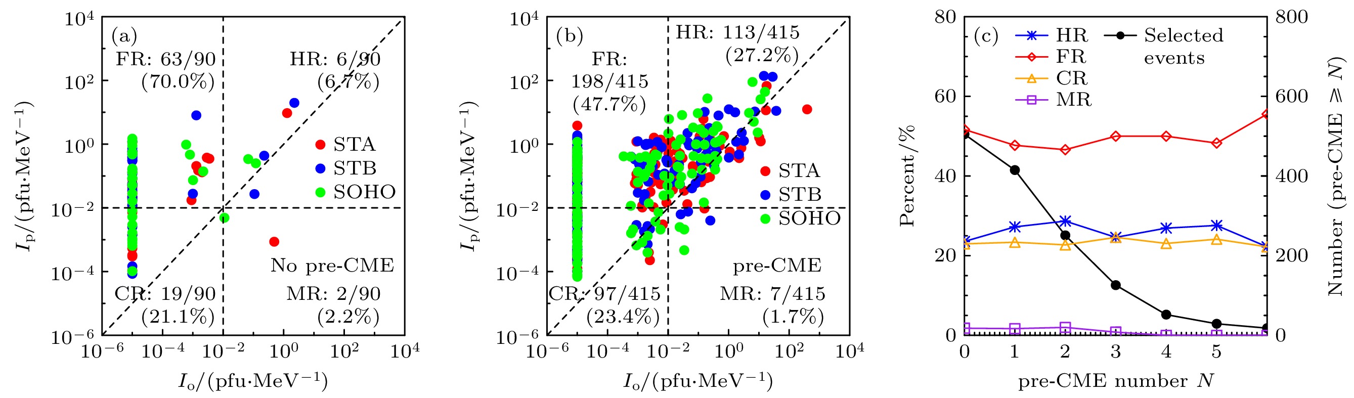 Based on the multiple-vantage observations of STEREO, SOHO, wind and other spacecraft, the fast and wide coronal mass ejections (CME) during the 24th solar cycle from January 2010 to September 2014 are selected in this paper. Using the outputs of Richardson’s (2014) empirical model of solar energetic particle (SEP) intensity under different conditions, the effects of its associations such as CME, pre-CME, and type II radio bursts, on SEP intensity are analyzed, and the relationship between SEP event and these characteristics is also discussed. The main conclusions are as follows. 1) The presence or absence of pre-CME within 13 h before fast CME significantly improves the model prediction effect and has a significant influence on whether fast CME produces SEP event. Compared with the events without pre-CMEs, the events with pre-CMEs have a low proportion of false alarms (FR: 47.7%vs.70%). However, the number of pre-CMEs does not improve the model output. 2) CMEs with type-II radio bursts have significantly lower FR to generate SEP events than fast CMEs without type-II radio bursts (42%vs.68%). And selecting type-II radio bursts as a constraint will filter out some small/weak SEP events, the relationship between model predictions and observations especially for large SEP events (e.g.Ip≥ 0.01 pfu/MeV) will stand out. Moreover, if the type-II radio enhancement is taken into account, FR can be further reduced to 29.4%, and the proportion of hits can be further increased (HR: 48.5%), and the model prediction is significantly improved. 3) The larger the start frequency of type II radio bursts, the smaller the end frequency is, and FR decreases slightly, but at the same time, a large number of SEP events are excluded by this condition, and the results show that the constraints on the start/end frequency of type-II radio bursts do not improve the model predictions distinctly. 4) If the sub-classification of type-II radio bursts is considered as the model constraint, the CMEs associated with multi-band type-II radio bursts have better model predictions than those with single-band events. For example, m-DH-km type-II radio bursts have lower FR (35.4%) and higher HR (48%), and the accuracy of empirical model is higher. In summary, we find that in addition to the velocity and angular width of CME, the associations of pre-CME, type II radio bursts and their enhancement, and multi-band sub-classification are the favorable conditions for CME to generate SEP events. The SEP intensities obtained by the empirical model have better consistency with the observations, and better predictions can be obtained. This investigation indicates that SEP events are more likely generated by fast and wide CMEs accompanied by pre-CMEs, multi-band type II radio bursts and their enhancements, which seem to serve as discriminative signal for SEP-rich and SEP-poor CMEs.