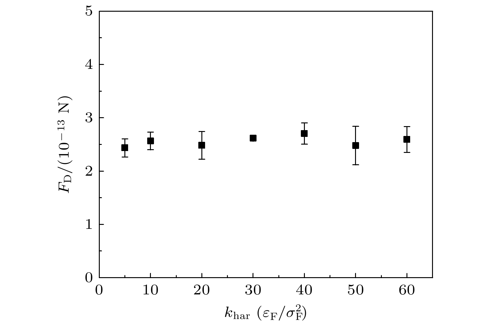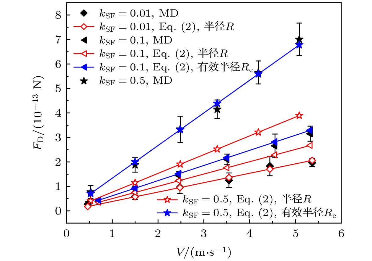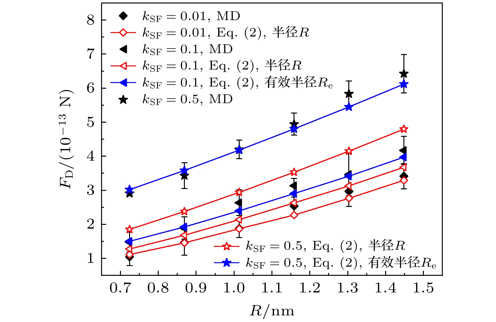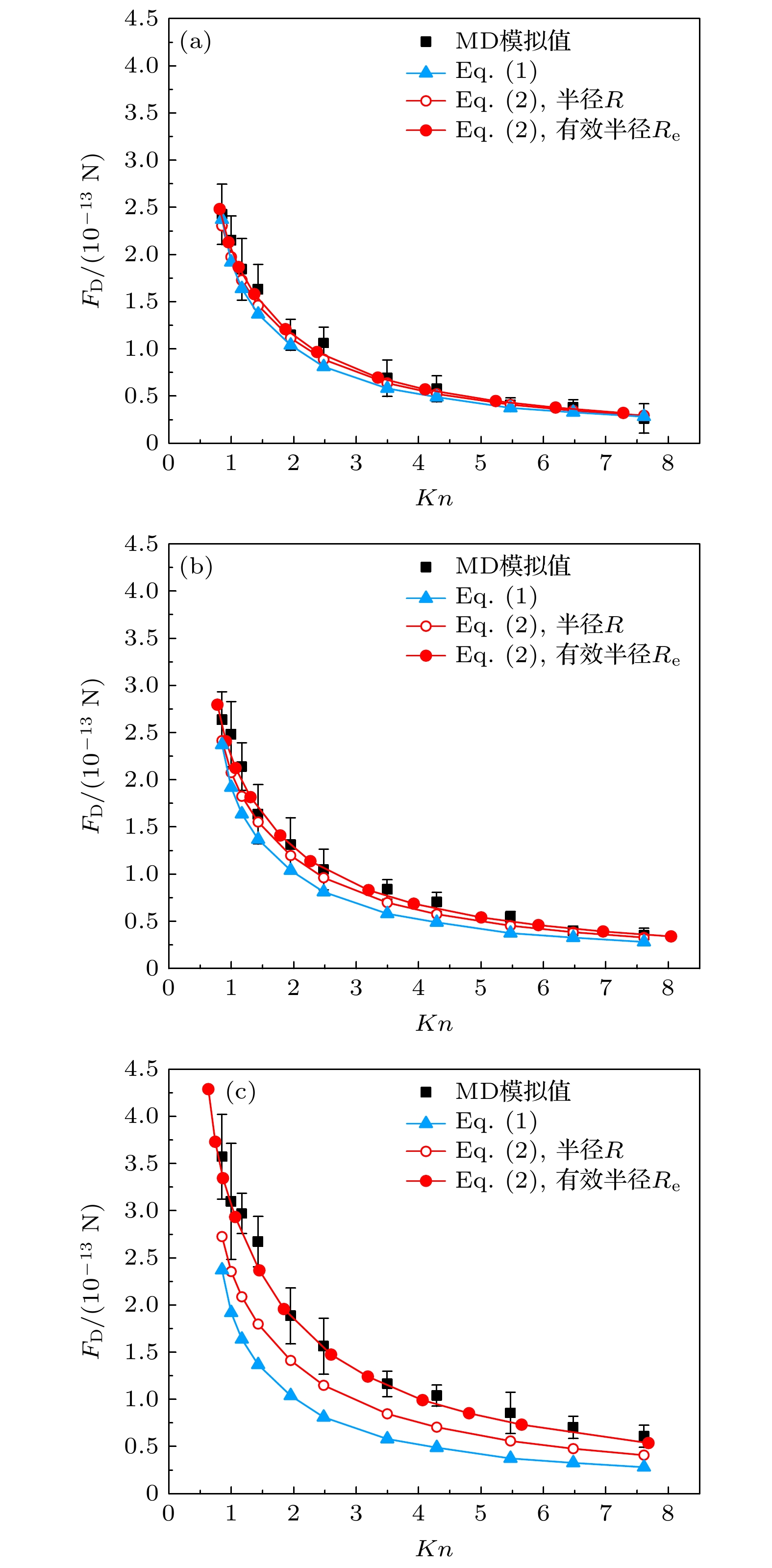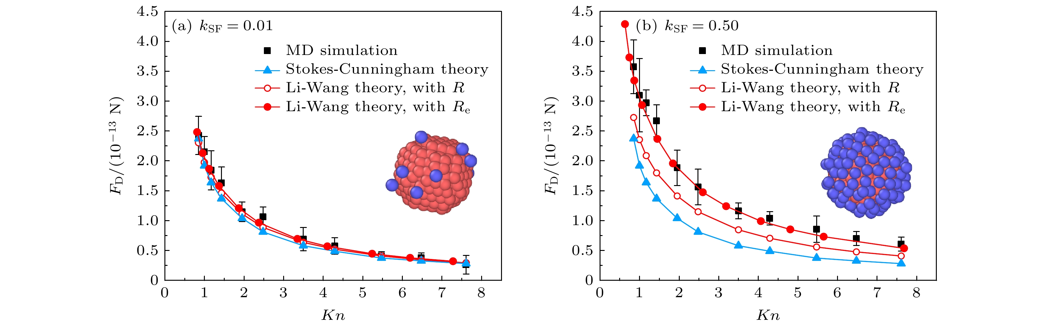 Transport properties of nanoparticles in gases have many practical applications, such as aerosol science, combustion, and micro- and nano-scale fabrication. A nanoparticle moving in a fluid is expected to experience a drag force, which determines the transport property of the particle. According to the Einstein relationship, the diffusion coefficient of a particle is inversely proportional to the drag force coefficient. However, in the transition regime, it is usually difficult to evaluate the drag force of suspended particles. A typical method is to extend the asymptotic solution of the free molecular or continuum limit to the transition regime. According to the gas kinetic theory, Li and Wang proposed a theoretical expression for drag force on nanoparticles in the free molecular regime, which is then extended to the entire range of Knudsen number following a semi-empirical approach [Li Z G, Wang H 2003Phys. Rev. E68061207]. For nanoparticles, it is necessary to verify the theoretical predictions since the gas-particle non-rigid-body interactions must be taken into account. In this work, the drag force on nanoparticle in the transition regime is investigated by using molecular dynamics (MD) simulation. To evaluate the drag force, a harmonic potential is used to the nanoparticle to constrain its Brownian motion in our MD simulation. In the steady state, the drag force can be obtained by the balance between the drag force and harmonic force. It is found that the gas-particle non-rigid-body interaction has a significant influence on the drag force of nanoparticle. For weak gas-solid coupling, the MD simulation results can be in good agreement with the prediction of Li-Wang theory. However, for strong coupling, there exists significant discrepancy between the MD simulation results and the theoretical results. Due to the gas-solid intermolecular interactions, gas molecules can be adsorbed on the nanoparticle surface, and after a time period, they may be re-emitted from the surface when they gain sufficient kinetic energy. Therefore, an adsorption-desorption equilibrium and an adsorption layer can be established on the particle surface. The adsorption layer enlarges the collision cross-sectional area and enhances the momentum transfer between gas molecules and the particle, and thus the drag force increases. This can explain the inconsistencies between the theoretical results and MD simulations. In this work, we introduce an adsorption ratio to evaluate the thickness of the adsorption layer. Then, the effective particle radius can be defined by the sum of particle radius and the thickness of the adsorption layer. By using the effective particle radius, the simulation values are in very good agreement with the theoretical predictions. The results of this work provide insights into the applications of nanoparticles in aerosol science.